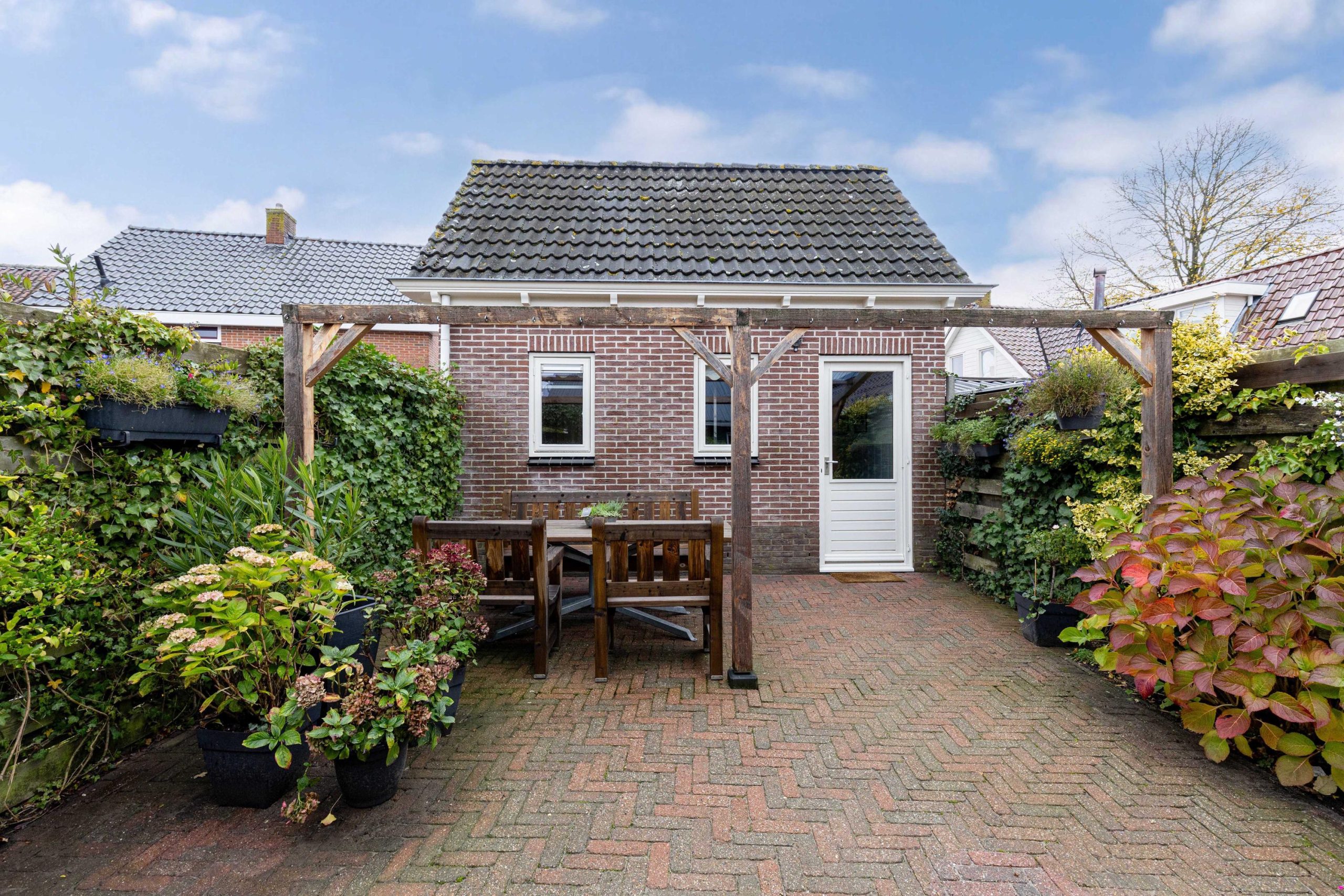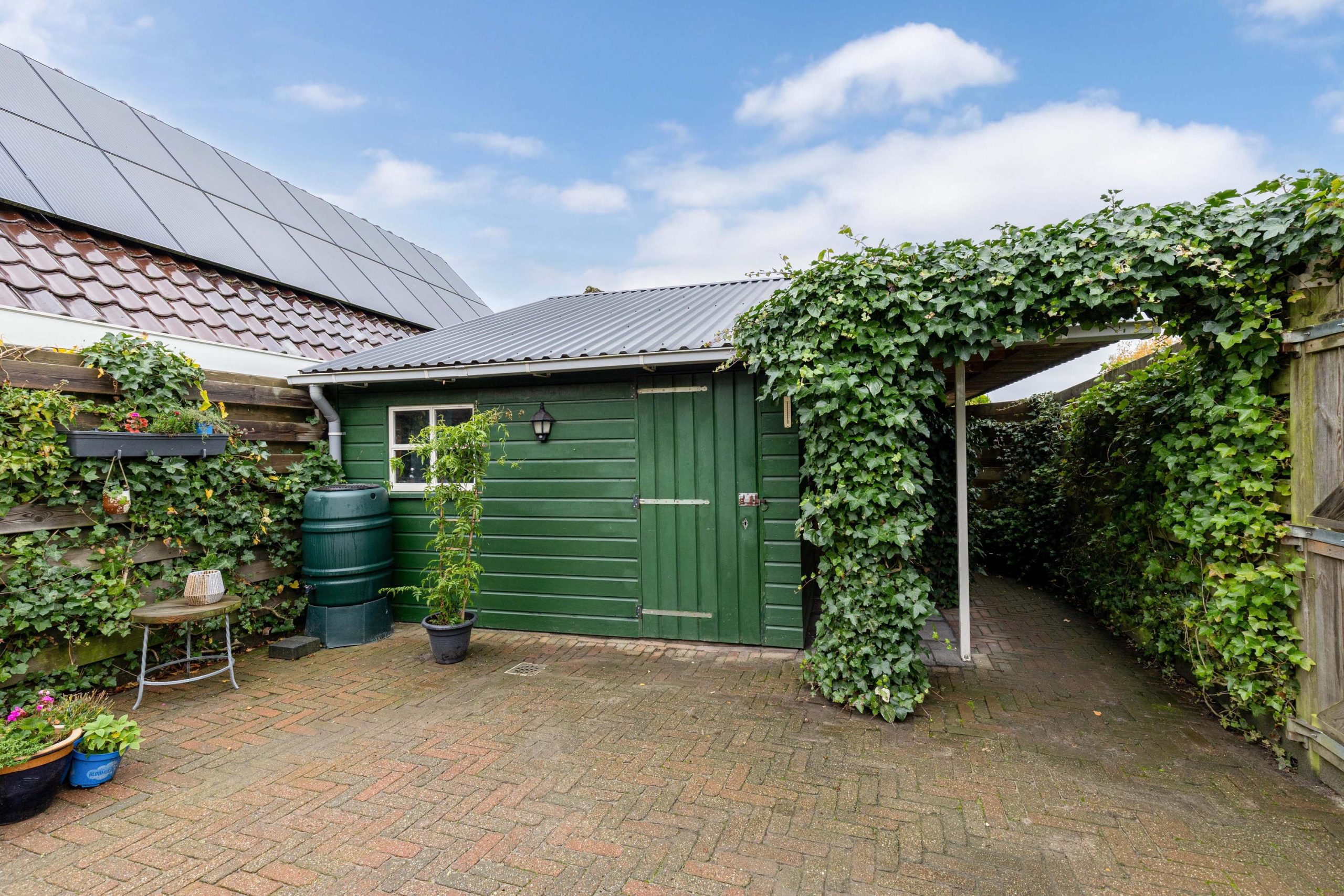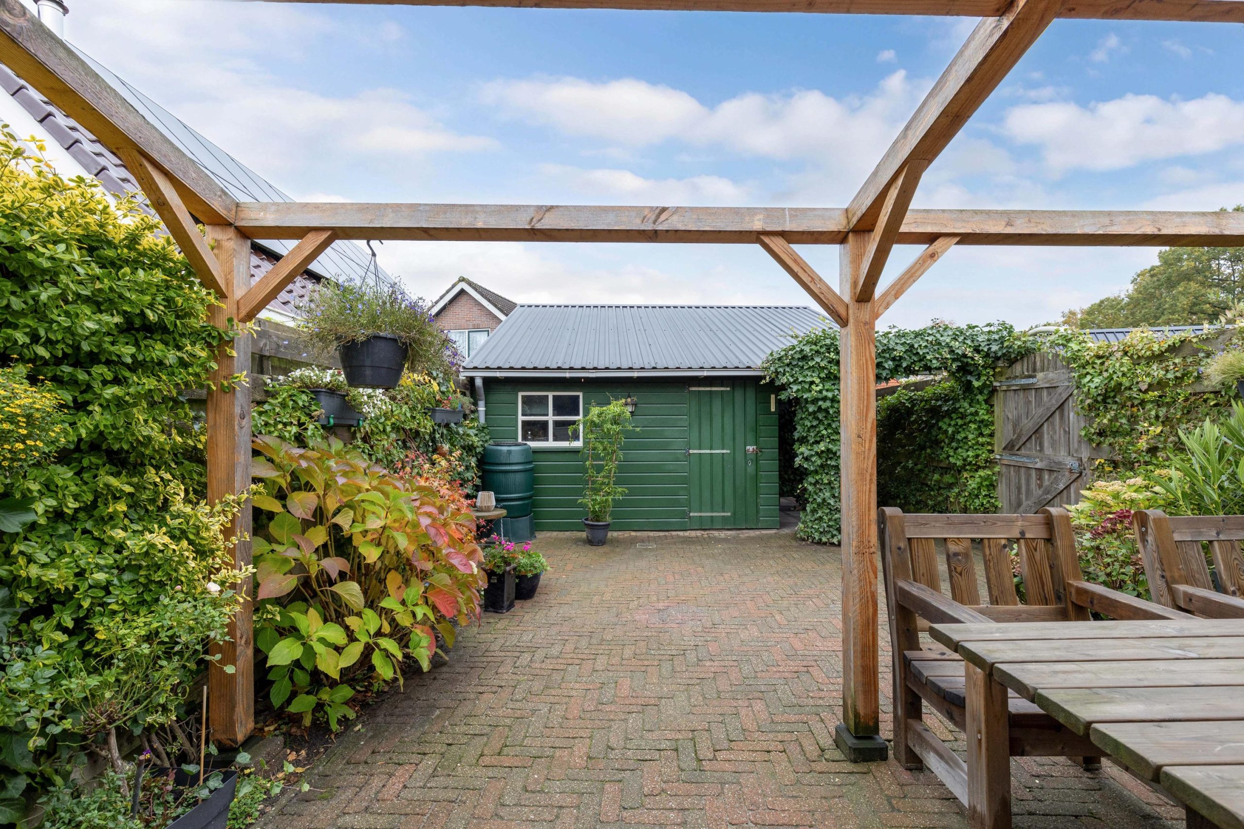 De achtertuin ligt op het zuiden, je hebt nagenoeg de hele dag de zon in de tuin. Verzorgd aangelegd met sierbestrating voor een groot terras en is er een pergola waarbij je een doek kan spannen voor schaduw op hete dagen. Achter in de tuin staat een vrijstaande berging/garage. In de berging is plek voor je fietsen en een werkbank en er is een doorloop naar de garage waar je de auto in kunt stallen of ruimte is voor een creatieve hobby. De toerit naar de garage loopt langs het huis. Ook is er een achterom aan de zijkant van de tuin voor de fietsen. De overkapping naast de berging is een handig klikohoekje en achter de garage is ook nog ruimte om spullen te stallen. De voortuin is onderhoudsarm en verzorgd aangelegd met sierbestrating en een grindborder.