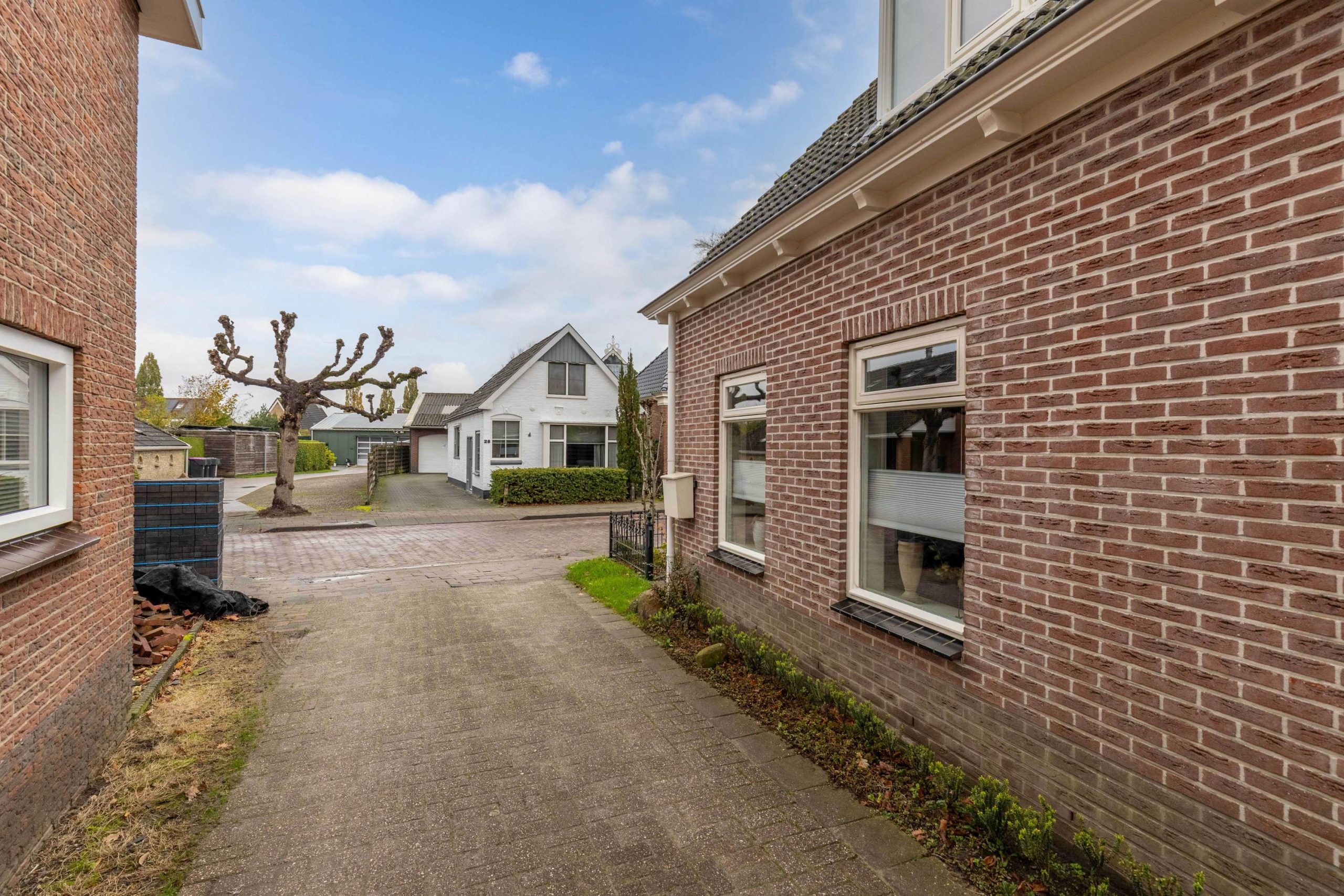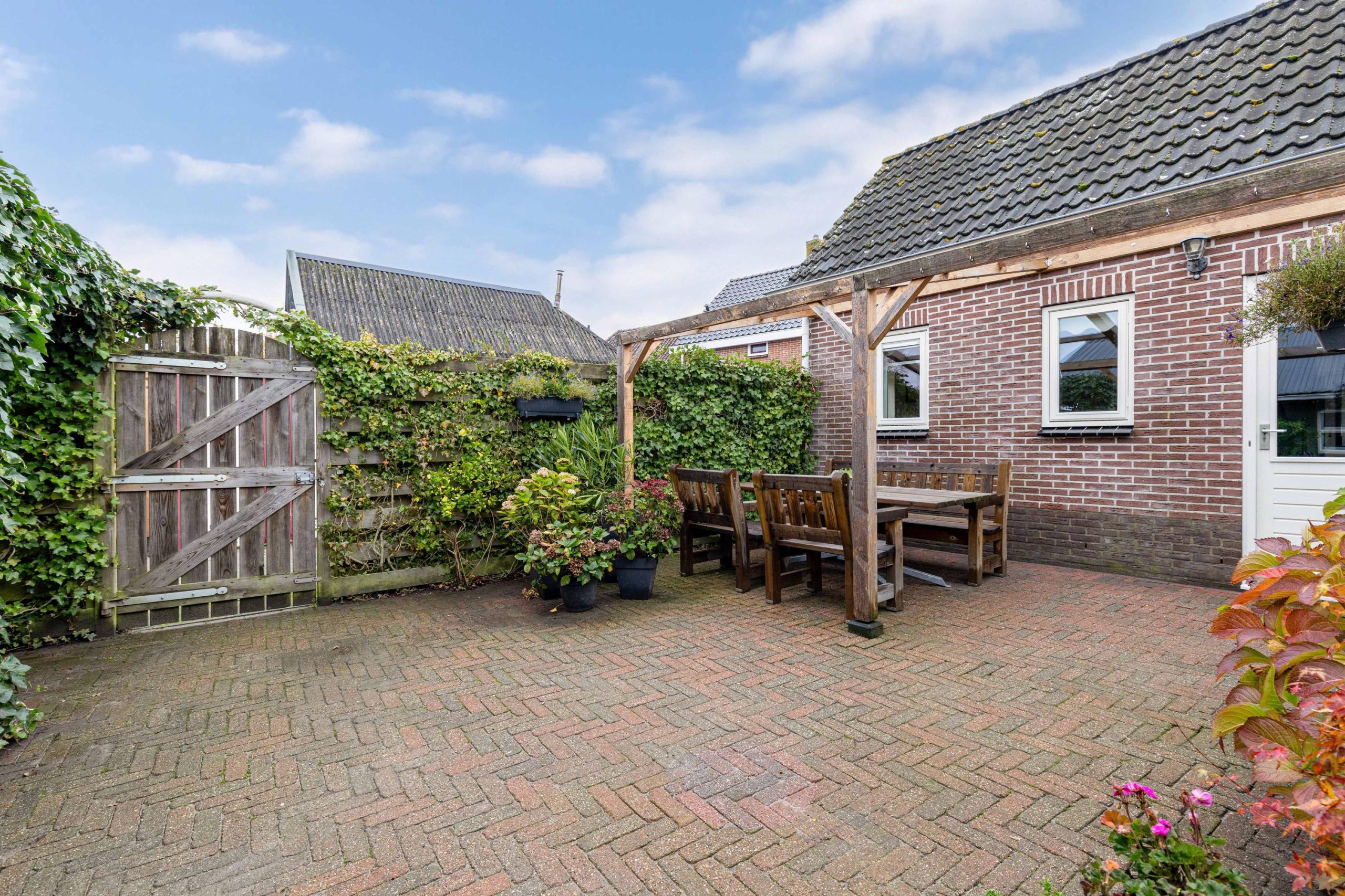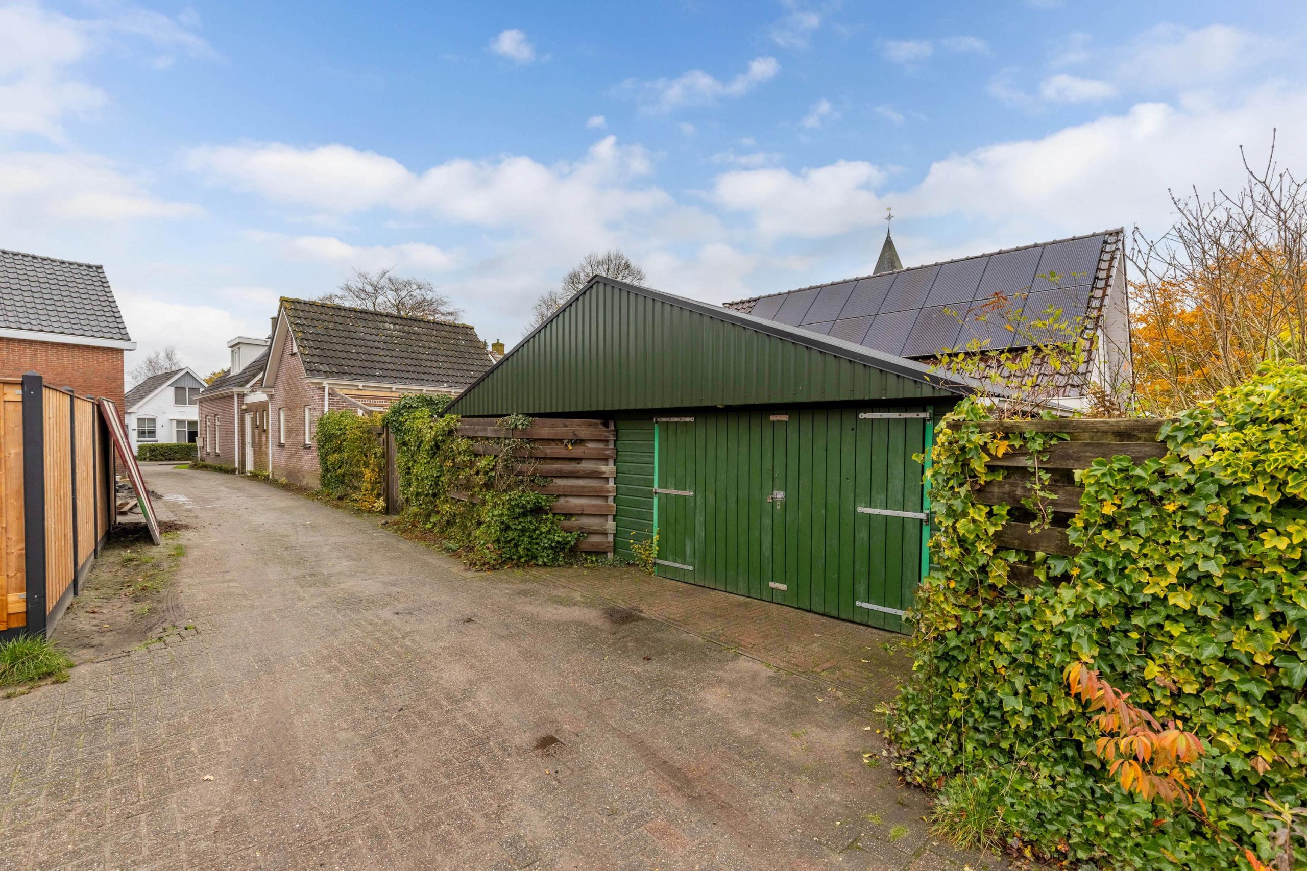 De achtertuin ligt op het zuiden, je hebt nagenoeg de hele dag de zon in de tuin. Verzorgd aangelegd met sierbestrating voor een groot terras en is er een pergola waarbij je een doek kan spannen voor schaduw op hete dagen. Achter in de tuin staat een vrijstaande berging/garage. In de berging is plek voor je fietsen en een werkbank en er is een doorloop naar de garage waar je de auto in kunt stallen of ruimte is voor een creatieve hobby. De toerit naar de garage loopt langs het huis. Ook is er een achterom aan de zijkant van de tuin voor de fietsen. De overkapping naast de berging is een handig klikohoekje en achter de garage is ook nog ruimte om spullen te stallen. De voortuin is onderhoudsarm en verzorgd aangelegd met sierbestrating en een grindborder.