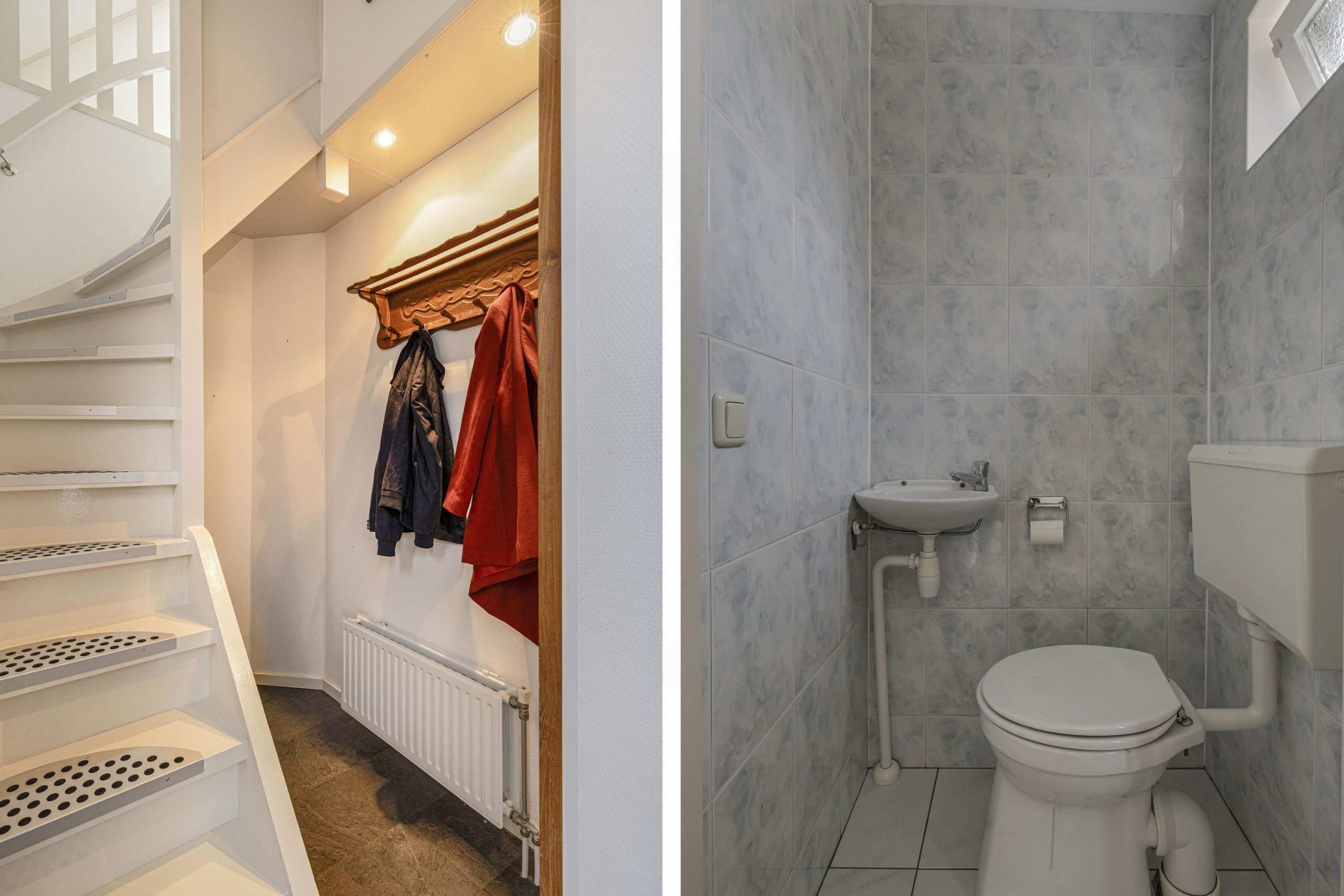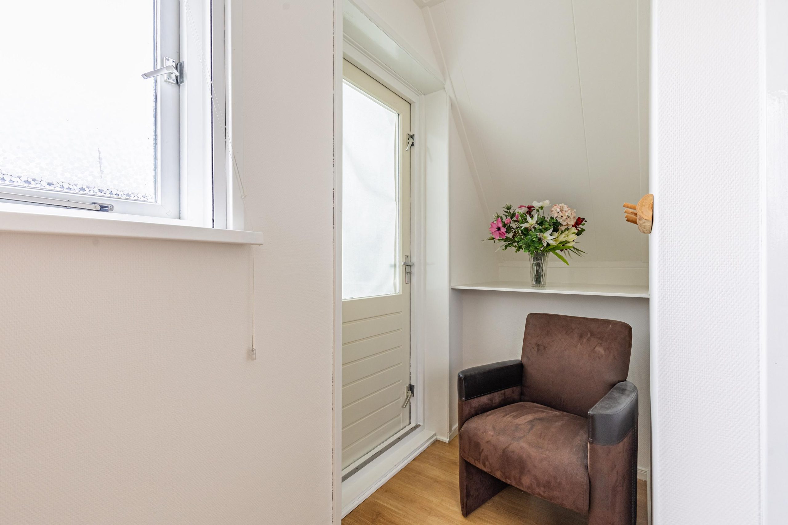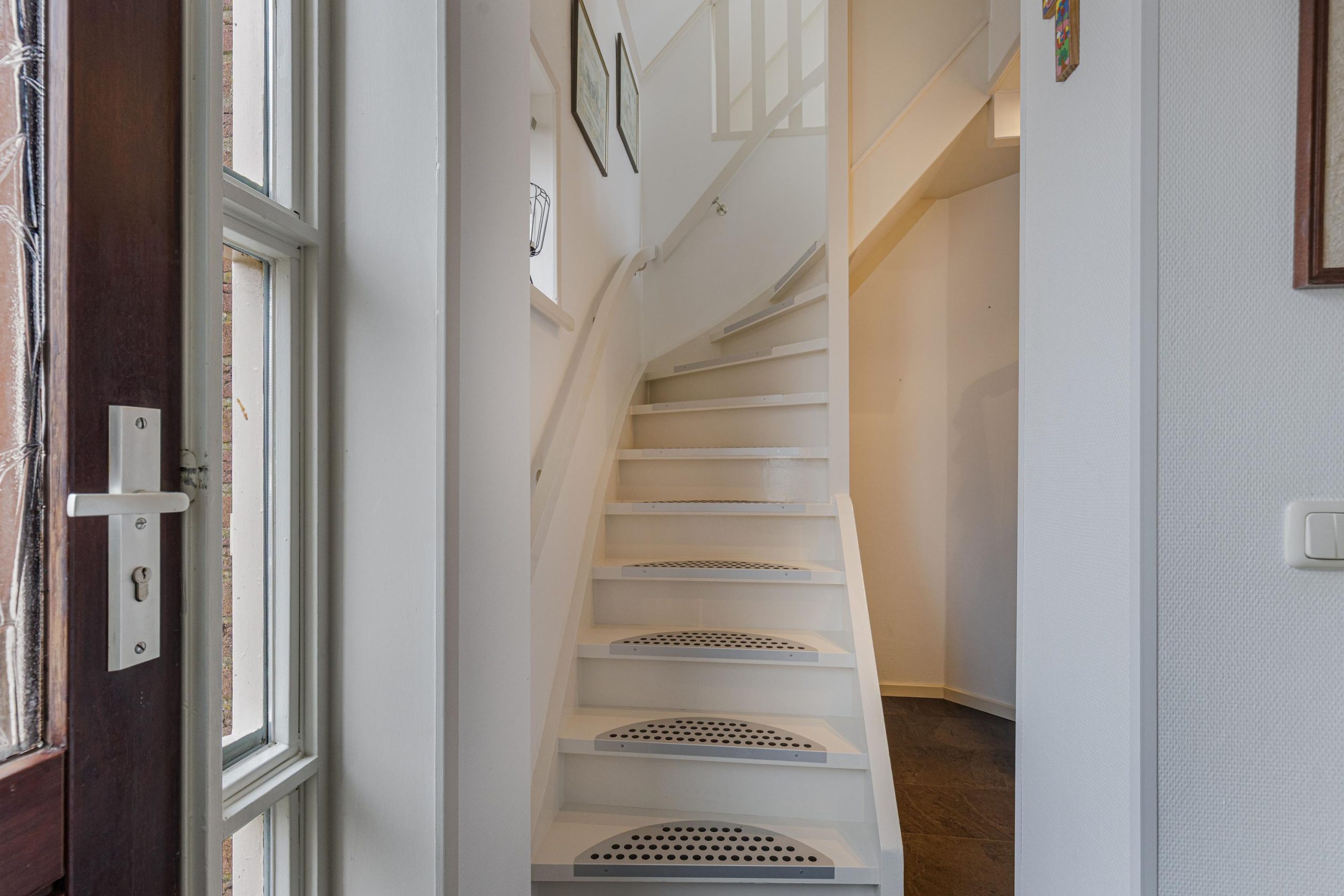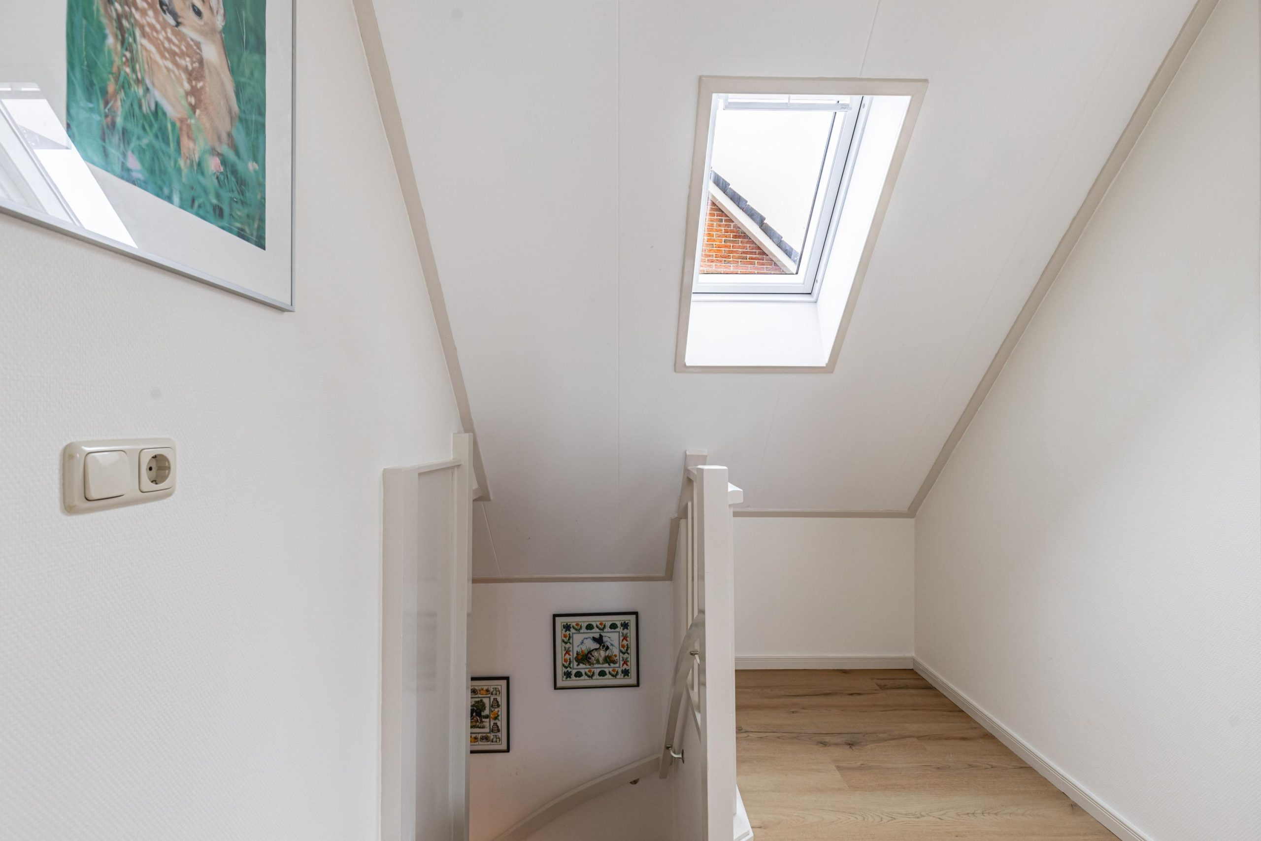 Vanuit de keuken is er een achterportaal naar de tuin. Hier is een vlizotrap die je brengt naar de grote zolderberging. Ideaal voor al je spullen en met cv-opstelling (eigendom, bj 2023).