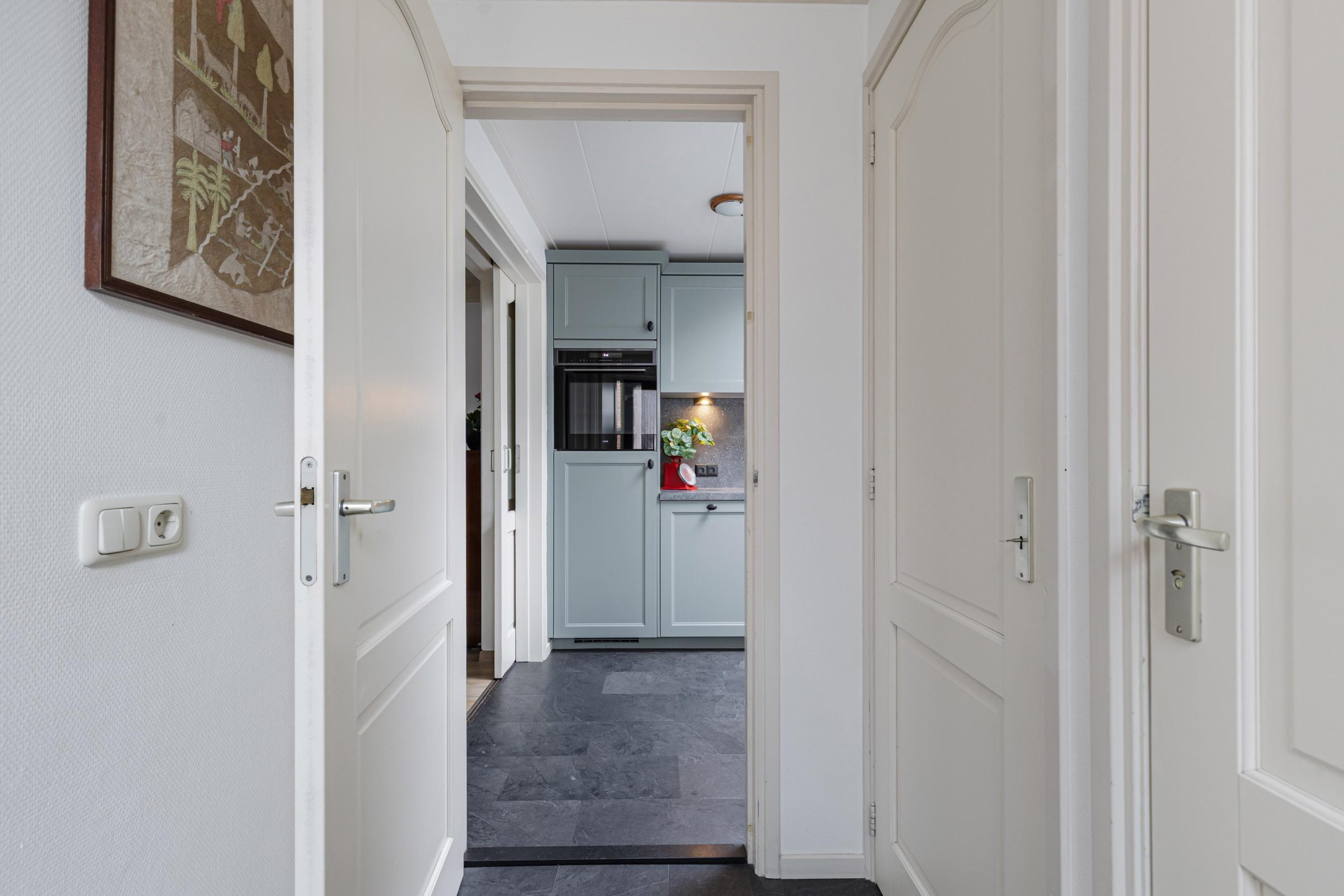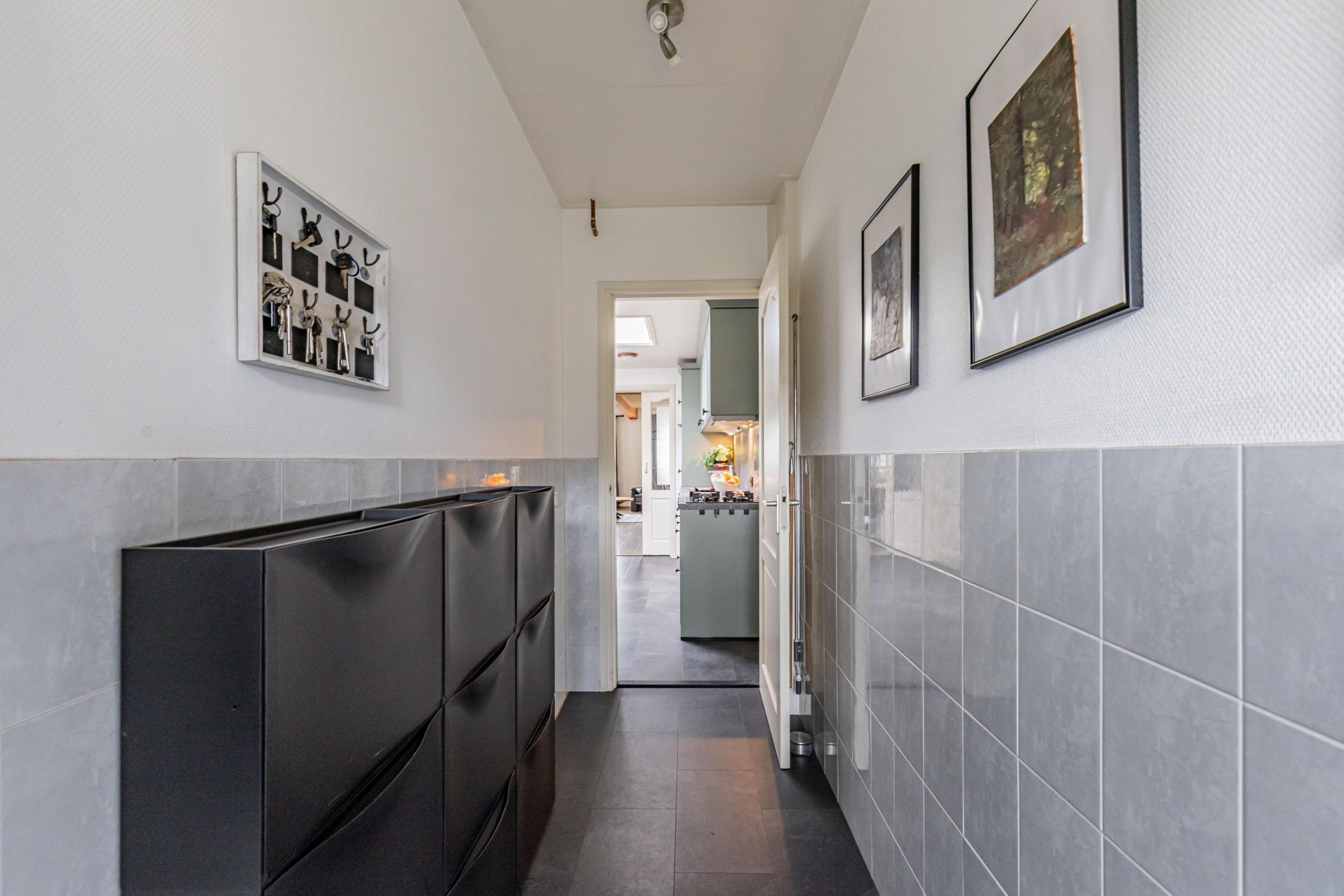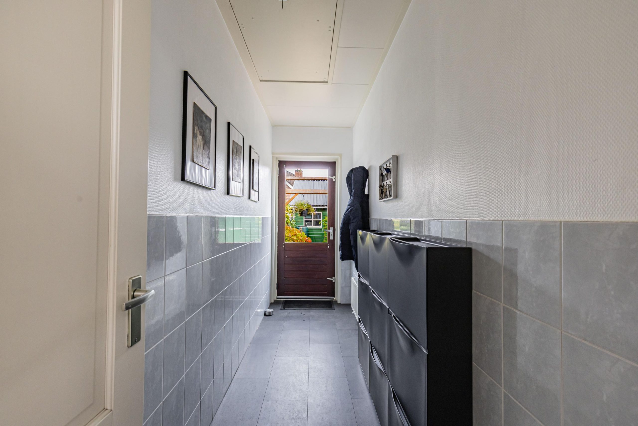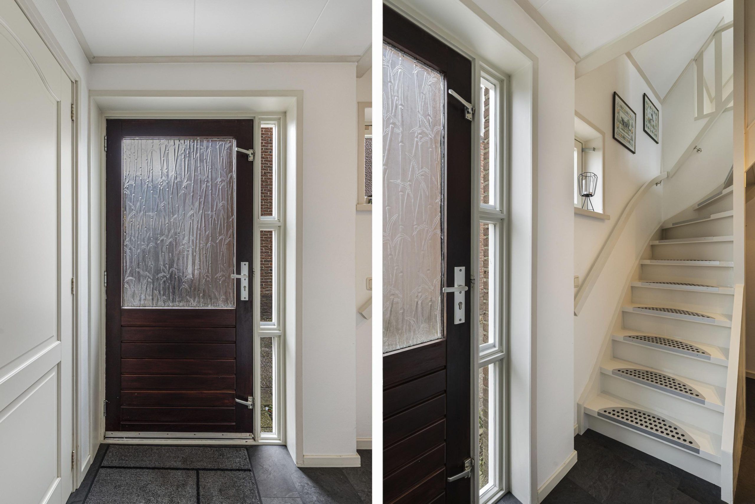 Vanuit de keuken is er een achterportaal naar de tuin. Hier is een vlizotrap die je brengt naar de grote zolderberging. Ideaal voor al je spullen en met cv-opstelling (eigendom, bj 2023).