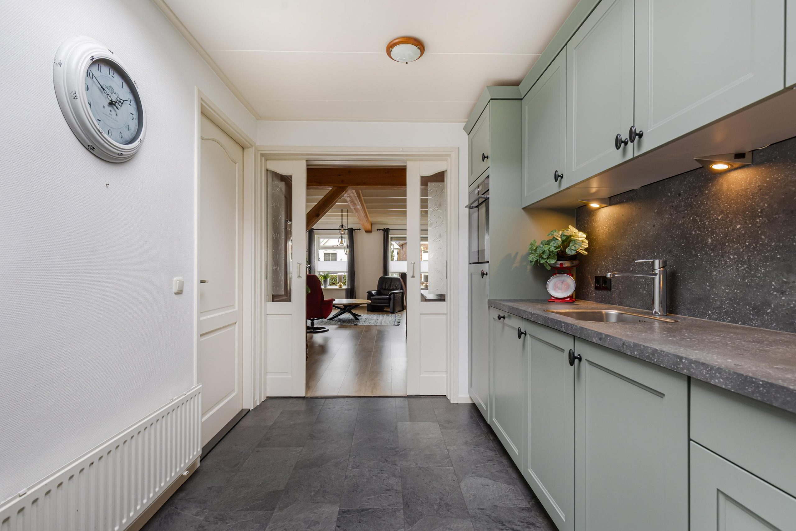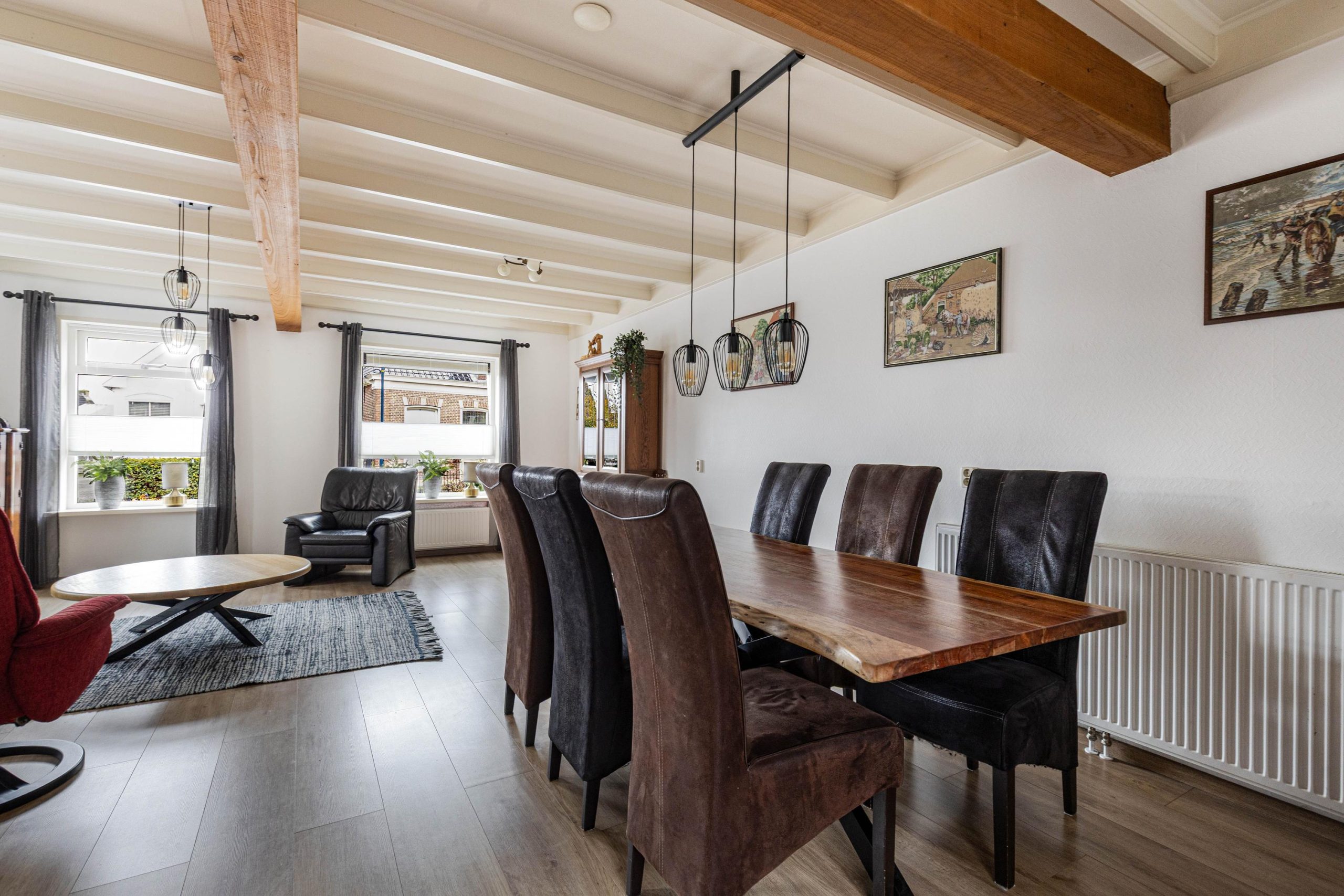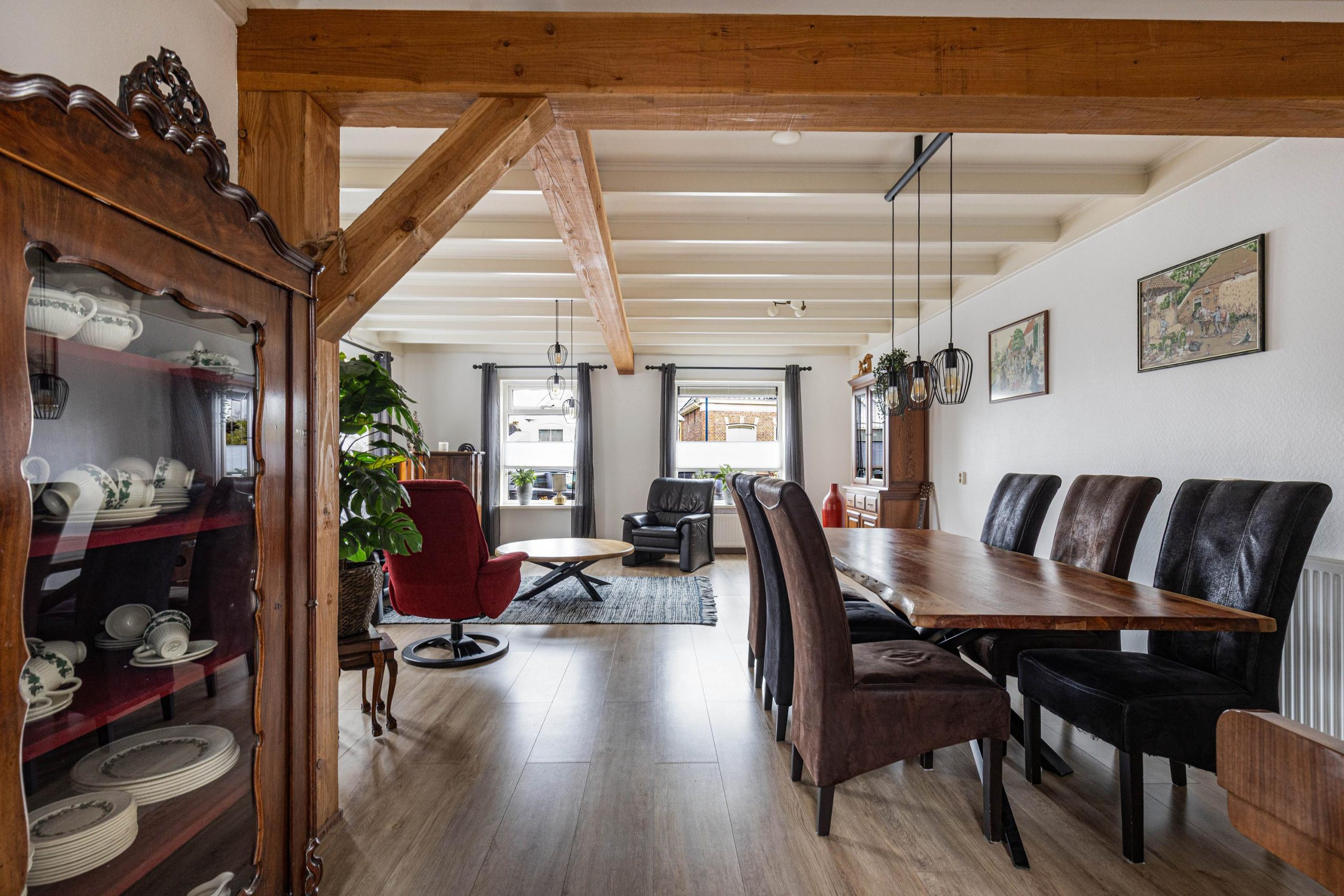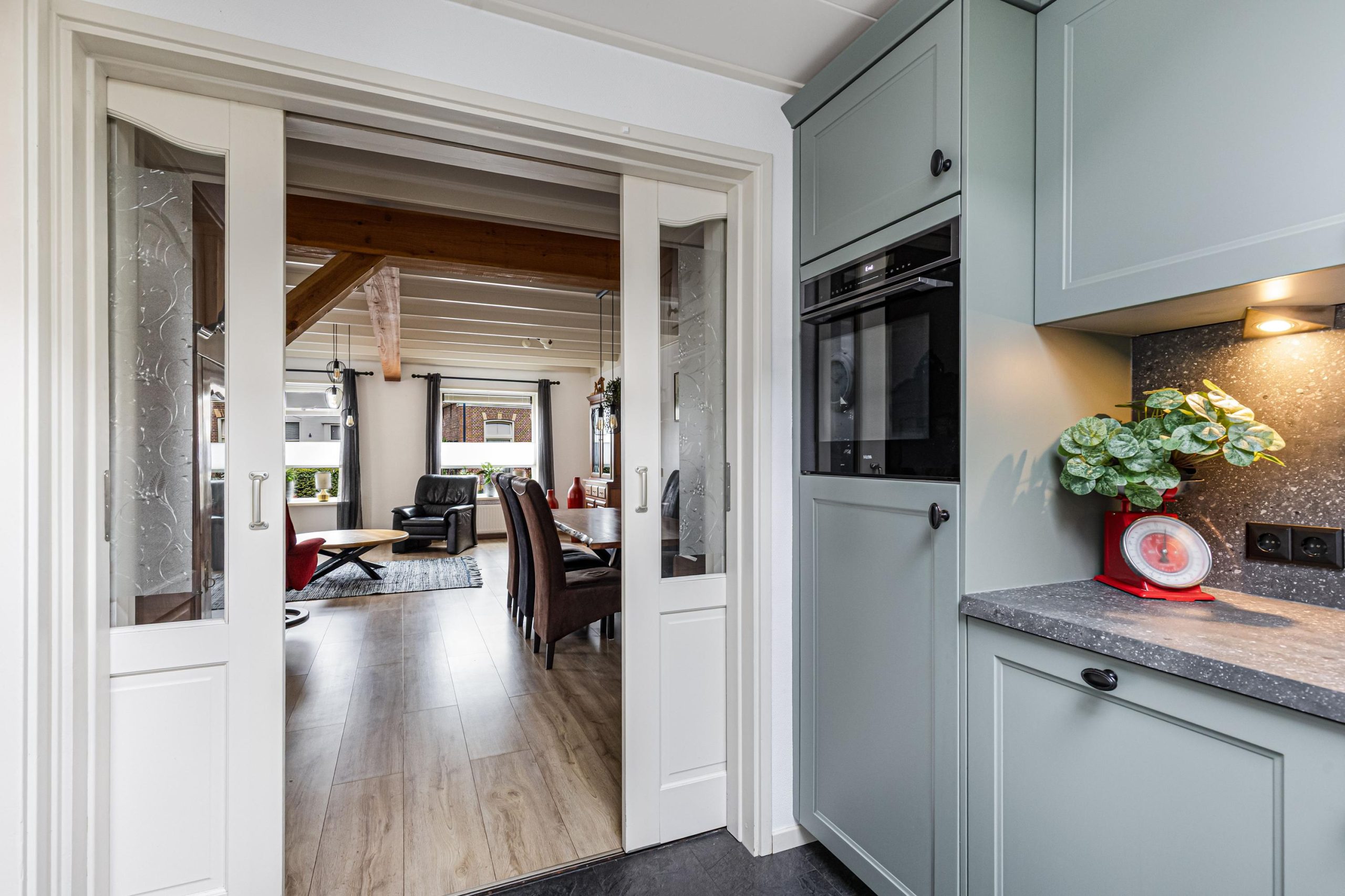Je ademt de sfeer van de woning in op het moment dat je de leefruimte binnenkomt. Vanuit de hal kom je in de keuken die met, fraai in de wand verwerkte, en-suite deuren verbonden is met de woonkamer. Je hebt voor in de kamer veel ruimte voor de tv/zithoek en achter is plek voor een grote familietafel. Kenmerkend is het plafond met balken in het zicht. De half-open keuken heeft een moderne opstelling met een kunststof werkblad op prettige werkhoogte, bovenkasten en soft-close-lades voor veel berging, een oven, een koelkast, een vaatwasser en een gaskookplaat met afzuigkap. Door de grote lichtkoepel, die ook open kan, valt er veel daglicht naar binnen.