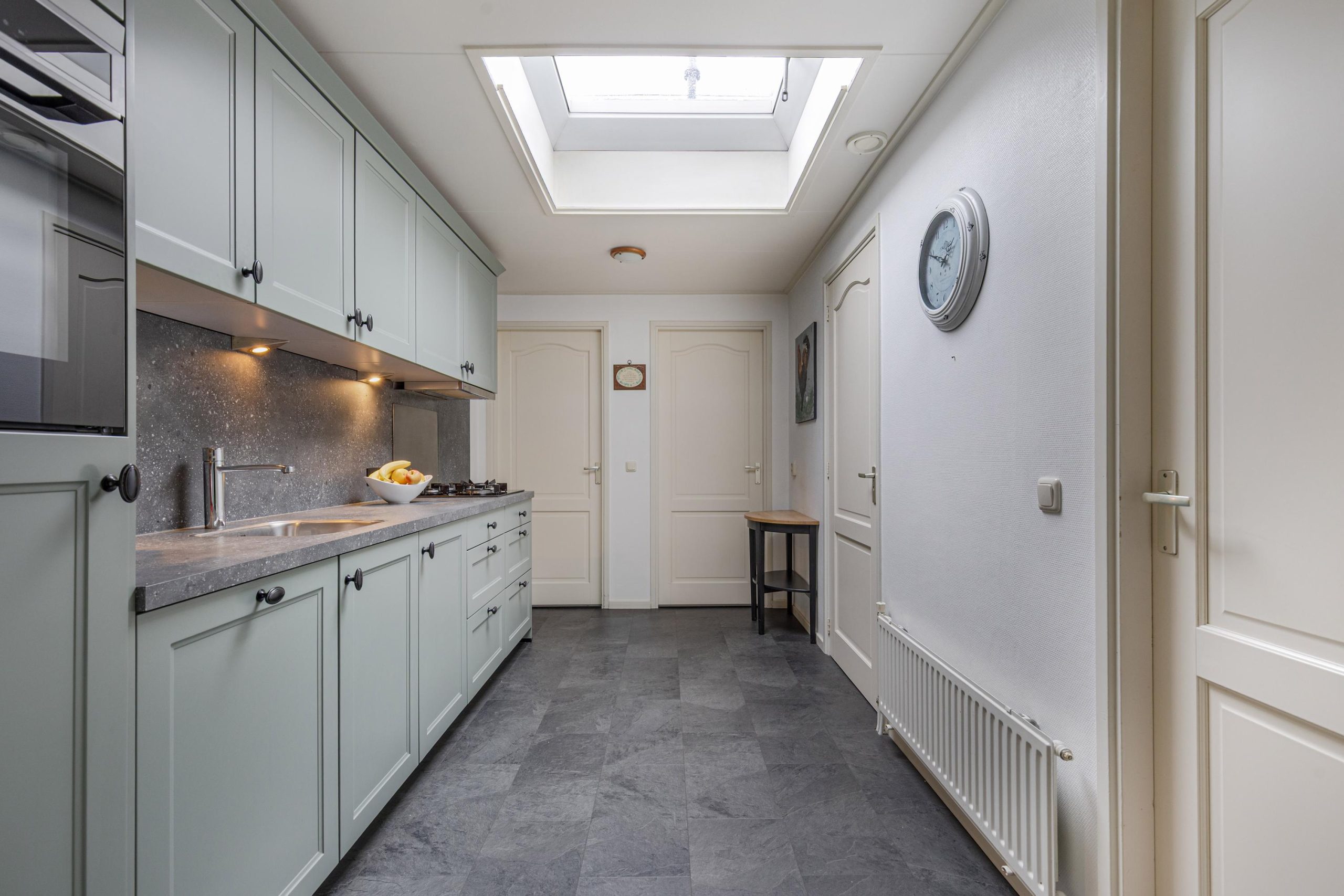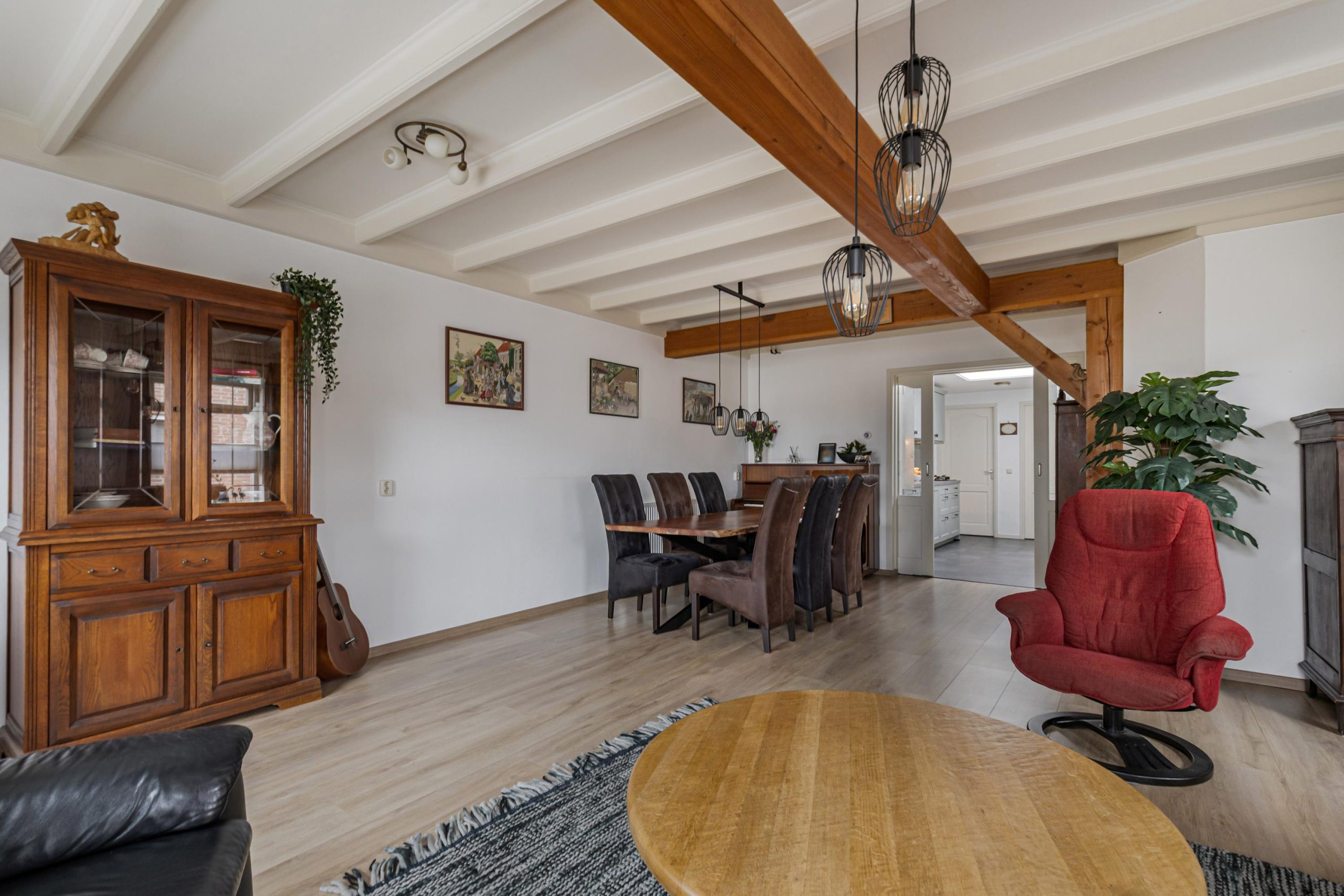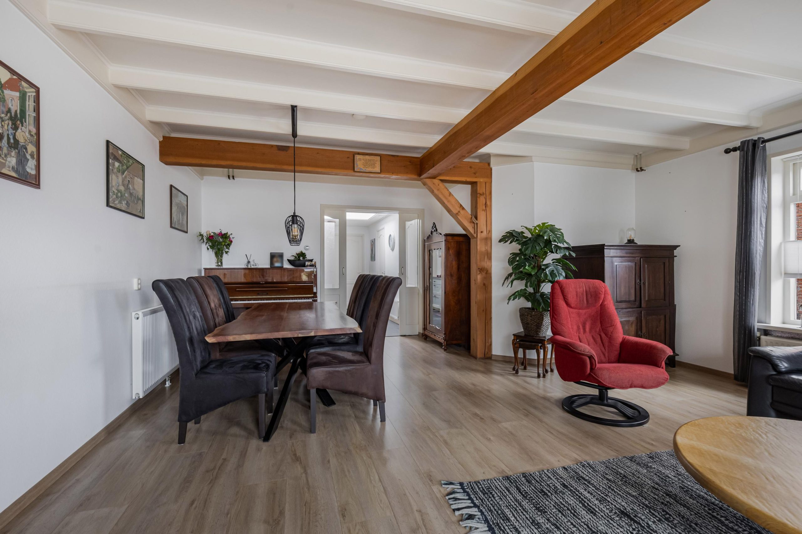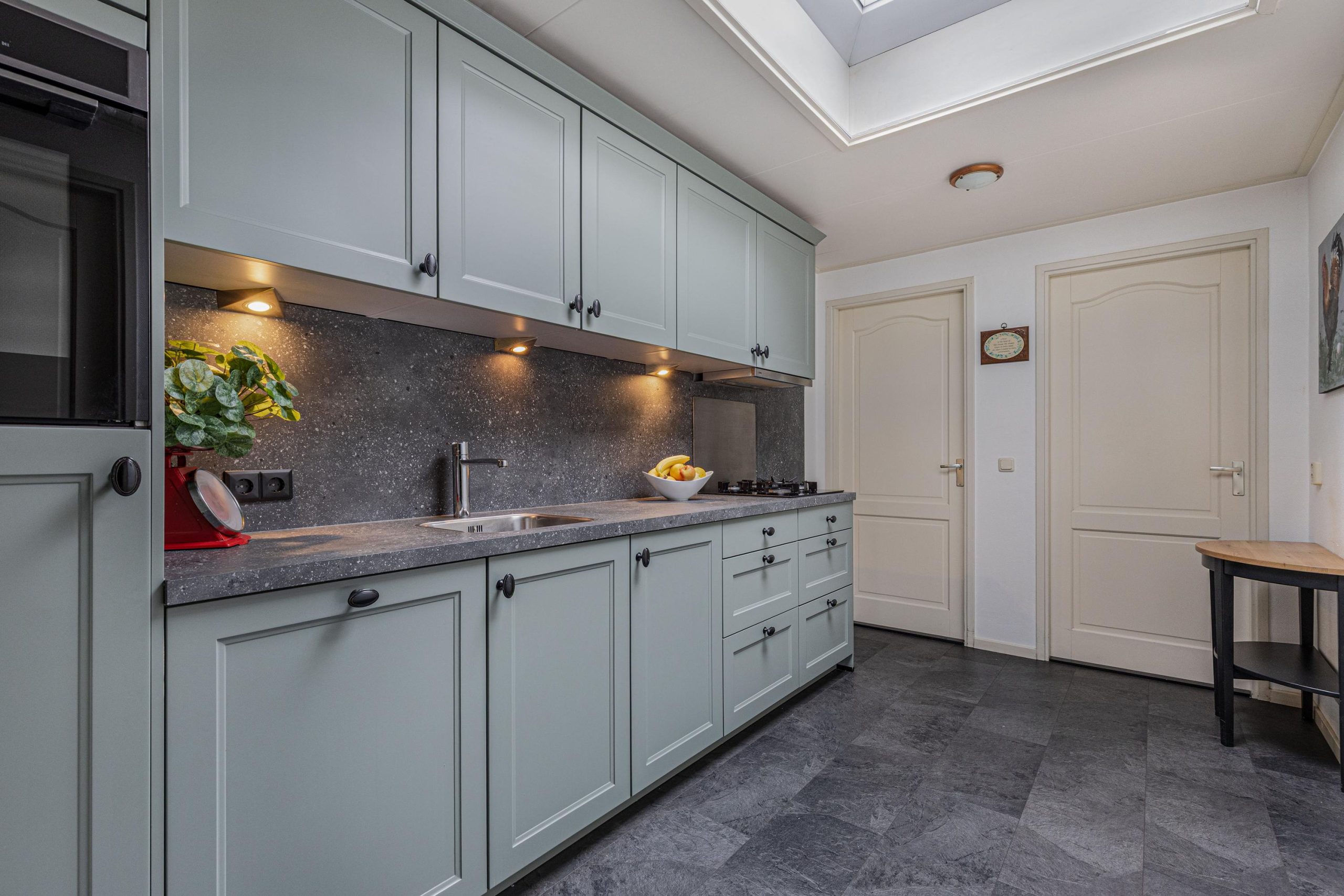 Je ademt de sfeer van de woning in op het moment dat je de leefruimte binnenkomt. Vanuit de hal kom je in de keuken die met, fraai in de wand verwerkte, en-suite deuren verbonden is met de woonkamer. Je hebt voor in de kamer veel ruimte voor de tv/zithoek en achter is plek voor een grote familietafel. Kenmerkend is het plafond met balken in het zicht. De half-open keuken heeft een moderne opstelling met een kunststof werkblad op prettige werkhoogte, bovenkasten en soft-close-lades voor veel berging, een oven, een koelkast, een vaatwasser en een gaskookplaat met afzuigkap. Door de grote lichtkoepel, die ook open kan, valt er veel daglicht naar binnen.