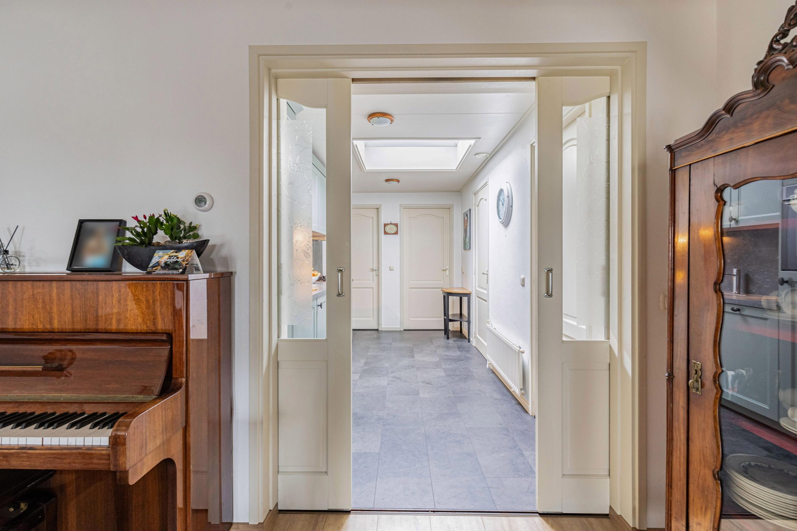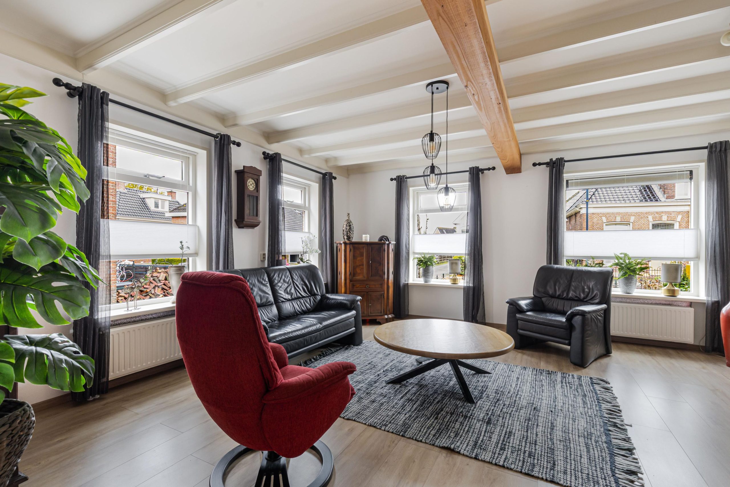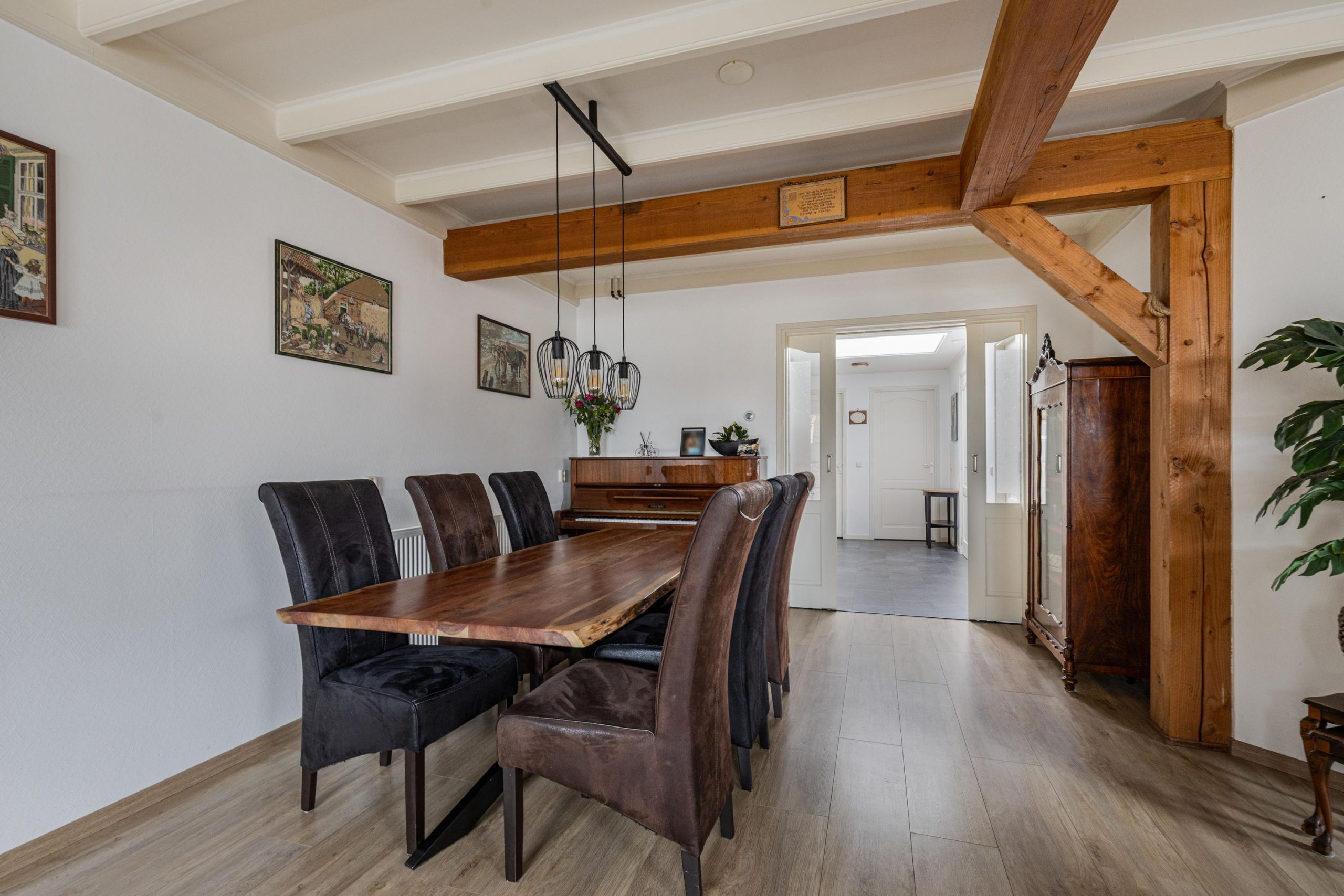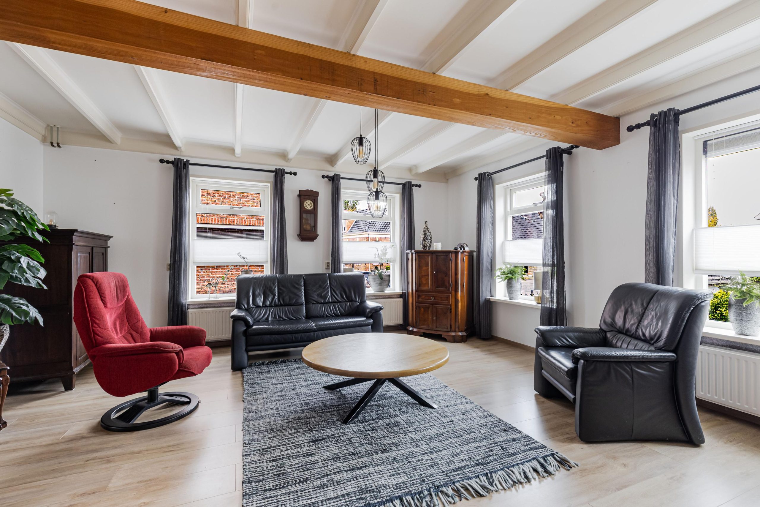 Je ademt de sfeer van de woning in op het moment dat je de leefruimte binnenkomt. Vanuit de hal kom je in de keuken die met, fraai in de wand verwerkte, en-suite deuren verbonden is met de woonkamer. Je hebt voor in de kamer veel ruimte voor de tv/zithoek en achter is plek voor een grote familietafel. Kenmerkend is het plafond met balken in het zicht. De half-open keuken heeft een moderne opstelling met een kunststof werkblad op prettige werkhoogte, bovenkasten en soft-close-lades voor veel berging, een oven, een koelkast, een vaatwasser en een gaskookplaat met afzuigkap. Door de grote lichtkoepel, die ook open kan, valt er veel daglicht naar binnen.