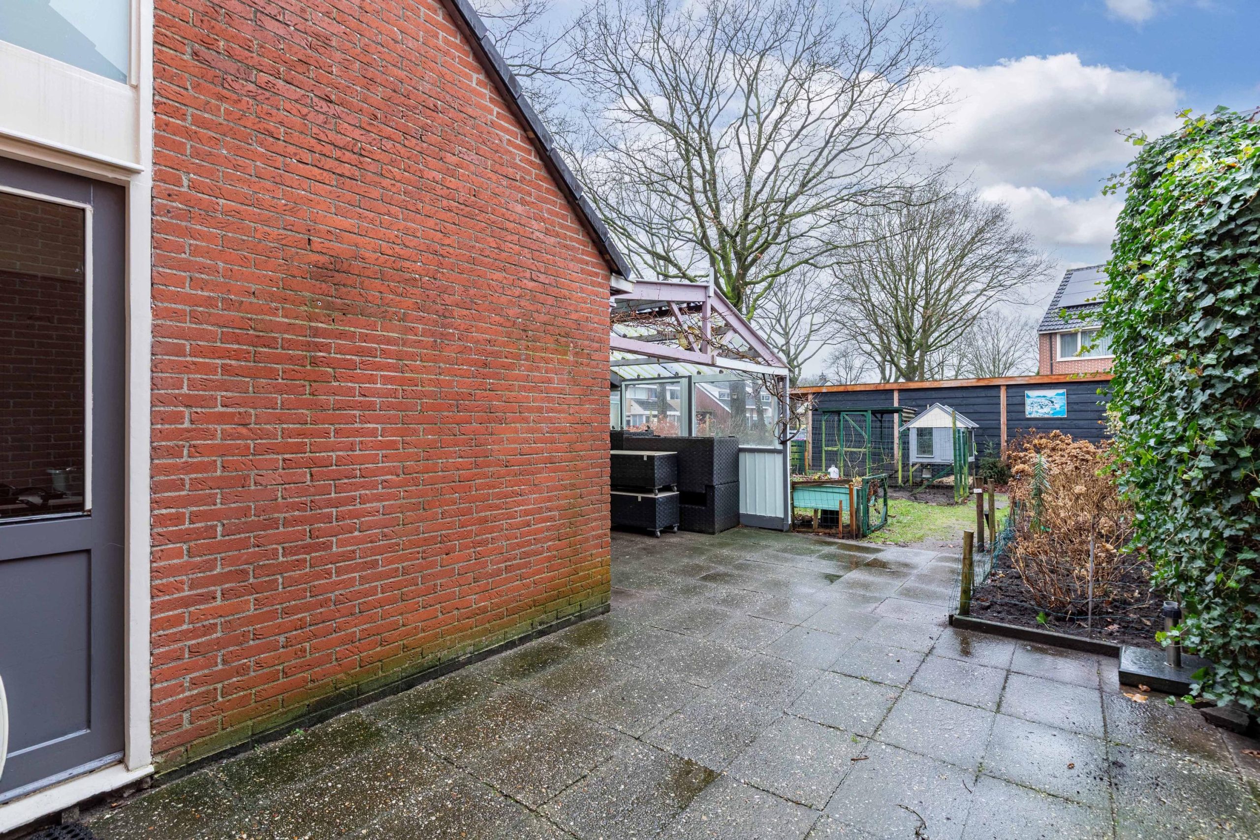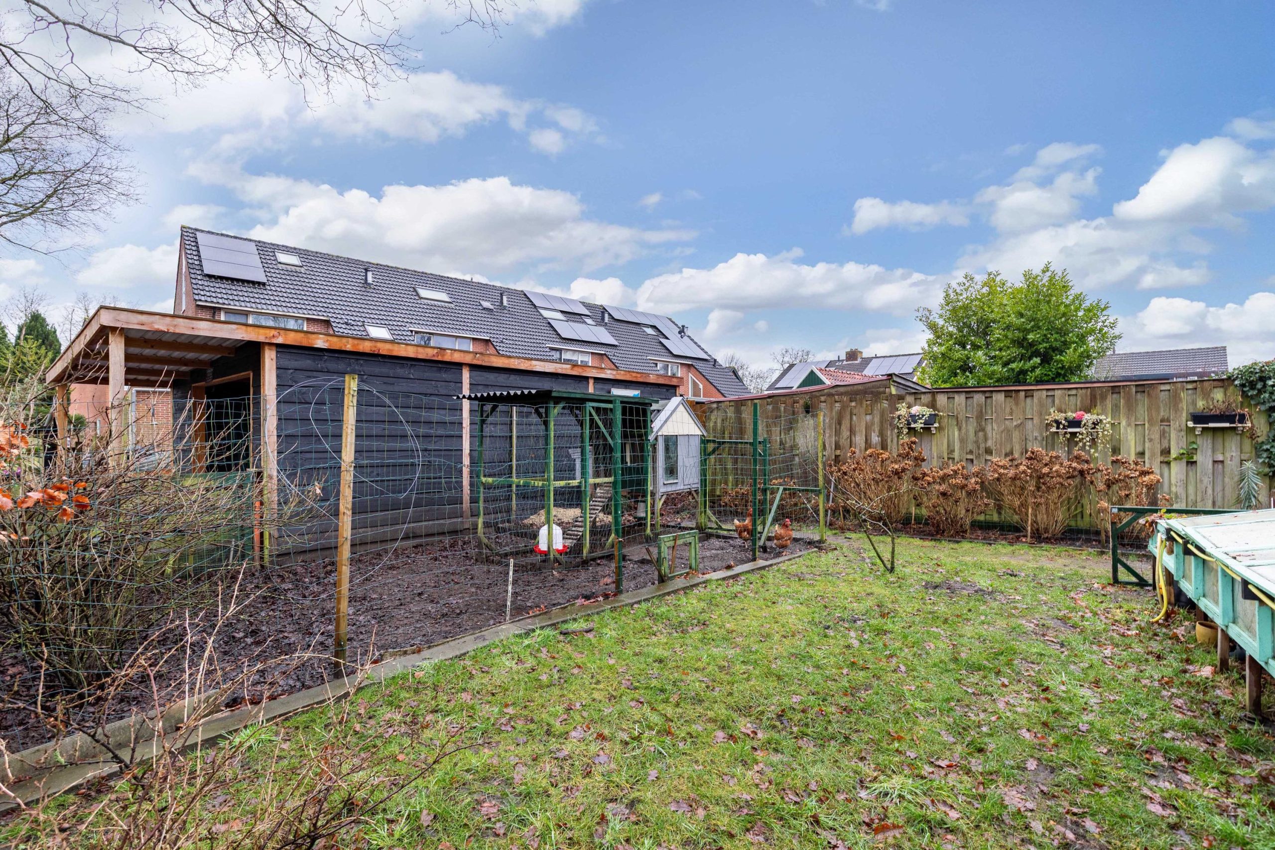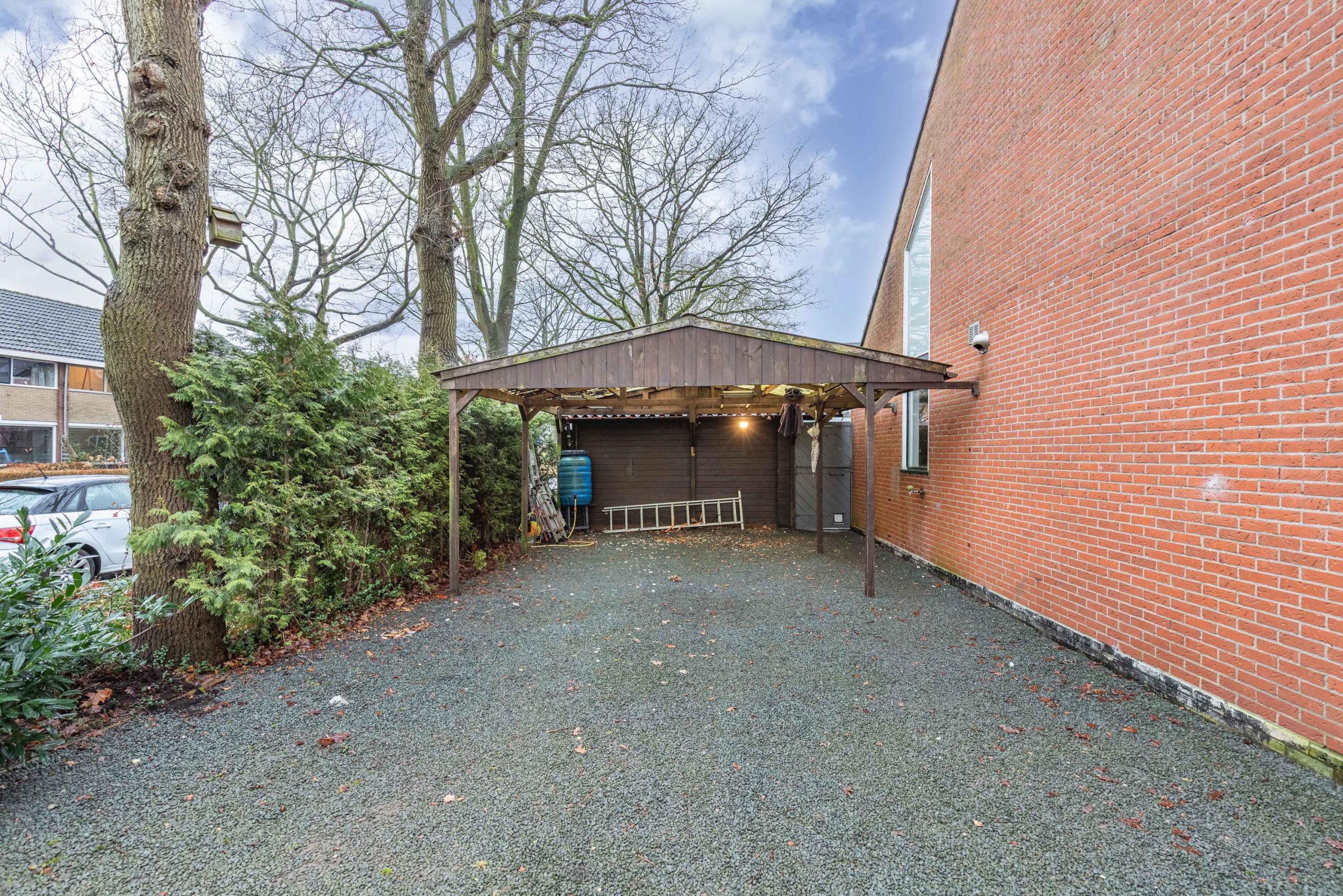 Je beschikt over veel privacy door de hoekligging van het huis en de tuin is verzorgd aangelegd met terras, borders en gazon. Achter in de tuin is een kippenren en je beschikt over kleine tuinkassen. Er is een overkapping gebouwd waar je al snel buiten kunt zitten en er is een grote vrijstaande houten berging, ideaal voor de fietsen en een werkbank. Onder de carport, aan het einde van de oprit, kun je je auto op eigen terrein overdekt parkeren. Op de oprit aangelegd met grind is ruimte voor meerdere auto's. Door de breedte van het perceel en de ruimte naast het huis biedt het huis volop mogelijkheden voor een aanbouw aan de zijgevel!