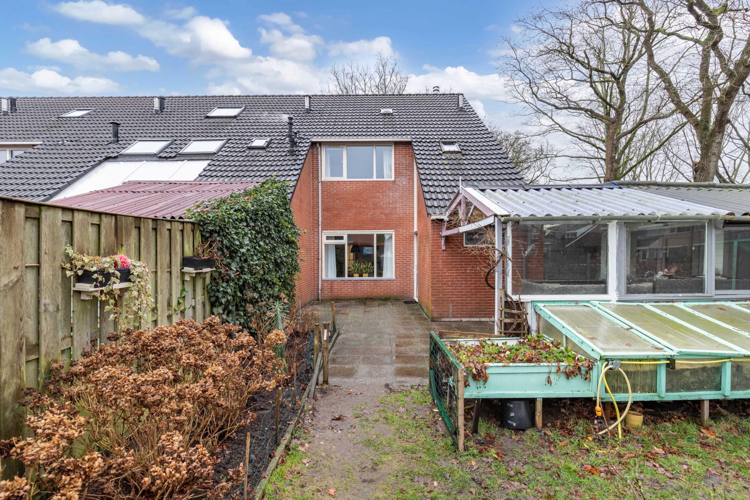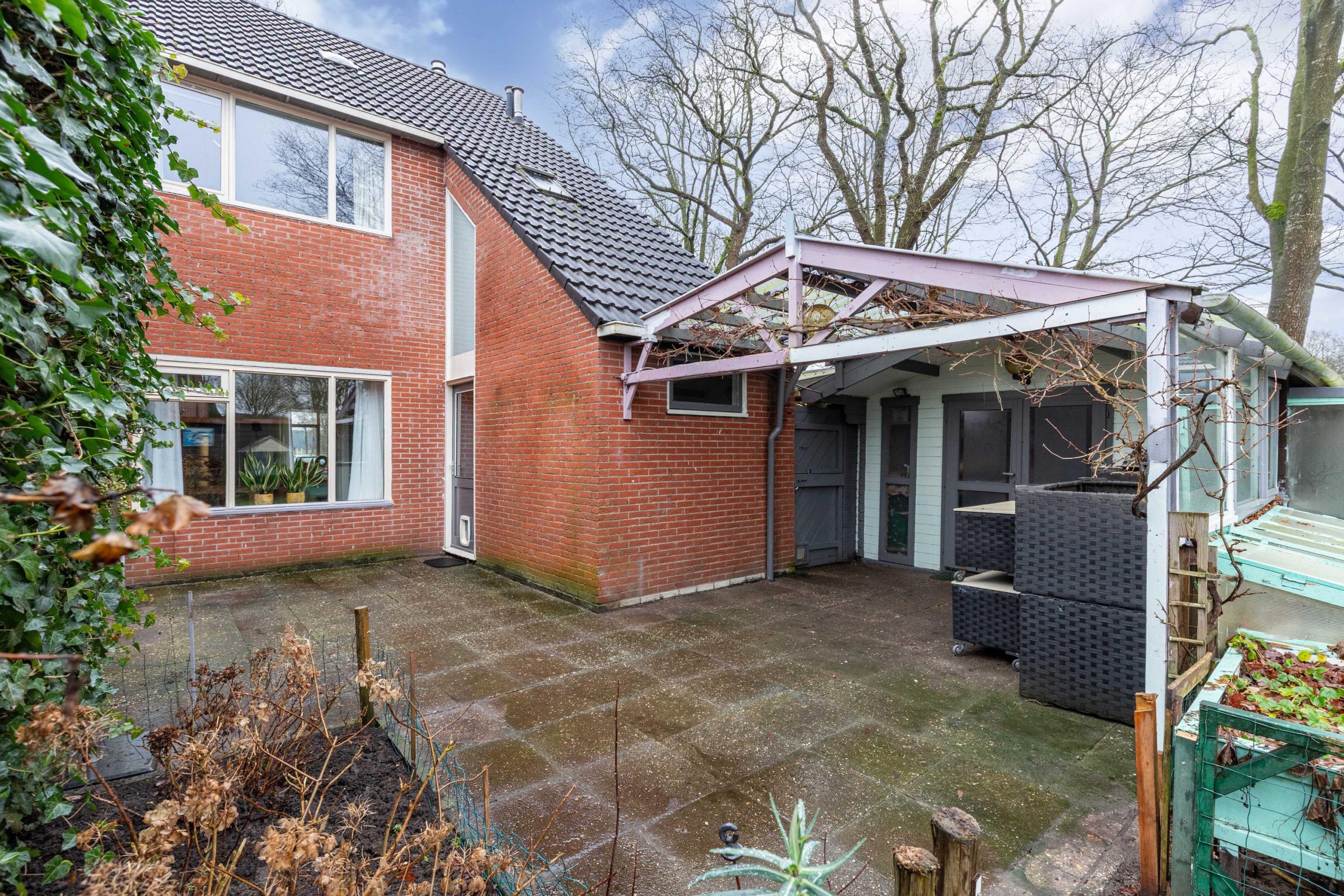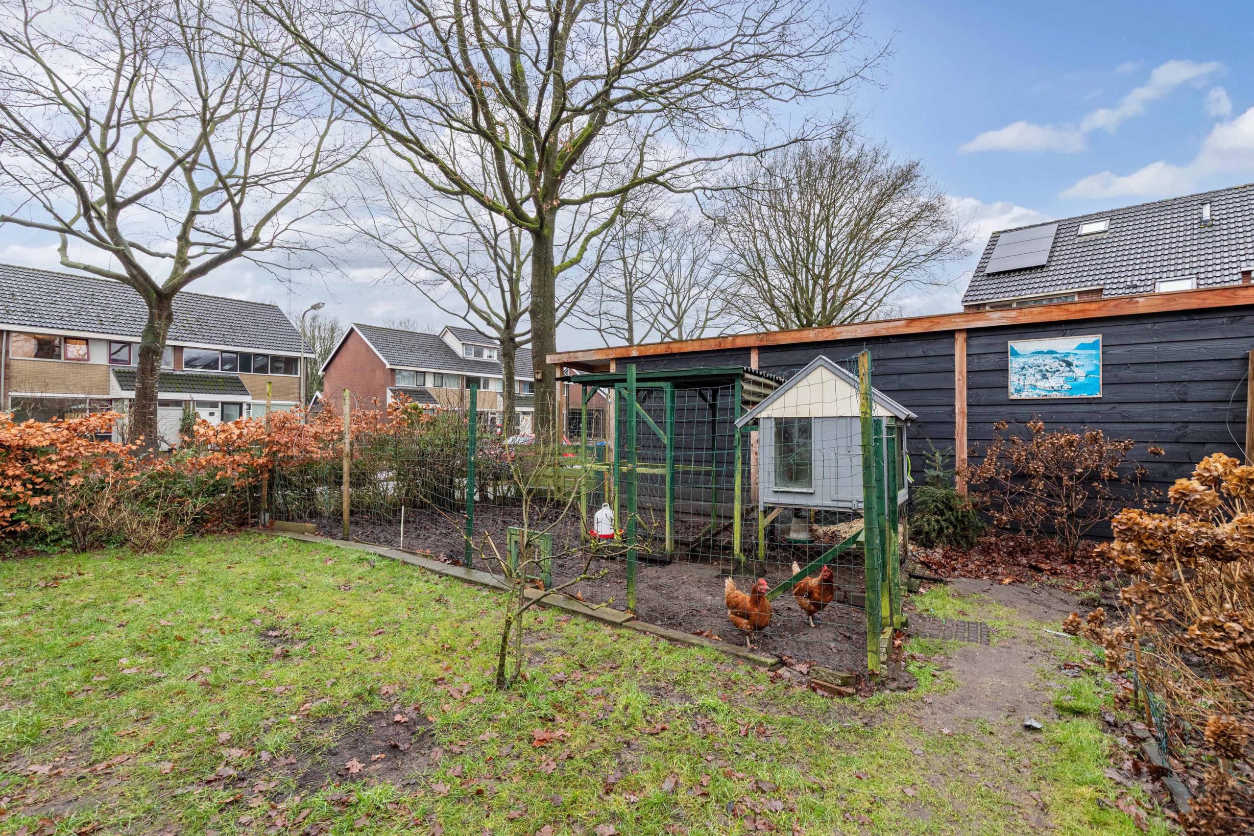 Je beschikt over veel privacy door de hoekligging van het huis en de tuin is verzorgd aangelegd met terras, borders en gazon. Achter in de tuin is een kippenren en je beschikt over kleine tuinkassen. Er is een overkapping gebouwd waar je al snel buiten kunt zitten en er is een grote vrijstaande houten berging, ideaal voor de fietsen en een werkbank. Onder de carport, aan het einde van de oprit, kun je je auto op eigen terrein overdekt parkeren. Op de oprit aangelegd met grind is ruimte voor meerdere auto's. Door de breedte van het perceel en de ruimte naast het huis biedt het huis volop mogelijkheden voor een aanbouw aan de zijgevel!