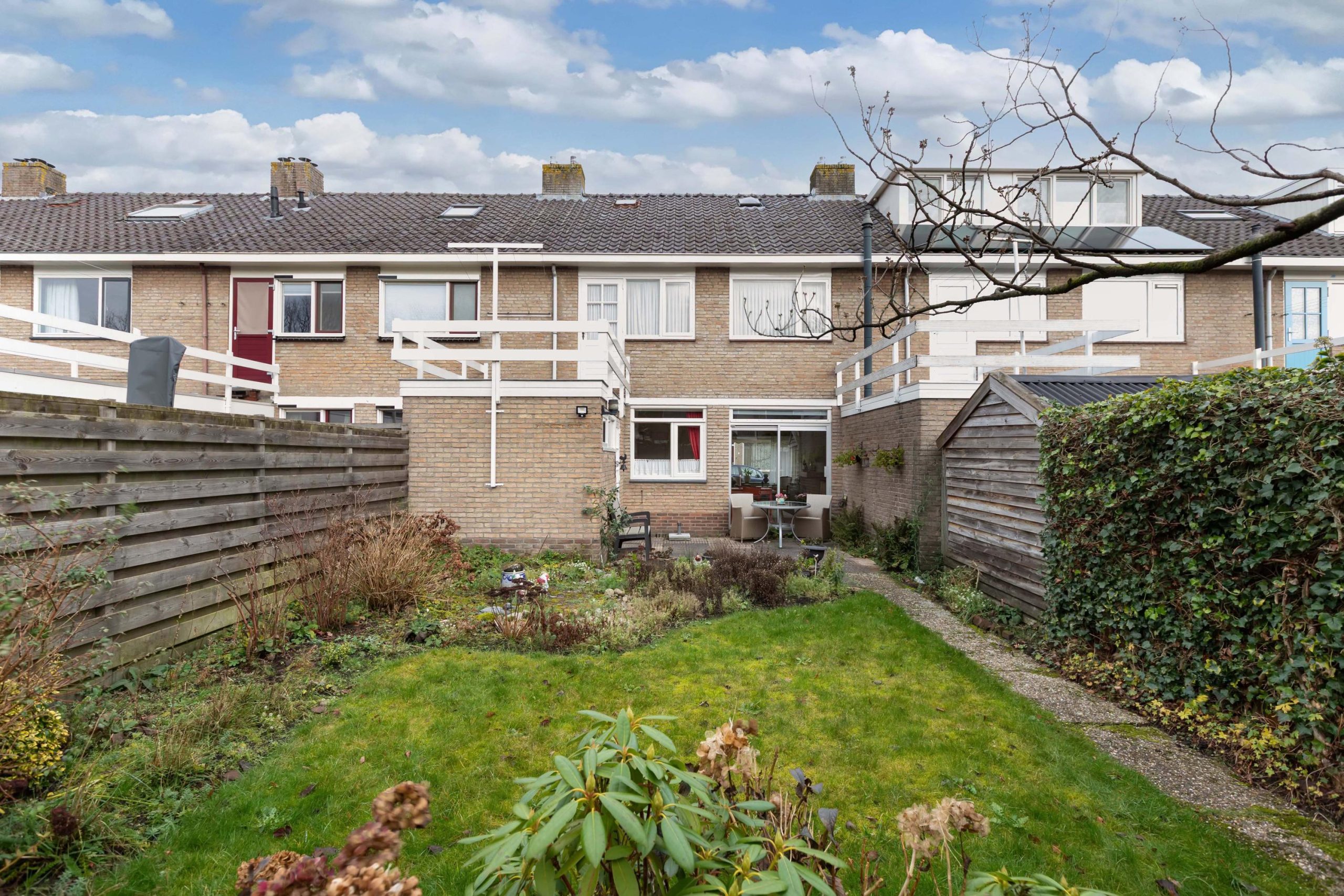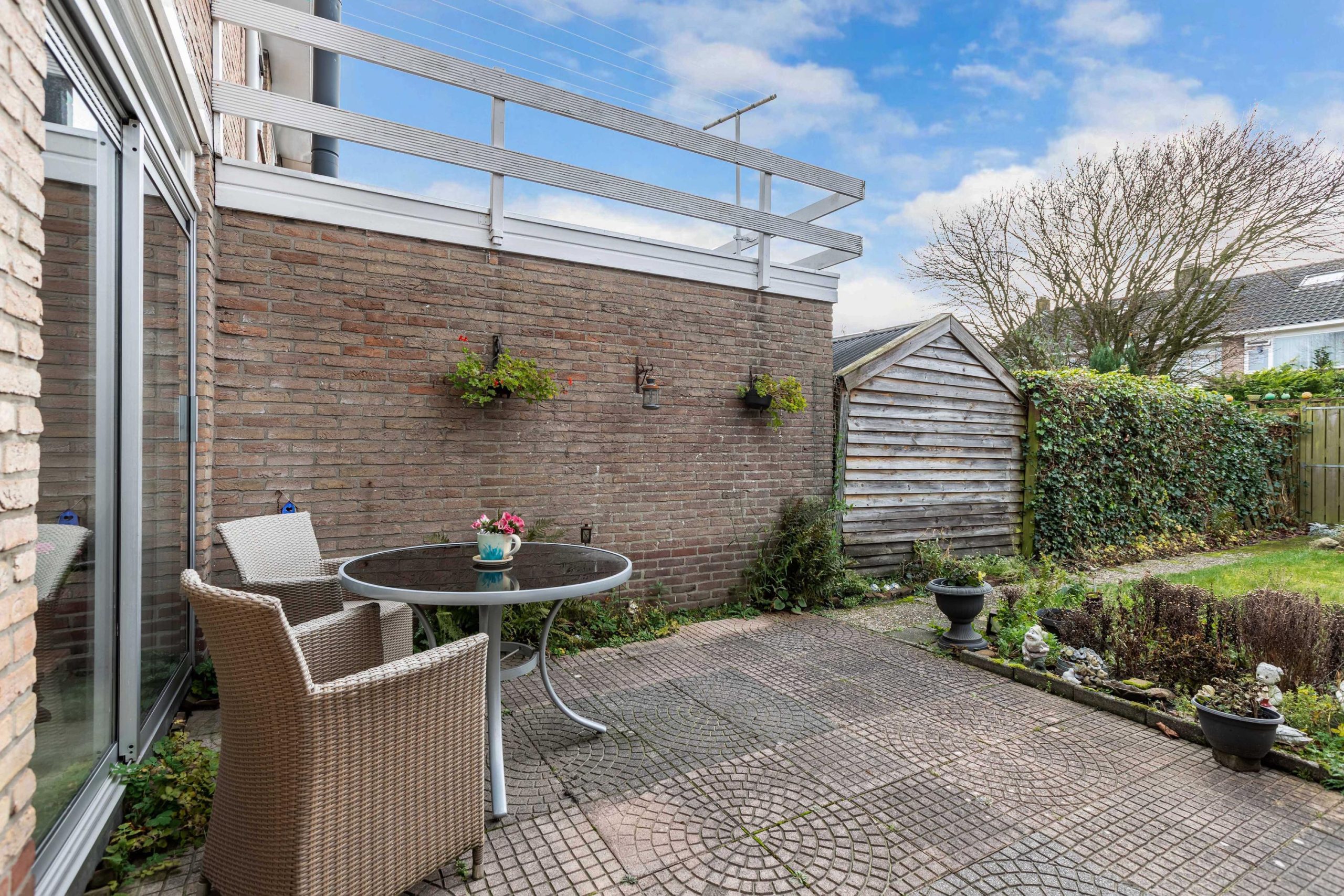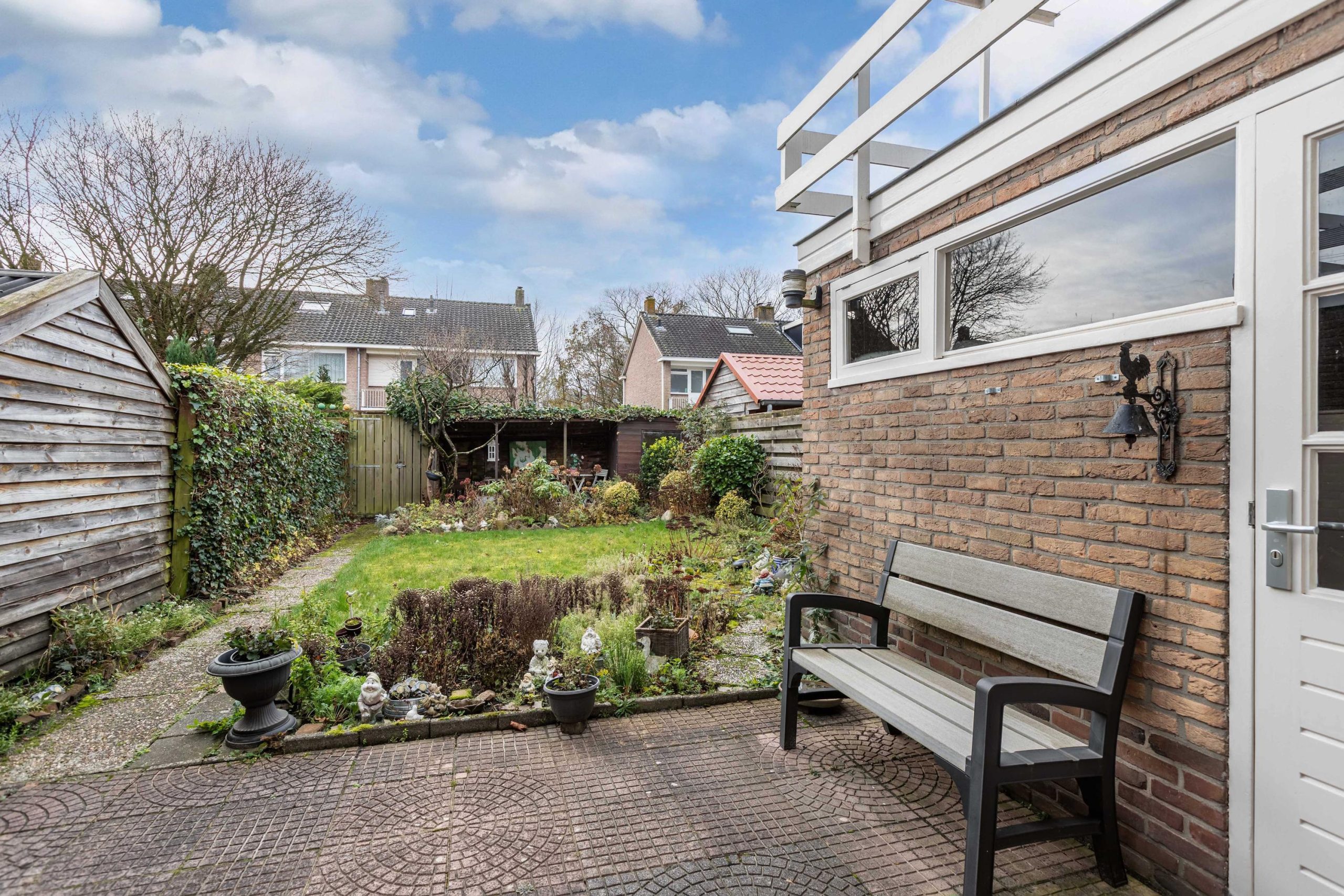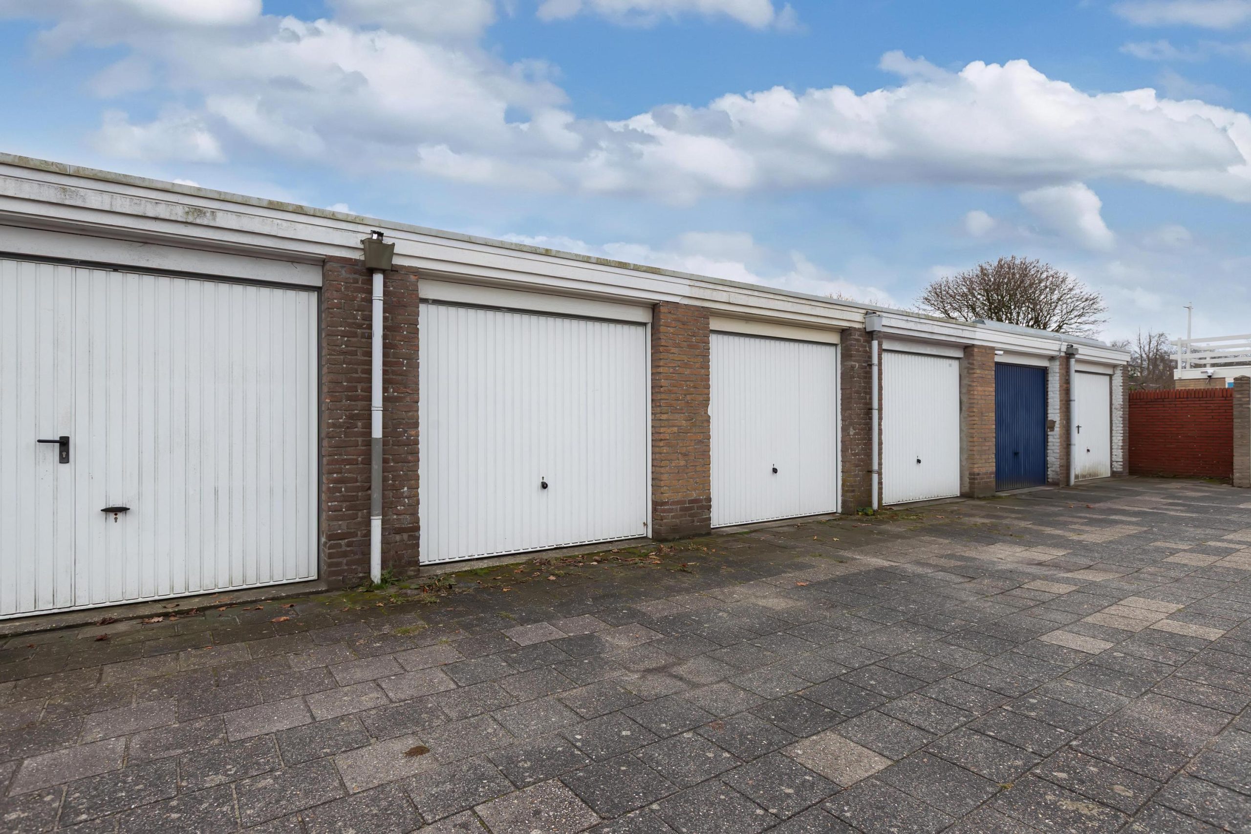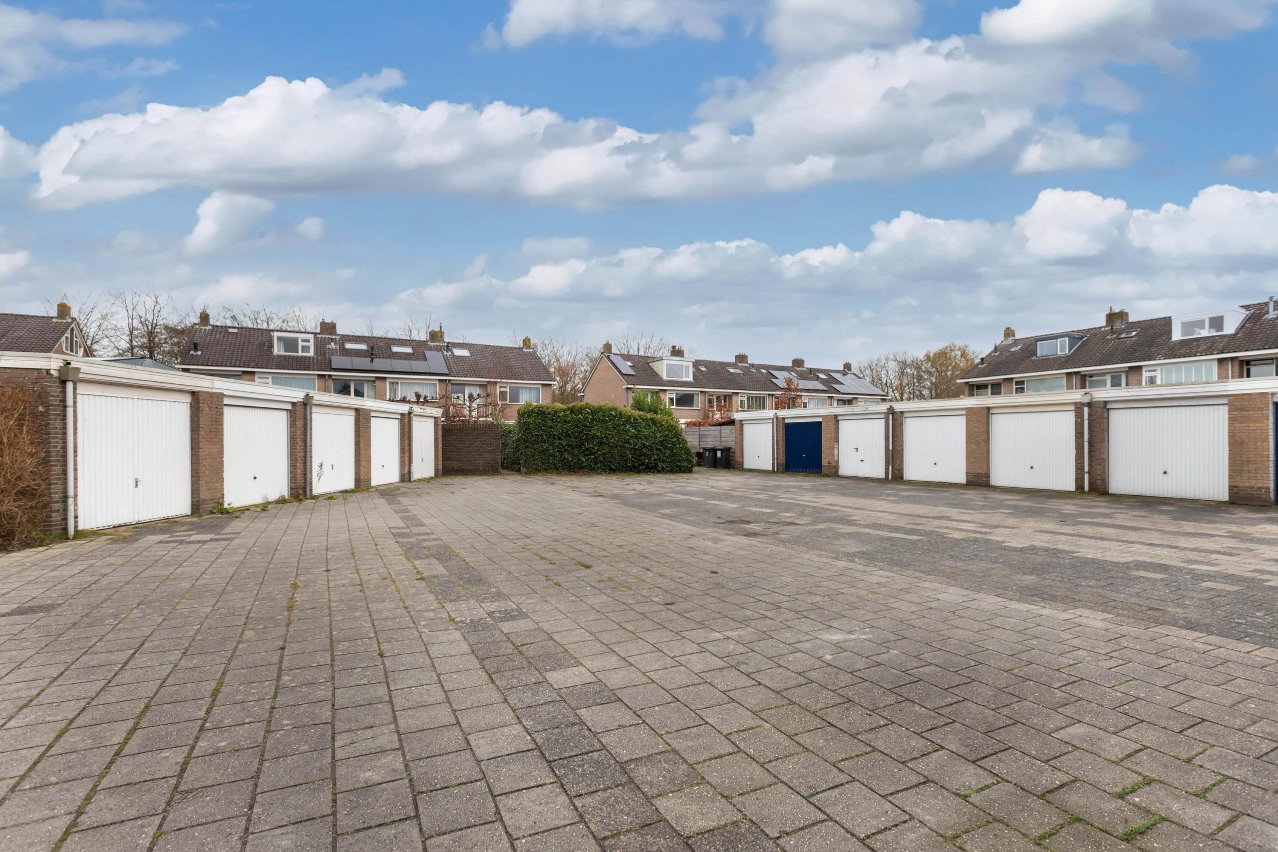 De achtertuin is verzorgd aangelegd met borders, gazon en terras. Achter in de tuin is een kleine overkapping met tuinberging. Door de diepe tuin en tevens diepe tuinen rondom ervaar je hier veel privacy. De tuin is bereikbaar via een achterom naar de steeg. De voortuin is een verzorgd aangelegde grindbordertuin. Op de hoek van de straat direct naast het woningblok van het huis is een pleintje met garageboxen. Ook deze woning beschikt over een garagebox.