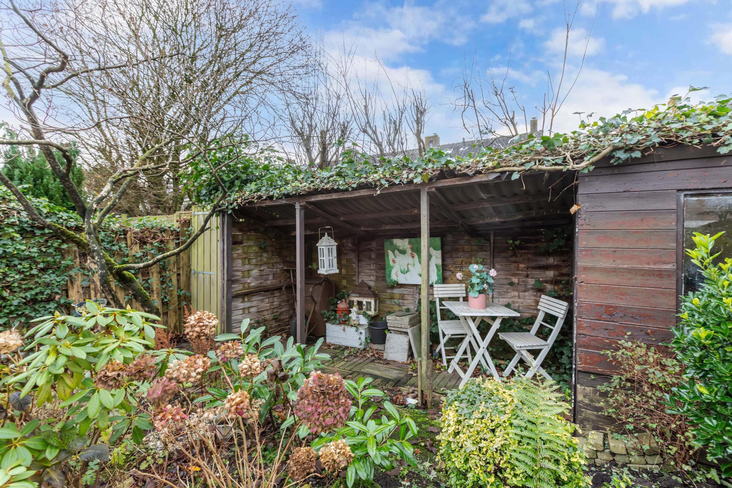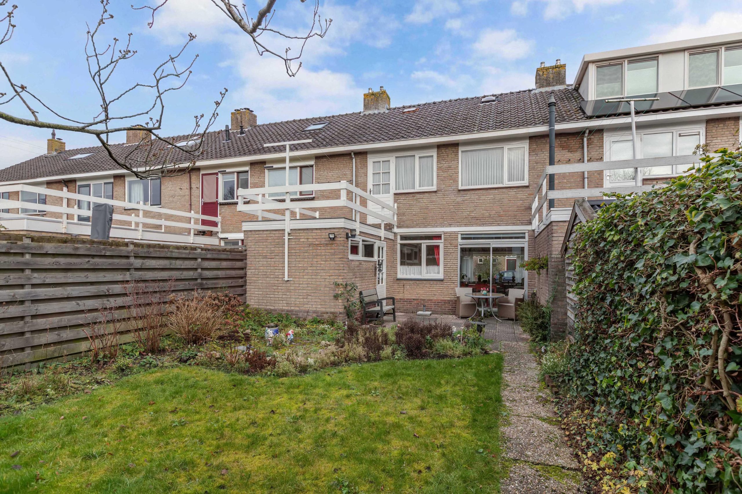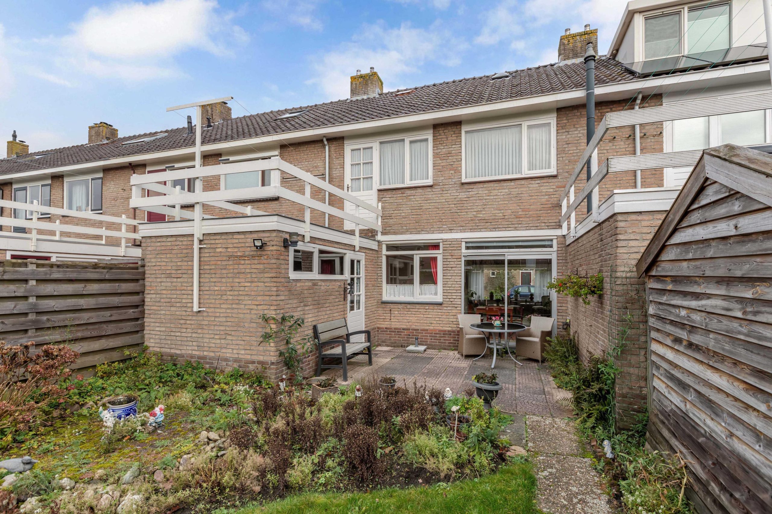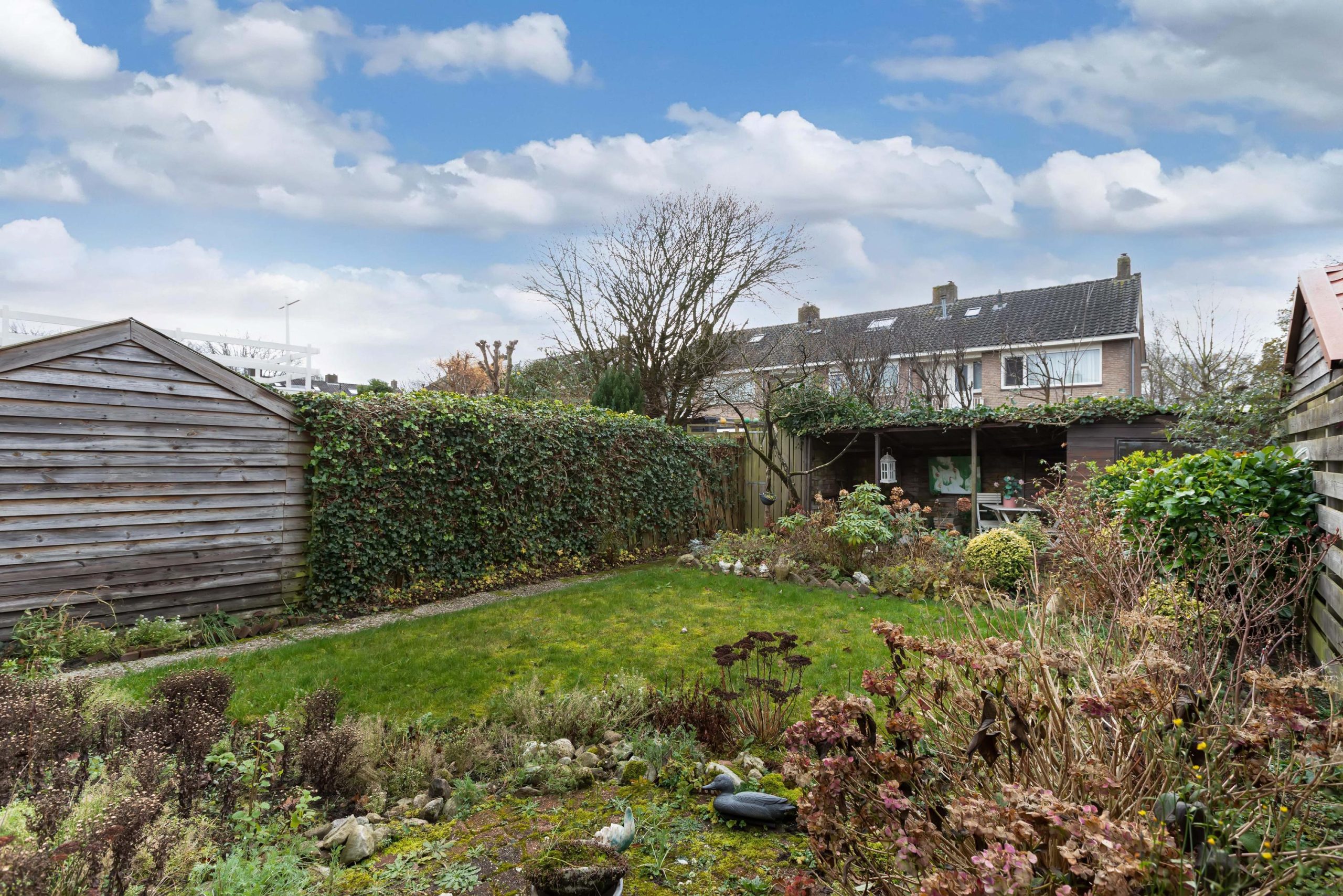 De achtertuin is verzorgd aangelegd met borders, gazon en terras. Achter in de tuin is een kleine overkapping met tuinberging. Door de diepe tuin en tevens diepe tuinen rondom ervaar je hier veel privacy. De tuin is bereikbaar via een achterom naar de steeg. De voortuin is een verzorgd aangelegde grindbordertuin. Op de hoek van de straat direct naast het woningblok van het huis is een pleintje met garageboxen. Ook deze woning beschikt over een garagebox.