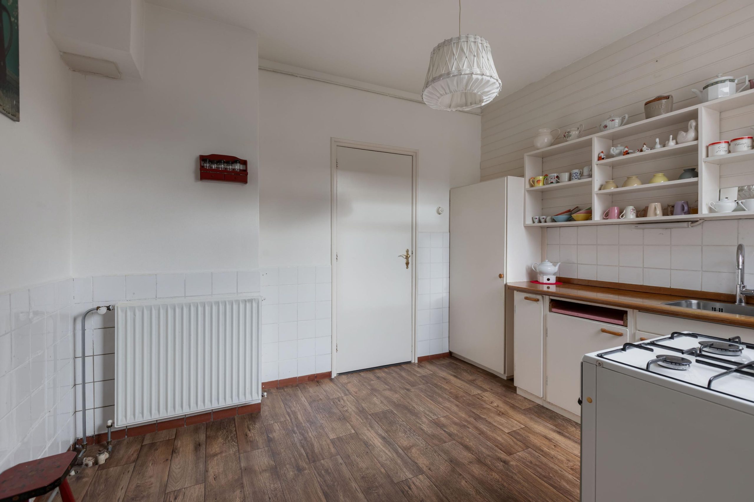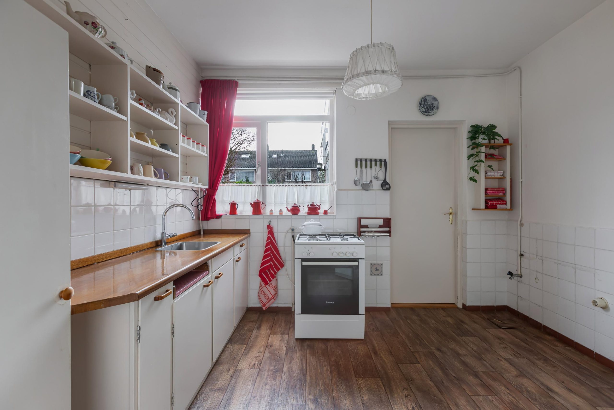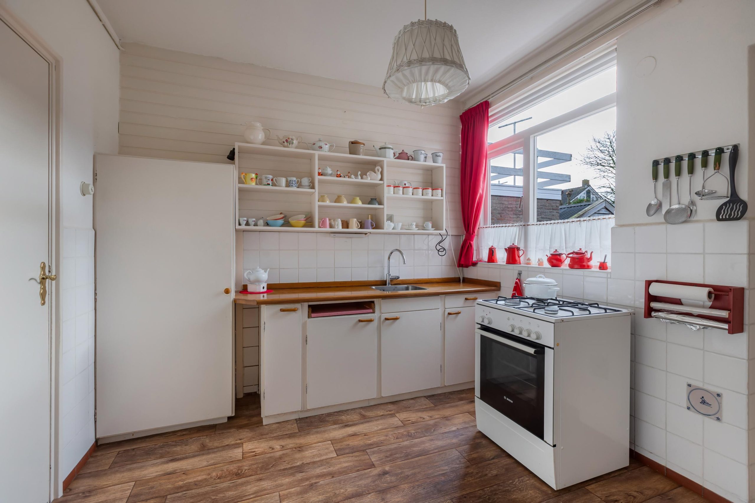 Vanuit de hal kom je in de dichte keuken. In de keuken is plek voor een ontbijttafel en het keukenblok is van klassieke eenvoud, van het bouwjaar van het huis 1967, en beschikt over een close-in boiler van 10 liter, kastjes en lades. Hier is ook de witgoedopstelling. Het is goed mogelijk om een doorbraak naar de woonkamer te realiseren. De aangebouwde bijkeuken/berging biedt ruimte voor je fietsen en overige spullen.