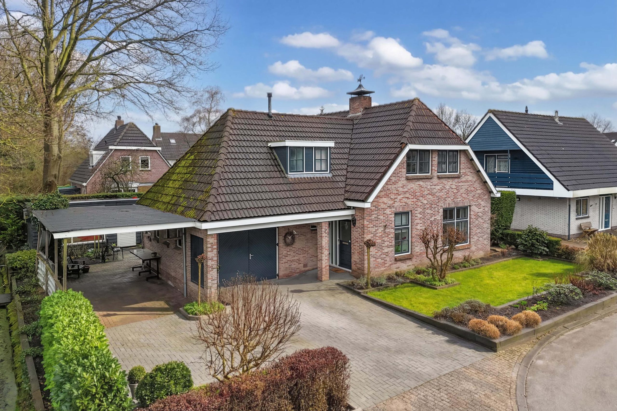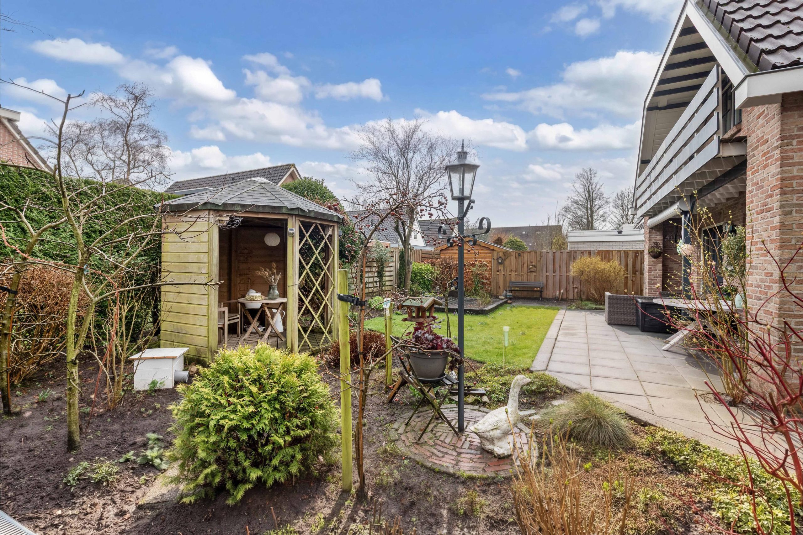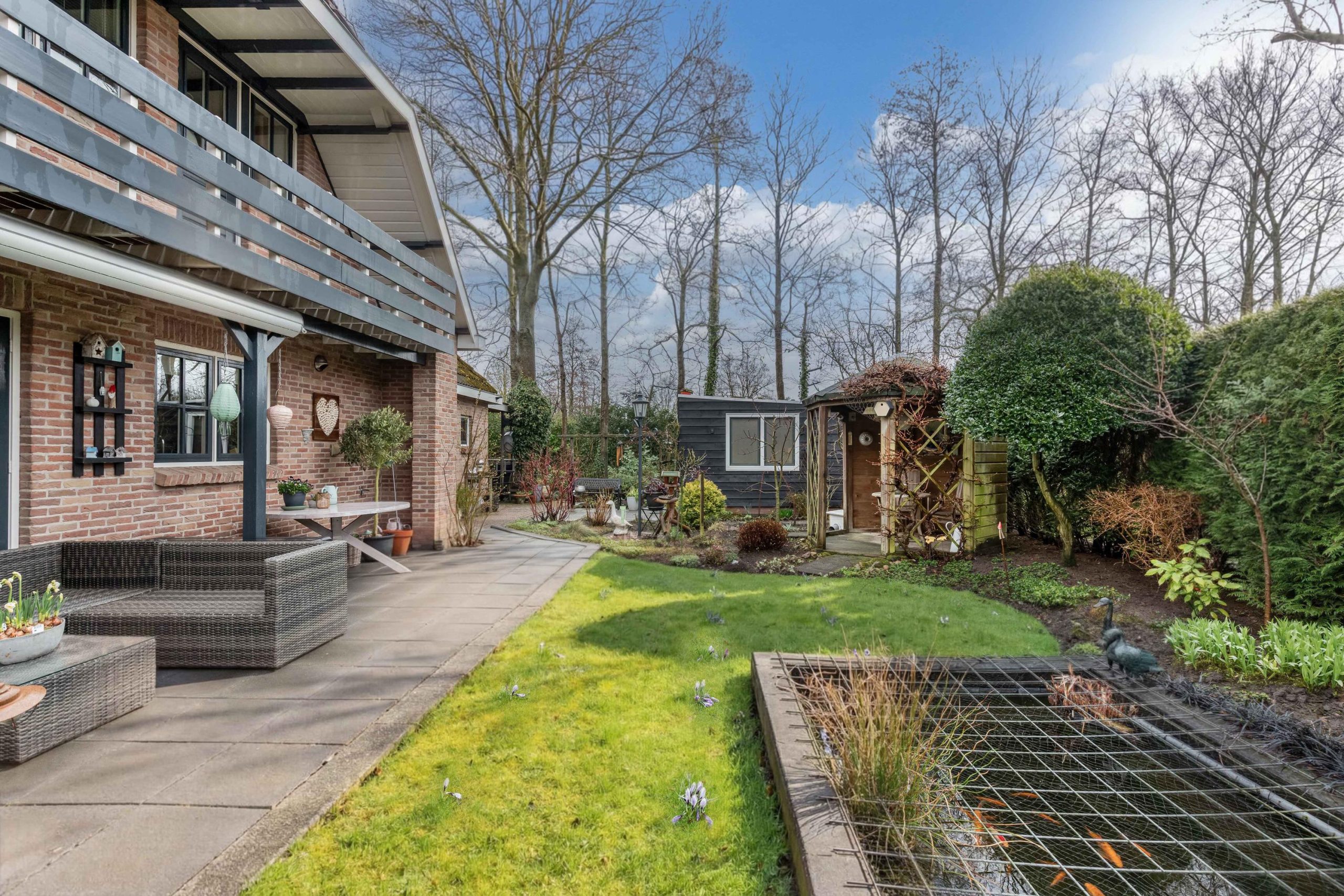 De woning is omzoomd door een fraai aangelegde tuin en biedt een combinatie van rust, privacy en functionaliteit. De achtertuin is gelegen op het zonnige zuiden en aangelegd met gazon, borders, een vijver en een prieeltje, perfect om te ontspannen en te genieten van het buitenleven. Bij het huis kun je heerlijk overdekt zitten en bovendien is er een tuinkamer met dak-, gevel- en glasisolatie, voorzien van elektra, water en een gaskachel. Een mooie gelegenheid voor een creatieve hobby, een mancave of chill-plek voor de kinderen. Uiteraard ook geschikt als berging. Aan zijkant van de woning bevindt zich een ruime oprit met een brede en hoge carport voorzien van elektra, geschikt voor caravan of camper. De woning beschikt tevens over een garage met brede garagedeuren en een deur die toegang geeft tot de tuin. De voortuin is verzorgd aangelegd met gazon en groene borders.