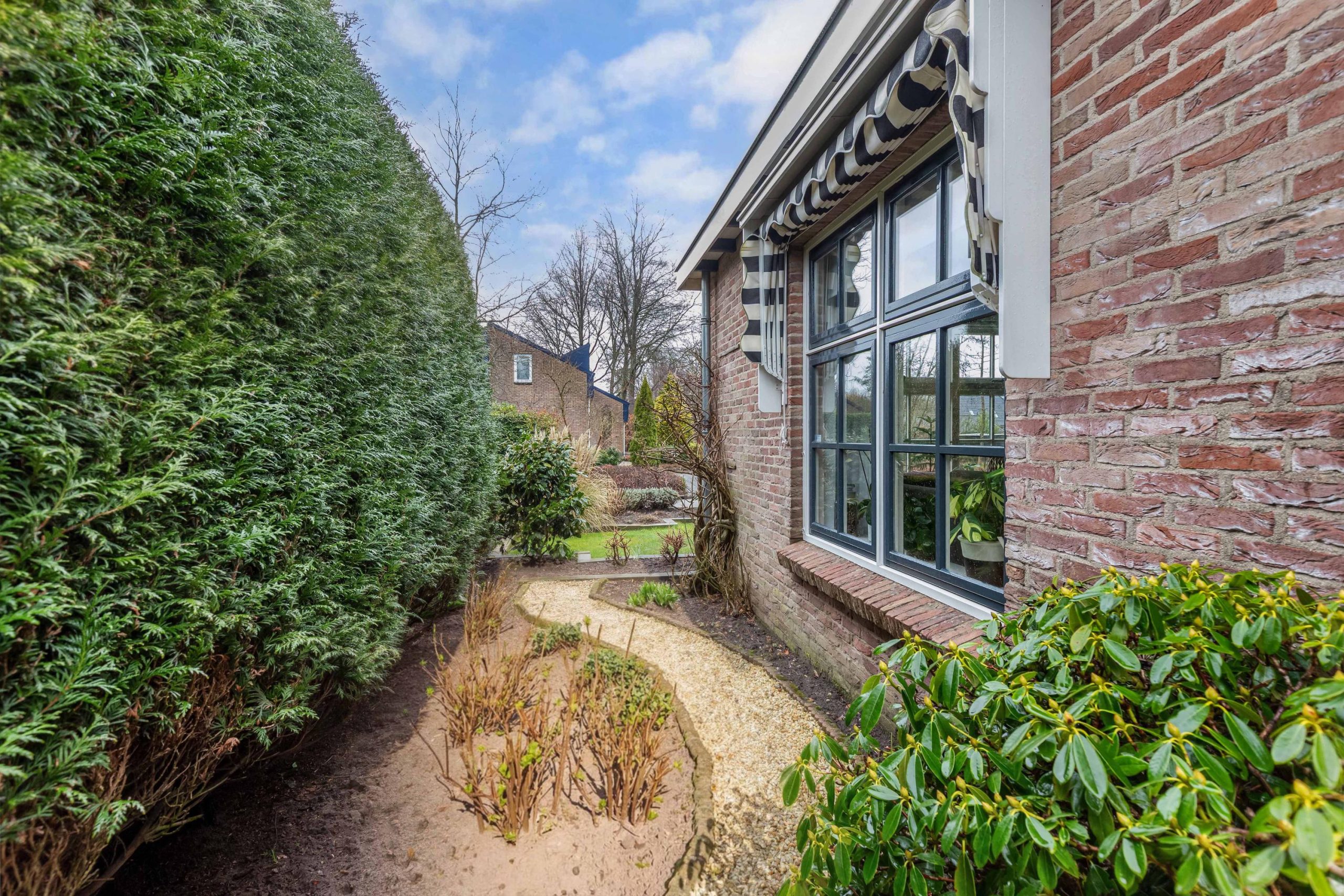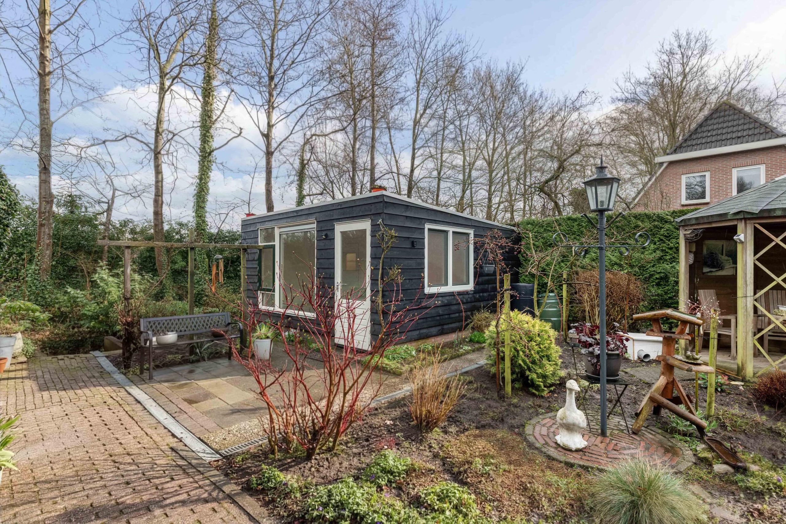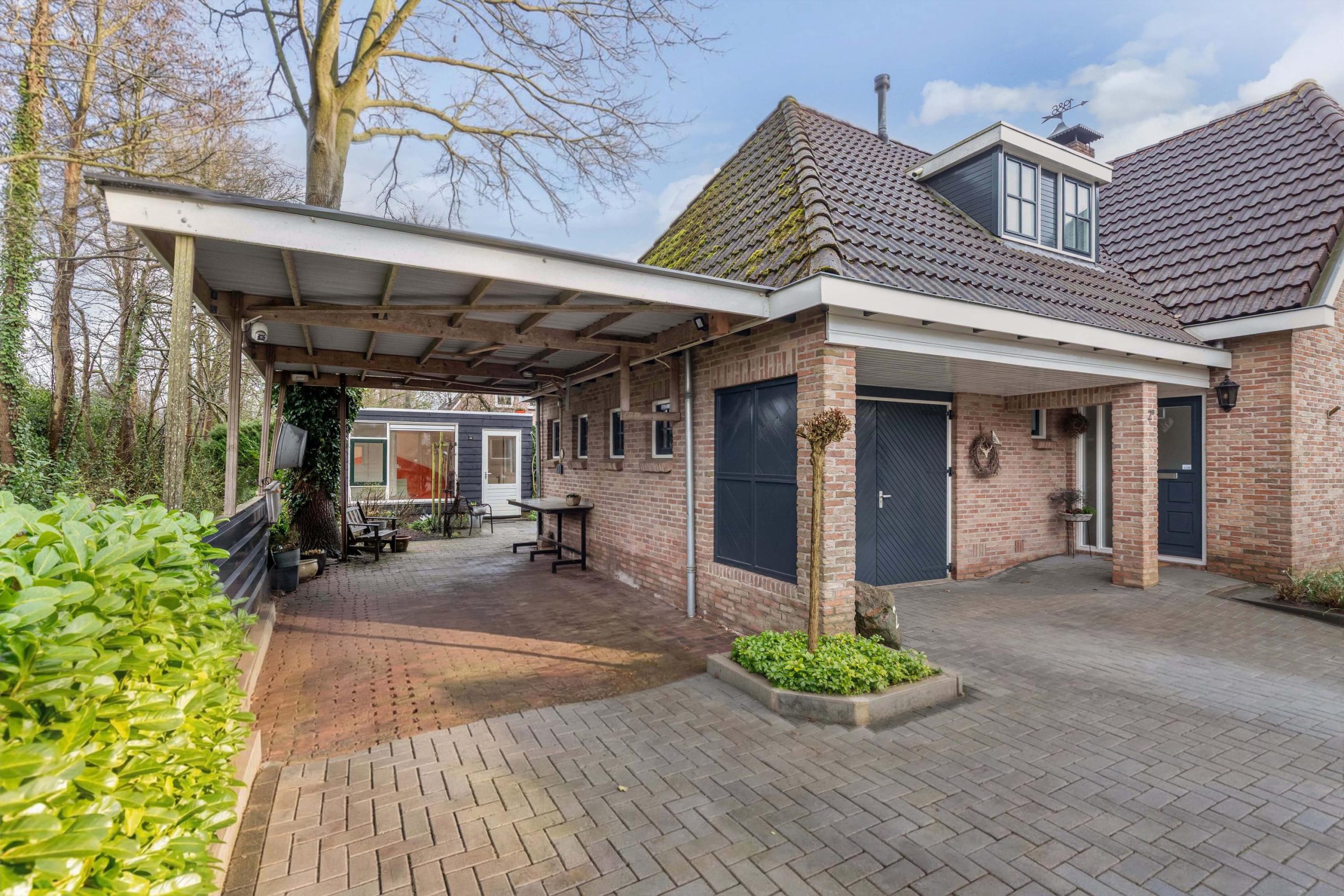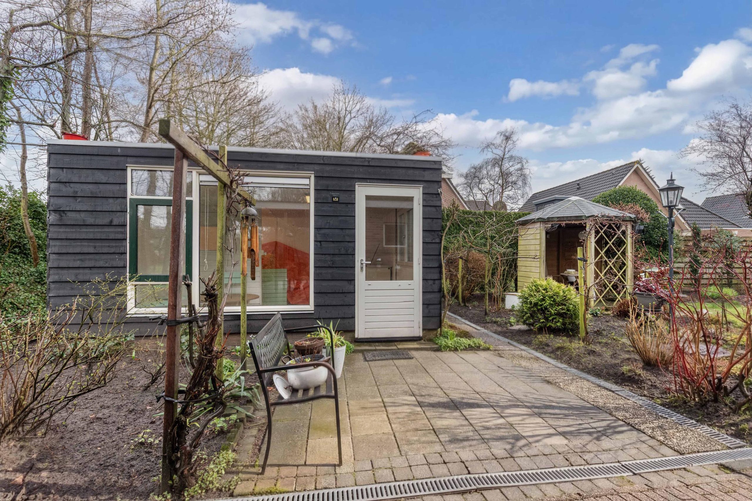 De woning is omzoomd door een fraai aangelegde tuin en biedt een combinatie van rust, privacy en functionaliteit. De achtertuin is gelegen op het zonnige zuiden en aangelegd met gazon, borders, een vijver en een prieeltje, perfect om te ontspannen en te genieten van het buitenleven. Bij het huis kun je heerlijk overdekt zitten en bovendien is er een tuinkamer met dak-, gevel- en glasisolatie, voorzien van elektra, water en een gaskachel. Een mooie gelegenheid voor een creatieve hobby, een mancave of chill-plek voor de kinderen. Uiteraard ook geschikt als berging. Aan zijkant van de woning bevindt zich een ruime oprit met een brede en hoge carport voorzien van elektra, geschikt voor caravan of camper. De woning beschikt tevens over een garage met brede garagedeuren en een deur die toegang geeft tot de tuin. De voortuin is verzorgd aangelegd met gazon en groene borders.