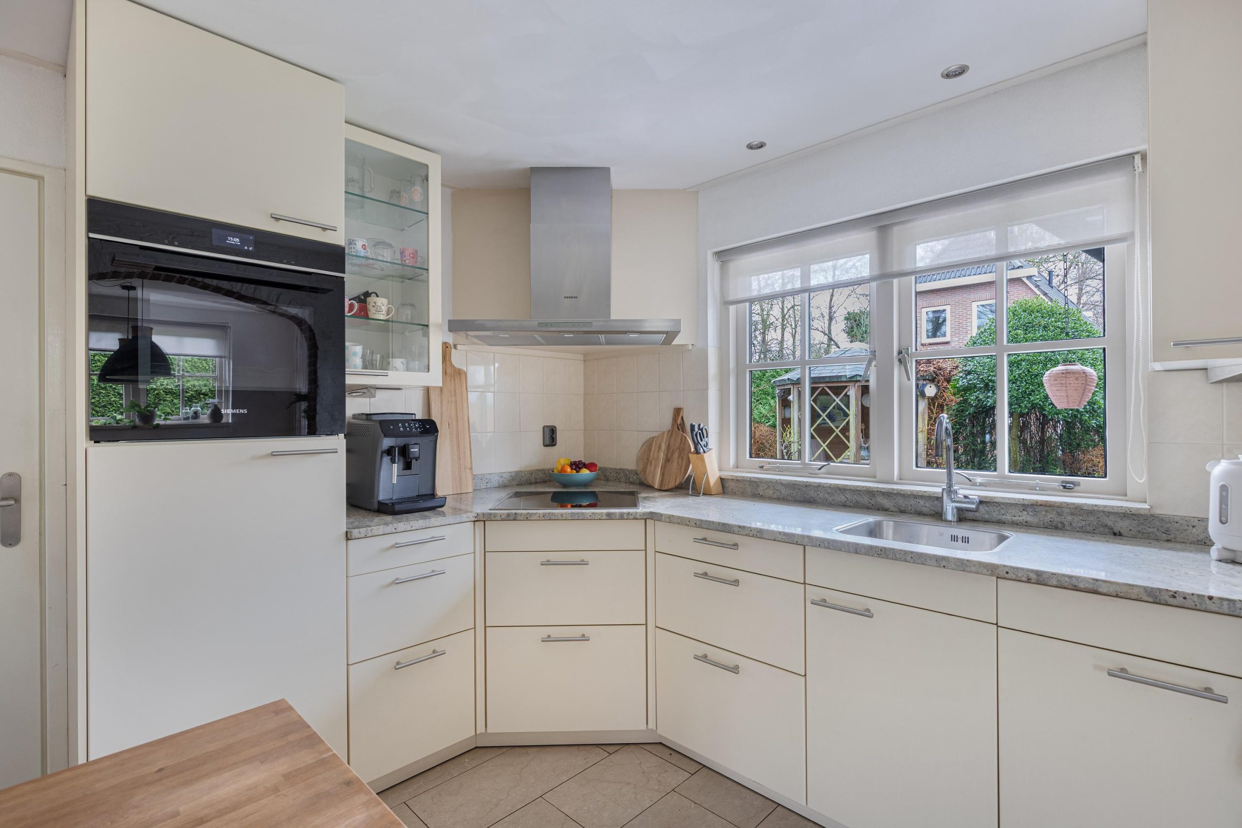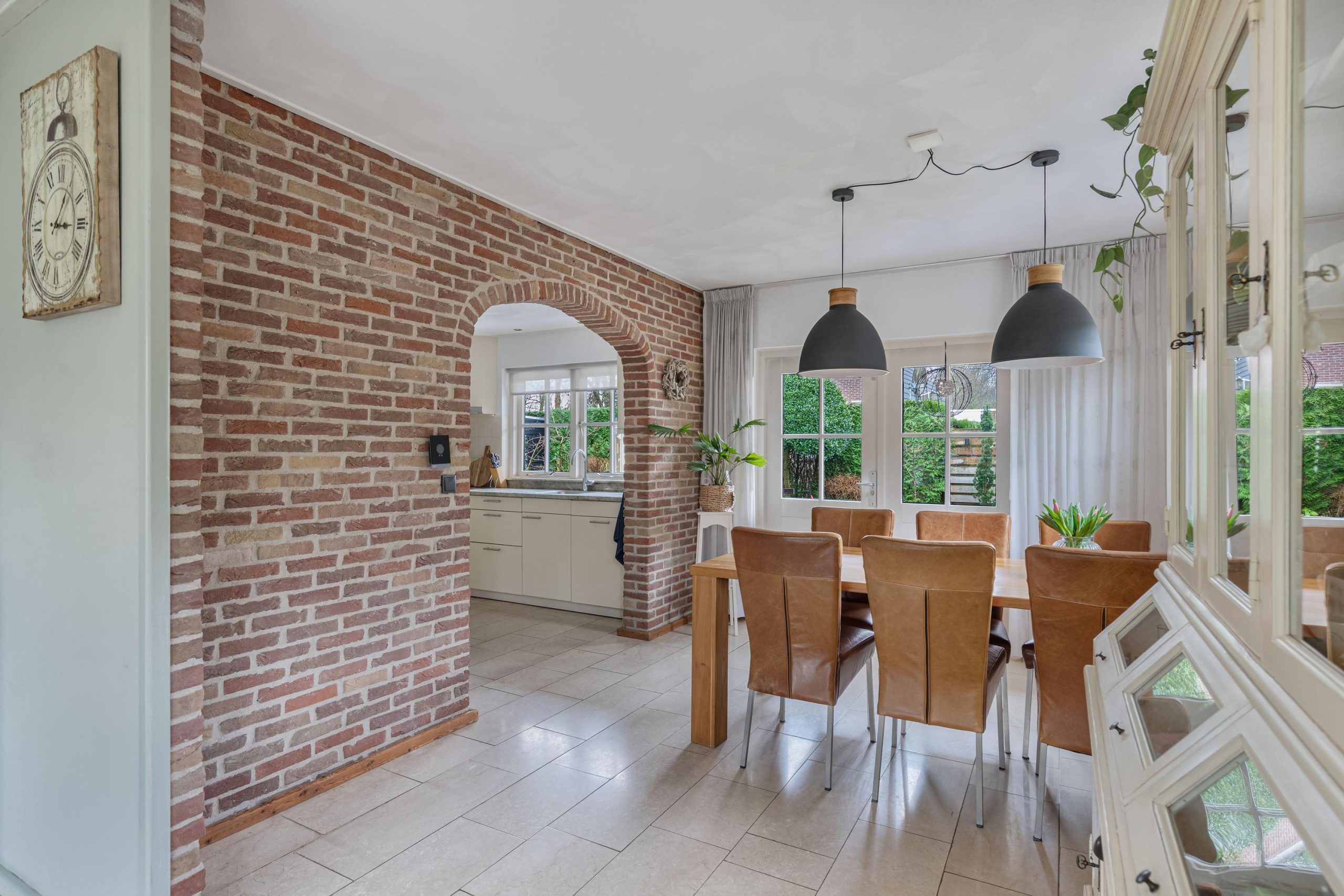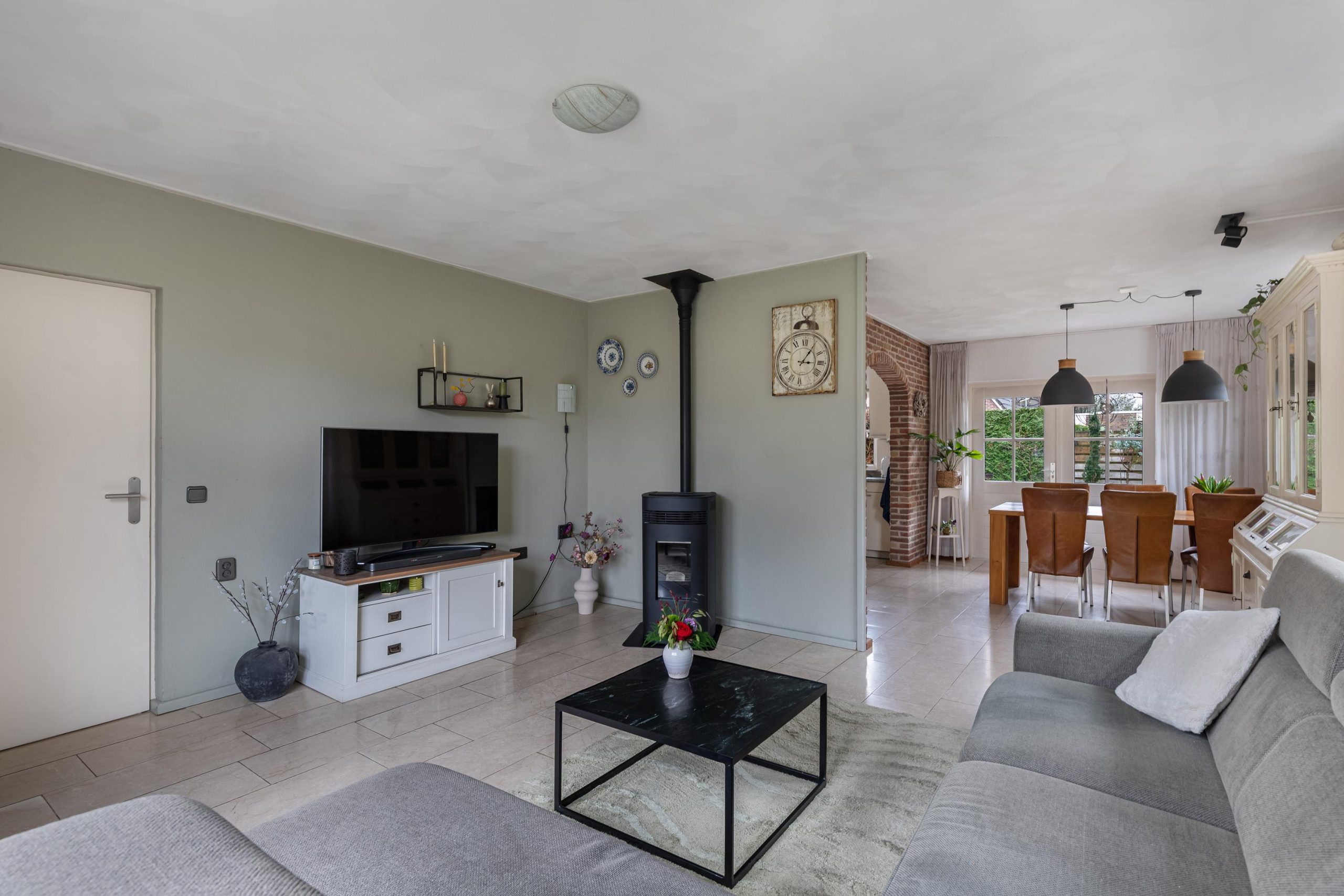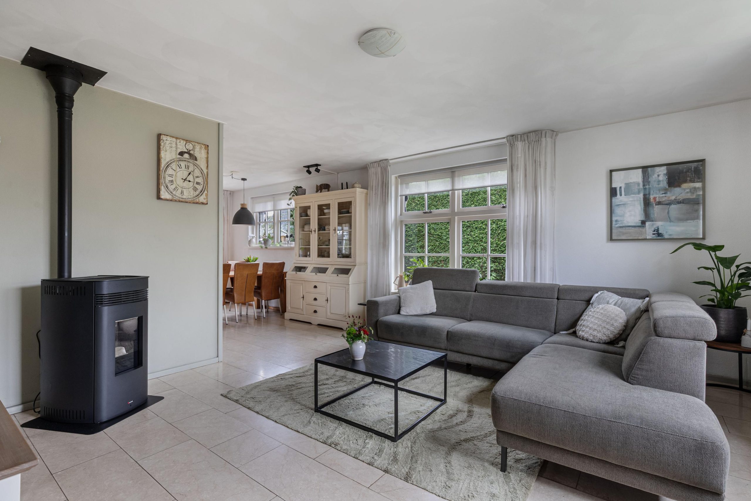 Vanuit de hal loop je over de marmeren vloer in de woonkamer voorzien van comfortabele vloerverwarming. Er valt veel licht naar binnen dankzij de grote raampartijen. Aan de voorzijde van de kamer bevindt zich een tv/zithoek waar de pelletkachel zorgt voor sfeer en warmte. Aan de achterzijde is volop ruimte voor een grote gezinstafel bij de tuindeuren waarmee je op zomerse dagen de leefruimte verlengt naar buiten. De open keuken is praktisch ingedeeld en beschikt over de ruimte voor een grote eettafel. De keukenopstelling is uitgevoerd met een granieten werkblad op een comfortabele werkhoogte en voorzien van diverse inbouwapparatuur, waaronder een vaatwasser, keramische kookplaat, afzuigschouw, combi-oven/magnetron en koelkast. Via de keuken bereik je de ruime bijkeuken met witgoedaansluitingen, een cv-kast en een praktische provisiekast. Een mooie plus van het huis is de geheel betegelde kelder, de ideale extra provisieruimte.