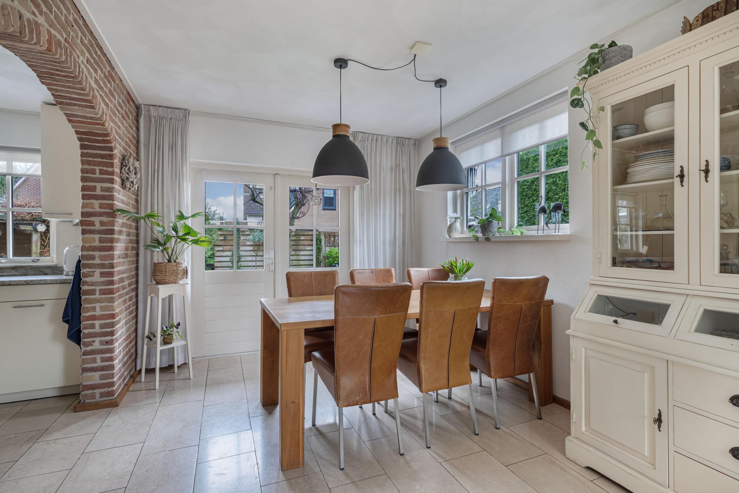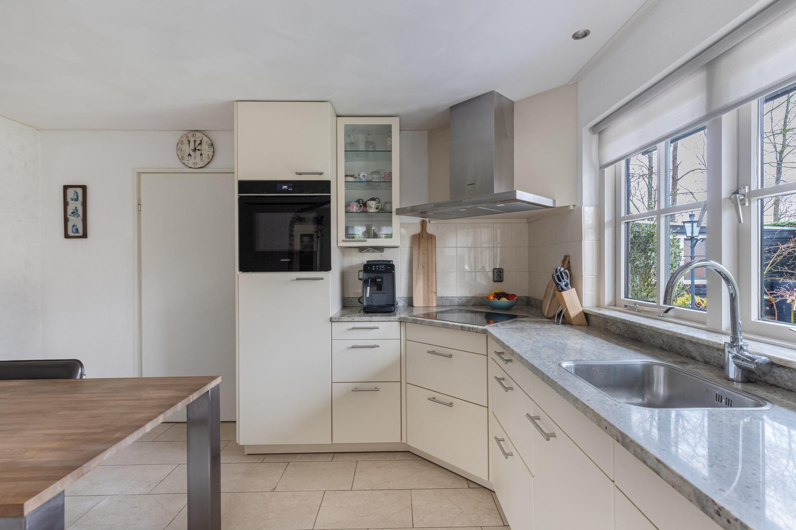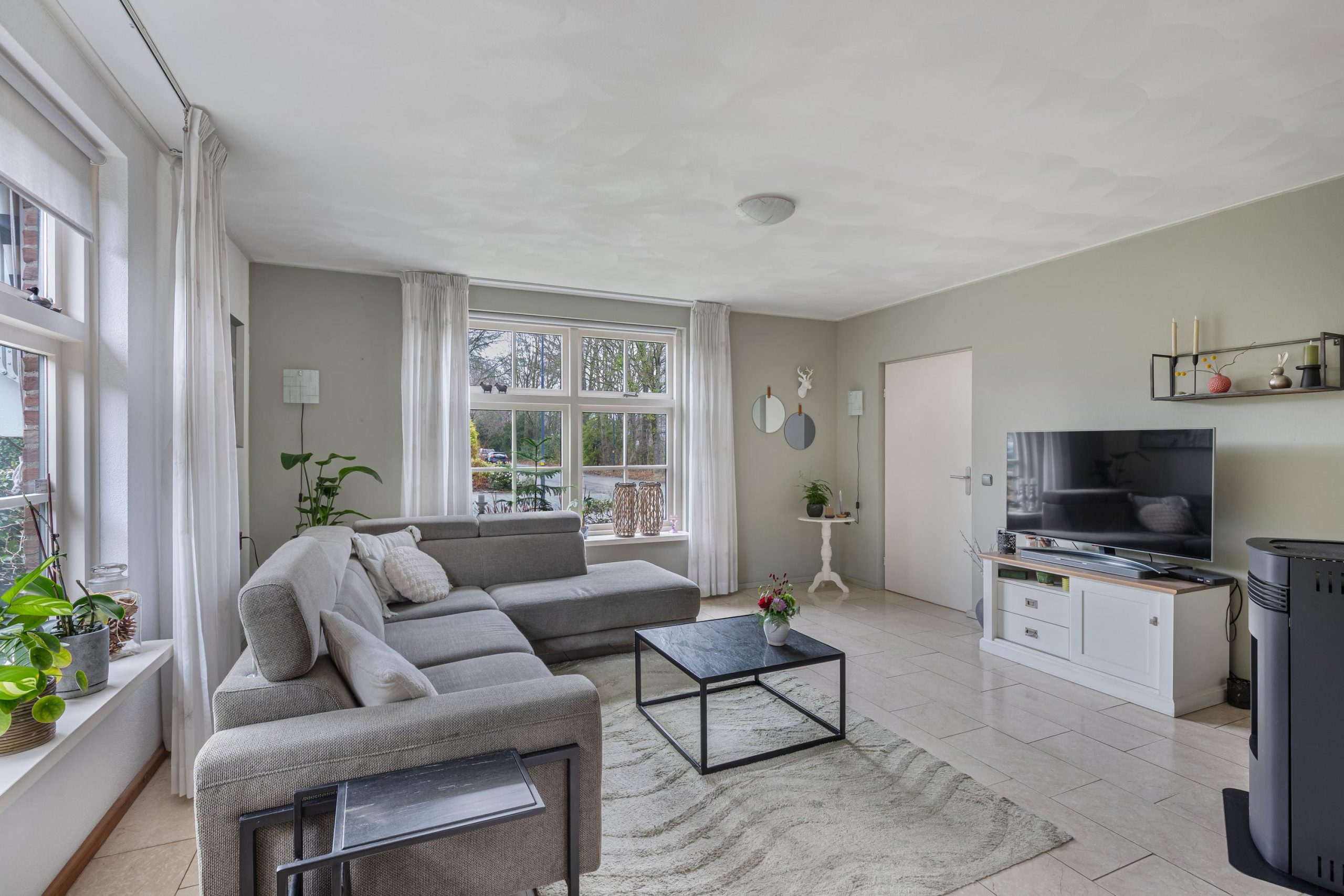 Vanuit de hal loop je over de marmeren vloer in de woonkamer voorzien van comfortabele vloerverwarming. Er valt veel licht naar binnen dankzij de grote raampartijen. Aan de voorzijde van de kamer bevindt zich een tv/zithoek waar de pelletkachel zorgt voor sfeer en warmte. Aan de achterzijde is volop ruimte voor een grote gezinstafel bij de tuindeuren waarmee je op zomerse dagen de leefruimte verlengt naar buiten. De open keuken is praktisch ingedeeld en beschikt over de ruimte voor een grote eettafel. De keukenopstelling is uitgevoerd met een granieten werkblad op een comfortabele werkhoogte en voorzien van diverse inbouwapparatuur, waaronder een vaatwasser, keramische kookplaat, afzuigschouw, combi-oven/magnetron en koelkast. Via de keuken bereik je de ruime bijkeuken met witgoedaansluitingen, een cv-kast en een praktische provisiekast. Een mooie plus van het huis is de geheel betegelde kelder, de ideale extra provisieruimte.