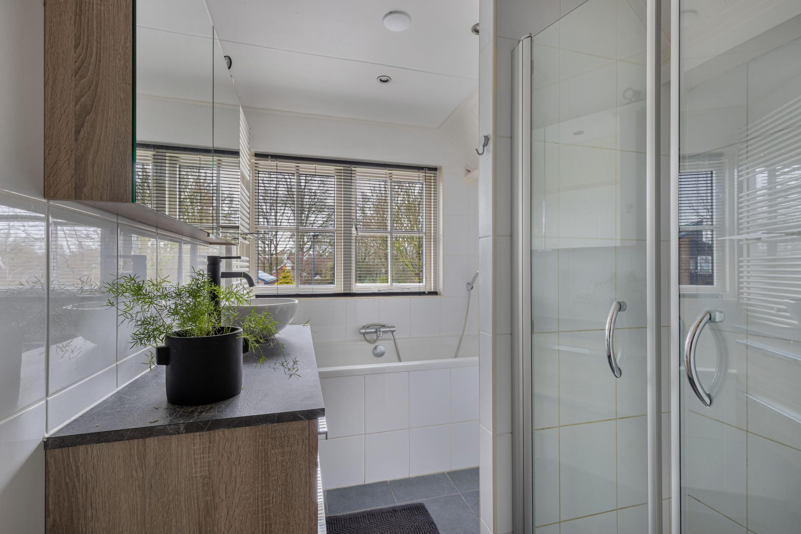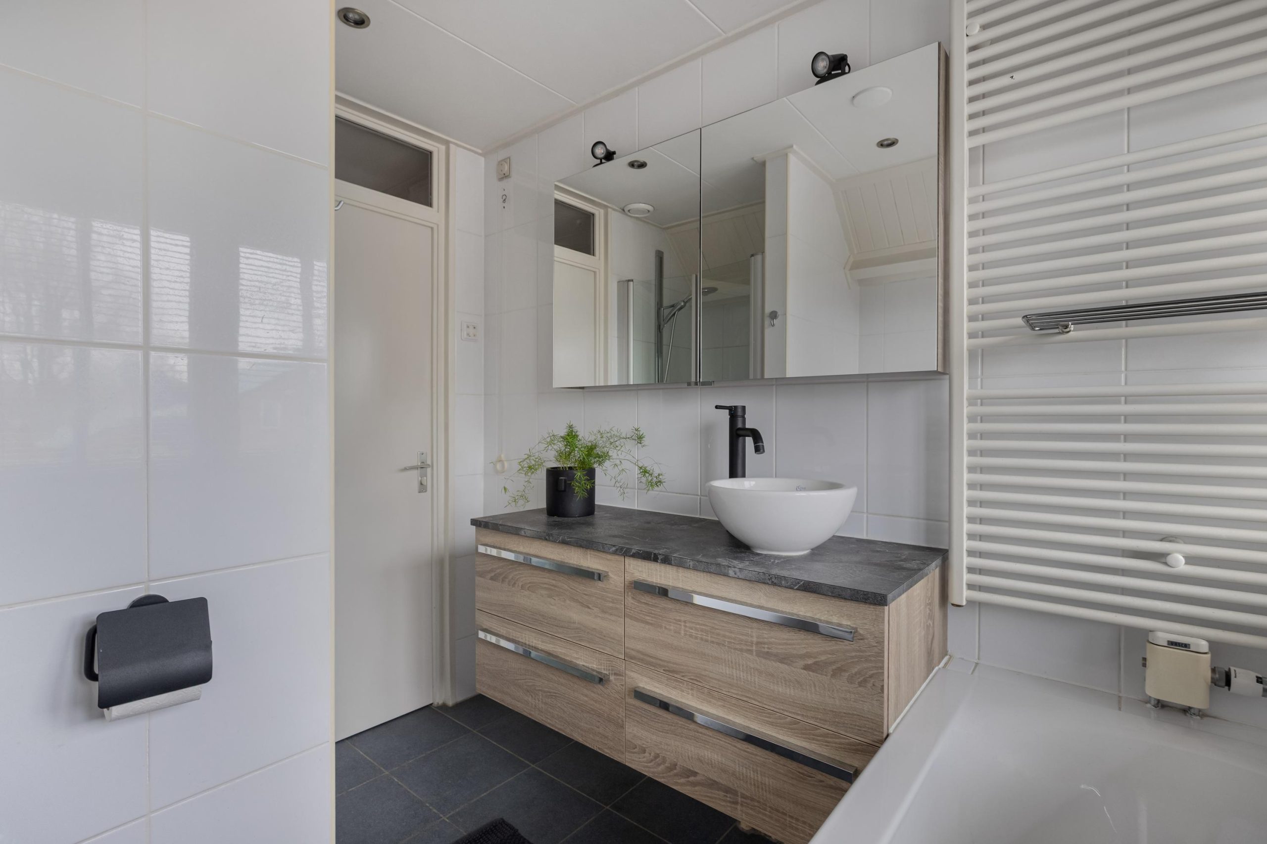 De moderne badkamer is ingericht met een ligbad, een douchehoek, een handdoekradiator, een tweede wandcloset en een wastafelmeubel met waskom, spiegelkast en lades.