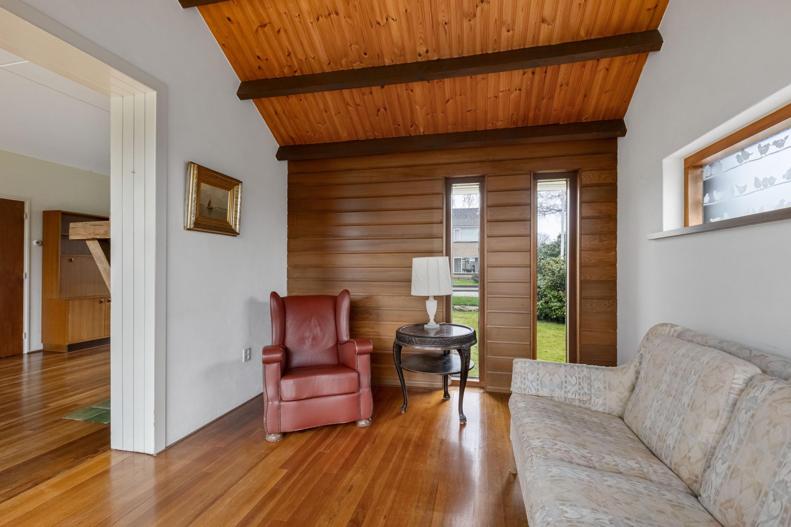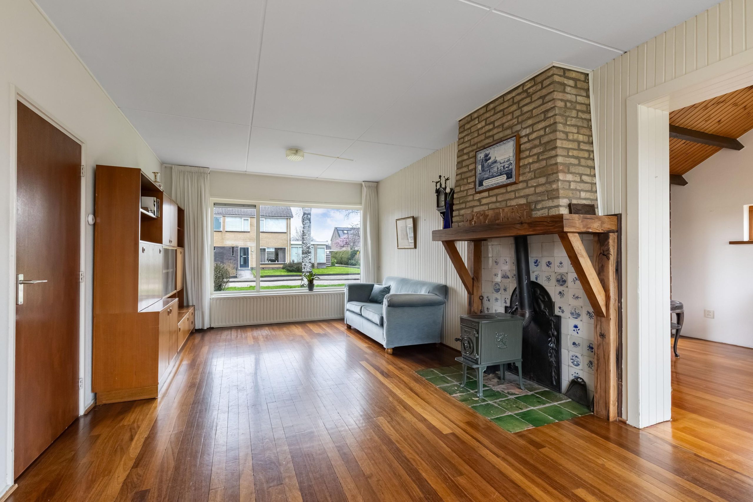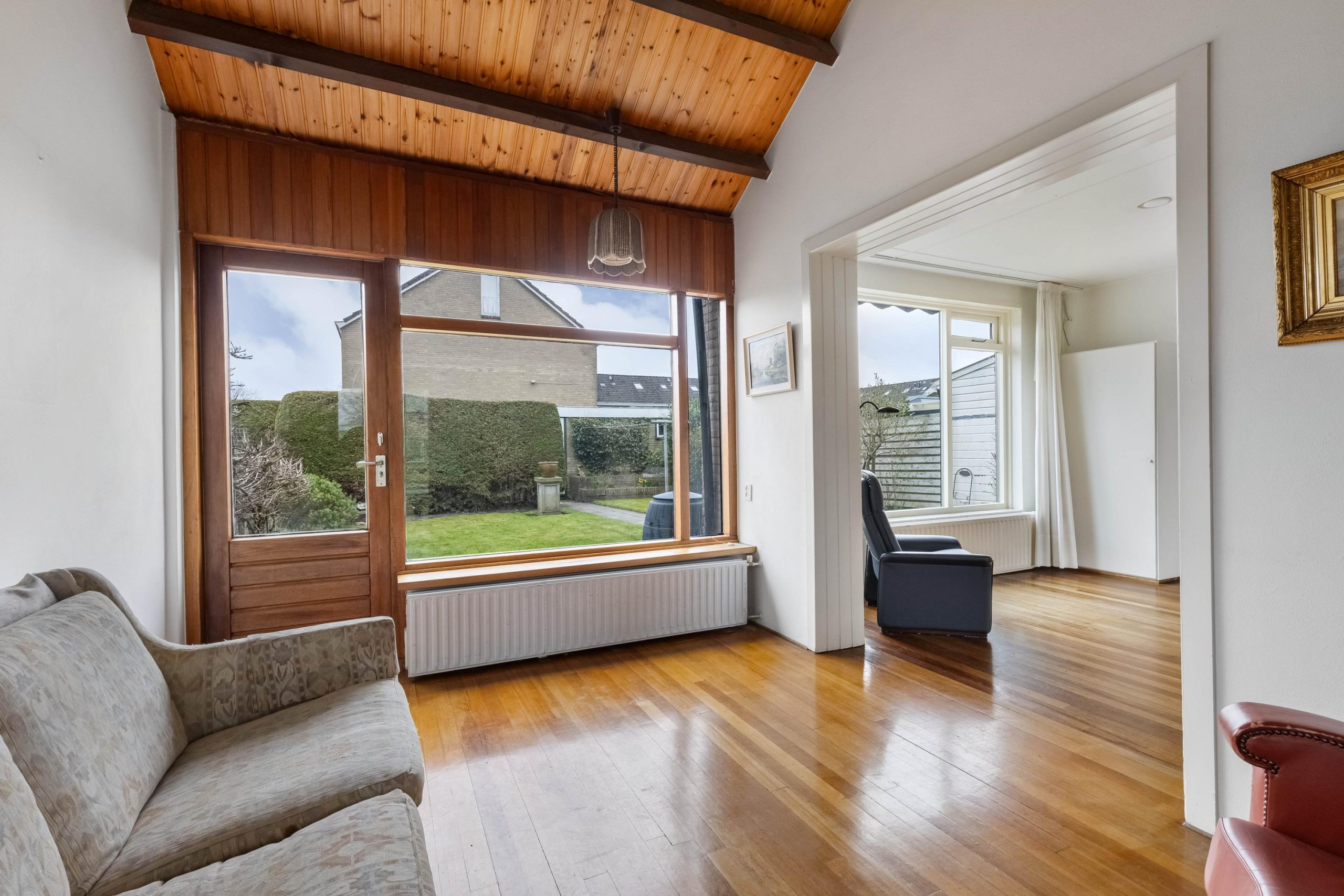 Vanuit de hal kom je de leefruimte binnen en loop je over een lamelparketvloer. Wat direct opvalt is het vele licht dat binnenvalt in de lange en brede doorzon-woonkamer. Voor in de kamer is de ruimte voor een TV/zithoek en achter is de plek voor een grote gezinstafel. Je kijkt hier uit over de diepe achtertuin met veel privacy. Er zijn goede mogelijkheden voor het realiseren voor een open keuken. In de loop van de tijd is er een grote aanbouw aan de zijgevel gerealiseerd, met verrassend hoge nok en veel lichtinval. Ideaal voor een tweede zithoek, een speelhoek of rustige leesplek.