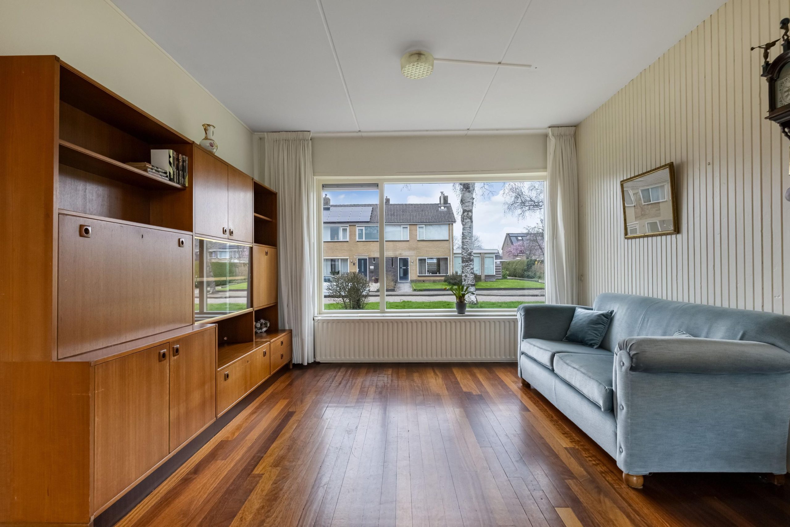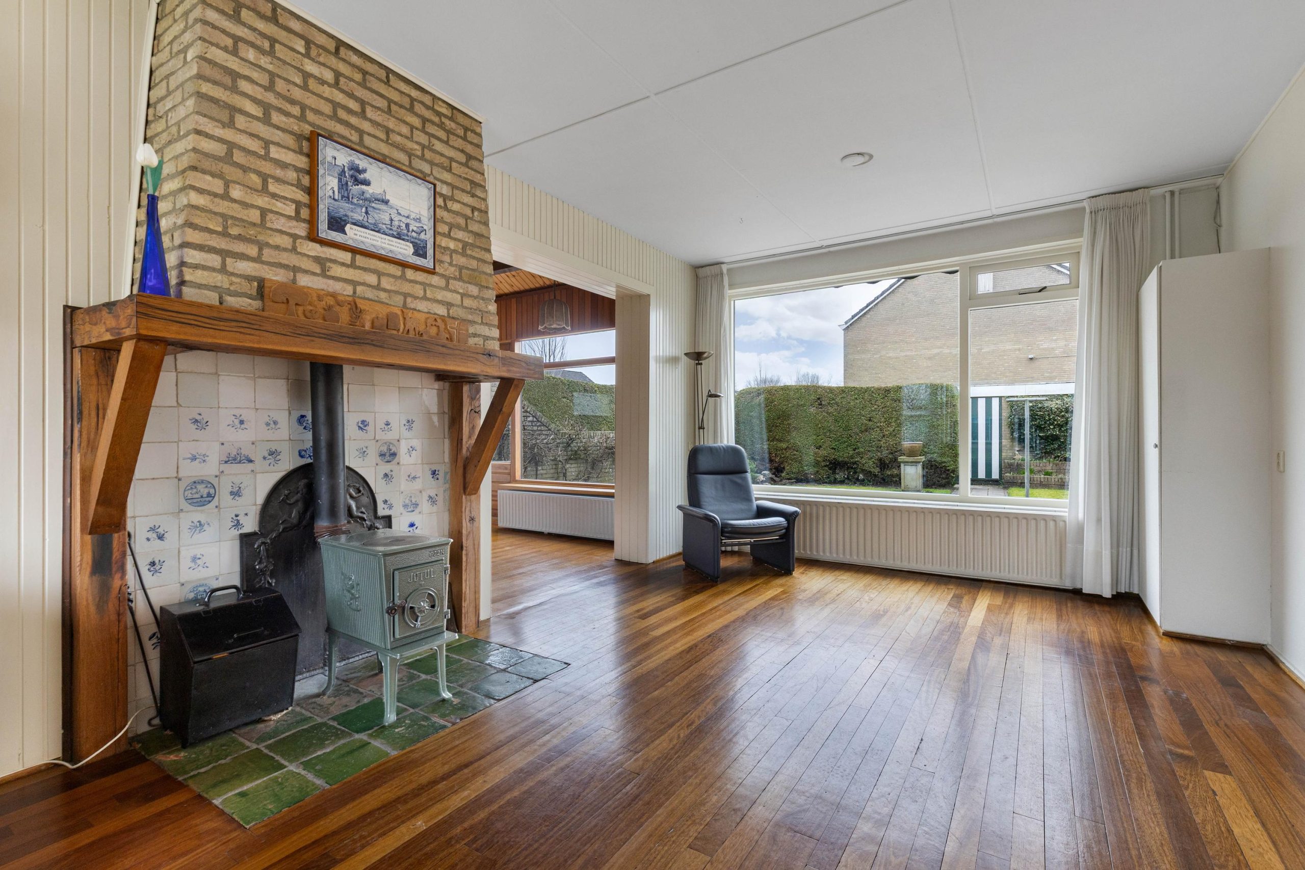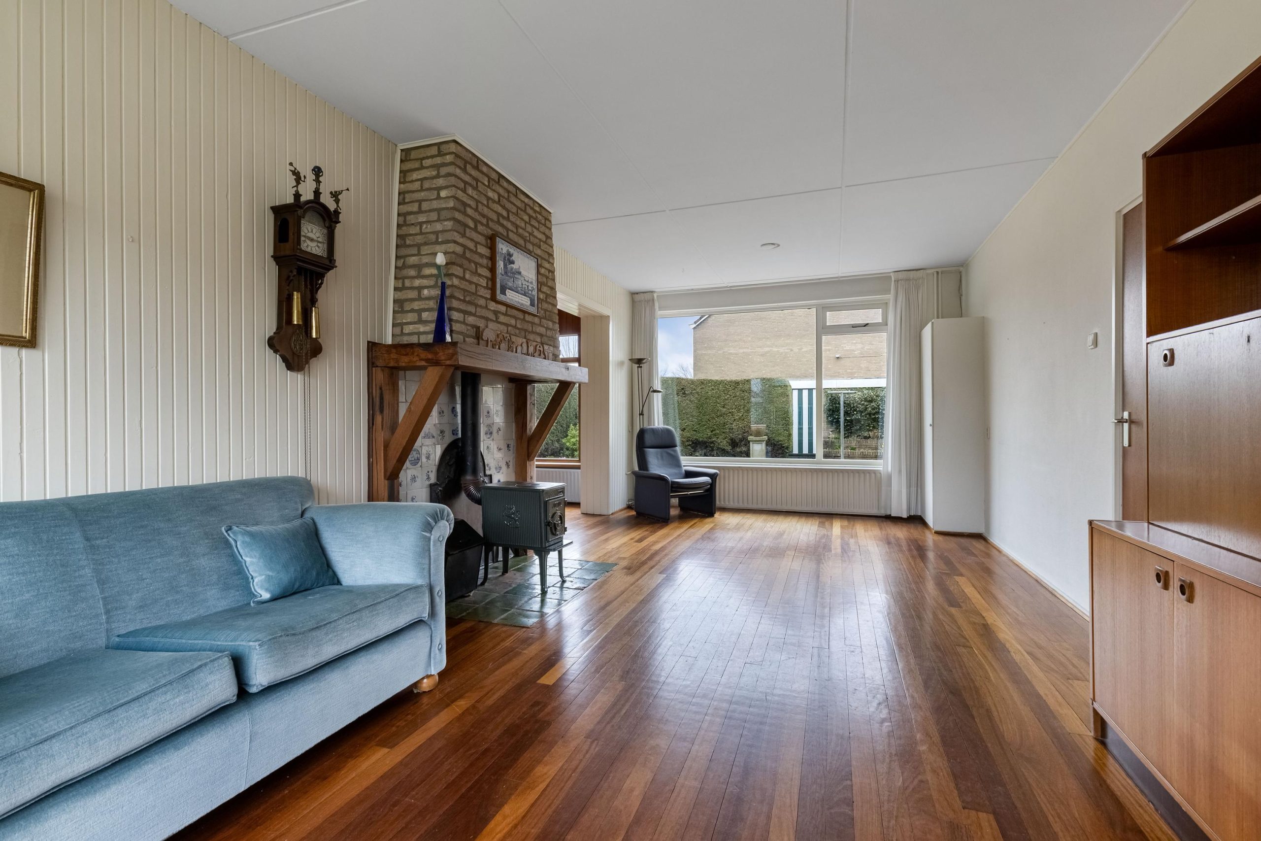 Vanuit de hal kom je de leefruimte binnen en loop je over een lamelparketvloer. Wat direct opvalt is het vele licht dat binnenvalt in de lange en brede doorzon-woonkamer. Voor in de kamer is de ruimte voor een TV/zithoek en achter is de plek voor een grote gezinstafel. Je kijkt hier uit over de diepe achtertuin met veel privacy. Er zijn goede mogelijkheden voor het realiseren voor een open keuken. In de loop van de tijd is er een grote aanbouw aan de zijgevel gerealiseerd, met verrassend hoge nok en veel lichtinval. Ideaal voor een tweede zithoek, een speelhoek of rustige leesplek.