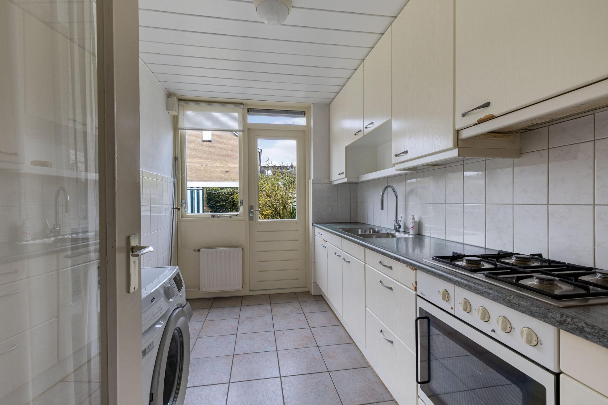 De dichte keuken heeft een functionele opstelling met een kunststof werkblad. De keukenopstelling beschikt over bergruimte met lades en kasten, een gaskookplaat met afzuigkap en een oven. Ook is hier de witgoedopstelling.