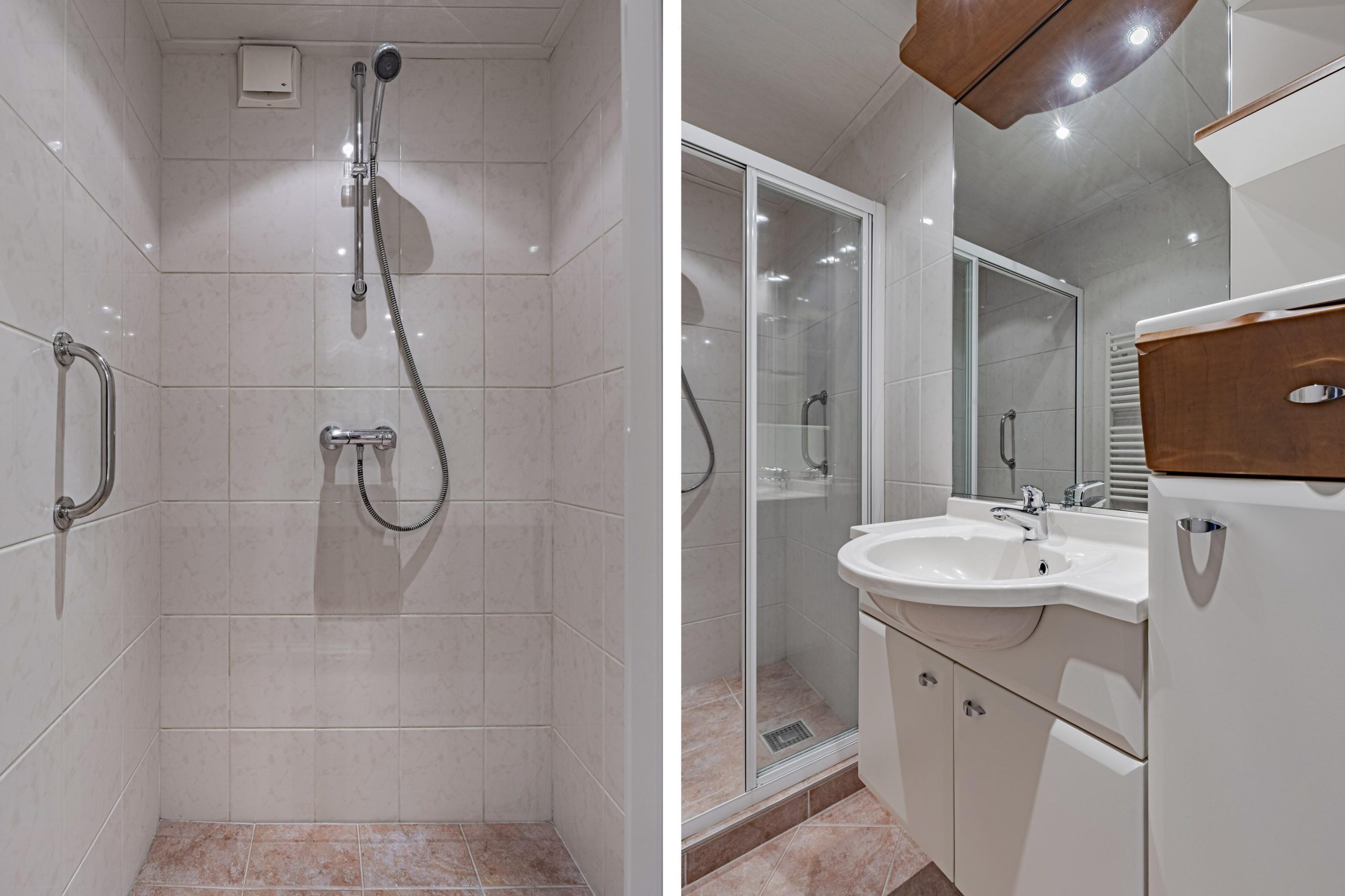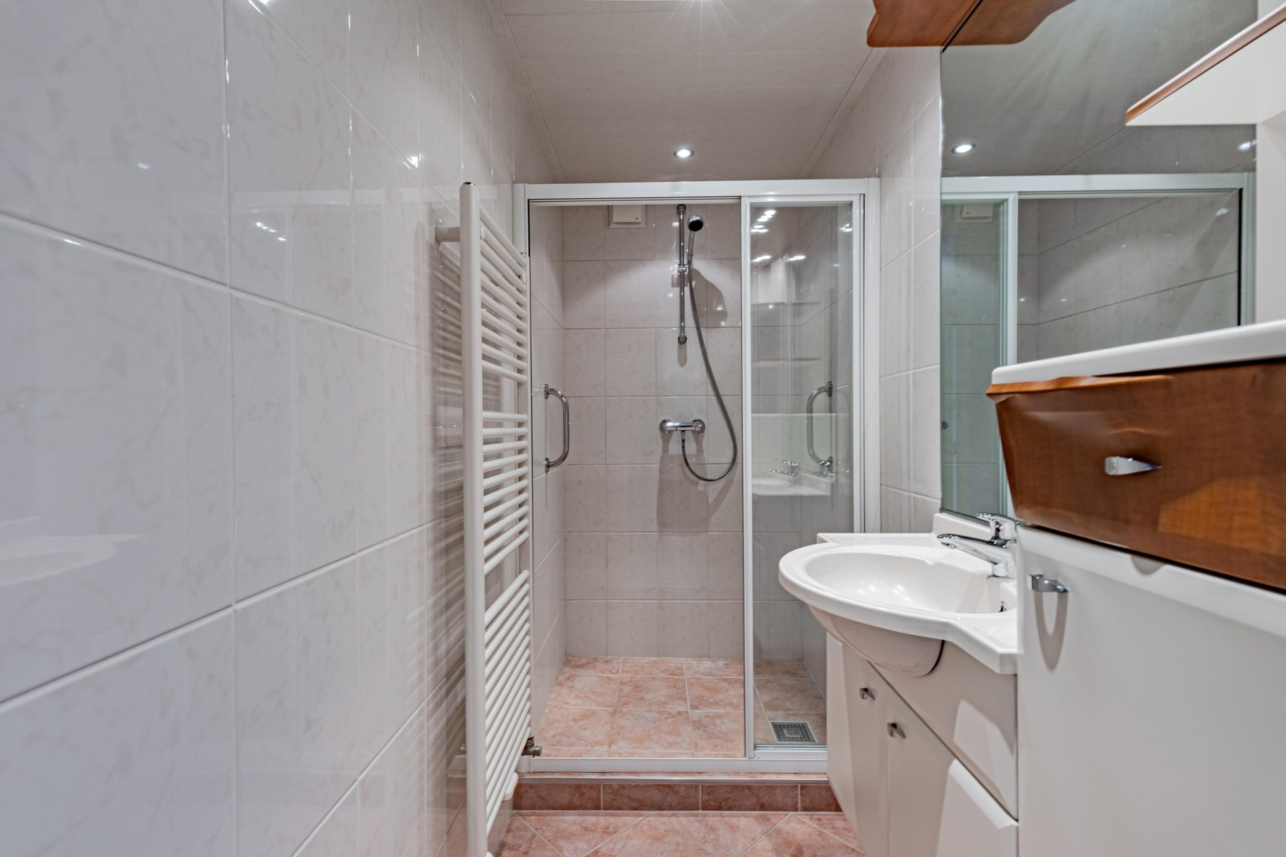 - een badkamer met brede douchehoek, handdoekradiator, wastafelmeubel en mechanische ventilatie