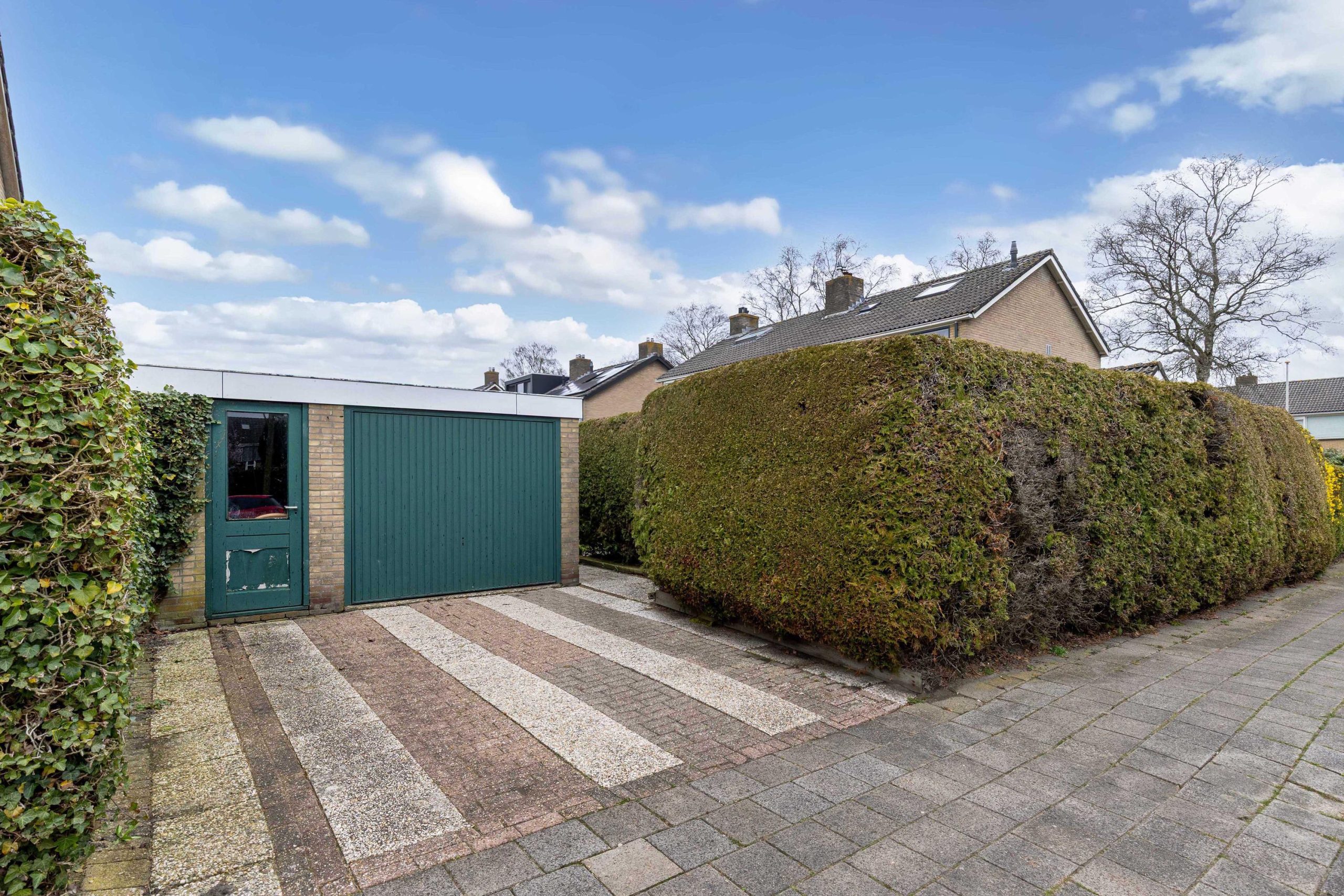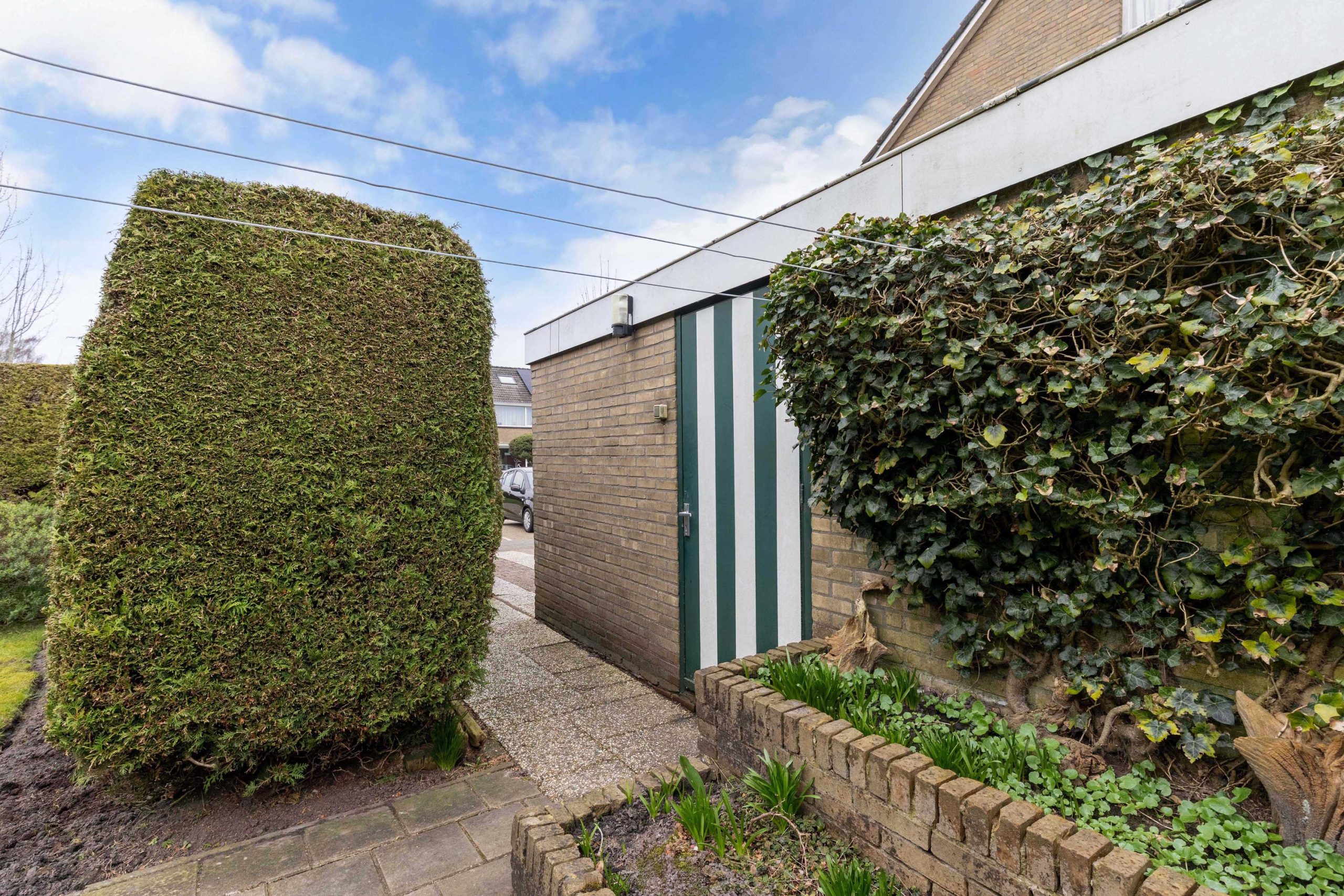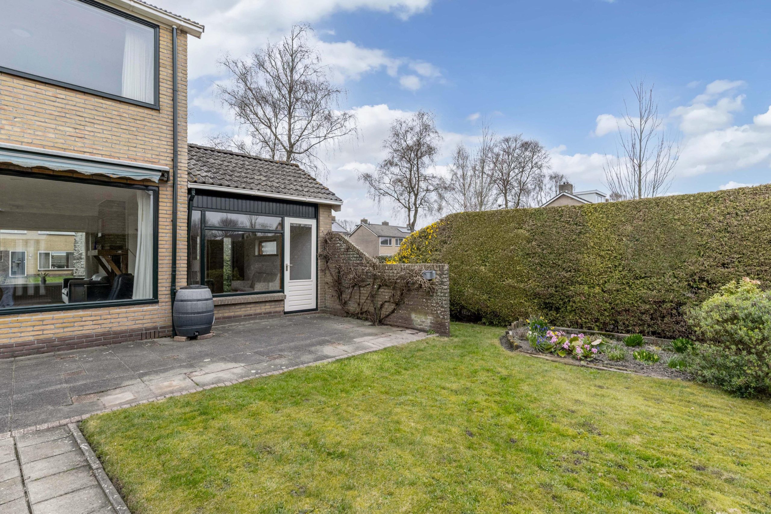 De verzorgde tuin omzoomt het huis. In de achtertuin kun je de hele dag van de zon genieten en de tuin is verzorgd aangelegd met terras, gazon, heesters en borders. Door de hoekligging, grootte van de tuin en de groene beschutting geniet je volop van alle privacy. Je hebt geen inkijk van andere woningen. Een heerlijke plek om te vertoeven. Via de brede oprit naar de vrijstaande garage heb je een eigen achterom. In de vrijstaande garage met berging is ruimte voor zowel je auto als ook de fietsen. Net als de achtertuin is ook de voortuin verzorgd aangelegd met gazon en border.