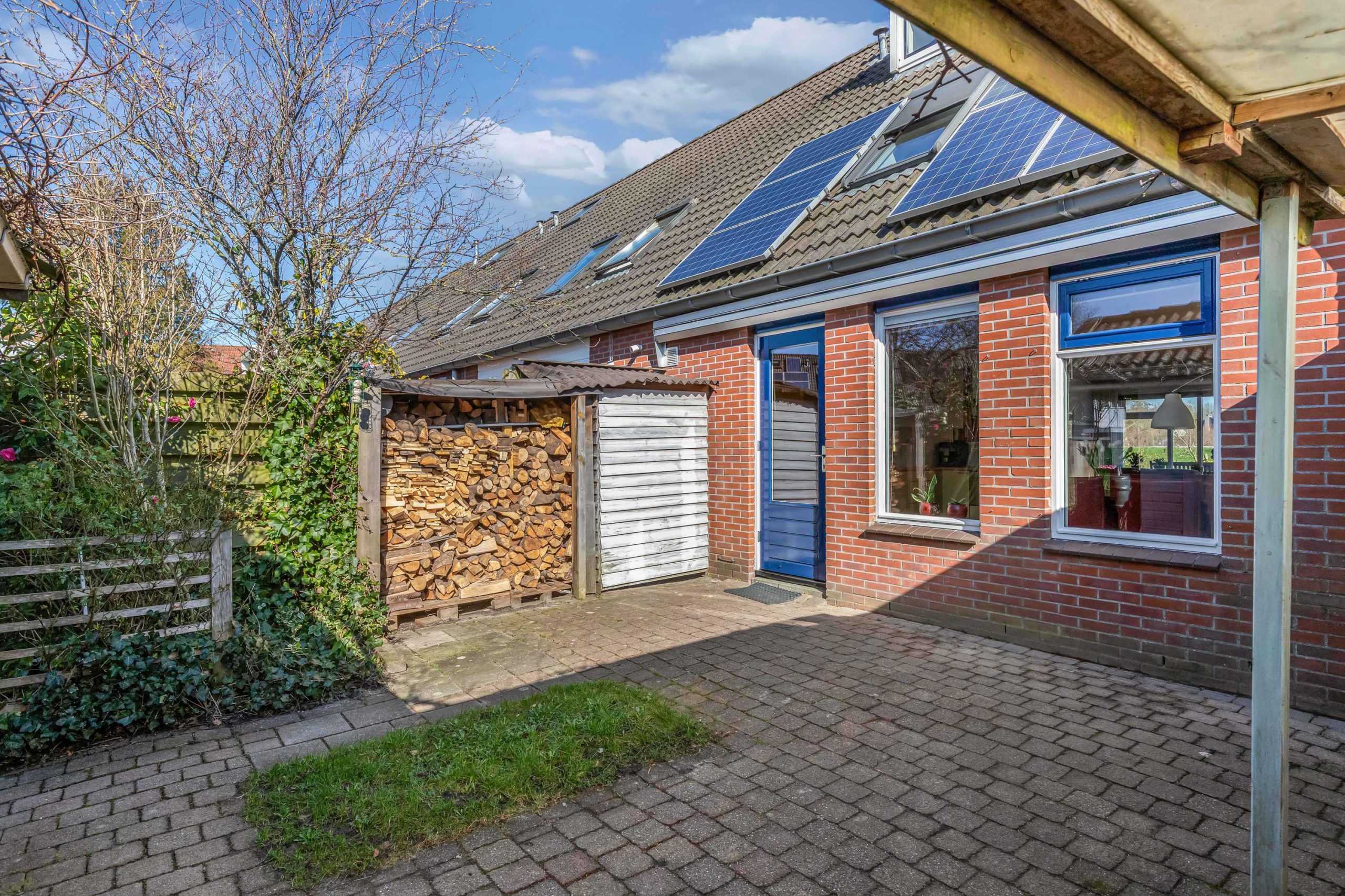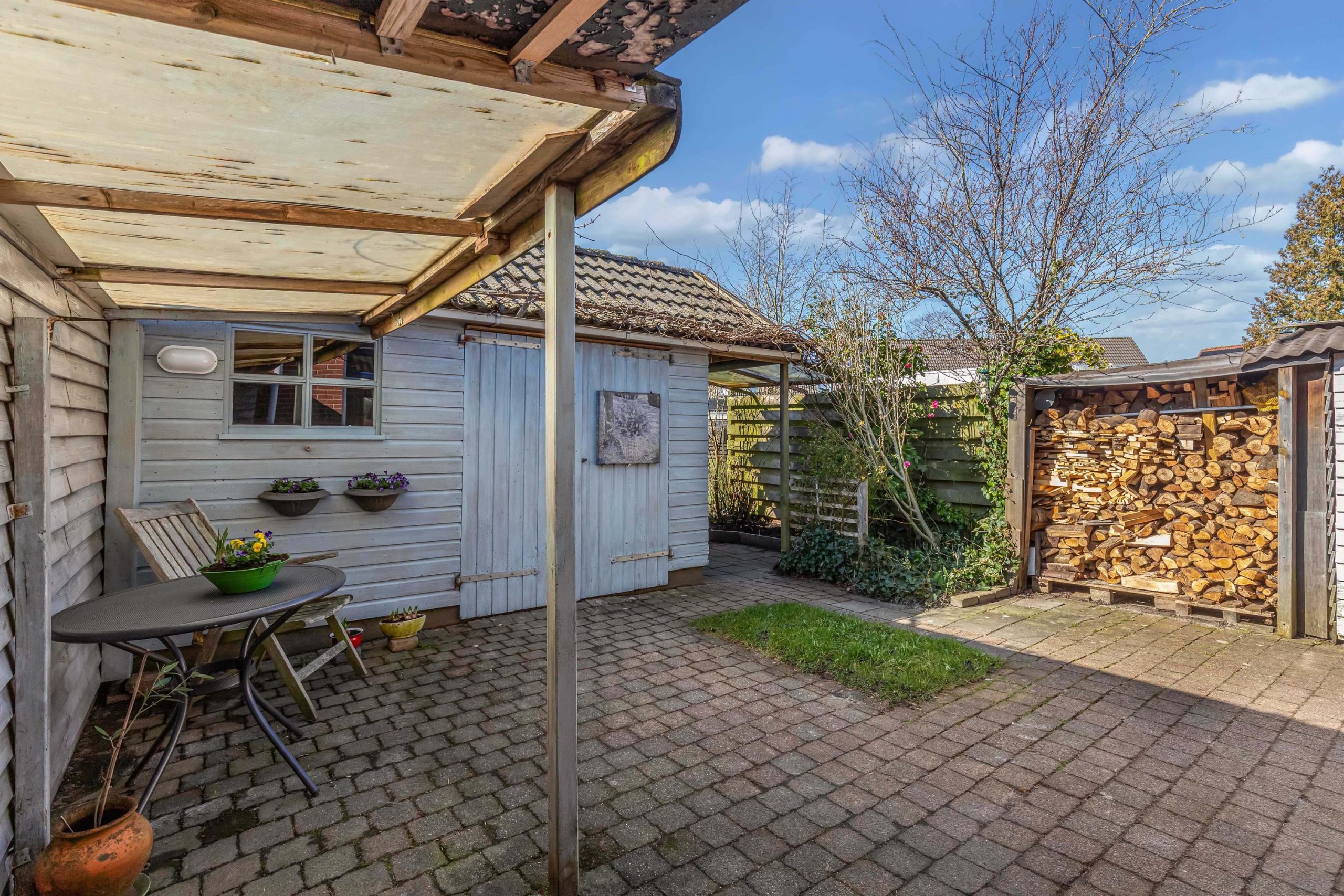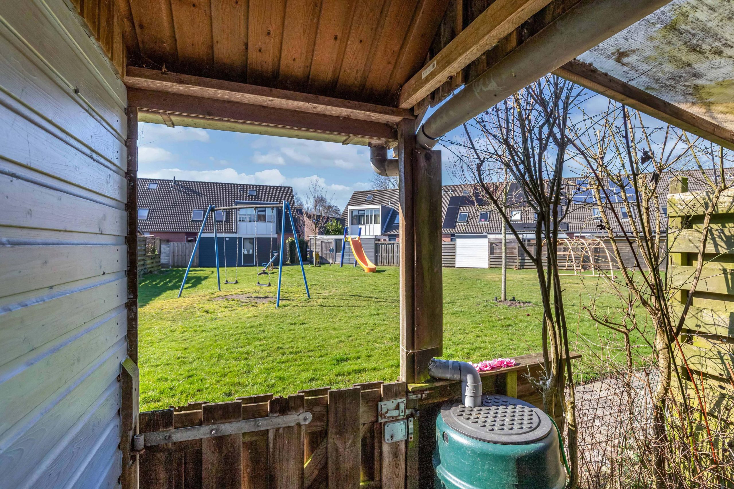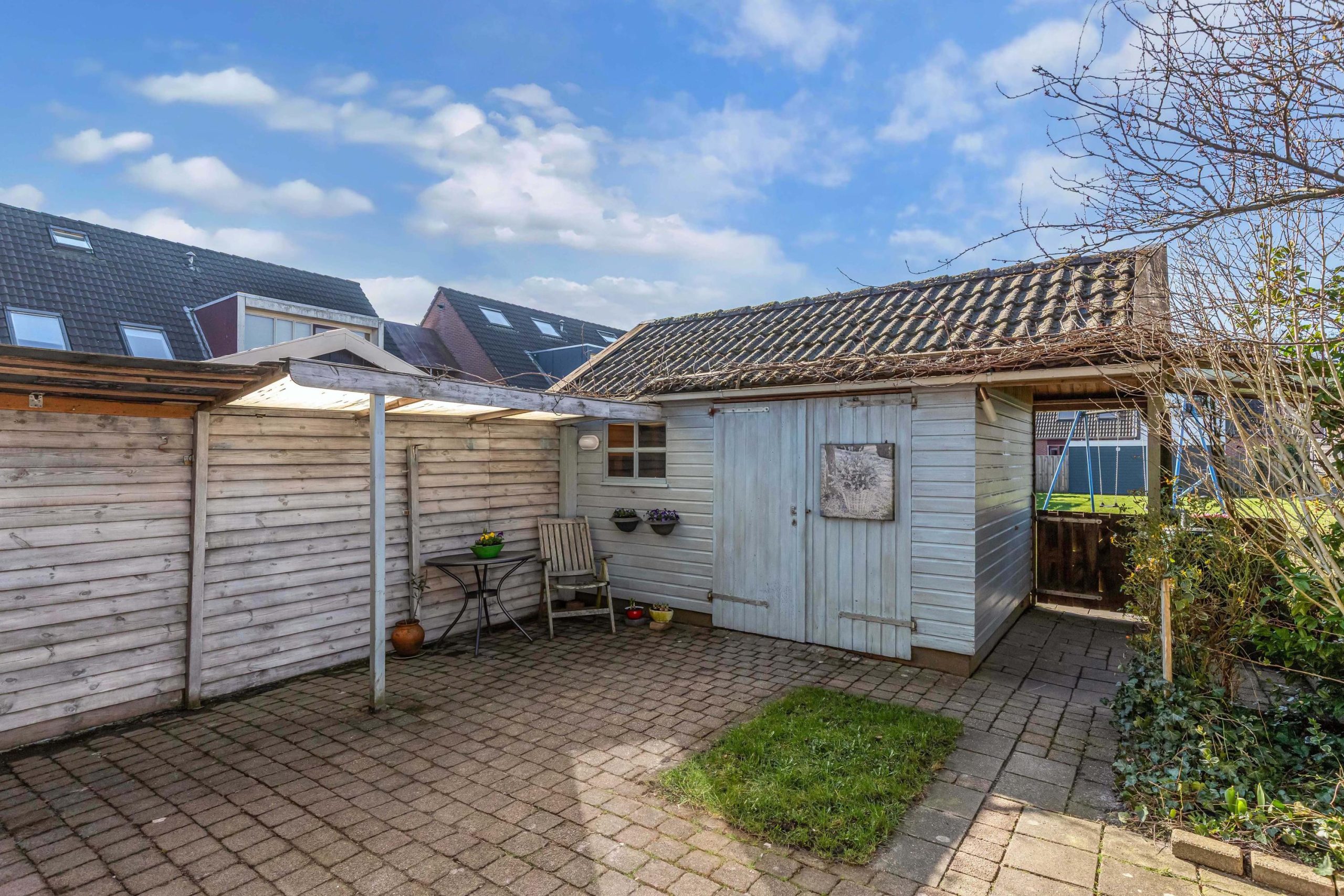 De achtertuin is gericht op het zonnige zuidwesten en heeft een vrije ligging zonder directe achterburen, wat zorgt voor veel privacy. De tuin is verzorgd aangelegd met sierbestrating en bij de achtergevel is een zonnescherm voor een behaaglijk schaduwplekje op warme dagen. Direct achter de woning bevindt zich een kleinschalig speelveldje, wat het een fijne plek maakt voor gezinnen. In de tuin staat een vrijstaande houten berging met dubbele deuren, elektra en een betonvloer. Ook heeft deze berging een brede achterdeur naar de steeg. In de zijtuin naast het huis bevinden zich nog twee extra bergingen, ideaal voor opslag of bijvoorbeeld het stallen van een motor.