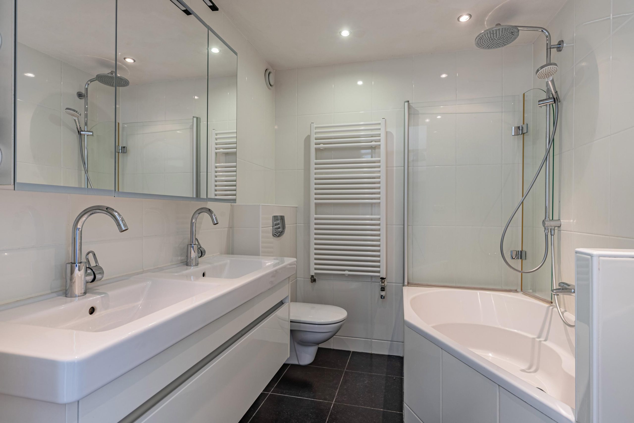 Een moderne badkamer met ligbad met douchescherm, tweede wandcloset, urinoir, handdoekradiator, elektrische vloerverwarming, breed wandmeubel met twee wastafels, lades en spiegelkast.