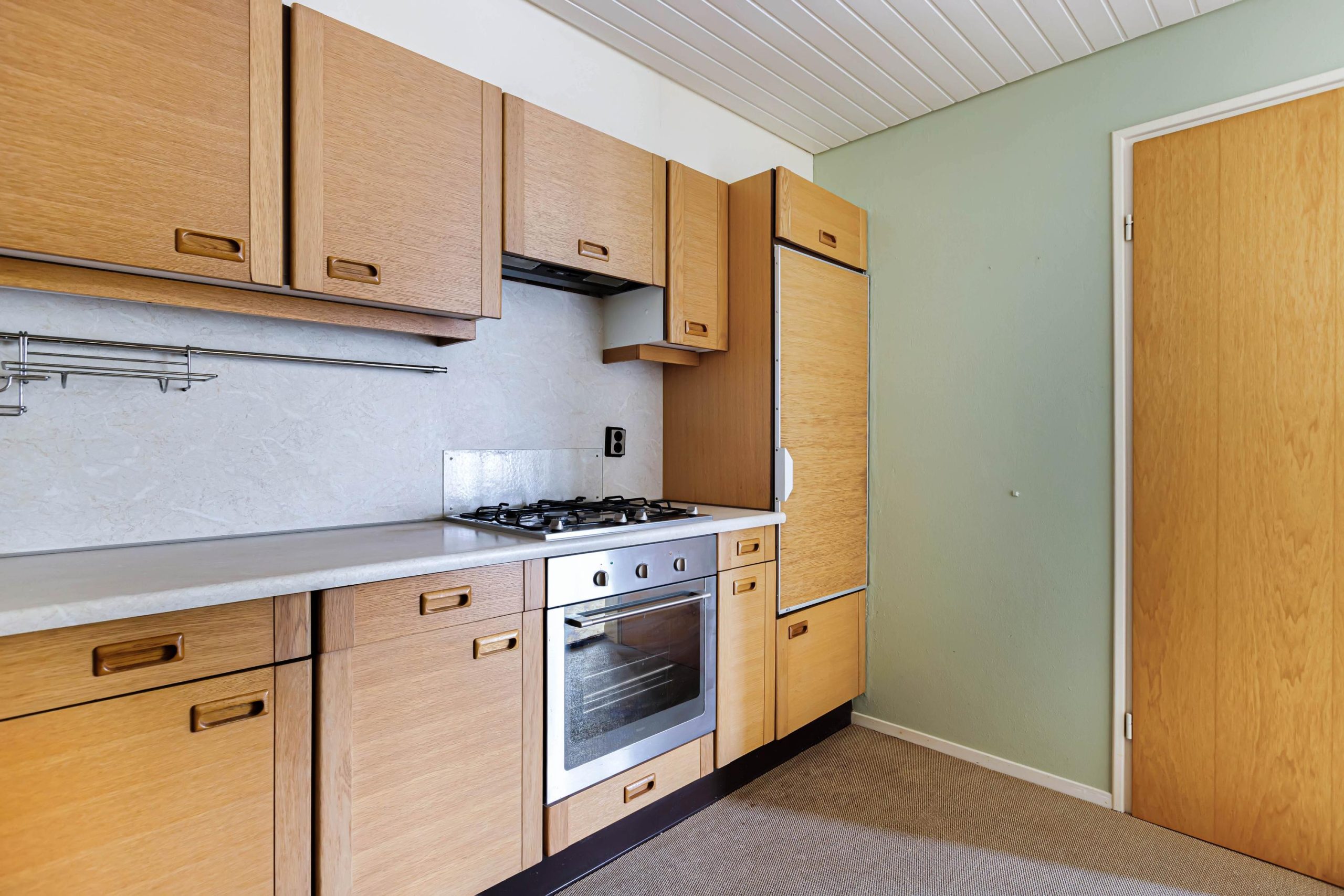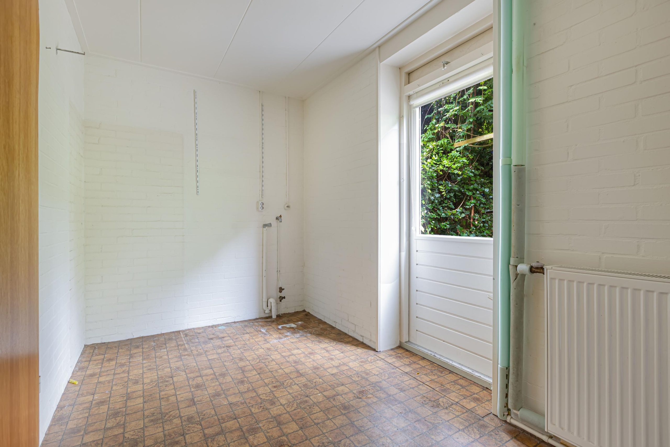 - bijkeuken - de bijkeuken is aan de achterzijde en tegelijkertijd verbouwd met de aanbouw van de woonkamer, deze beschikt over een witgoedaansluiting en een stortbakje. Er is een tuindeur en een deur naar de garage.