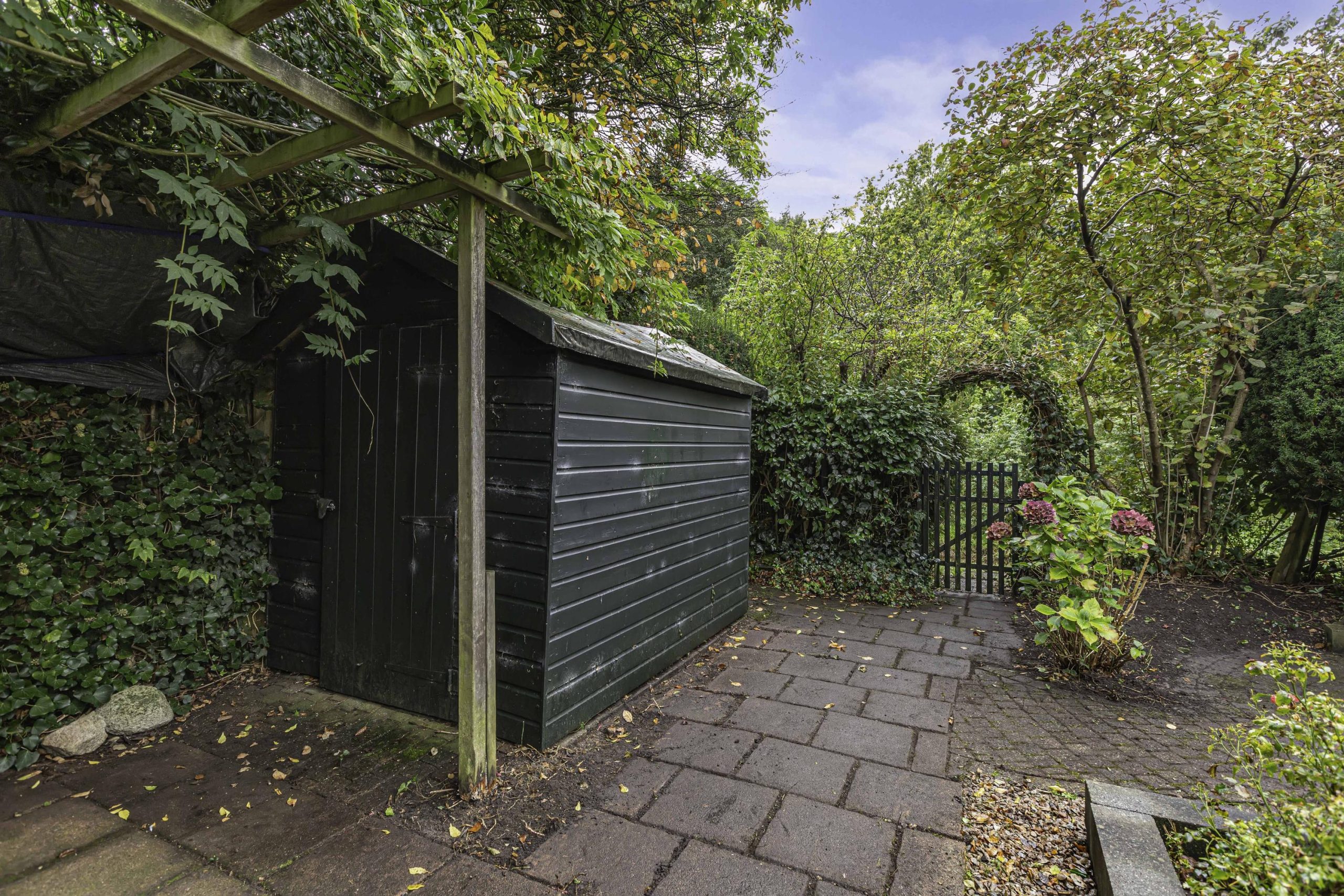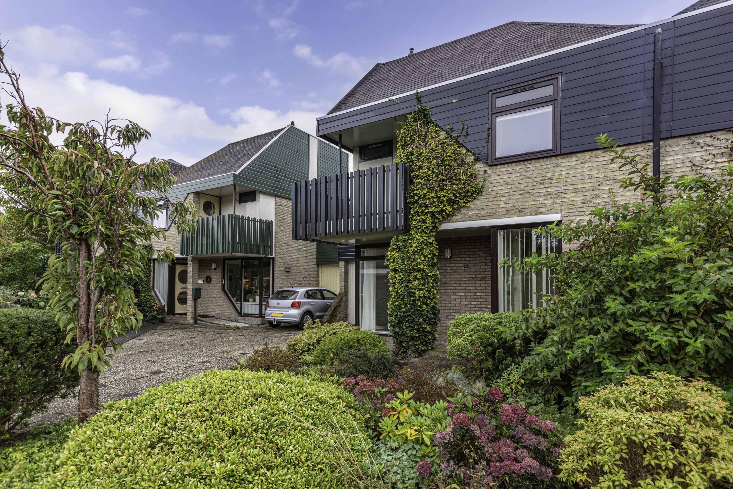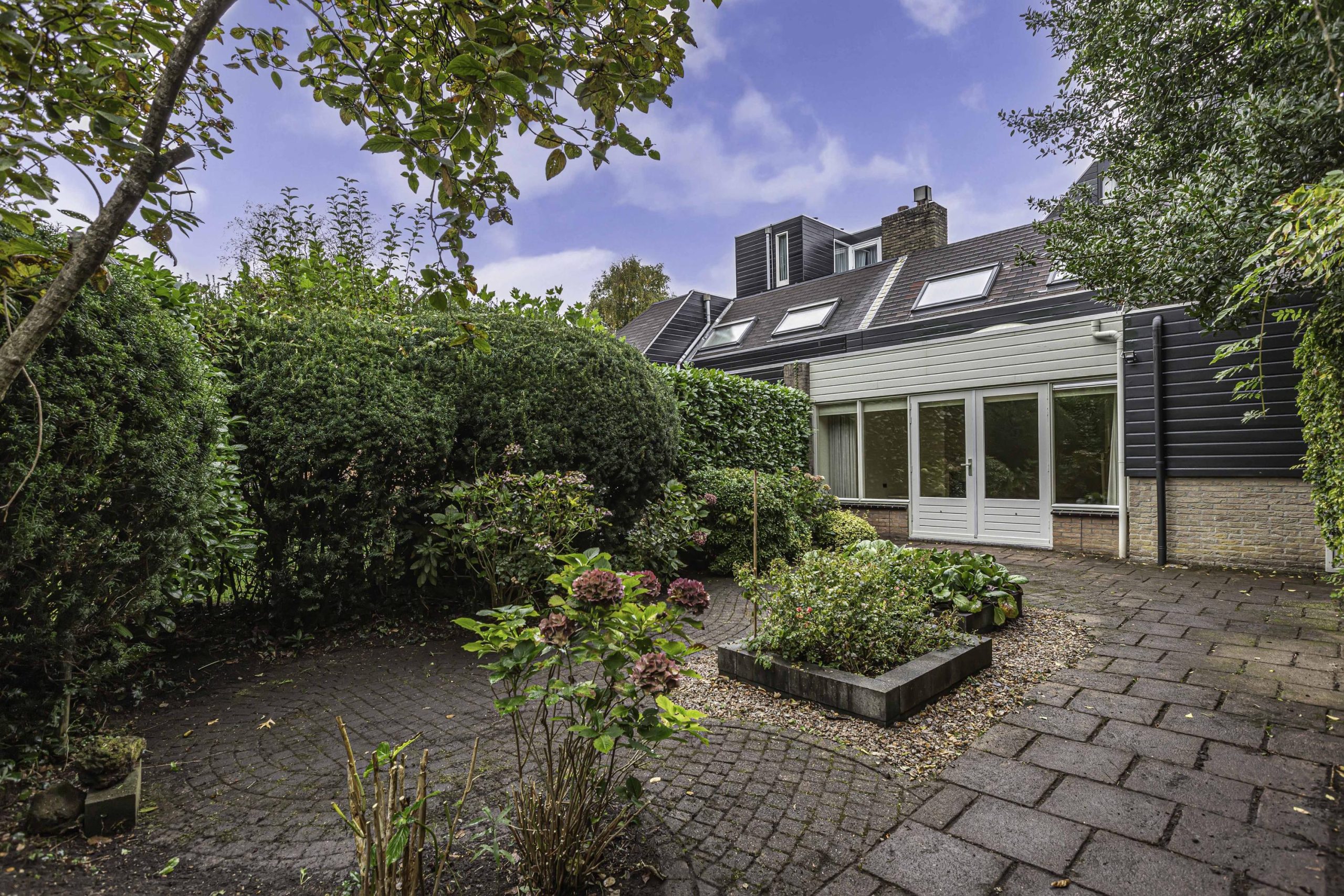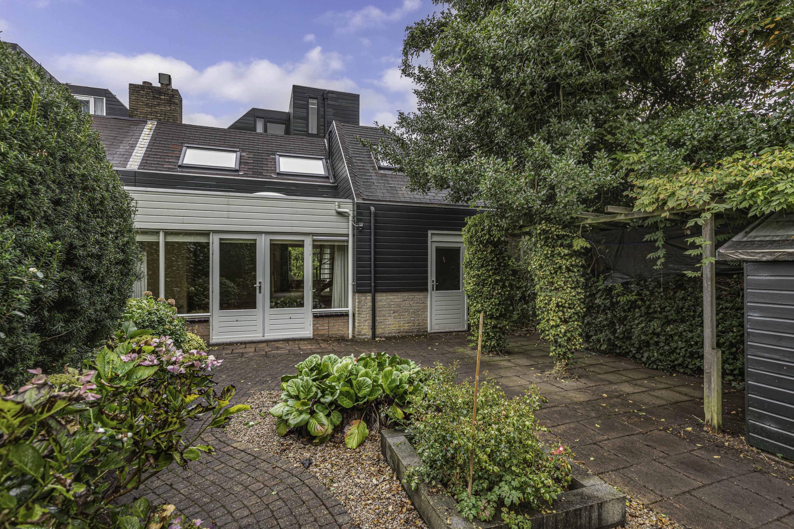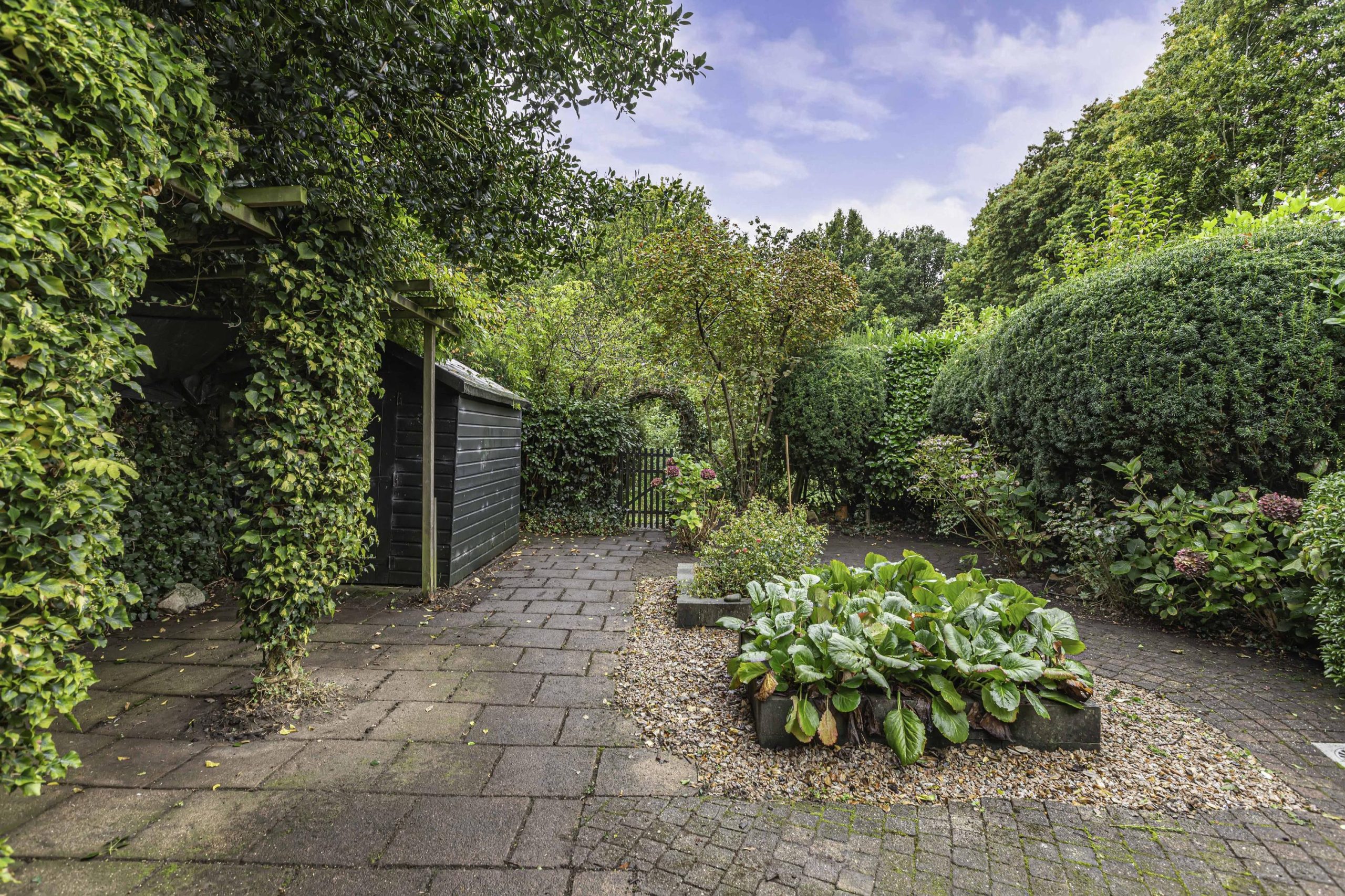 Groen aangelegde achtertuin. Bij de openslaande tuindeuren van de kamer is een terras. Hier kun je heerlijk de hele dag genieten van de zon! Je beschikt over een vrijstaande houten tuinberging. Je hebt ook een achterom achter het huis. Heel erg praktisch. Doordat de tuin grenst aan gemeentegroen en de parkachtige omgeving geniet je hier van heel veel privacy. De voortuin is verzorgd aangelegd met groene border en een lange oprit naar de garage. De garage heeft een kelder, een elektrische kanteldeur met geïntegreerde loopdeur en is vanuit de bijkeuken toegankelijk.