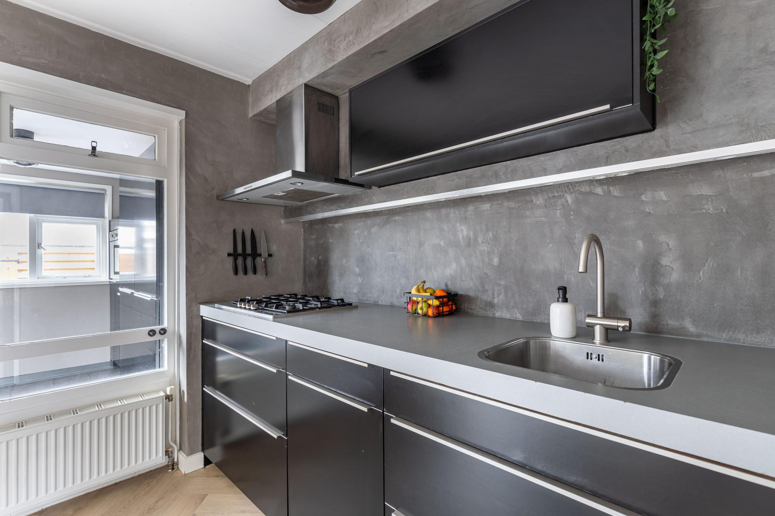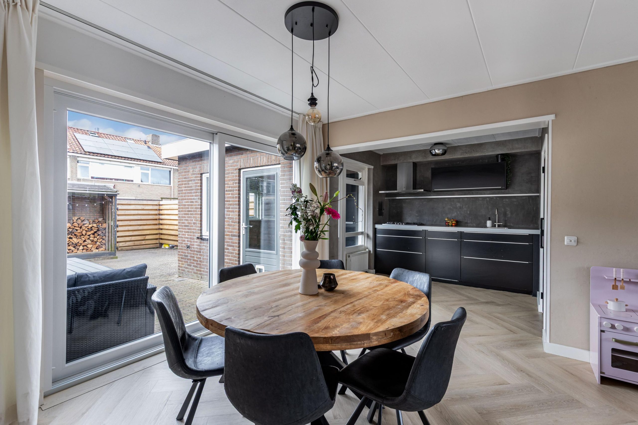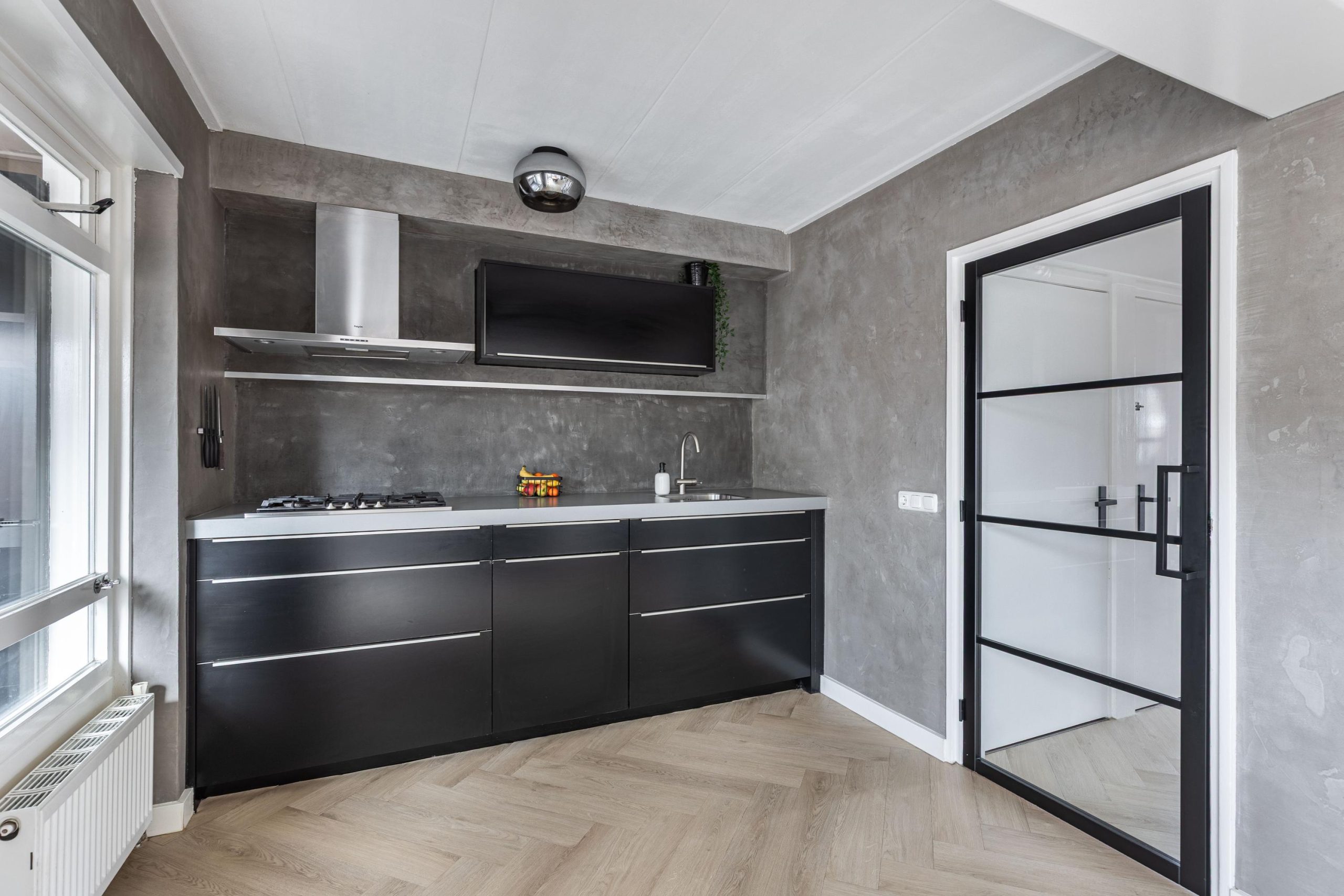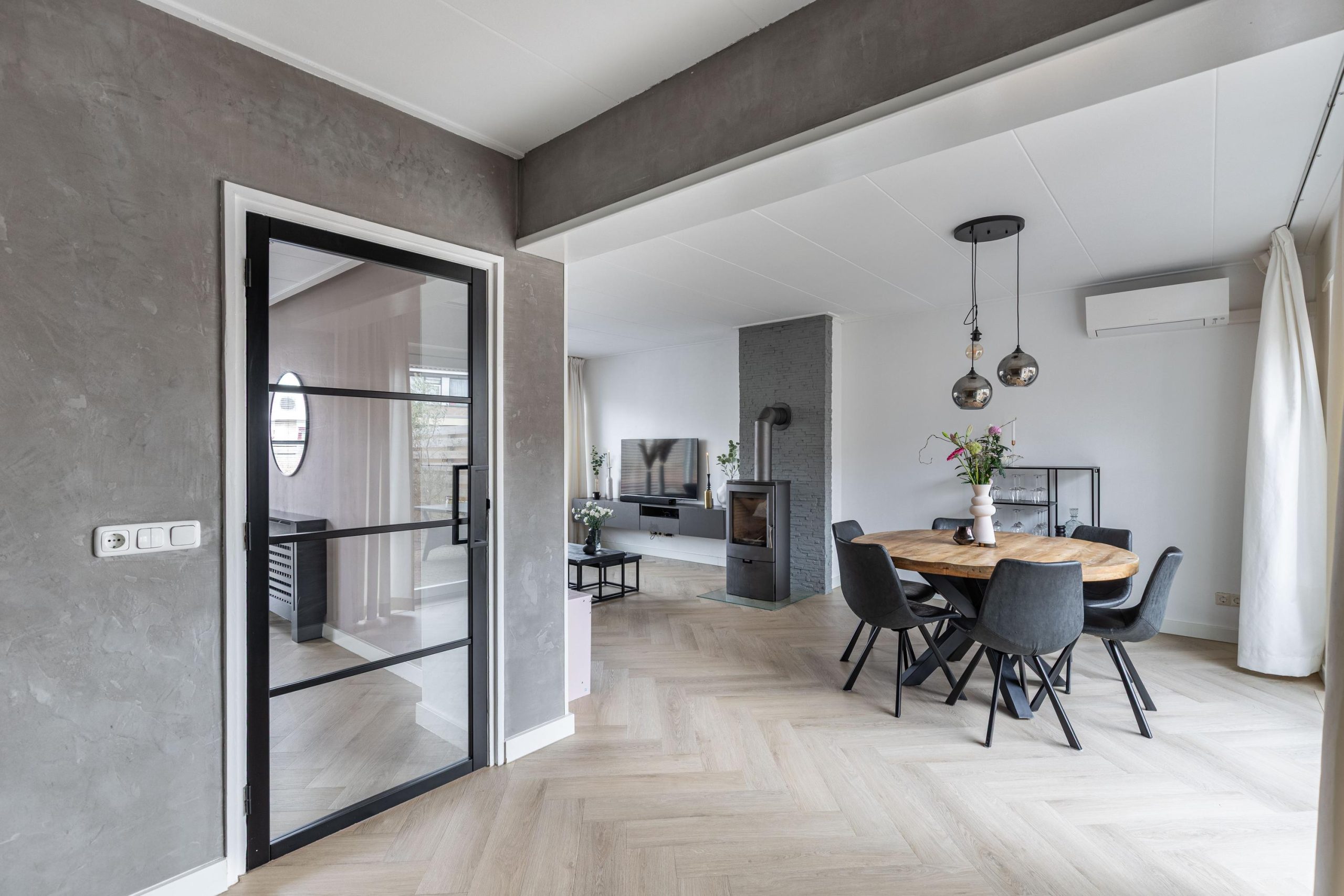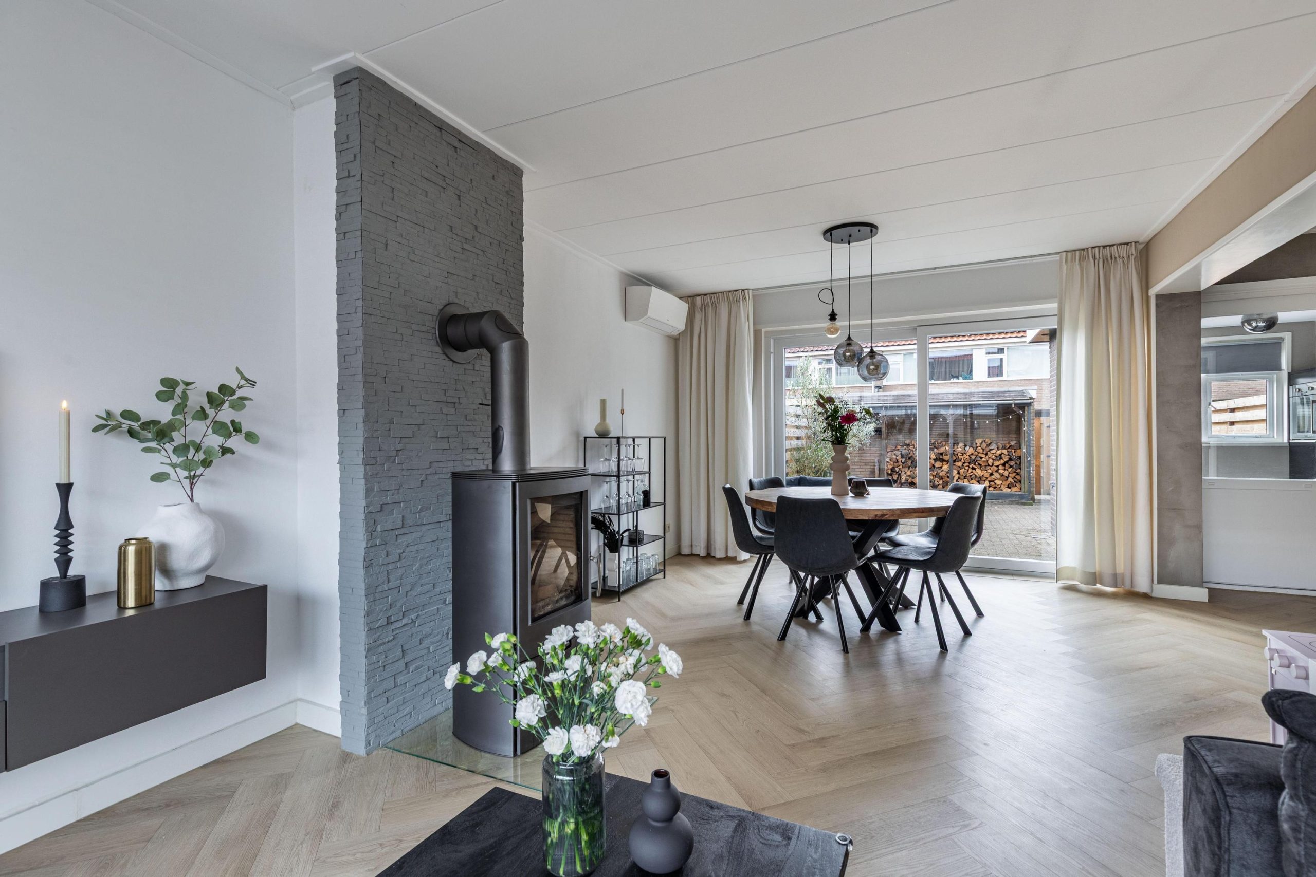 Door de moderne deur loop je de ruime woonkamer binnen, een echte eyecatcher. Dankzij de grote raampartijen en de schuifpui naar de tuin geniet je hier van een prettige lichtinval. De woonkamer is stijlvol afgewerkt met een visgraat gelegde pvc-vloer en hoge plinten, modern en luxe! Daarnaast is de kamer voorzien van airconditioning en een sfeervolle houtkachel, waardoor comfort en gezelligheid hier perfect samenkomen. De open keuken is uitgevoerd met opstelling in modern mat zwart en beschikt over een werkblad op prettige werkhoogte. De keuken is compleet uitgerust met softclose lades, klepkast, een breed 4-pits gasstel, een afzuigkap en een vaatwasser.