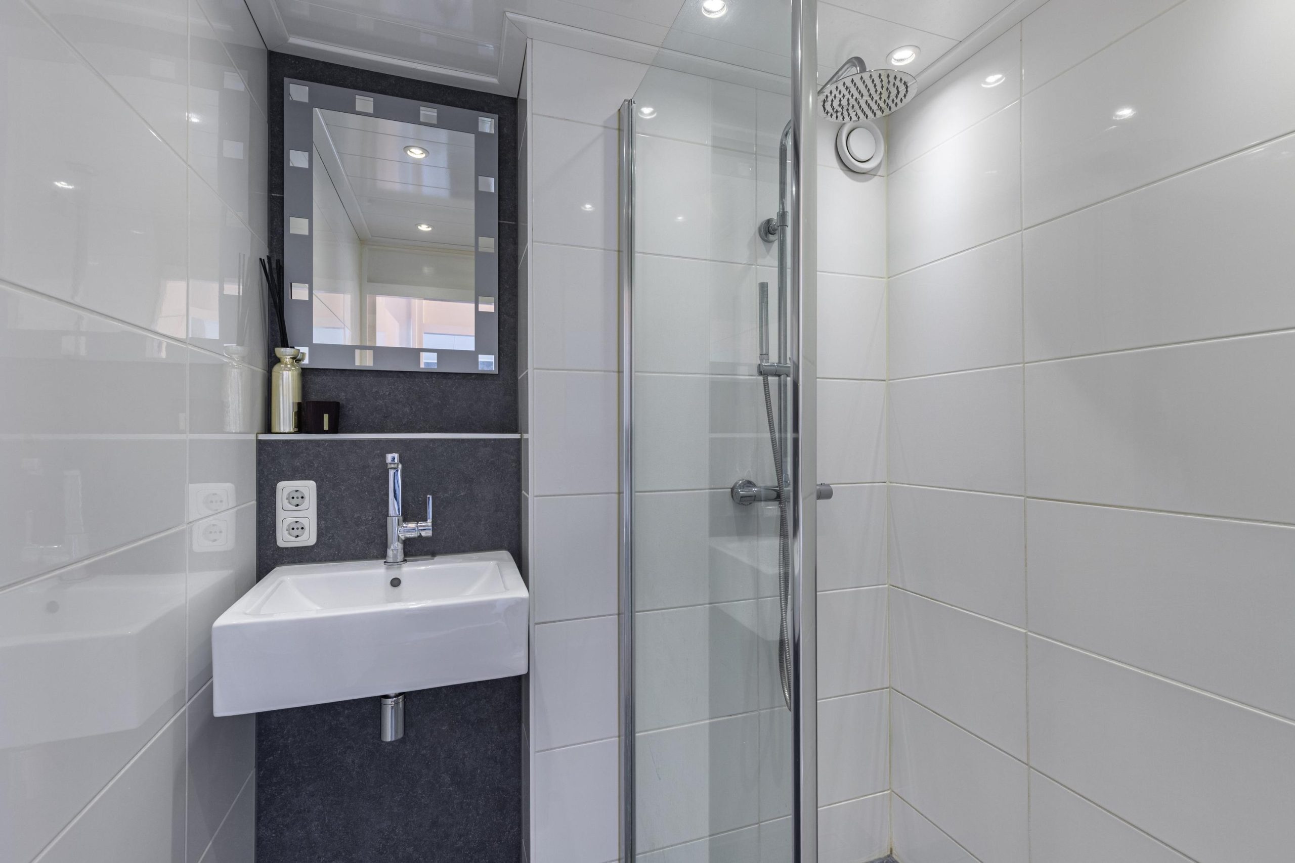 Moderne badkamer voorzien van een inloopdouche met regendouche, een wastafel met kraan, spiegel én een inbouw badkamerradio.