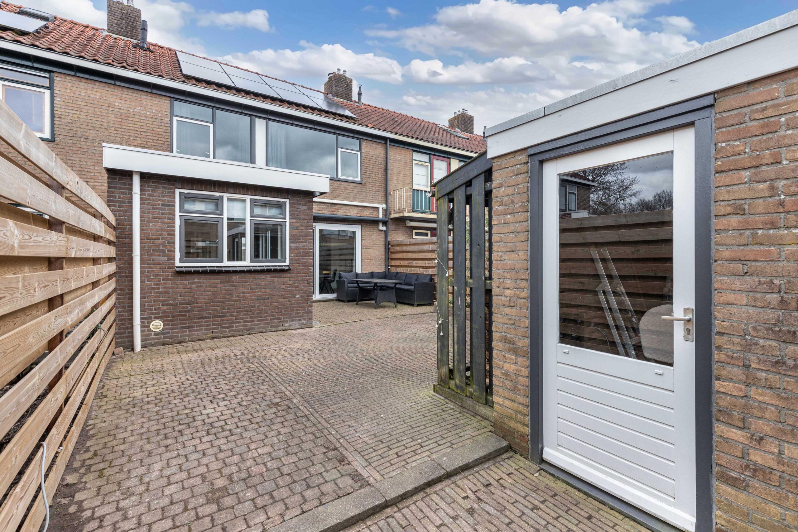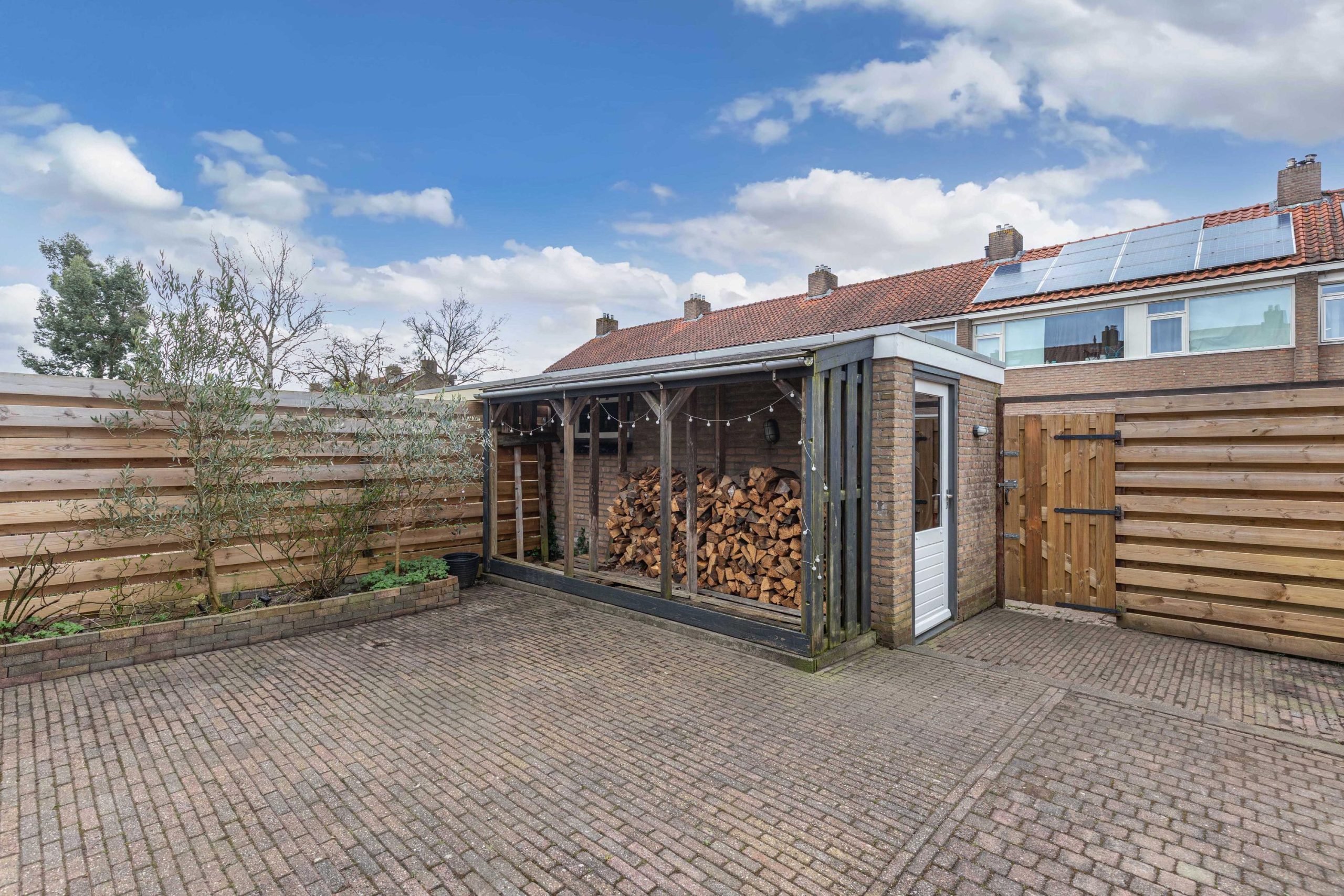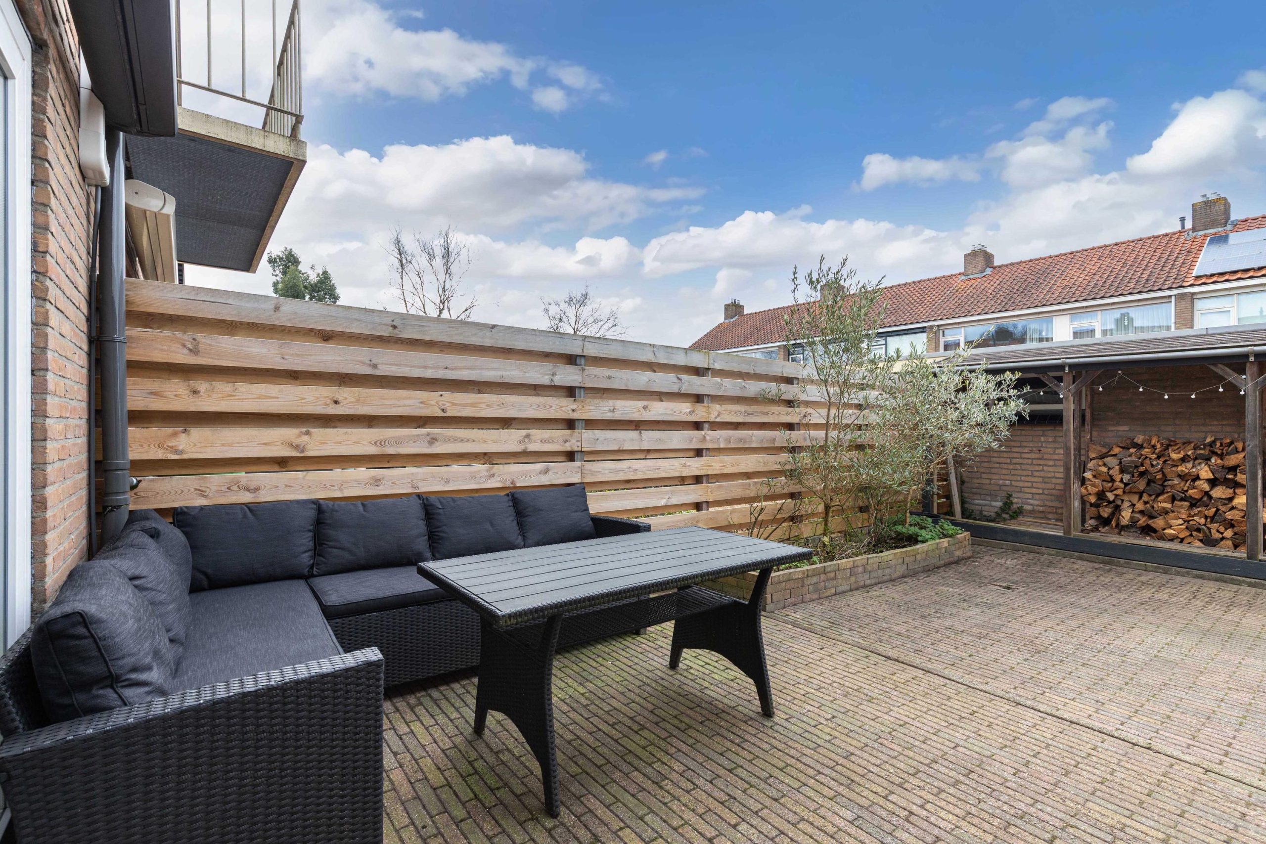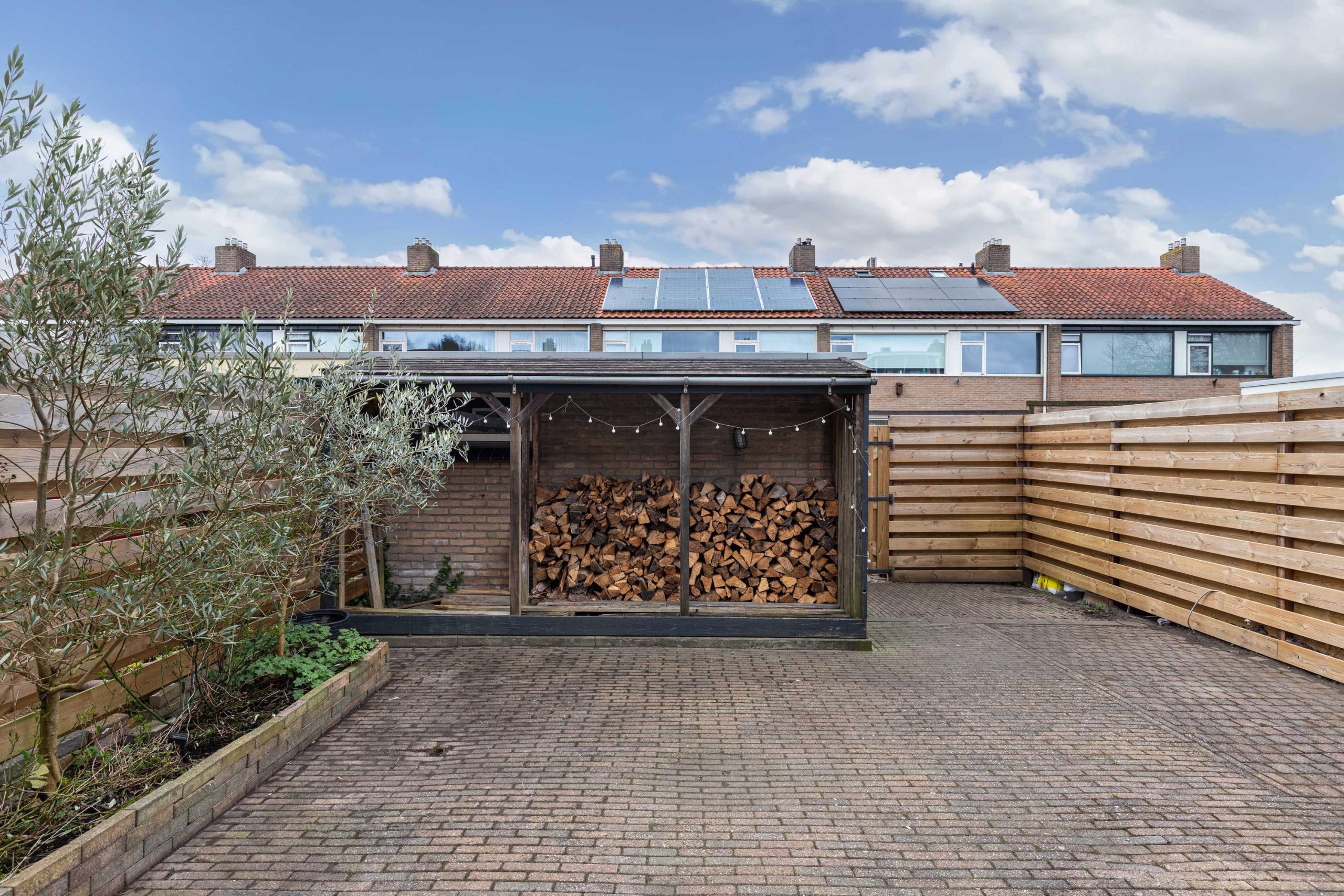 De voortuin is een bordertuin en ook de achtertuin is onderhoudsarm is met sierbestrating. De achtertuin beschikt over een afdakje voor houtopslag, mooie borders en een breed terras op het westen gericht. De schuttingen zijn de afgelopen twee jaar vernieuwd en er is een brede zonwering aanwezig. Achterin staat een stenen berging, ideaal voor opslag of het stallen van fietsen. Er is een achterom naar een breed voetpad.
