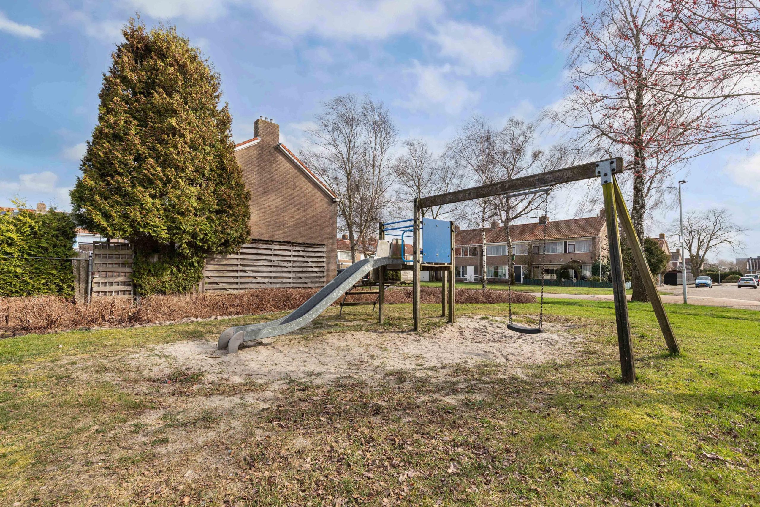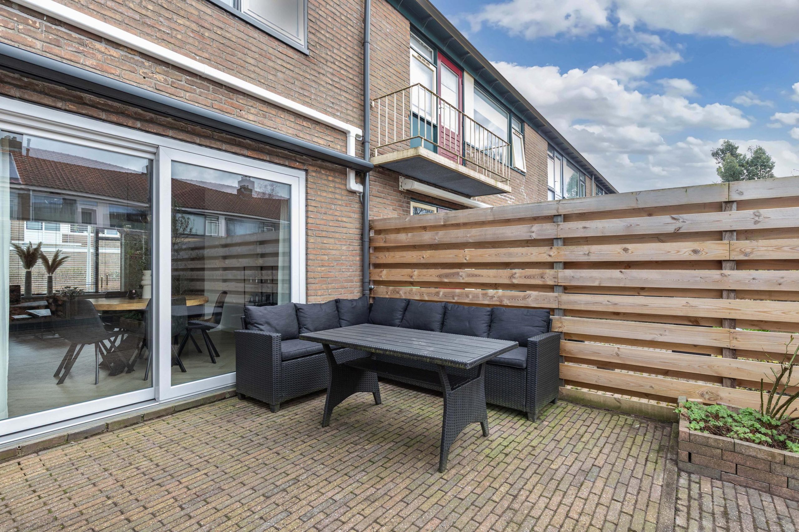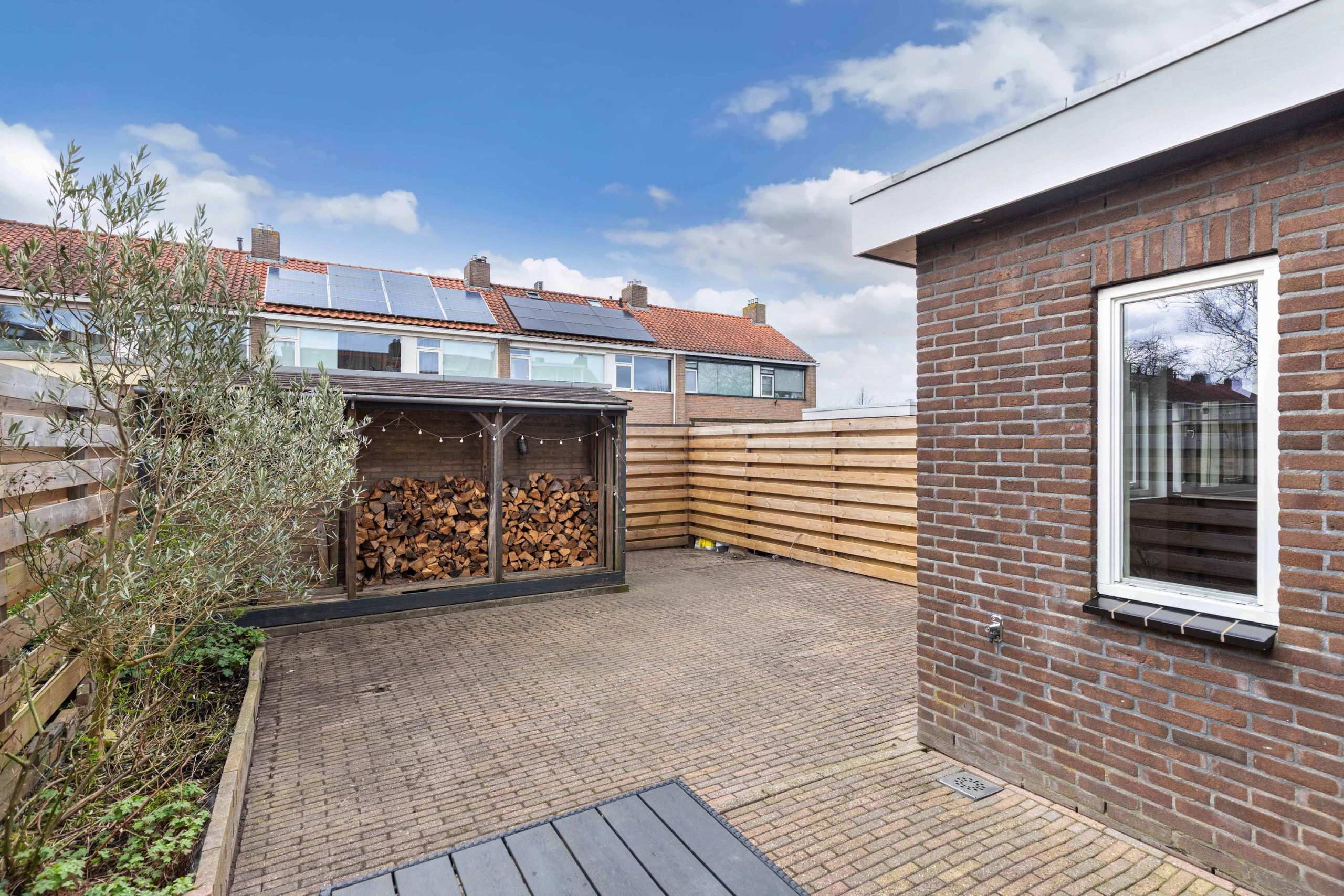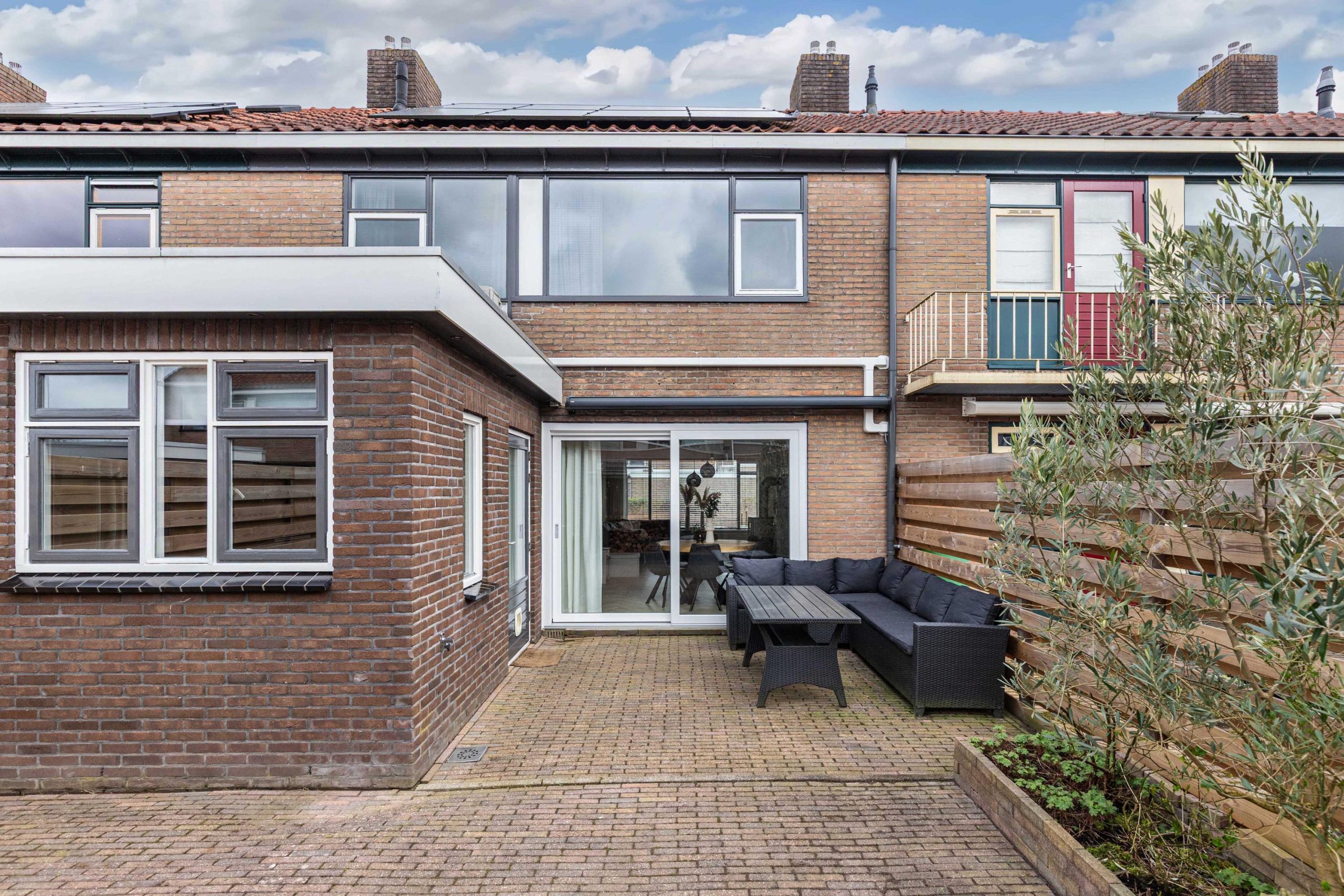 De voortuin is een bordertuin en ook de achtertuin is onderhoudsarm is met sierbestrating. De achtertuin beschikt over een afdakje voor houtopslag, mooie borders en een breed terras op het westen gericht. De schuttingen zijn de afgelopen twee jaar vernieuwd en er is een brede zonwering aanwezig. Achterin staat een stenen berging, ideaal voor opslag of het stallen van fietsen. Er is een achterom naar een breed voetpad.