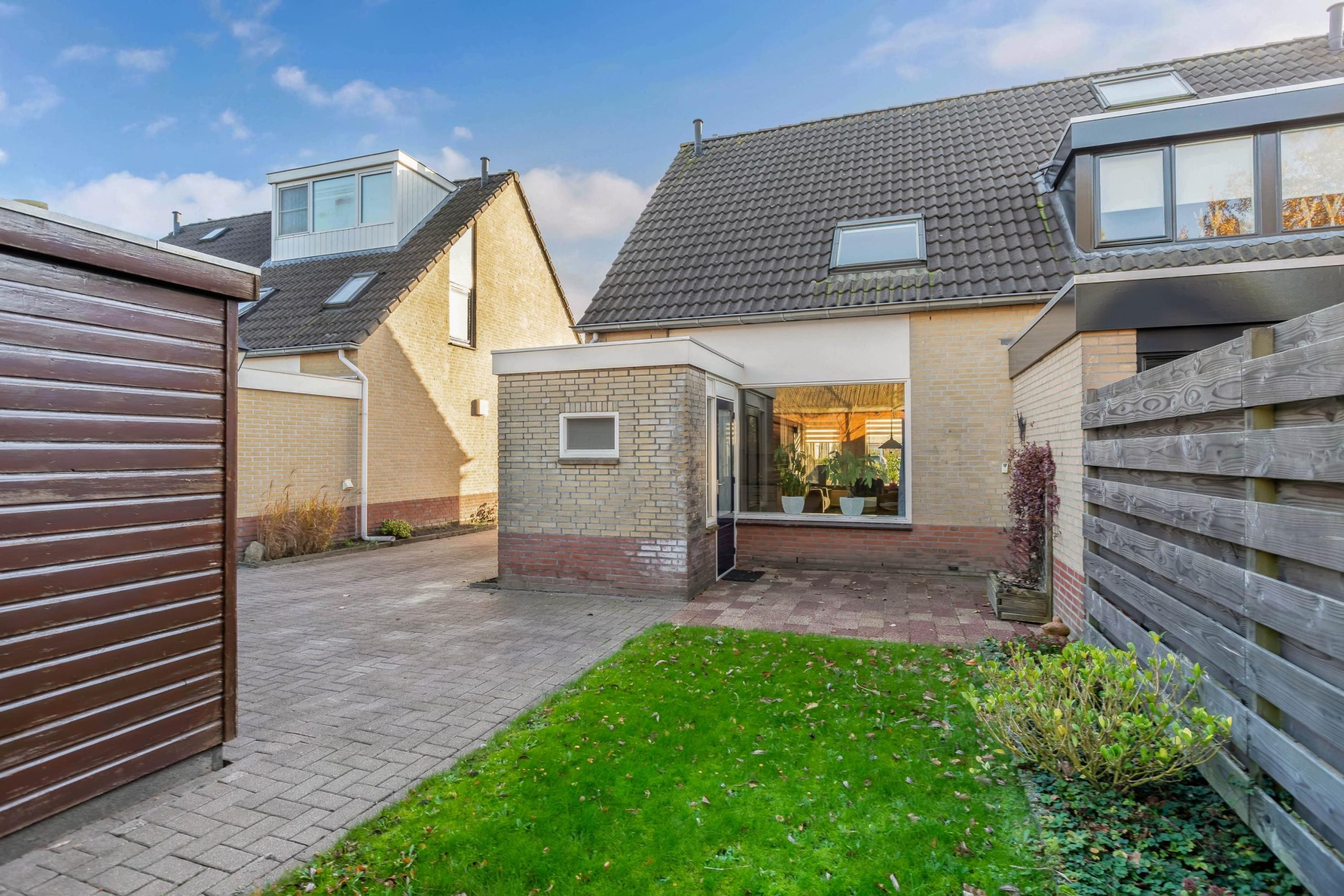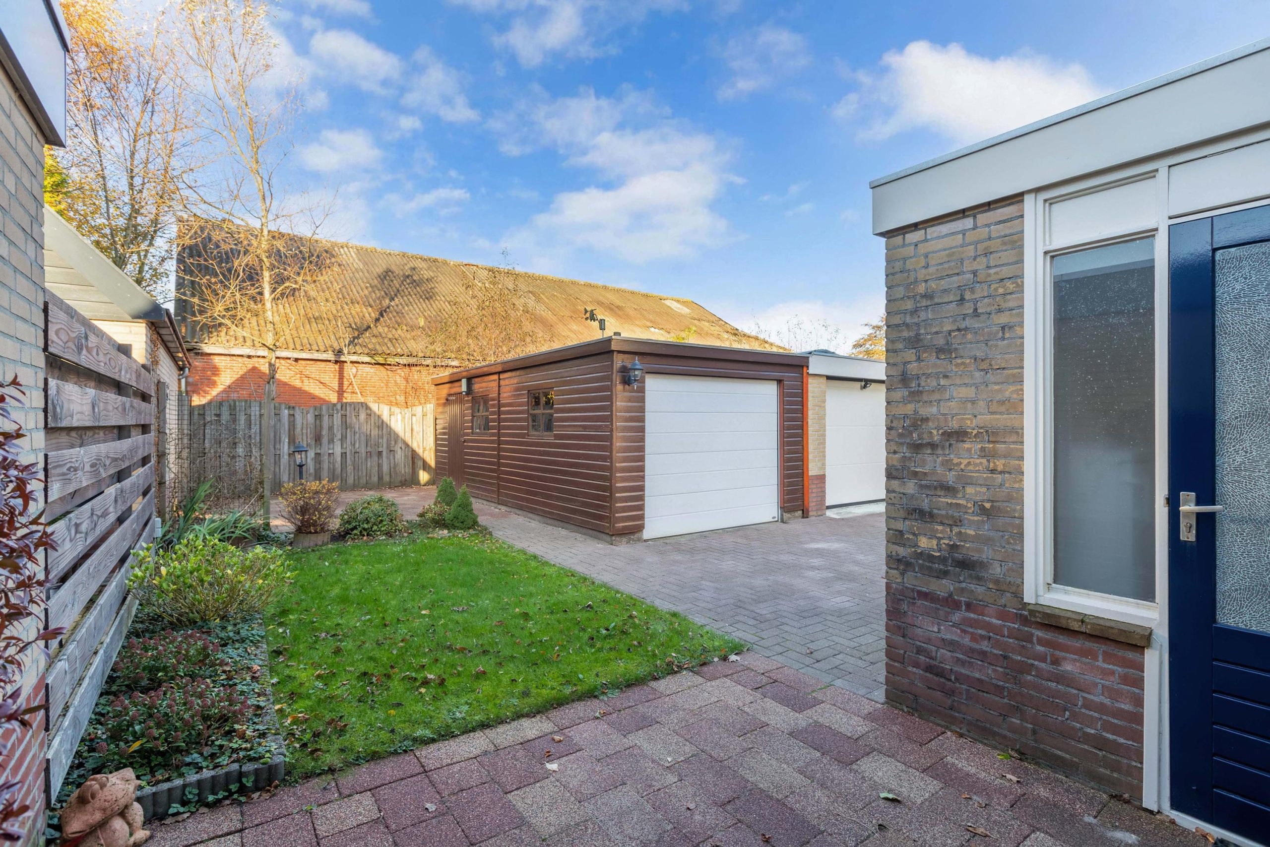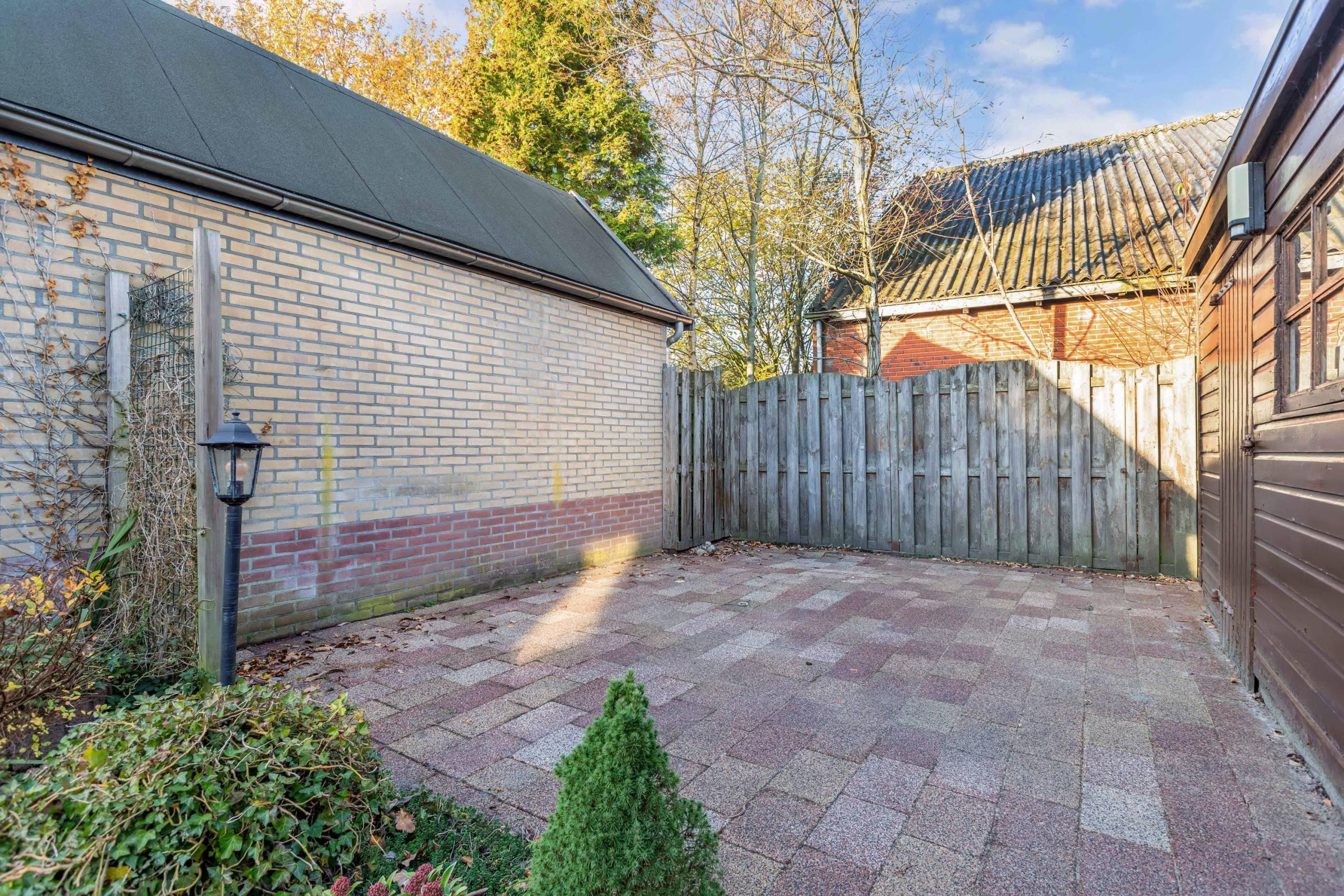 De achtertuin is verzorgd aangelegd met gazon, sierbestrating, terras, borders en goede beschutting. Door de diepe achtertuin heb je veel privacy. Achter de woning is een sloot en aan de overkant van de sloot staat een loods die in gebruik is voor kleinschalige verkoop van o.a. witgoed. Heerlijk rustig dus. De achtertuin is op het noorden, maar diep genoeg voor veel zon en op hete dagen dus ook een schaduwplekje bij het huis. De voortuin is onderhoudsarm aangelegd met groene border en grindborder.
