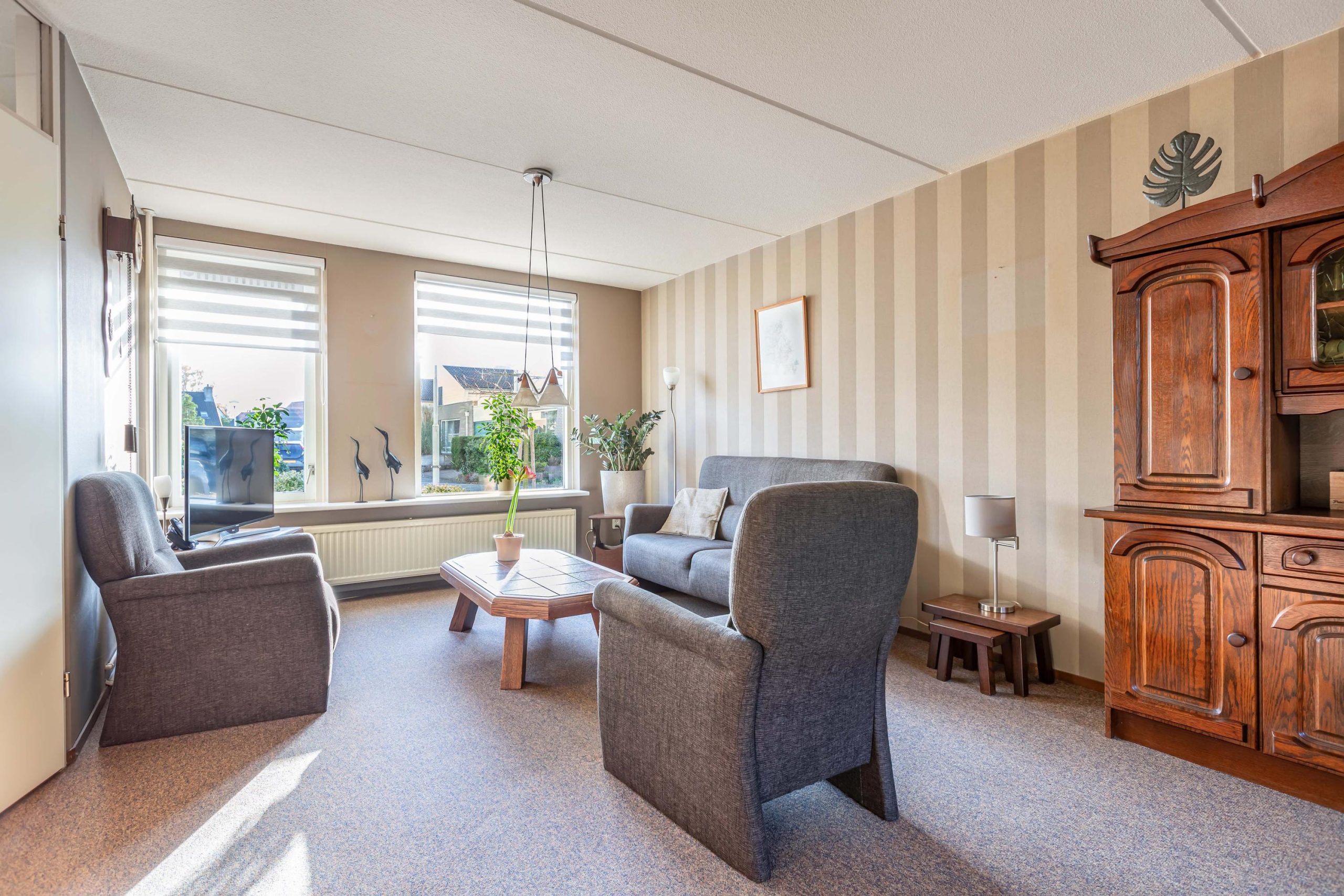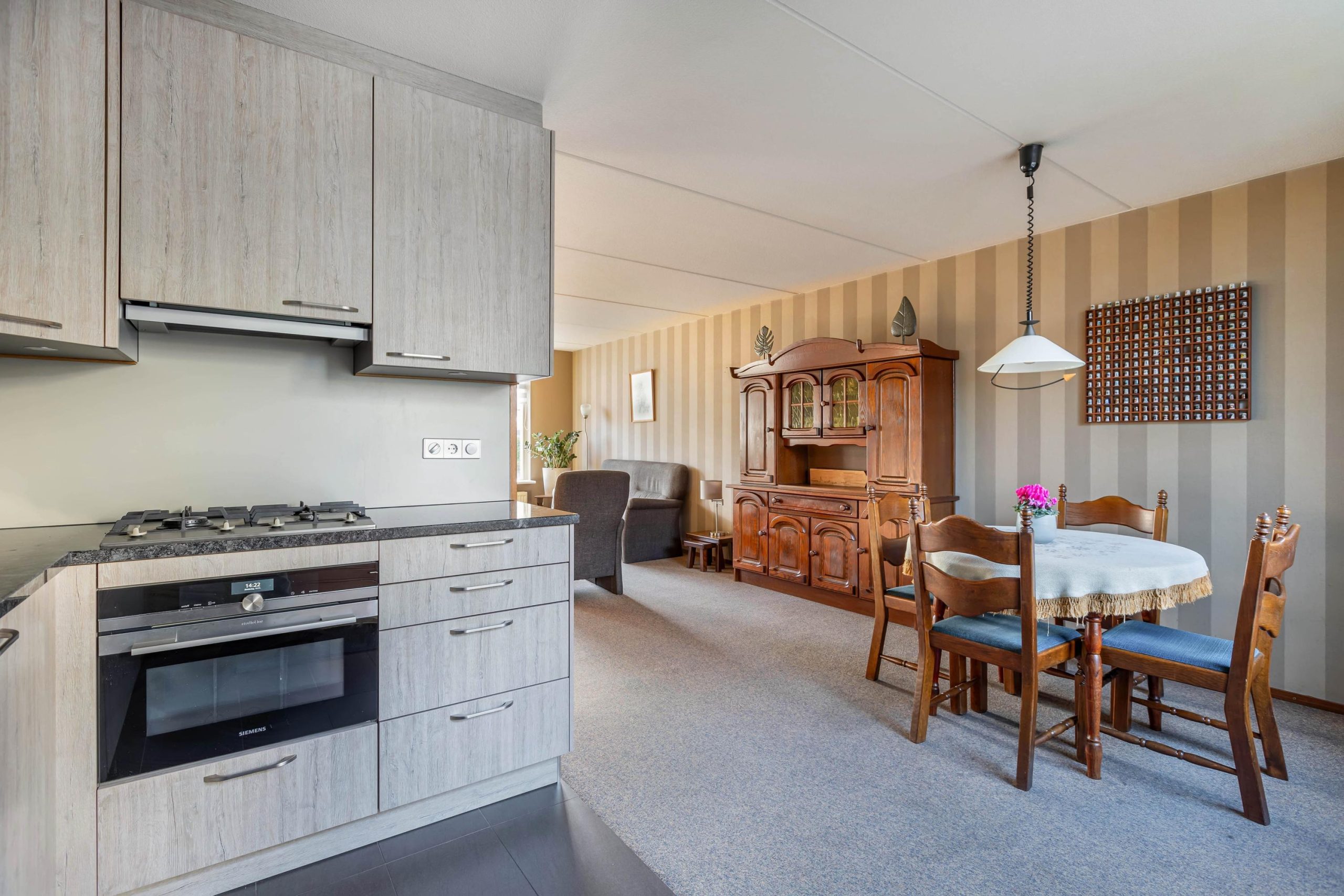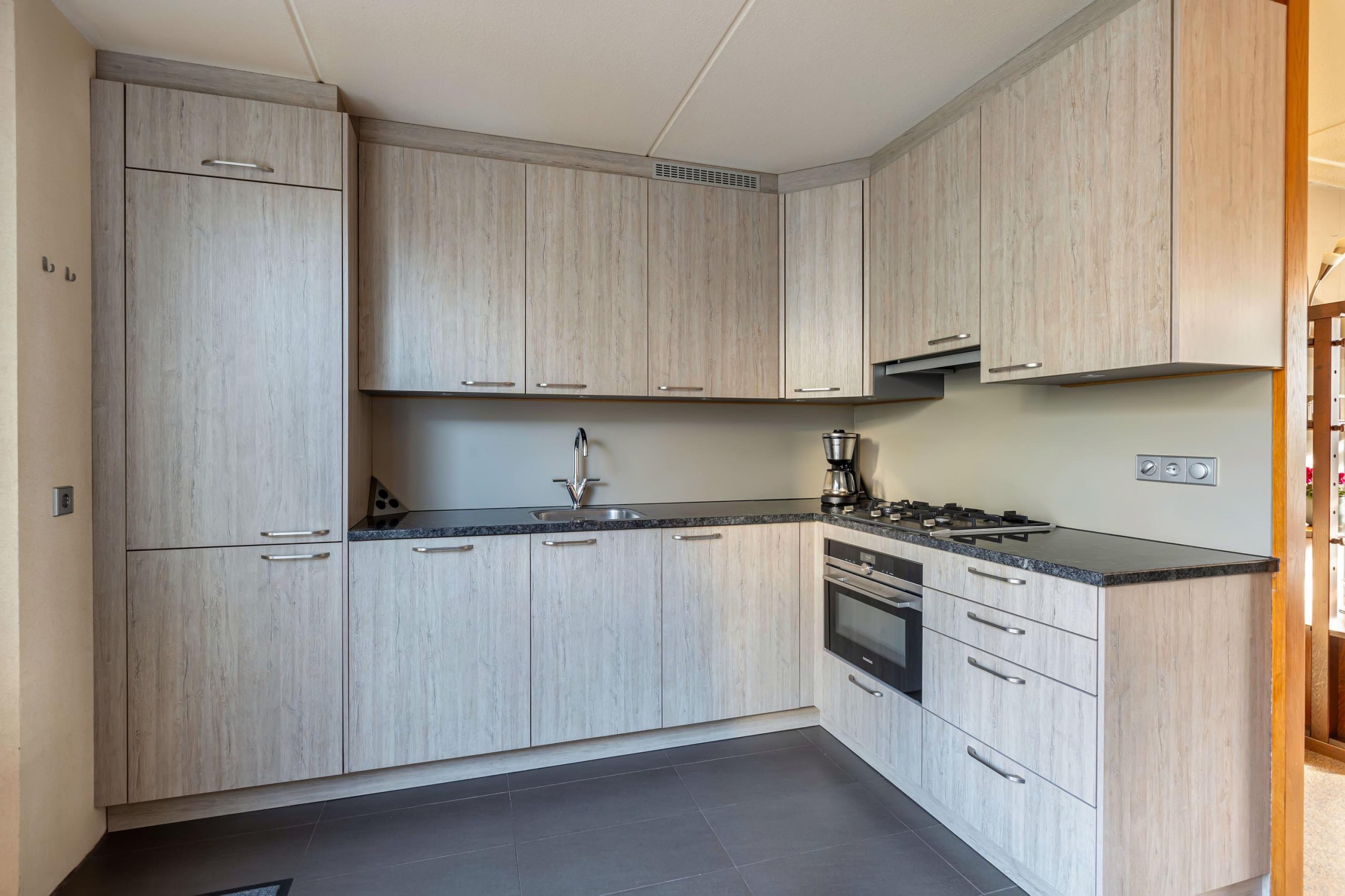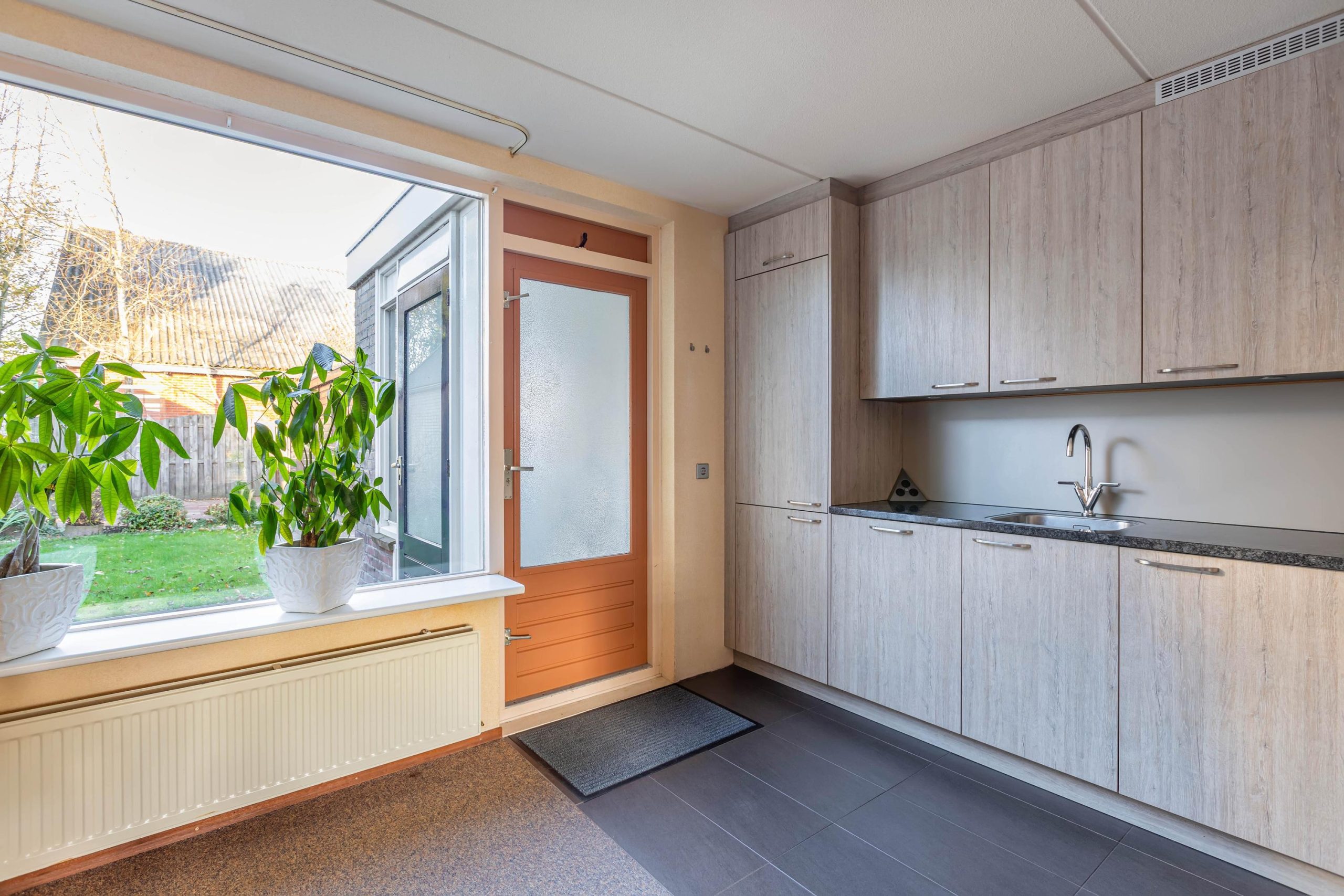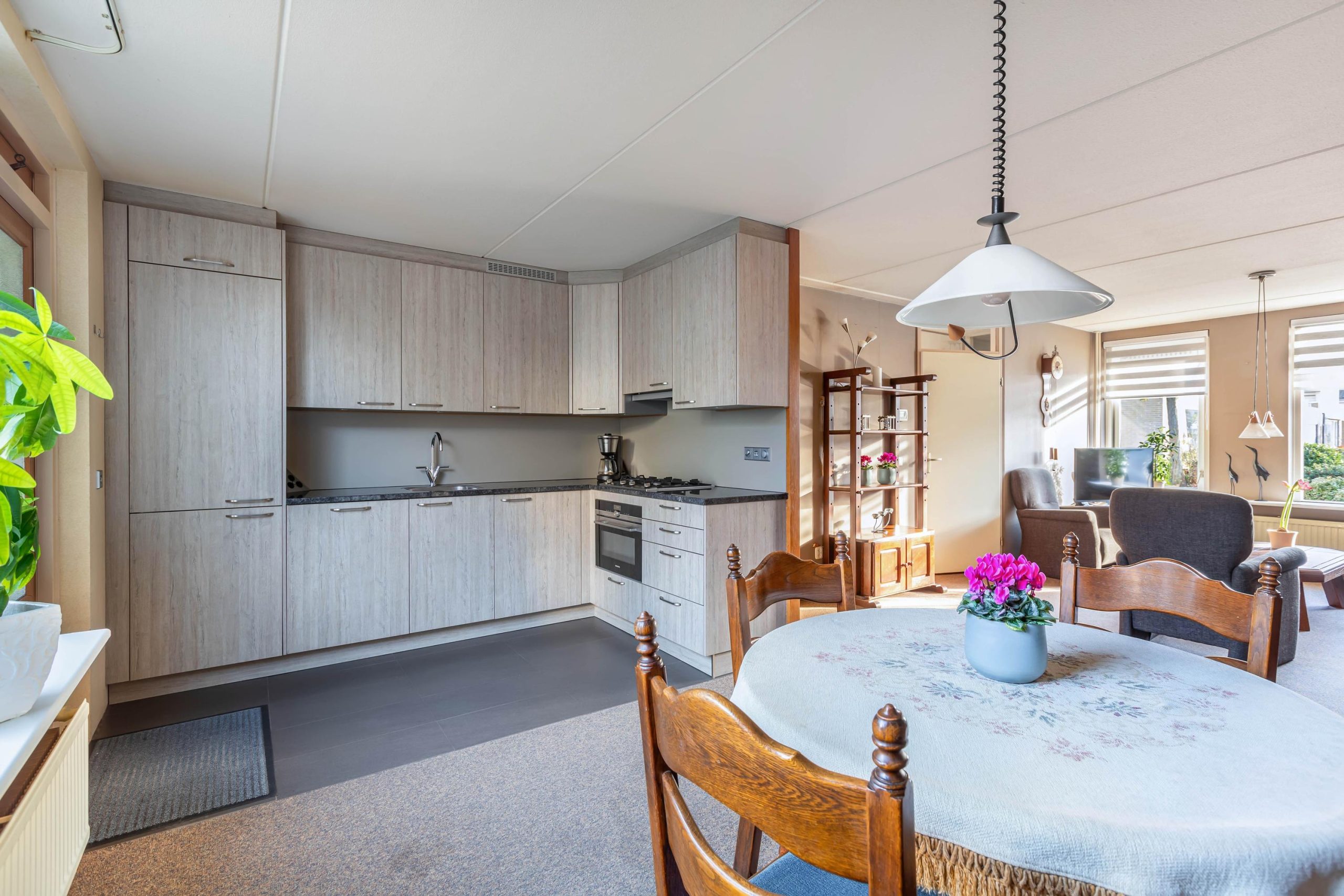 In de woonkamer valt het licht goed naar binnen door de "doorzon-stand". Voor in de woonkamer is de plek voor een zithoek met TV, hier heb je een vrije zichtlijn naar de straat zonder inkijk van andere woningen. Veel provisie kun je kwijt in de trapkast. Achter in de woonkamer bij de open keuken is ruimte voor een grote gezinstafel. De keuken heeft een moderne opstelling met een granieten werkblad en kunststof spatwand. De L-keukenopstelling is van alle gemakken voorzien zoals een combi oven/magnetron, een gaskookplaat met afzuigkap, een koelvries-combi en een vaatwasser. De apparaten zijn van de A-merken Liebherr en Siemens. Op de vloer liggen antraciet plavuizen. Vanuit de keuken kom je in de aangebouwde bijkeuken. Praktisch voor de inloop en garderobe.