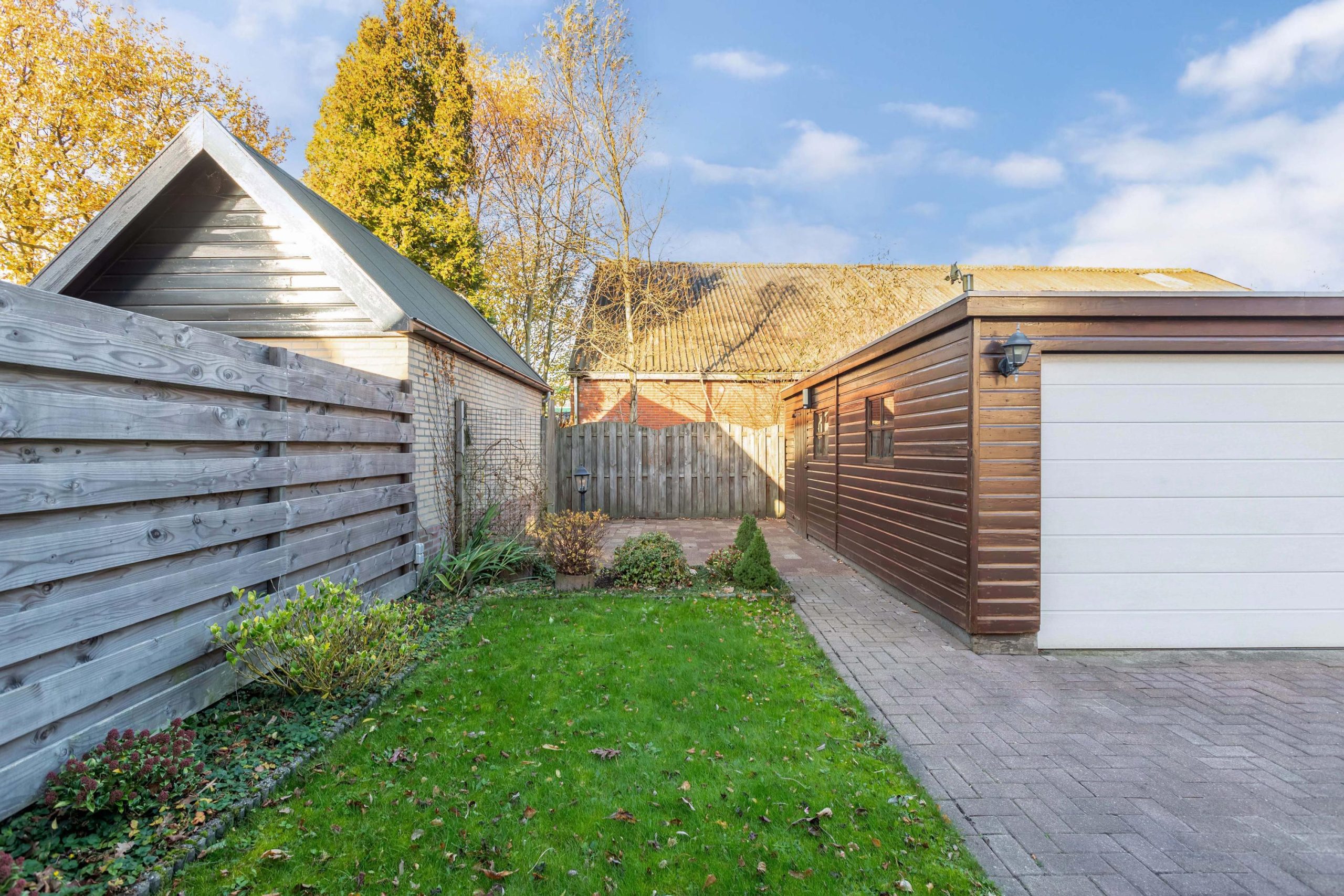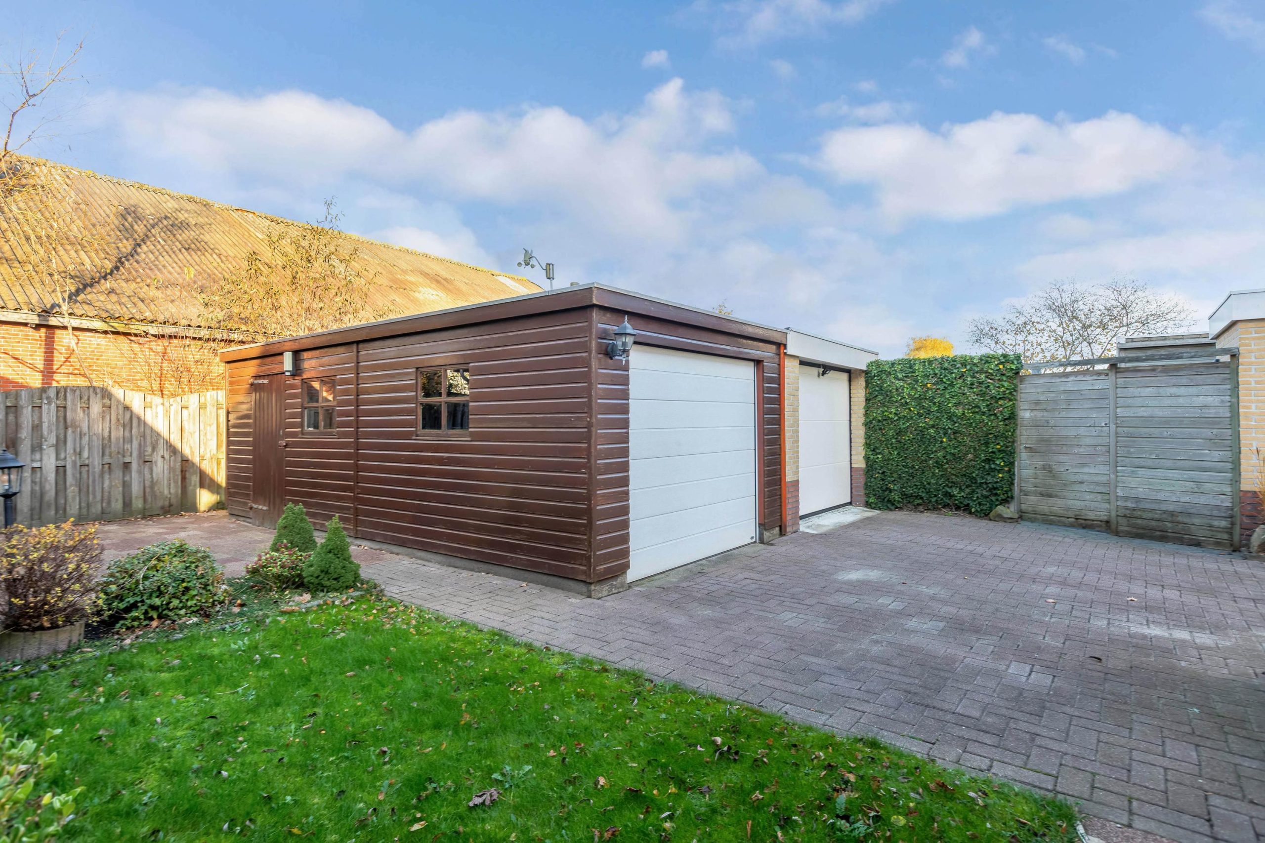 Een vrijstaande houten garage met sectionale elektrisch bedienbare deur. Ideaal voor je auto en de fietsen maar ook handig voor een creatieve hobby. Achter de garage is een overkapping voor de kliko's. Er is een lange oprit voor de auto, deze deel je met de buren, naar de garage.