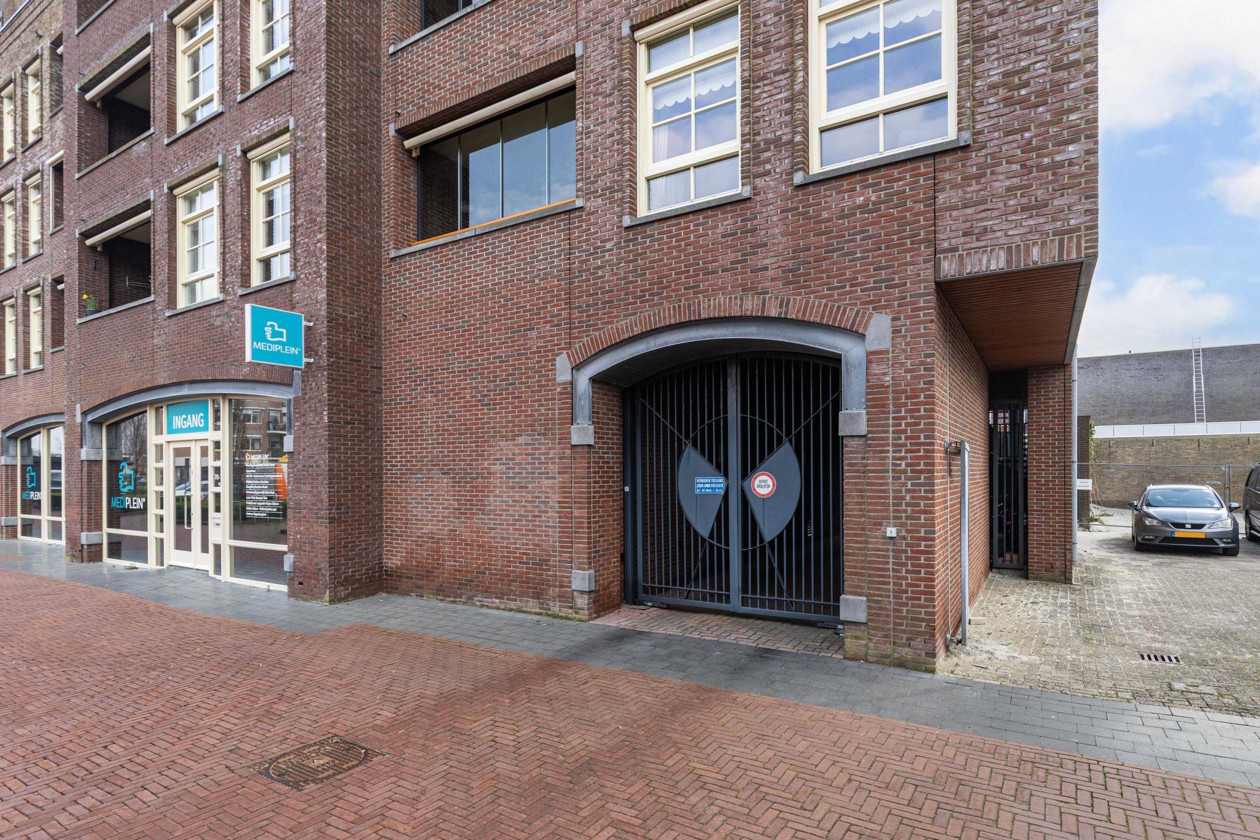 - een afgesloten binnenterrein, toegankelijk via de centrale hal en via een op afstand te bedienen elektrisch toegangshek voor de auto