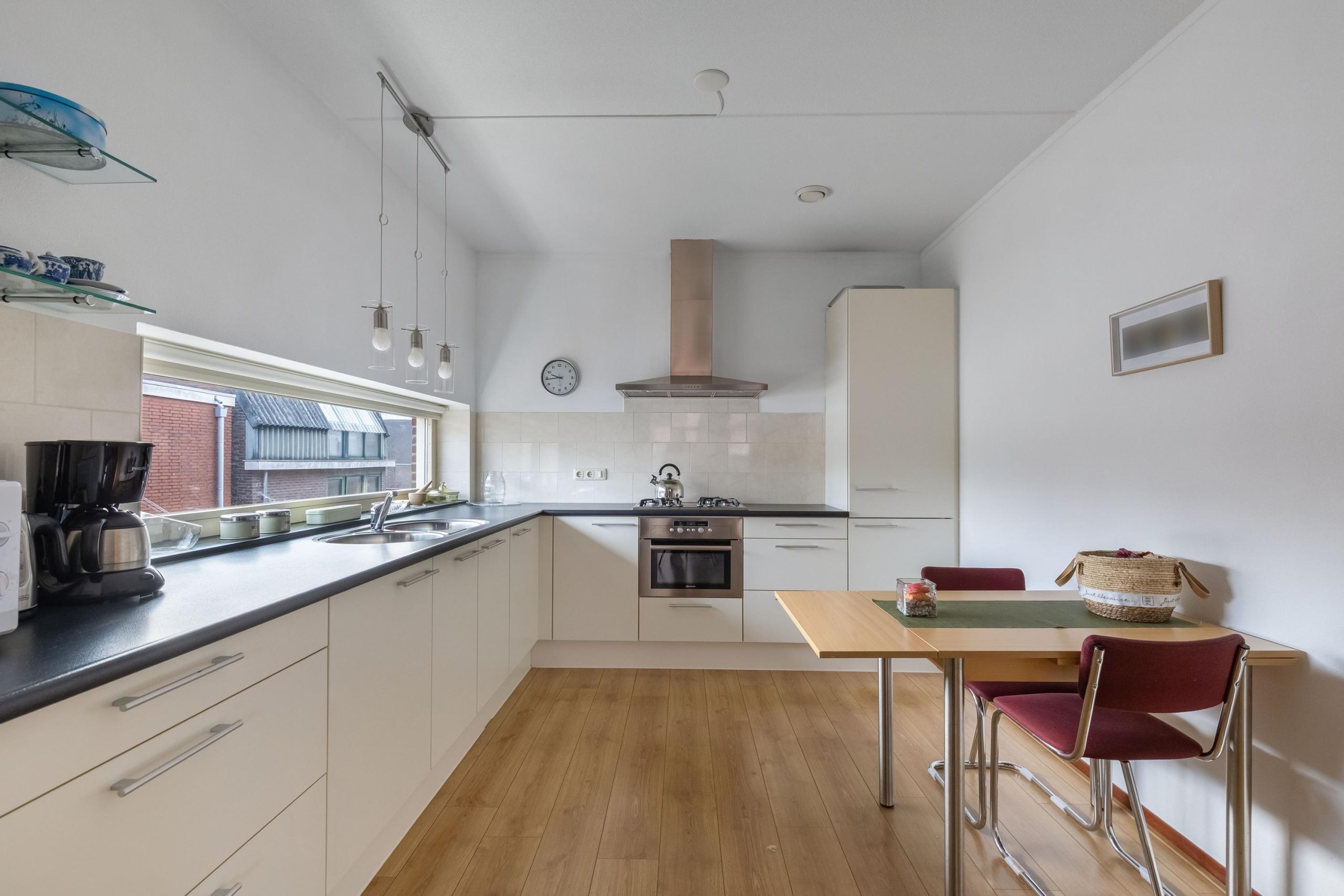 Door de moderne glazen deur loop je vanuit de hal de woonkamer binnen. Wat opvalt zijn de strak afgewerkte wanden, de grote raamvensters en de ruimte! De woonkamer van ruim 50m² is royaal en daardoor geheel naar eigen wens in te delen. De loggia (het overdekt balkon) van 8,5m² is zomers een heerlijke koele plek en door het beschutte karakter kunt u hier al snel buiten zitten. Licht en modern! Door het brede raamvenster in de zijgevel is er altijd daglicht in de keuken. De half open keuken in grote L-opstelling is voorzien van een brede gaskookplaat met schouw, koel-vriescombi, brede lades en carrouselkast, dubbele spoelbak en combi oven/magnetron. Er is eventueel ruimte voor een extra eethoek.