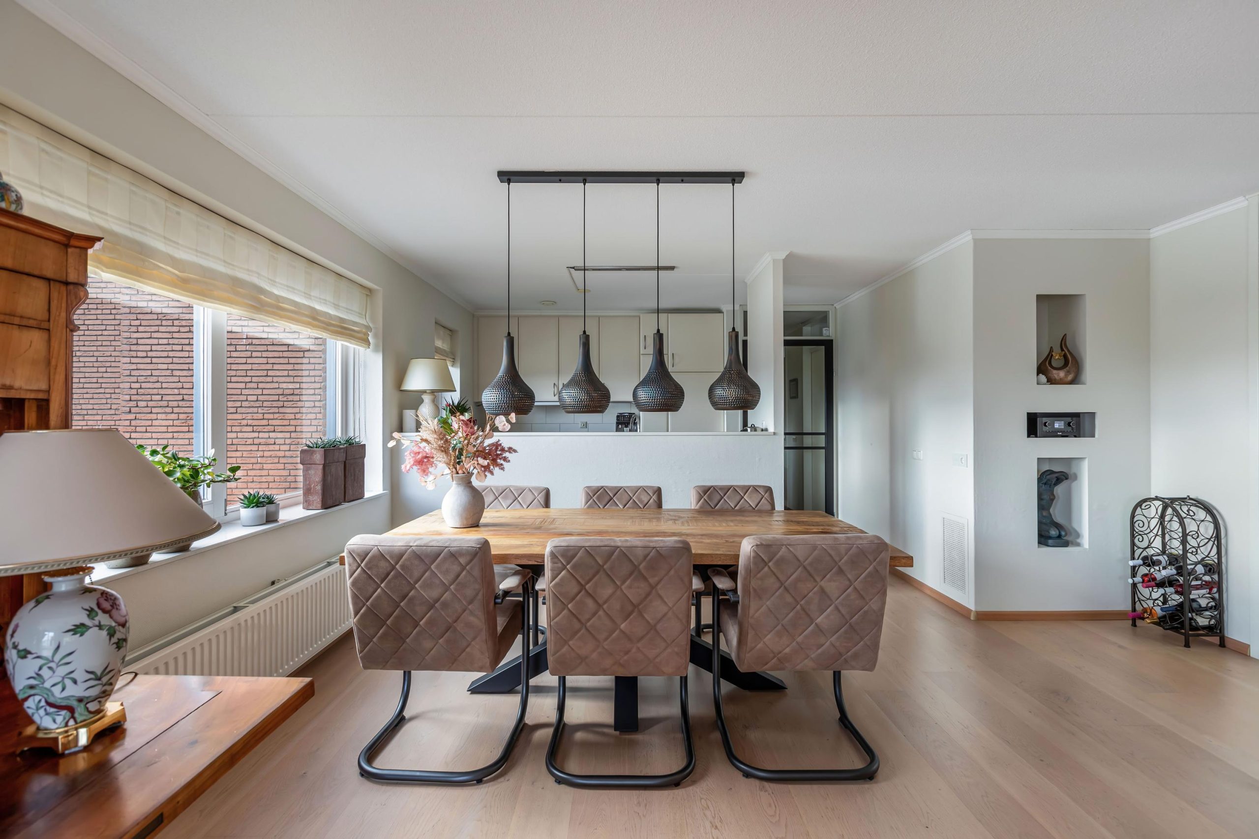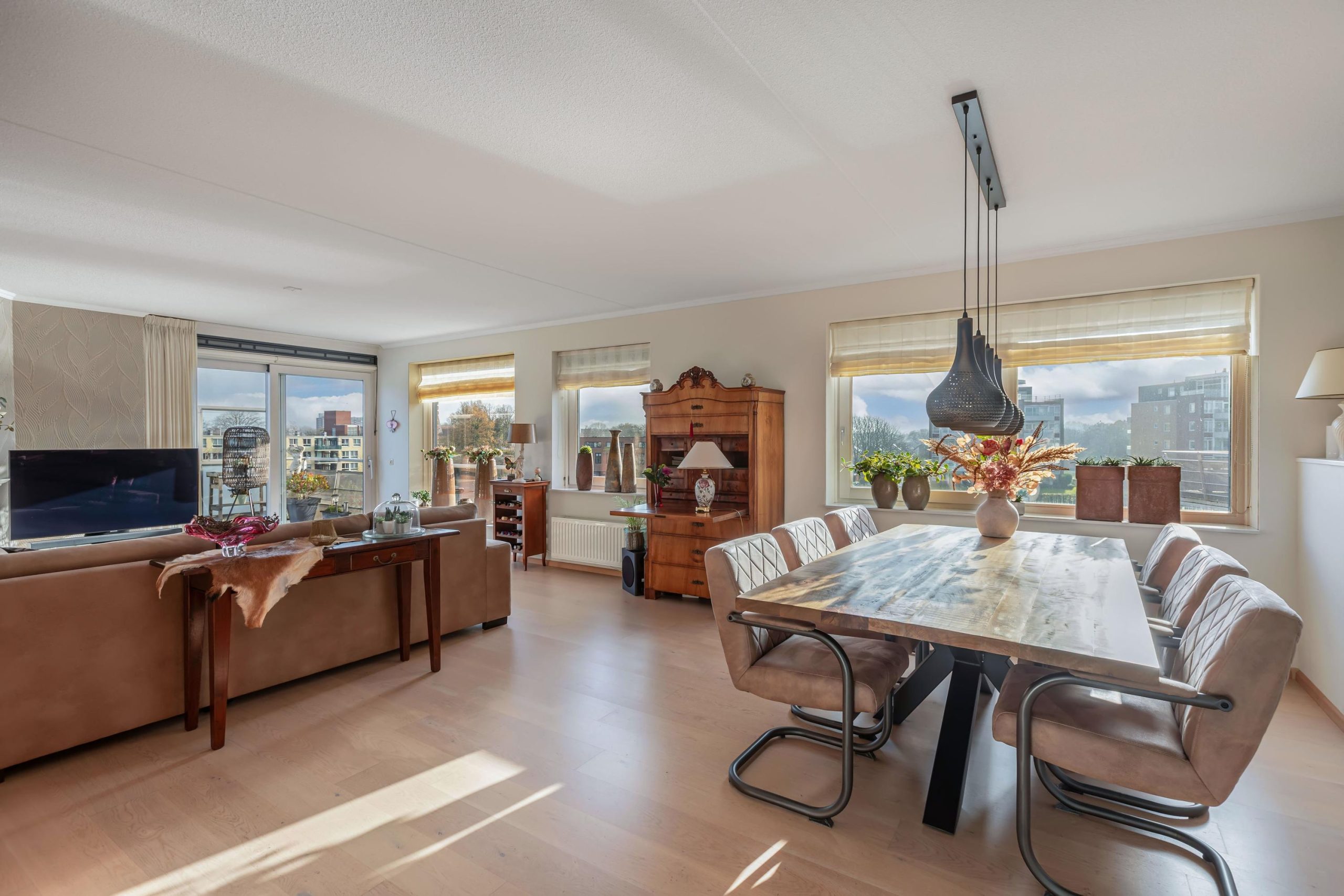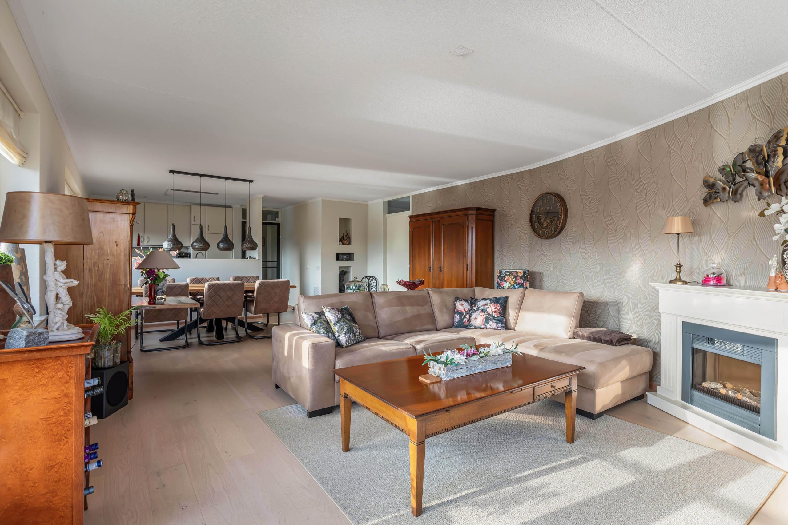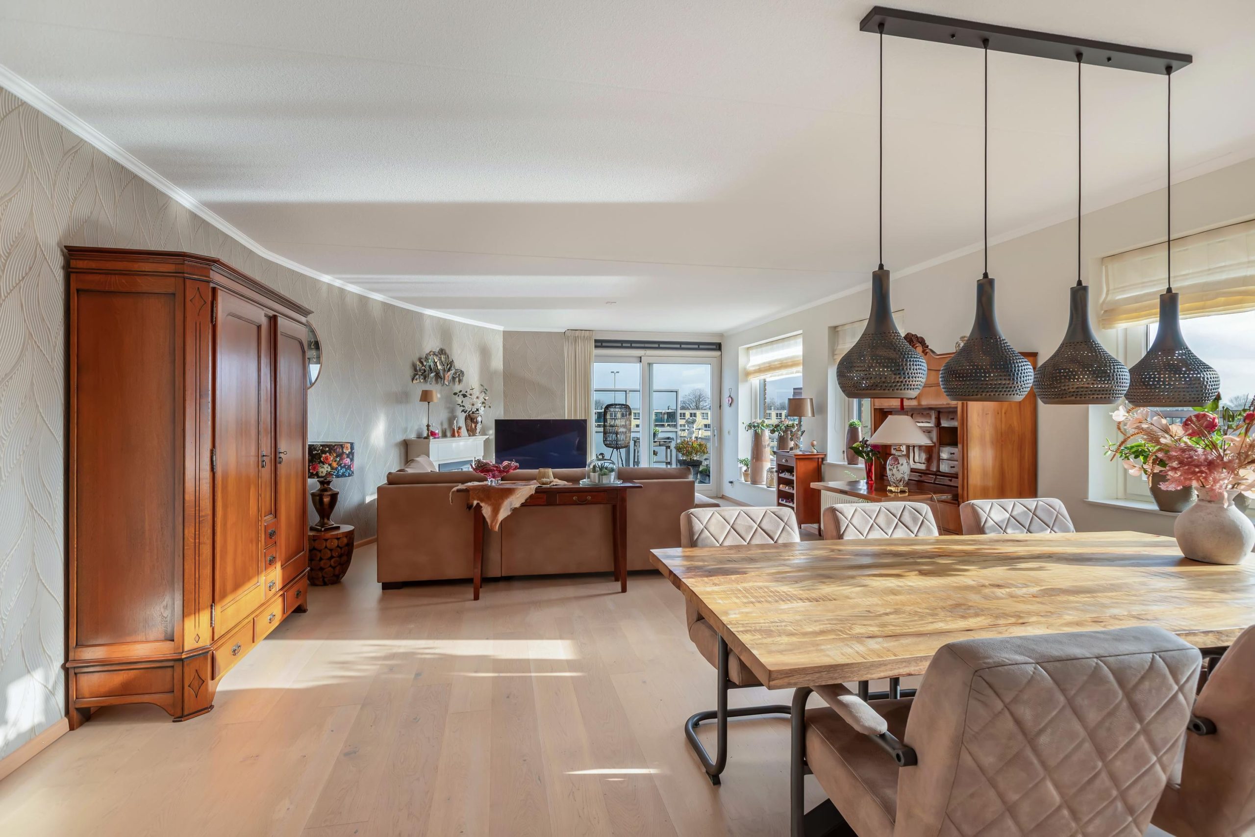 Wat direct opvalt in de woonkamer is de uitstekende lichtinval door de meerdere raamvensters. De woonkamer is verdeeld in een eetkamer en een zitkamer met ruimte voor een tv-hoek. Vanuit de hele woonkamer is er een mooi zicht op de vijverpartij en aan de zijgevel heeft de kamer een schuifpui naar het royale balkonterras. Een prachtige verlenging van de woonkamer. In de gehele leefruimte van het appartement is een moderne plankenvloer met eiken toplaag in naturel tint doorgelegd. Bereikbaar vanuit de woonkamer is een sideroom gerealiseerd. Zeer geschikt als hobby- of werkkamer of naar wens een derde slaapkamer.