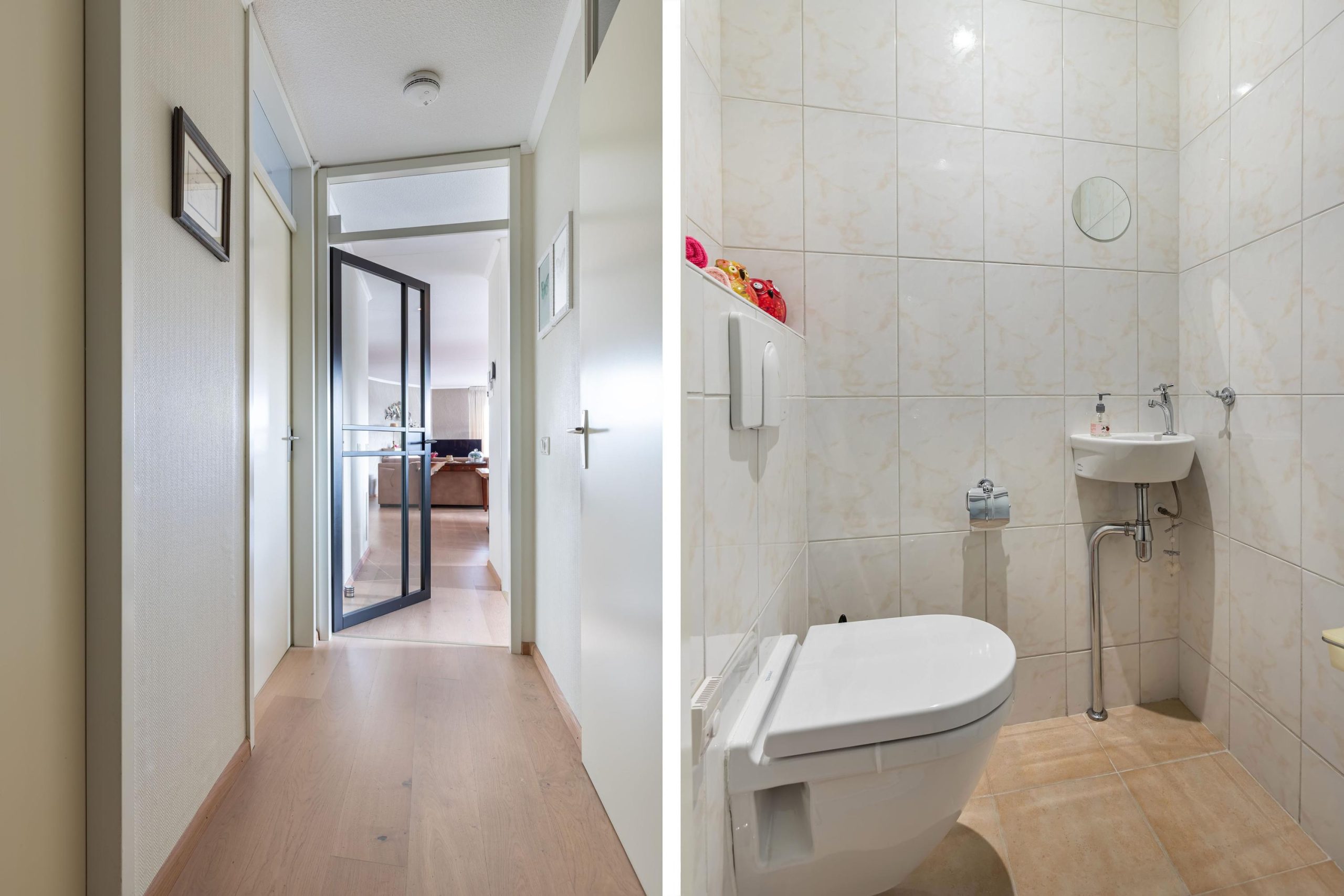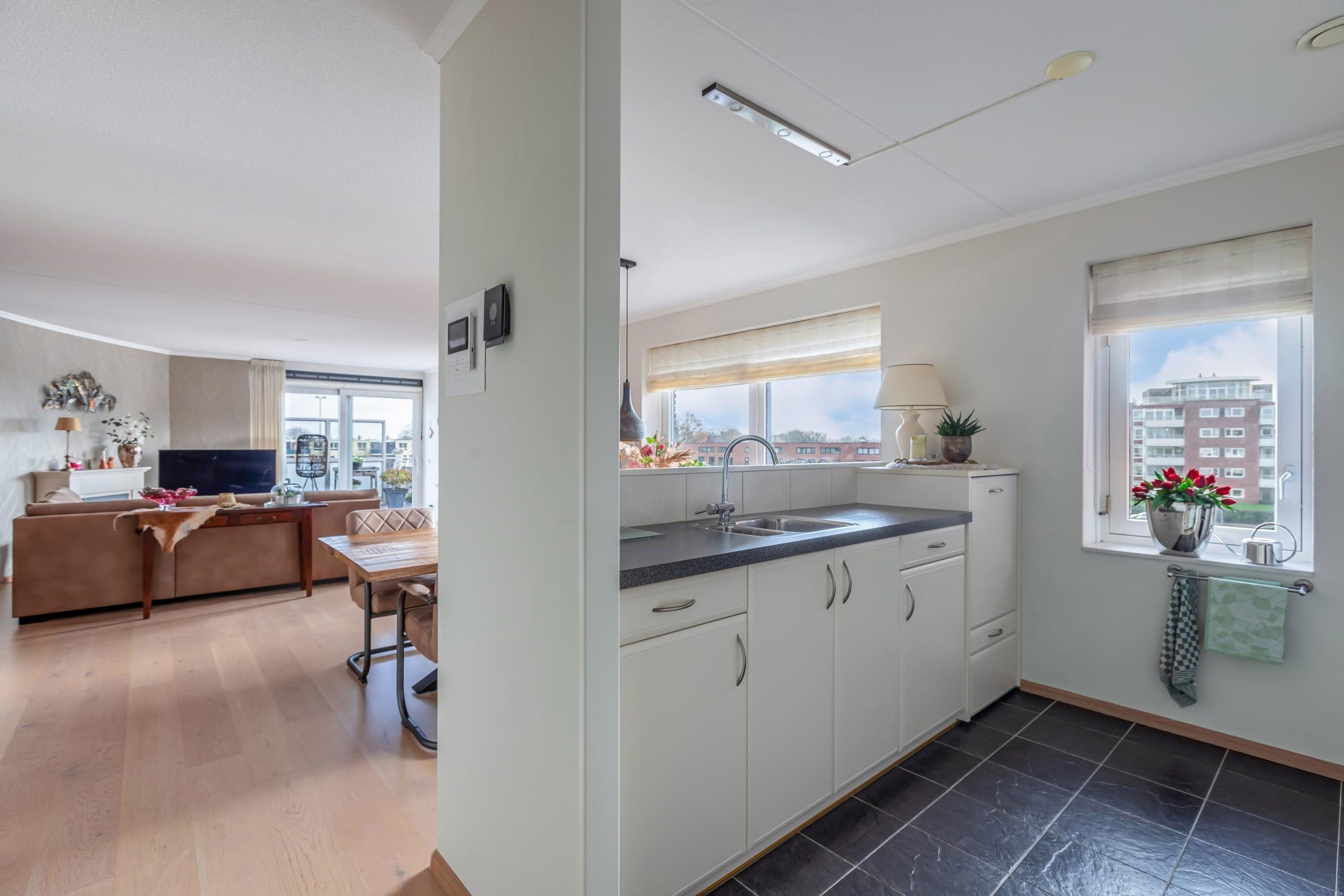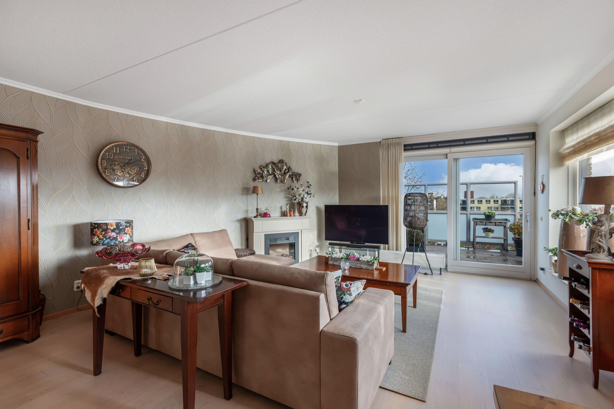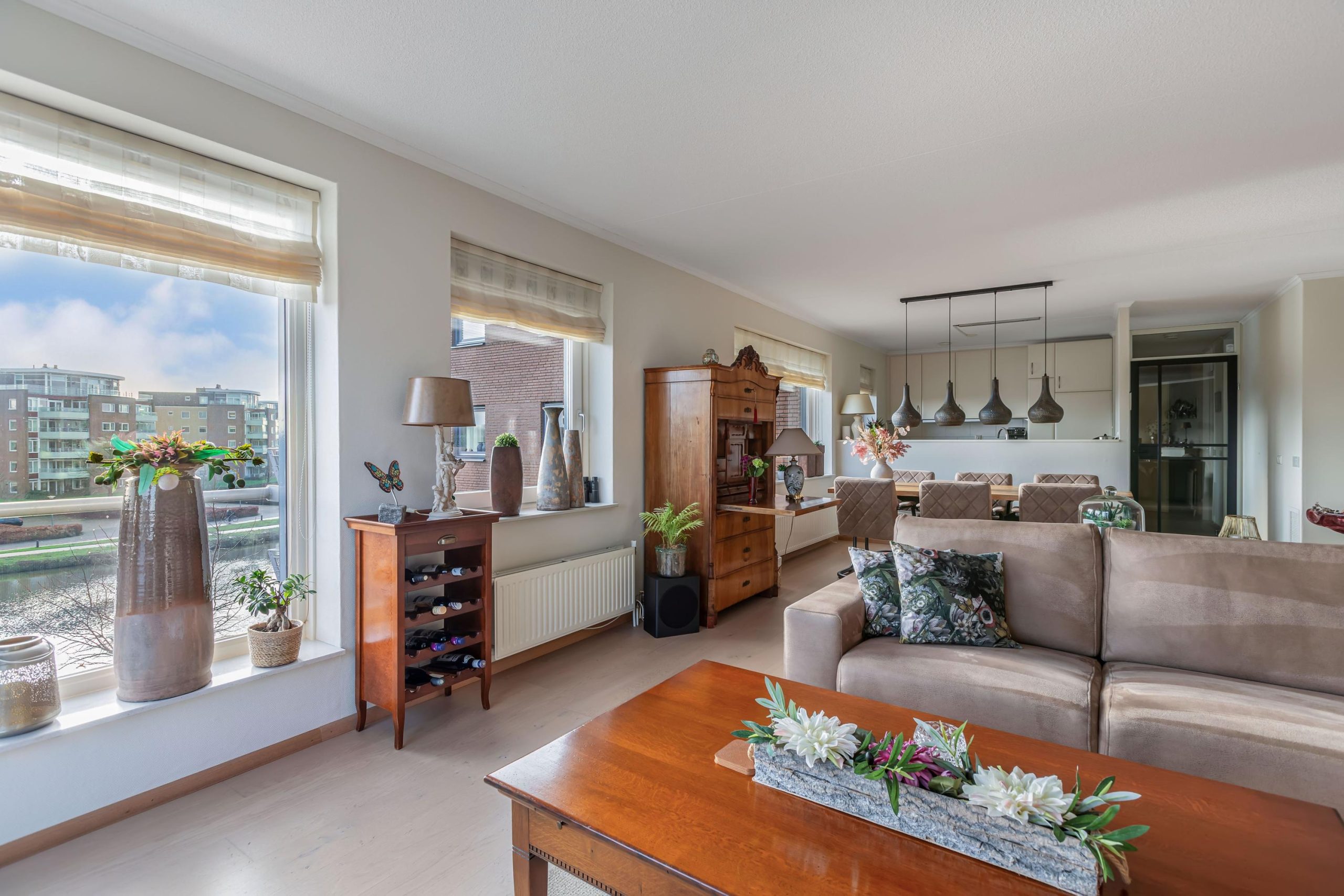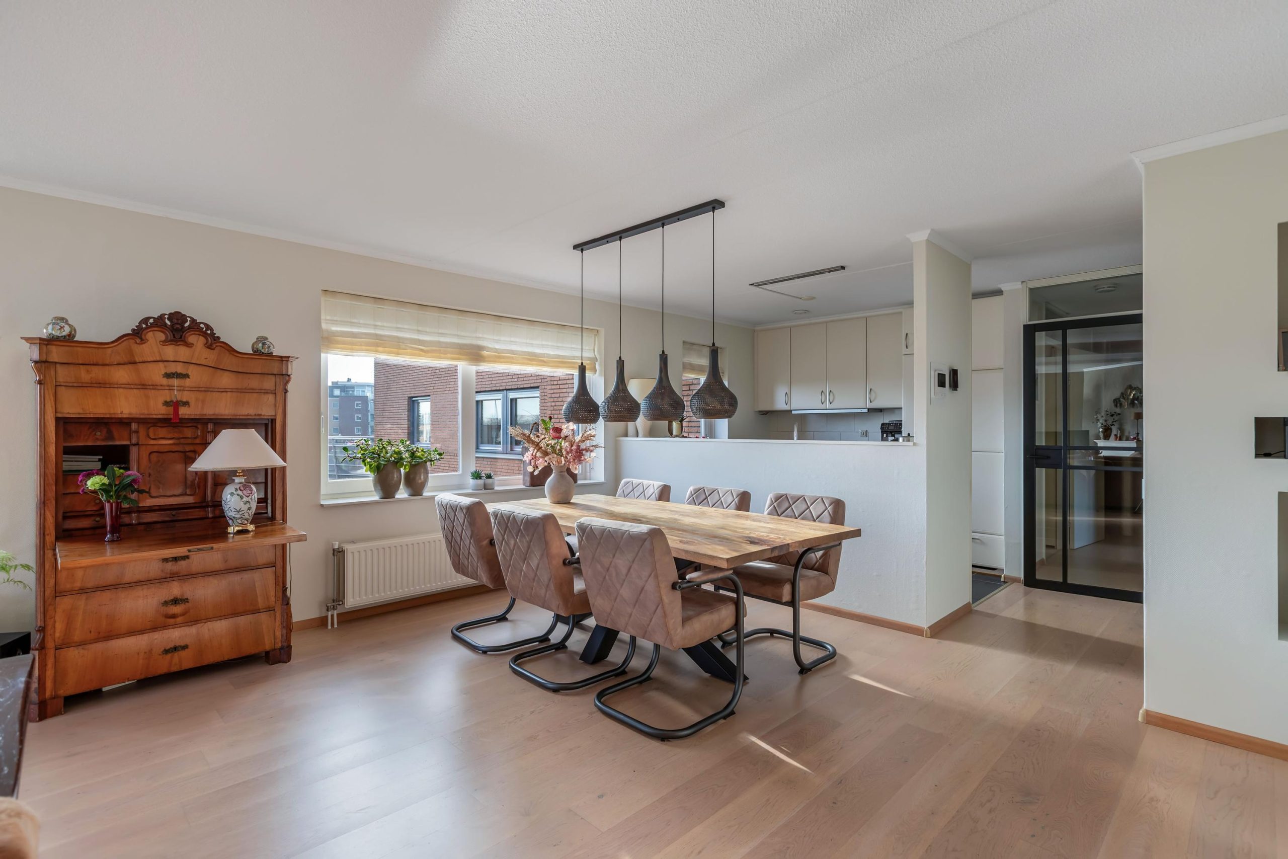 Wat direct opvalt in de woonkamer is de uitstekende lichtinval door de meerdere raamvensters. De woonkamer is verdeeld in een eetkamer en een zitkamer met ruimte voor een tv-hoek. Vanuit de hele woonkamer is er een mooi zicht op de vijverpartij en aan de zijgevel heeft de kamer een schuifpui naar het royale balkonterras. Een prachtige verlenging van de woonkamer. In de gehele leefruimte van het appartement is een moderne plankenvloer met eiken toplaag in naturel tint doorgelegd. Bereikbaar vanuit de woonkamer is een sideroom gerealiseerd. Zeer geschikt als hobby- of werkkamer of naar wens een derde slaapkamer.