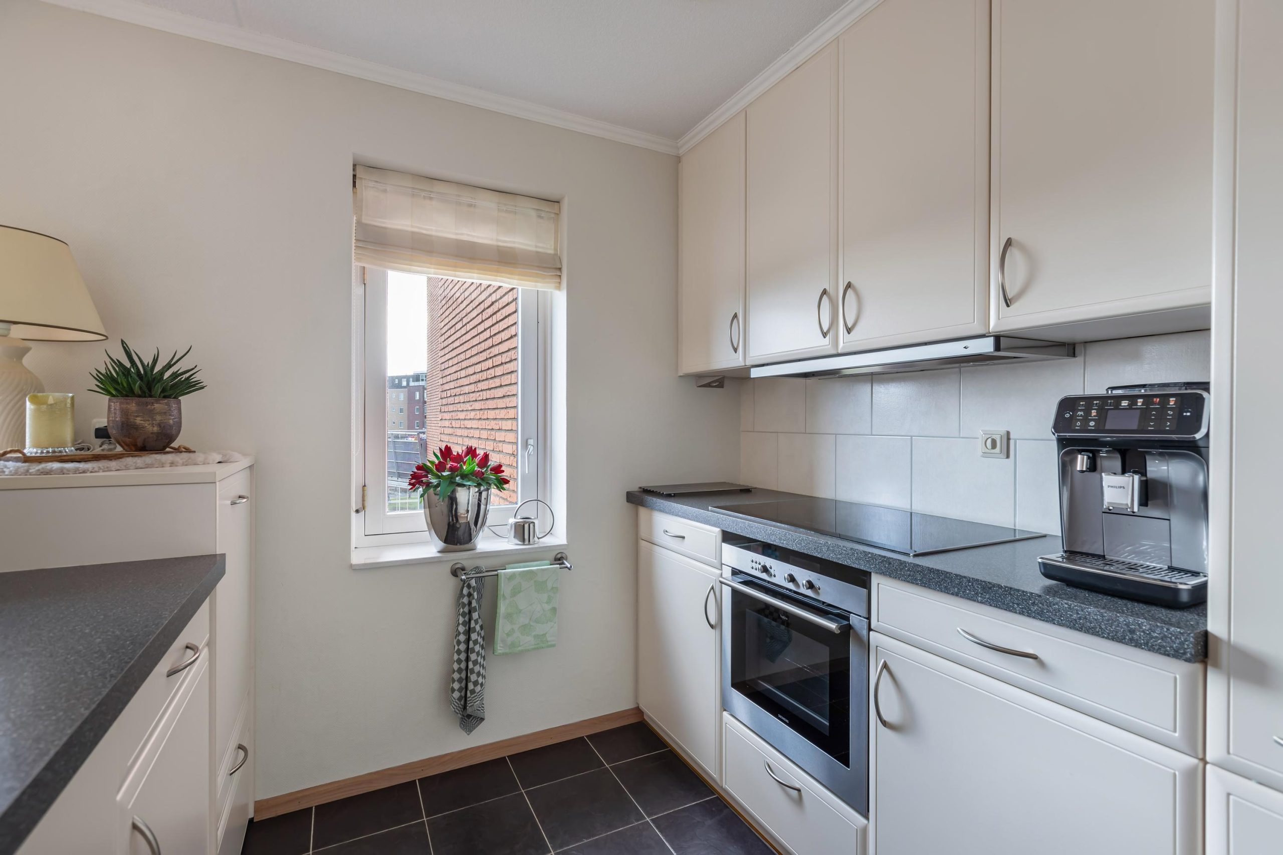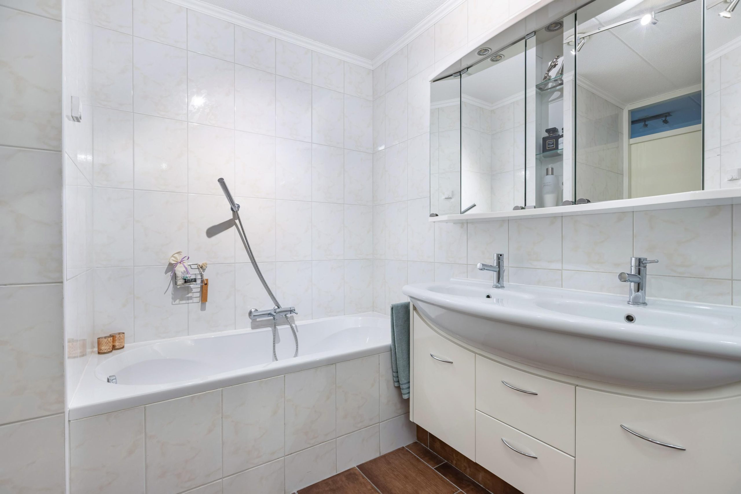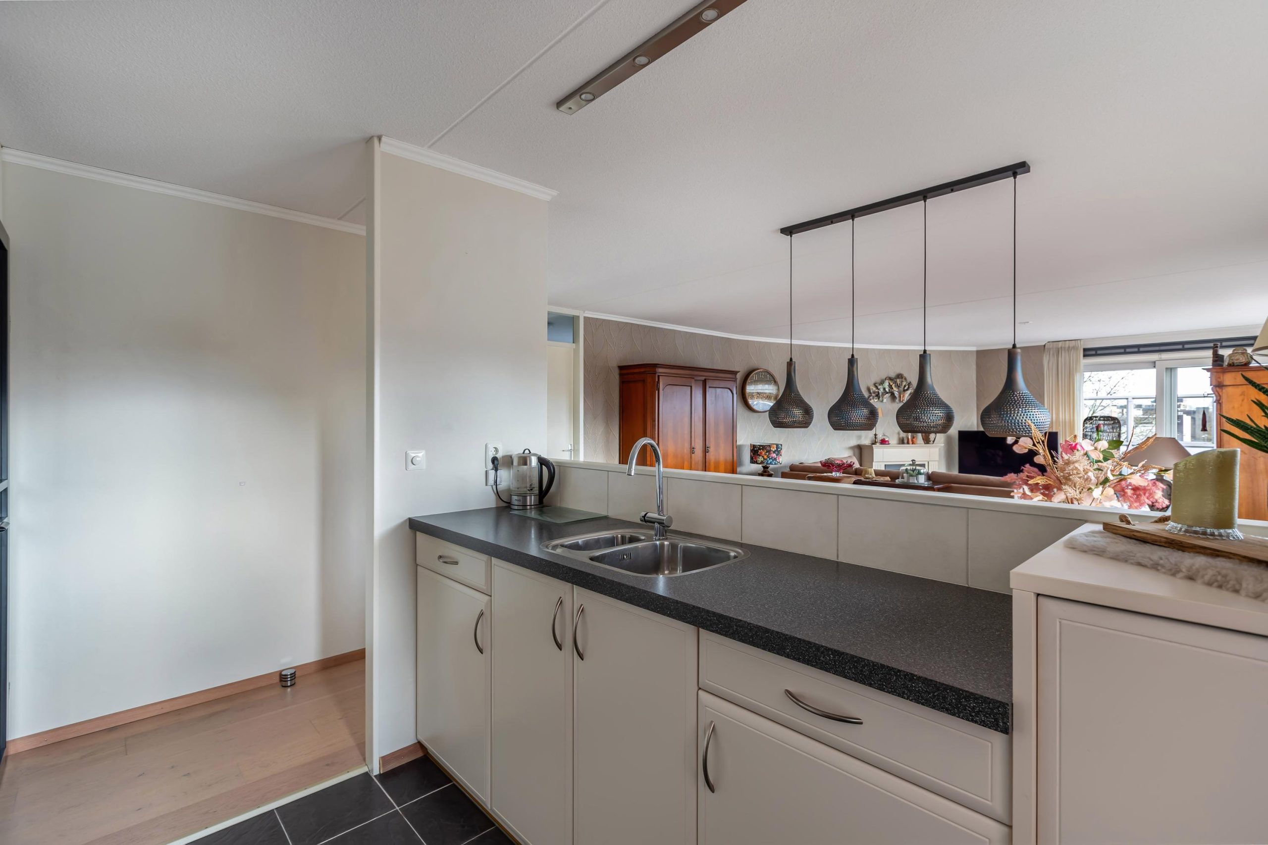 De open keuken heeft een moderne keukenopstelling met twee kunststof werkbladen op prettige werkhoogte, een inductiekookplaat en afzuigschouw, een oven, een koelkast met vriesvak en een vaatwasser op hoogte. Uiteraard biedt de opstelling ook veel berging met de soft-close lades, de bovenkastjes en de apothekerskast. Door het open karakter van de keuken is ook hier veel daglicht en bent u verbonden met de woonkamer.