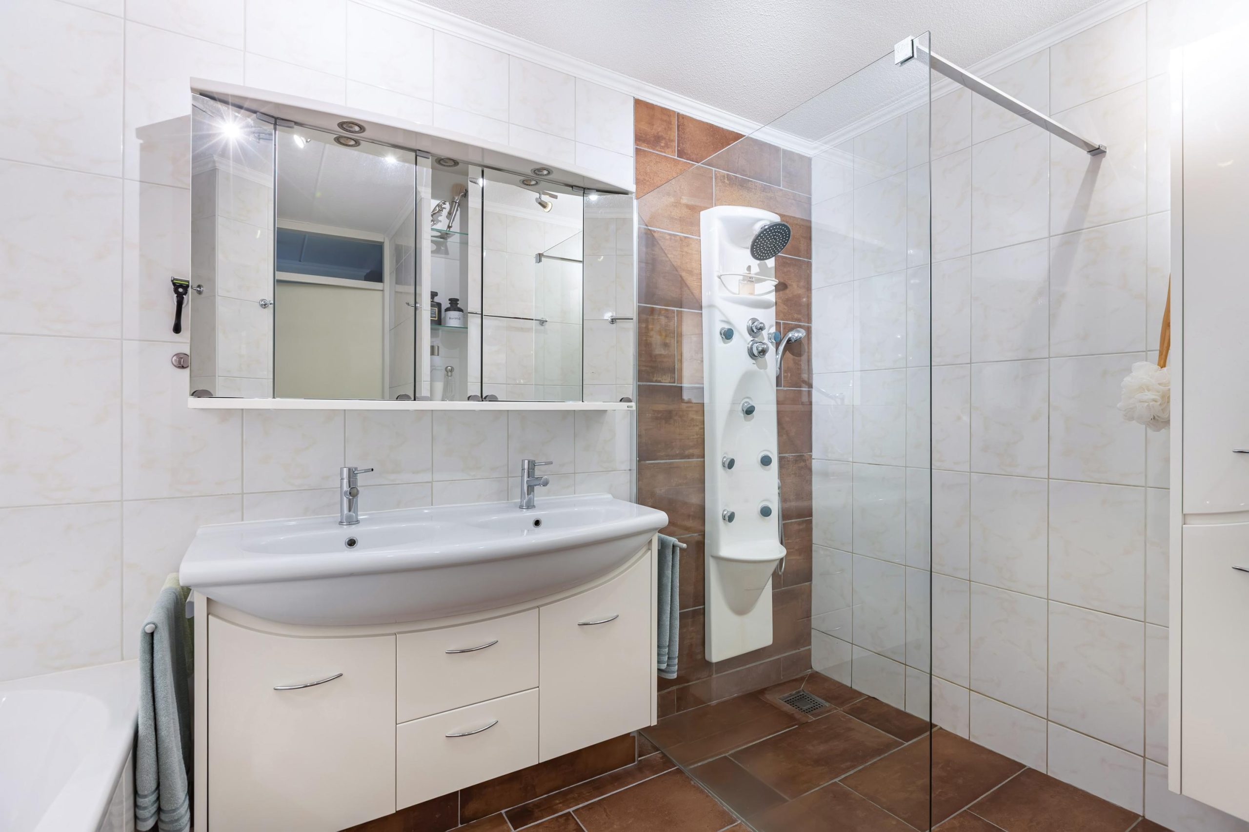 - een luxe badkamer met tegelwerk in aardetinten, voorzien van een brede inloopdouche met bodyshower, hand- en regendouche, een wastafelmeubel met dubbele wastafel, een handdoekradiator en een ligbad. Tevens voorzien van elektrische vloerverwarming.