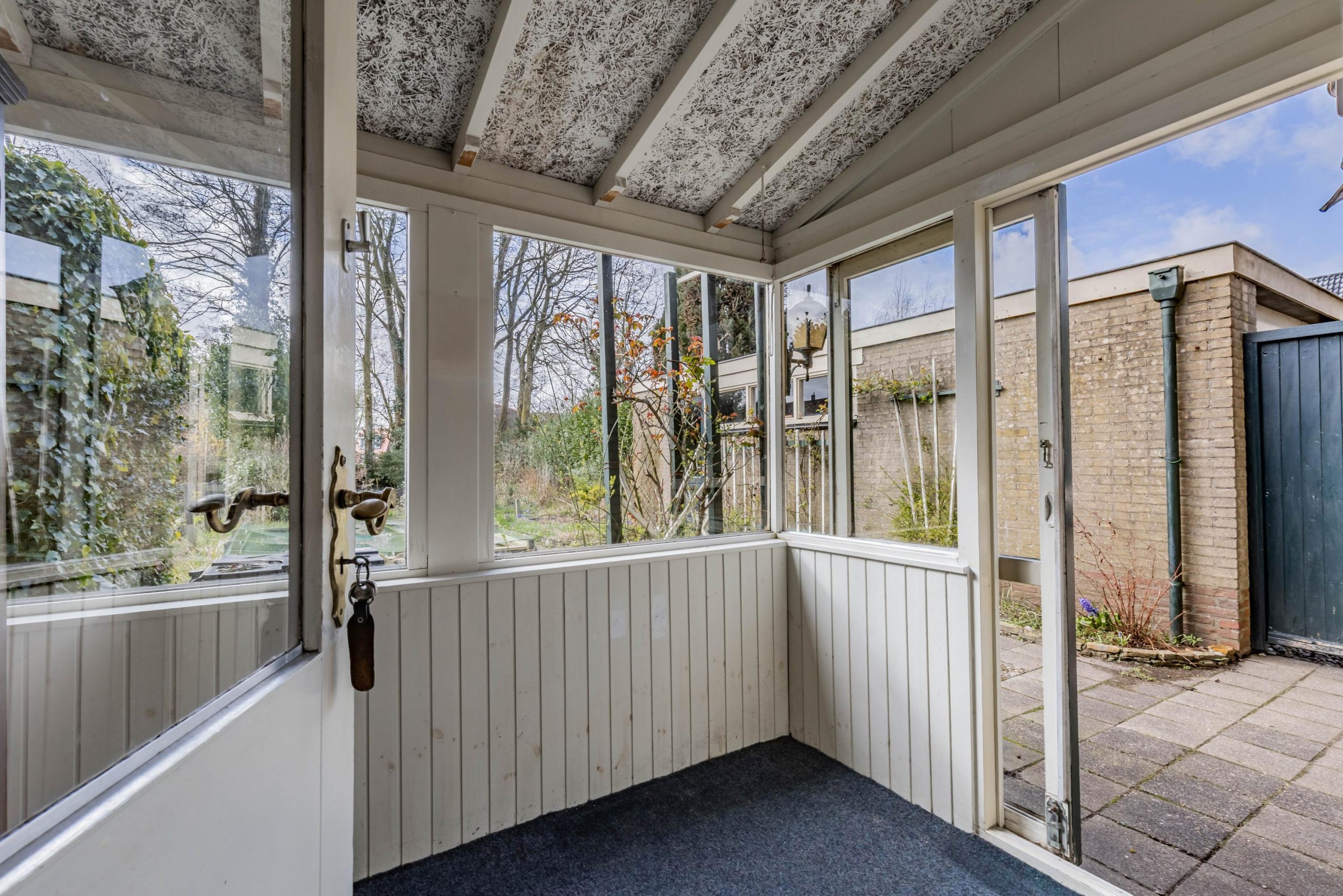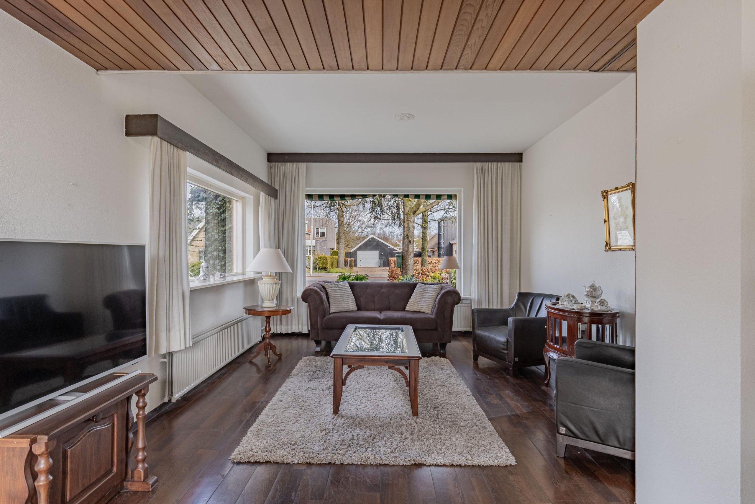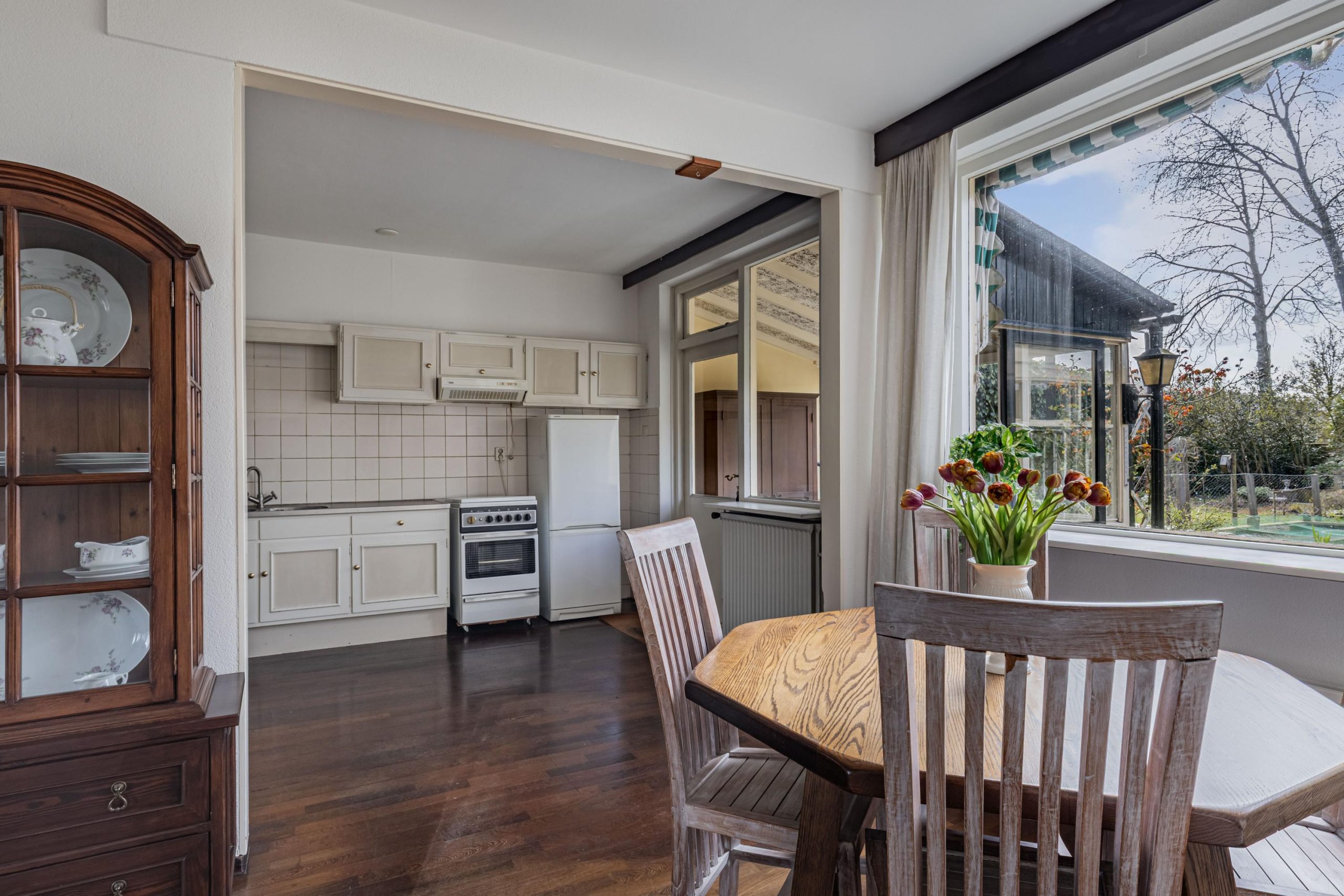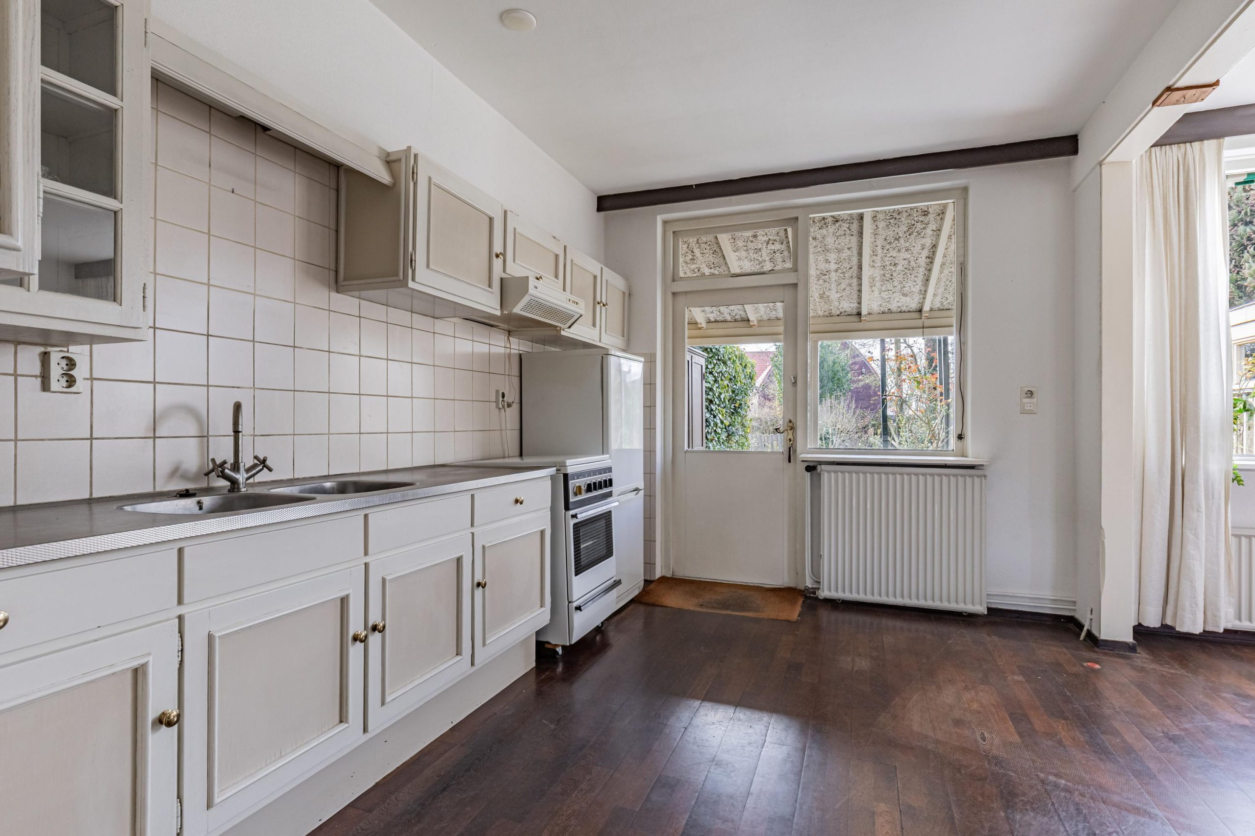 Via de hal kom je in de open keuken. De opstelling is eenvoudig met kastruimte en aanrecht. In de keuken is een witgoedaansluiting aanwezig. De keuken is verbonden met de woonkamer. Wat opvalt is de lichtinval in huis. Het zonlicht valt goed naar binnen door de raamvensters in de voor-, zij- en achtergevel. Je hebt veel privacy omdat je geen inkijk hebt van andere woningen aan de voor- en achterzijde. Voor in de kamer is de plek voor een TV/zithoek. Er ligt een lamel parketvloer. Achter in de kamer geniet je van de rust door het zicht op je diepe tuin met veel privacy en geen inkijk van achterburen. Een schuifpui of tuindeuren zou goed passen maar ook een uitbouw aan de achterzijde is goed te realiseren door de diepte van de achtertuin. Vanuit de keuken is een achterportaal bereikbaar.