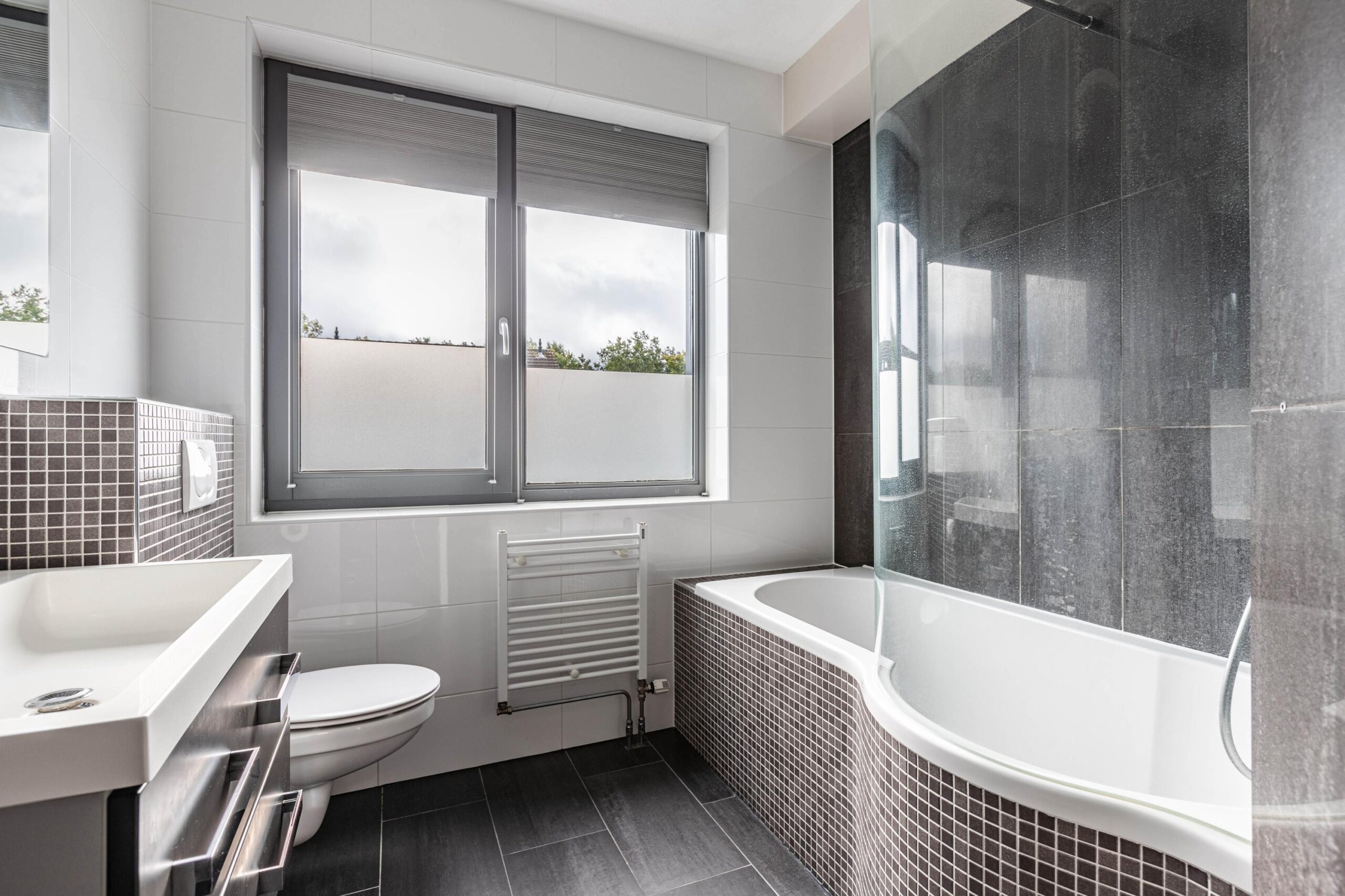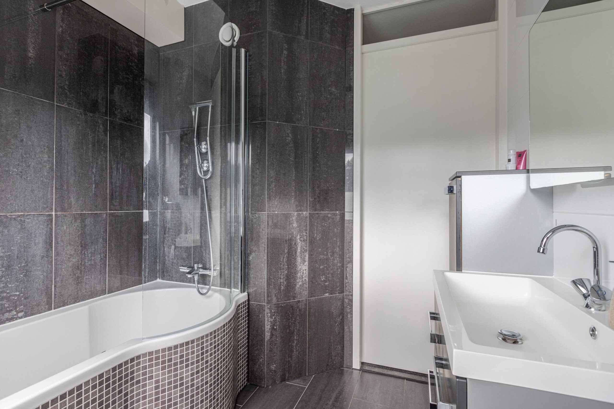 - moderne badkamer met ligbad met douche, wastafelmeubel, handdoekradiator en tweede wandcloset