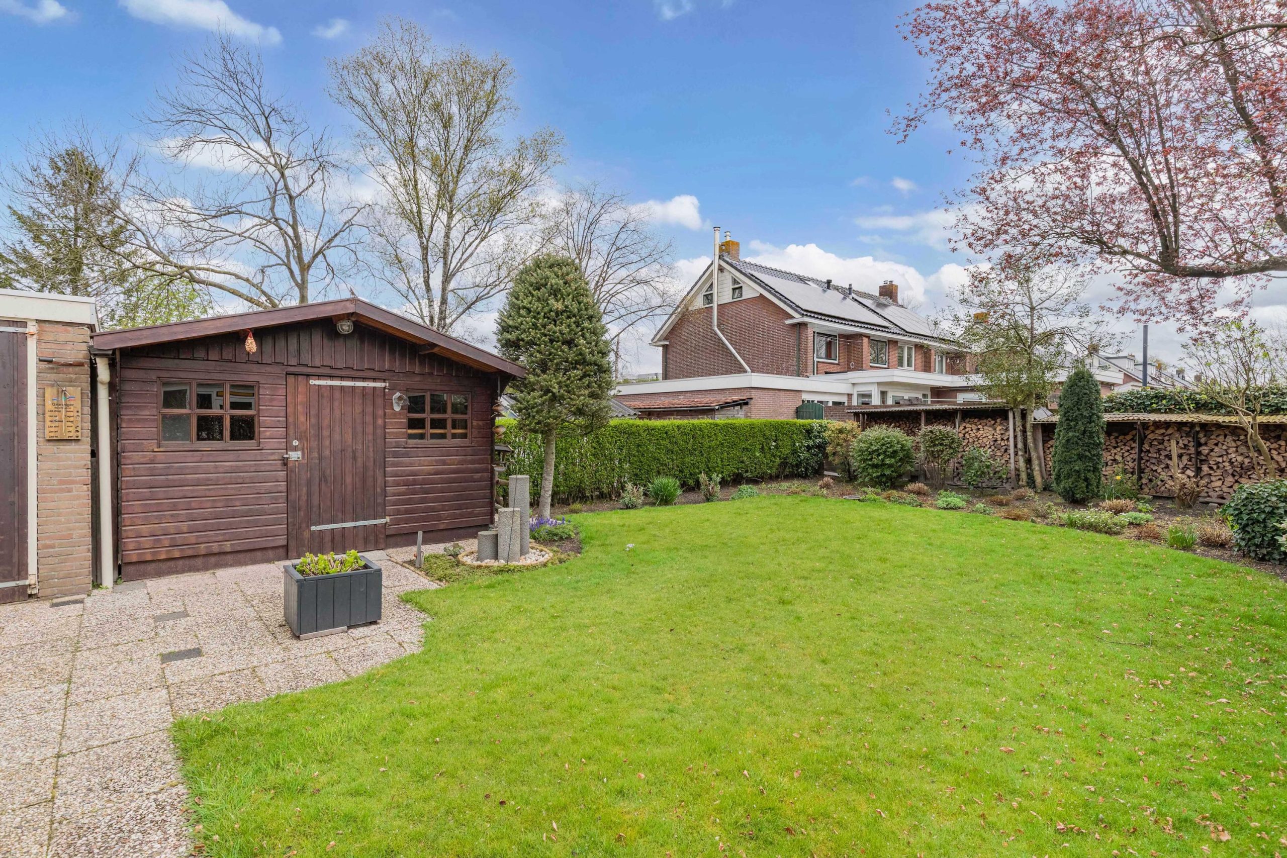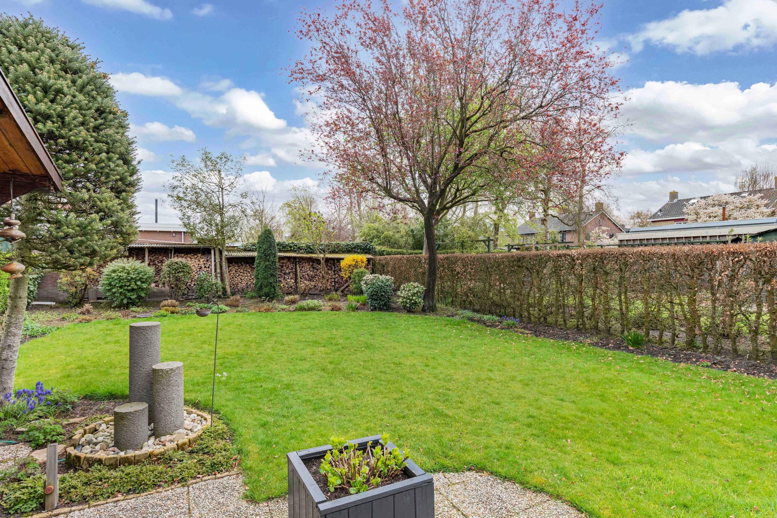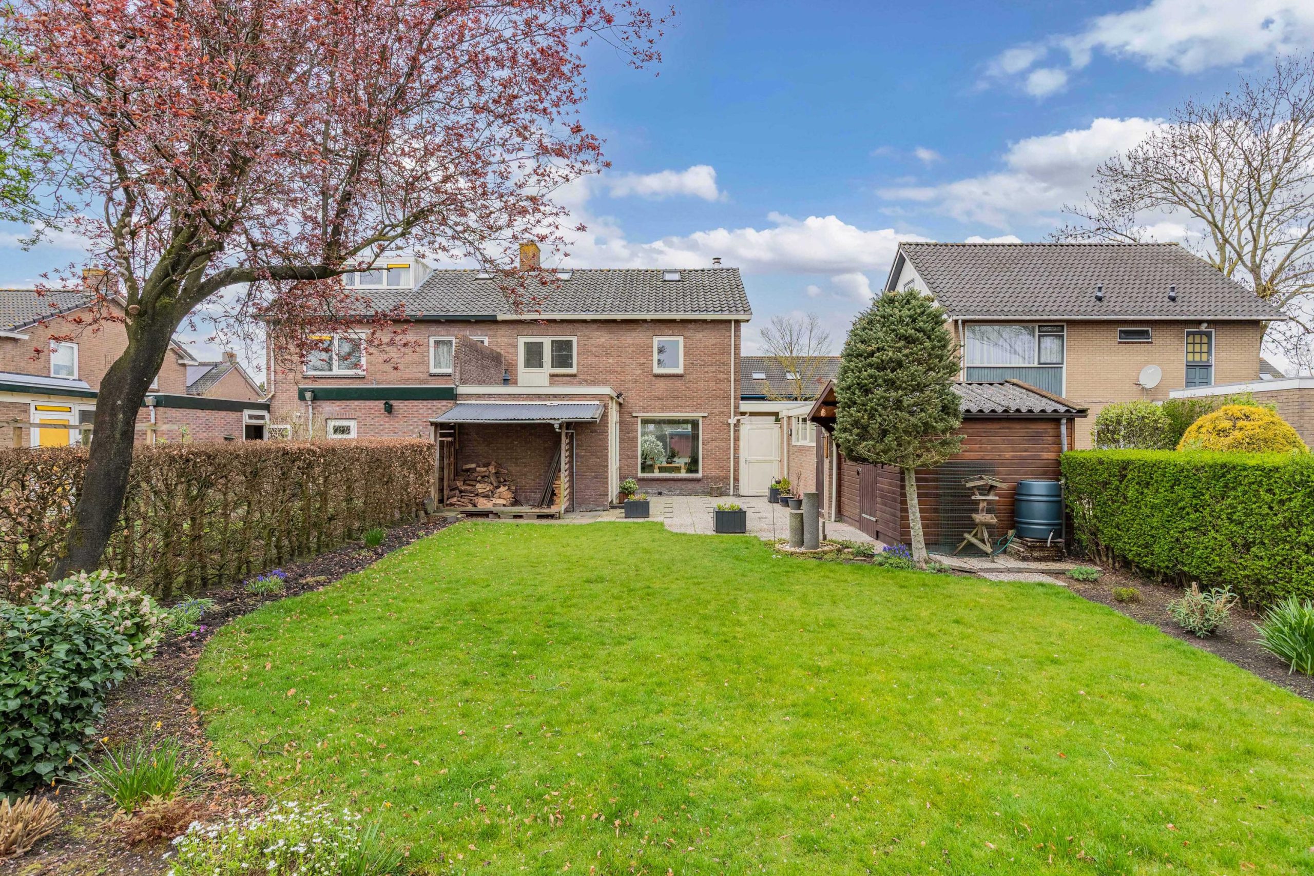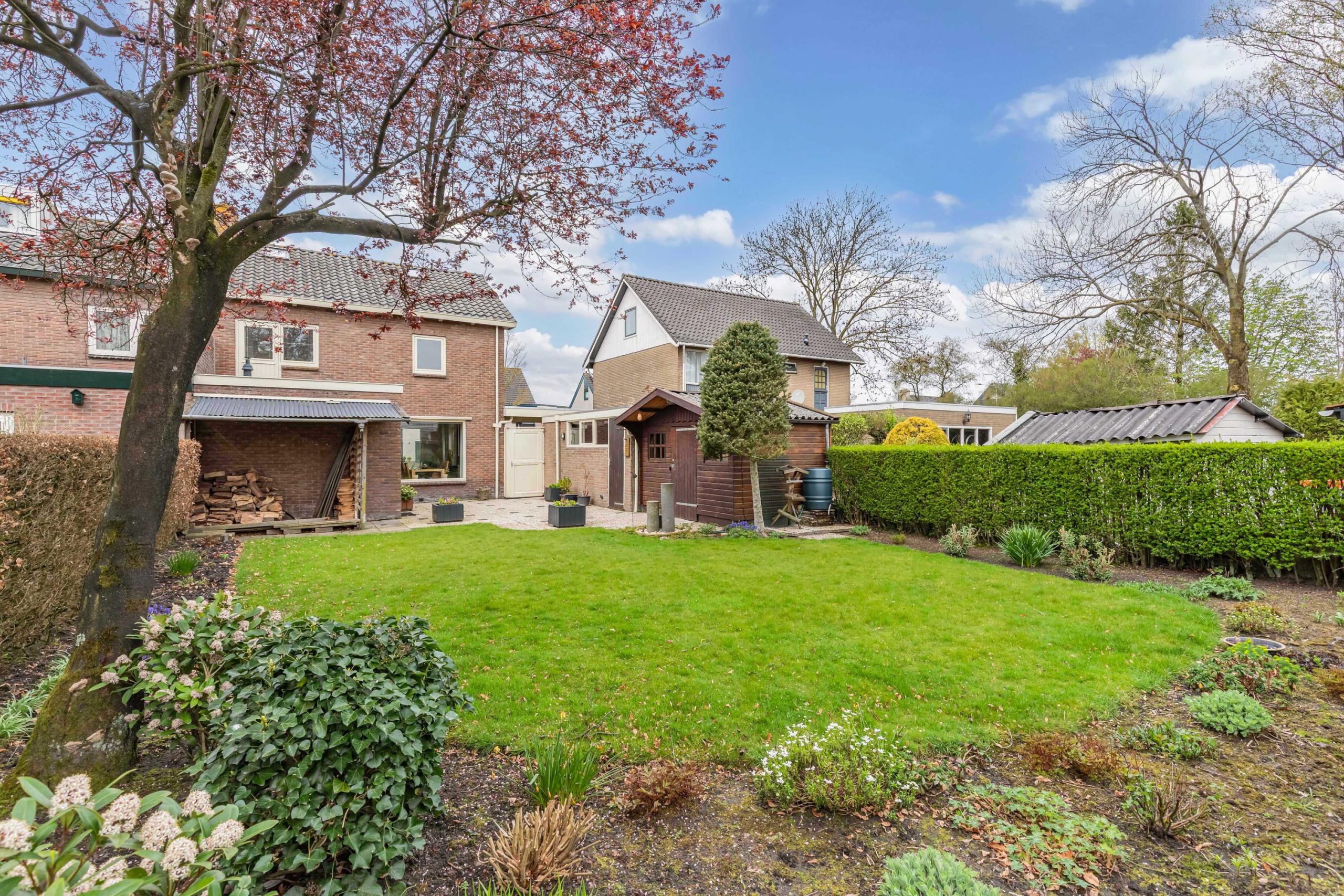 Heerlijk genieten van groen en heel veel privacy! De achtertuin is verzorgd aangelegd met gazon, groene borders en een terras. De diepe tuin ligt op het oosten en door deze diepte kun je tot laat in de zomerse avond genieten van de zon. Ook kun je door de ligging een schaduwplek vinden in de middag. Achter in de tuin is een vrijstaande houten berging voor fietsen of tuinspullen en er is een houtopslag voor de houtkachel. Verder beschik je over een vrijstaande garage voor je auto of fietsen en is er een hoge en brede carport voor de garage, ook geschikt voor een caravan. Er is een achterom langs de woning over de oprit waar twee auto's kunnen staan.