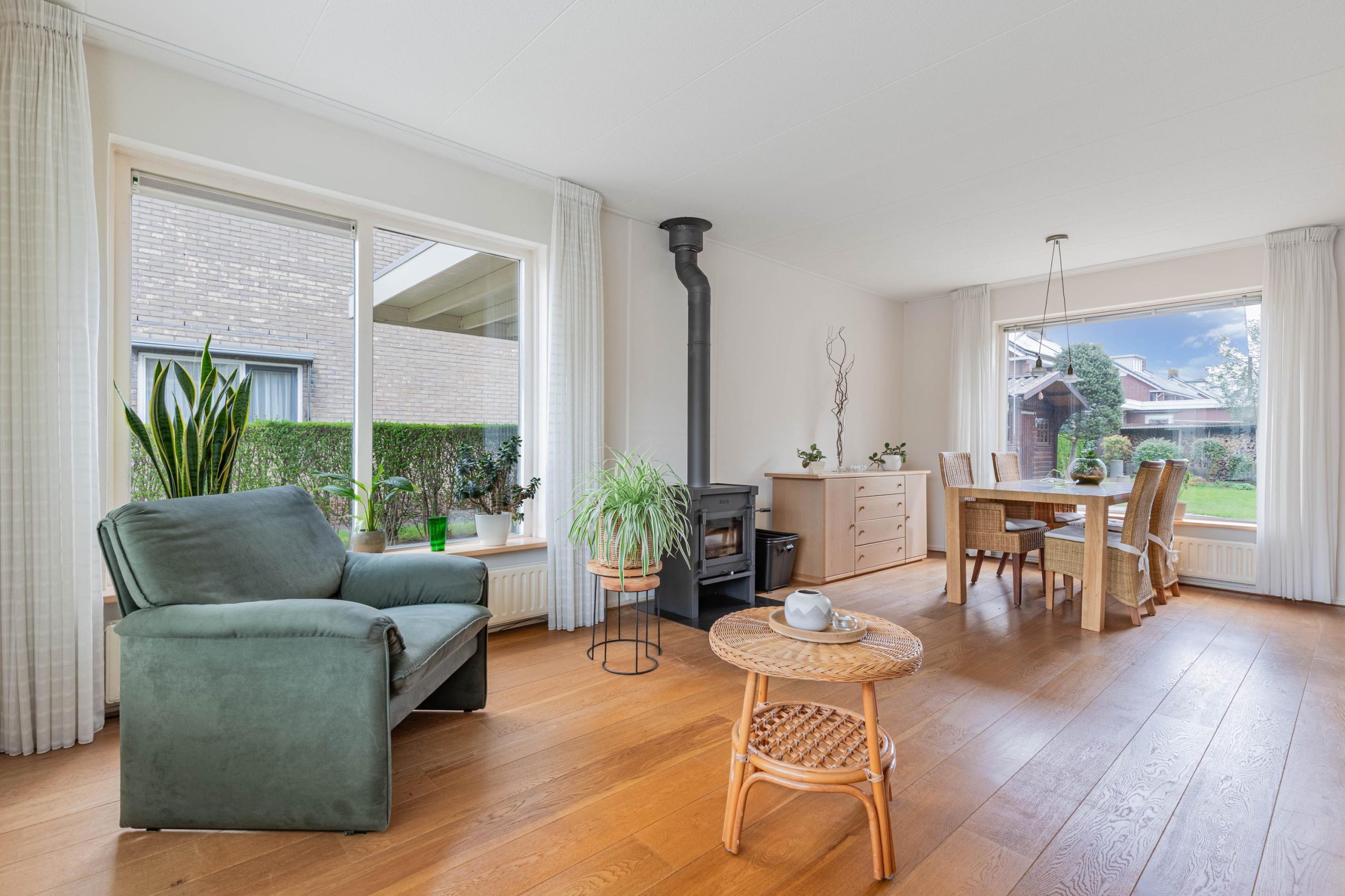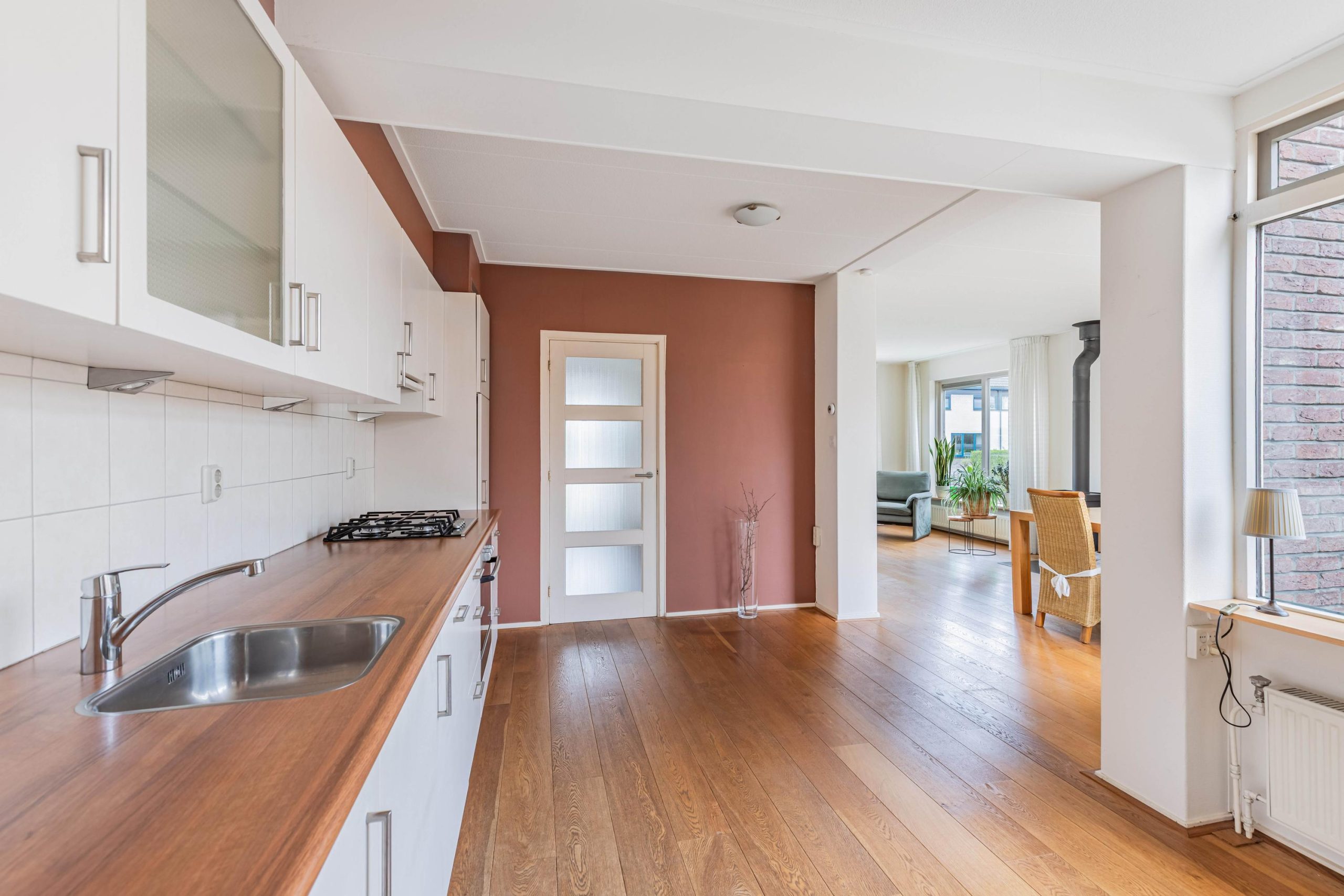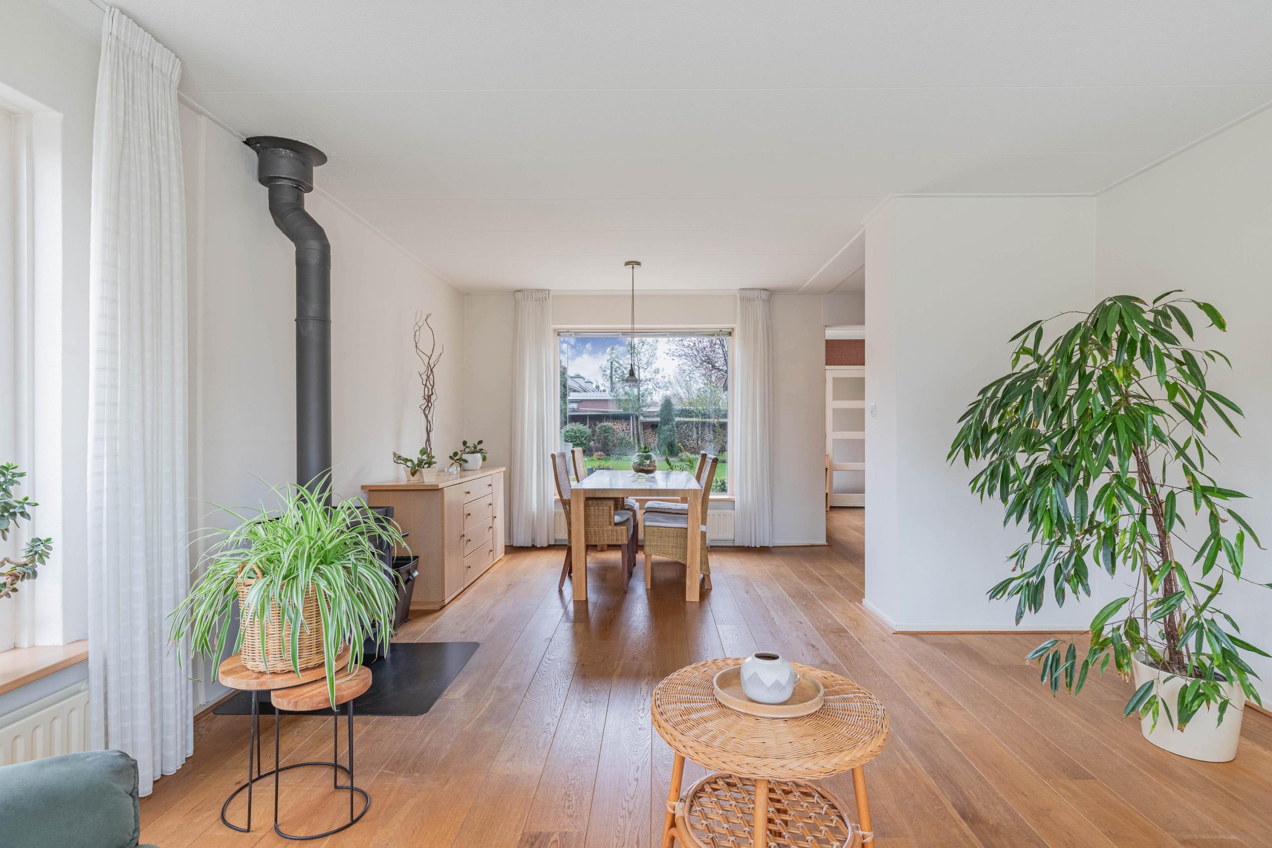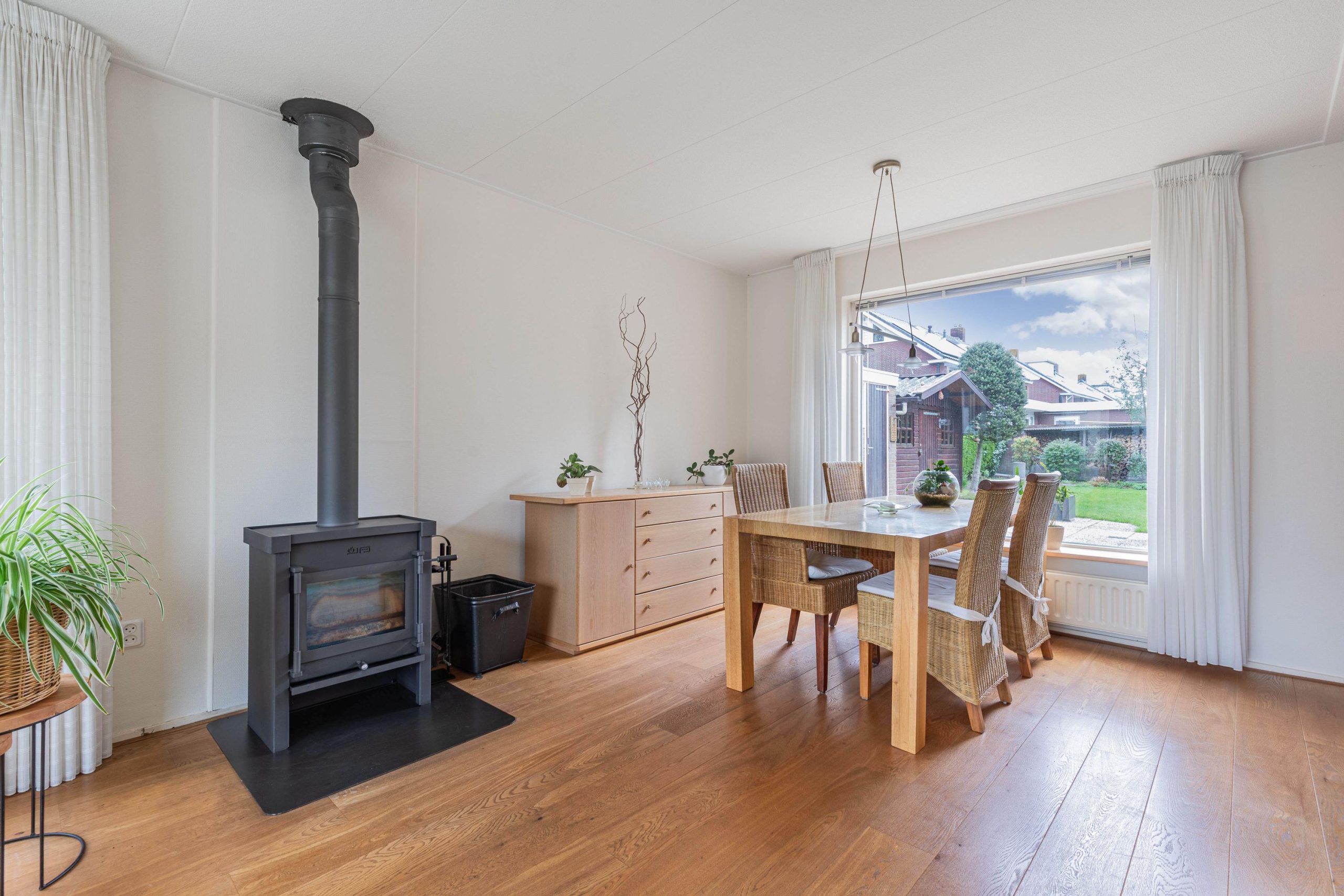 Je loopt over een fraaie plankenvloer met toplaag van eikenhout de woonkamer binnen. Wat opvalt is het licht dat valt in de woonkamer door de raamvensters in de voor- en zijgevel. Voor in de kamer is ruimte voor een TV/zithoek en achter is plek voor een grote gezinstafel. De houtkachel geeft op koude dagen comfortabele warmte en sfeer in de kamer en je hebt veel privacy door de diepe achtertuin. De open keuken geeft het gevoel van ruimte. De keukenopstelling is voorzien van een gaskookplaat en afzuigschouw, een close-in boiler, een oven, een vaatwasser, een koelkast en vriezer met veel lades. Met het vele daglicht is het hier plezierig koken.