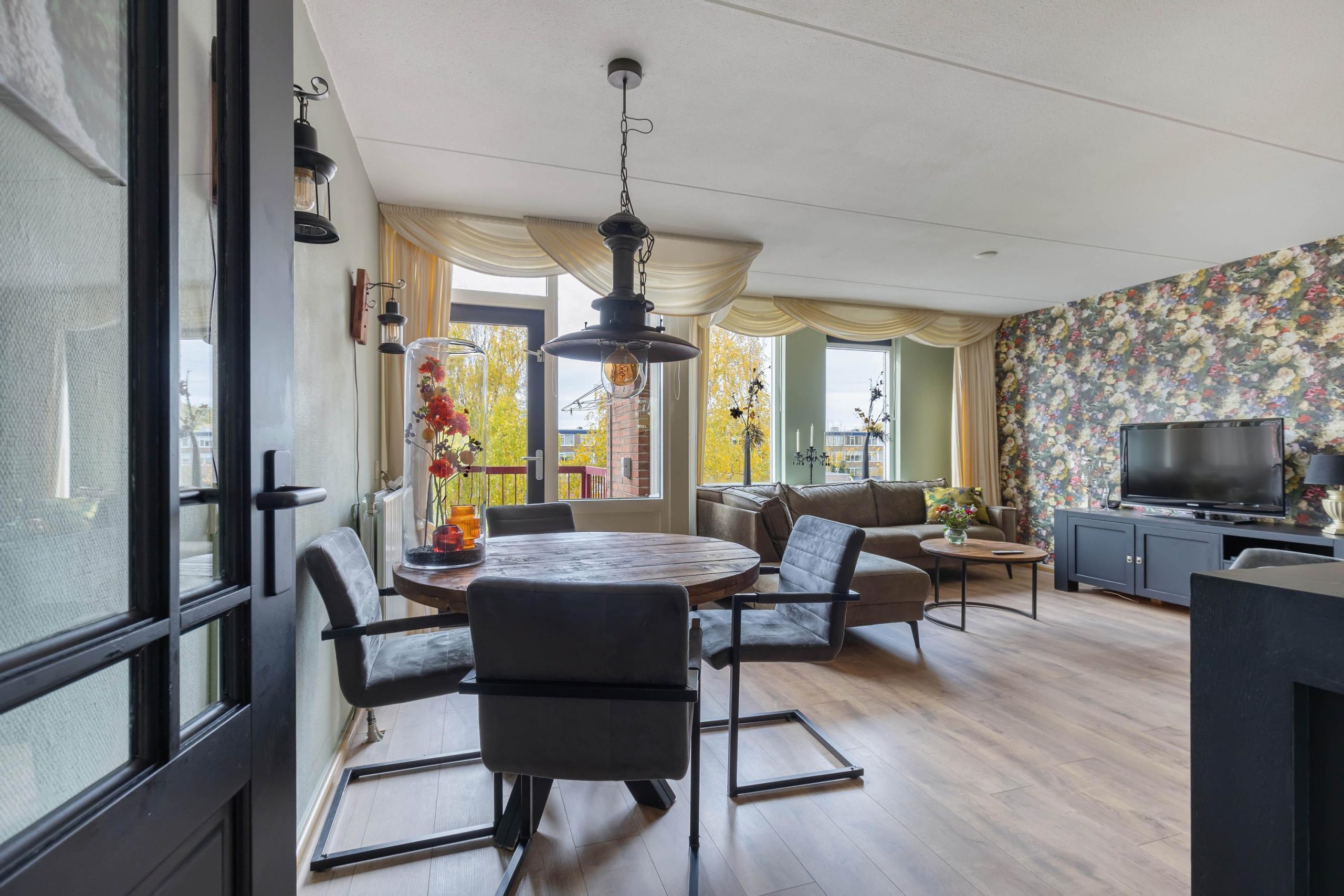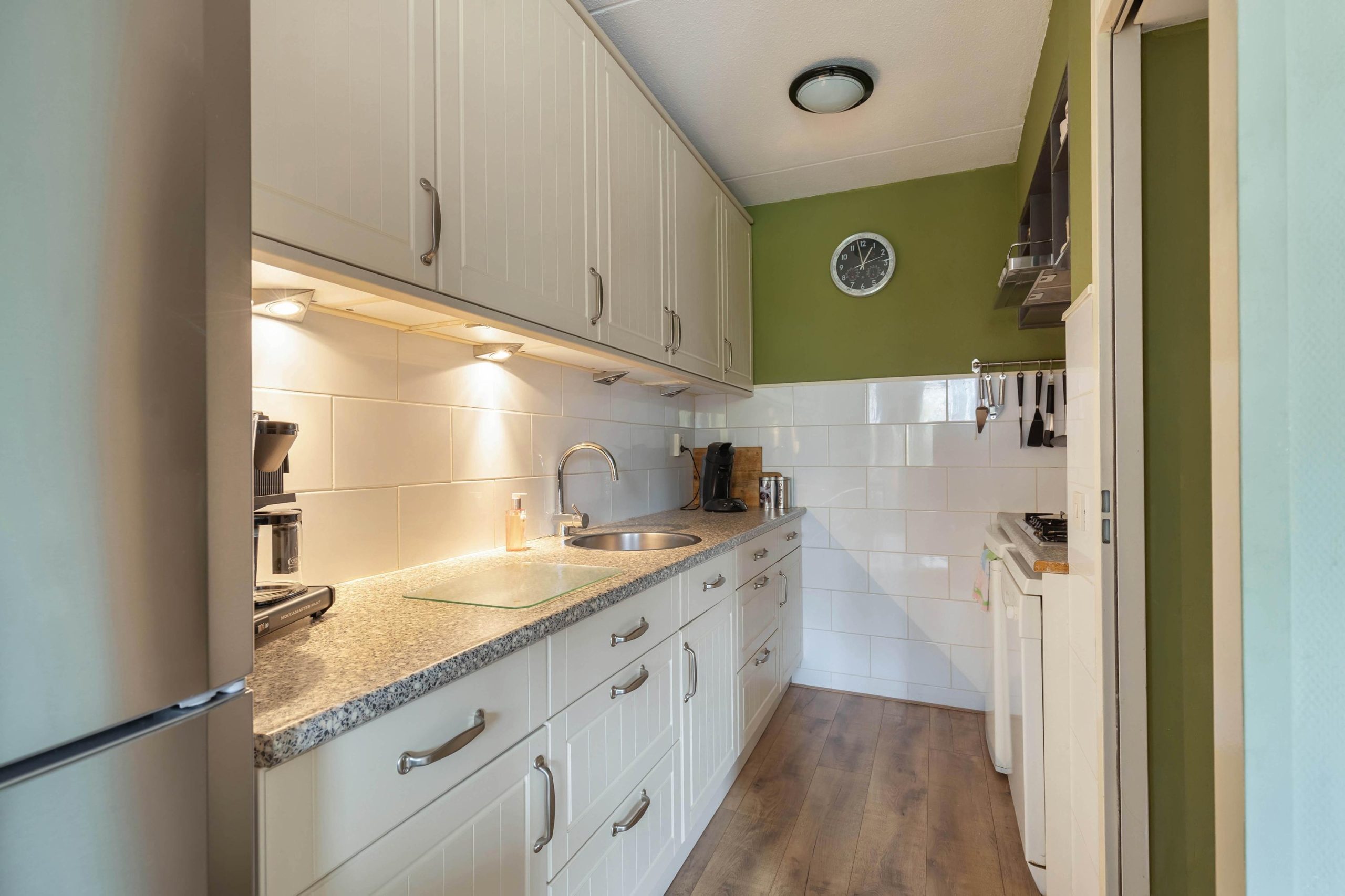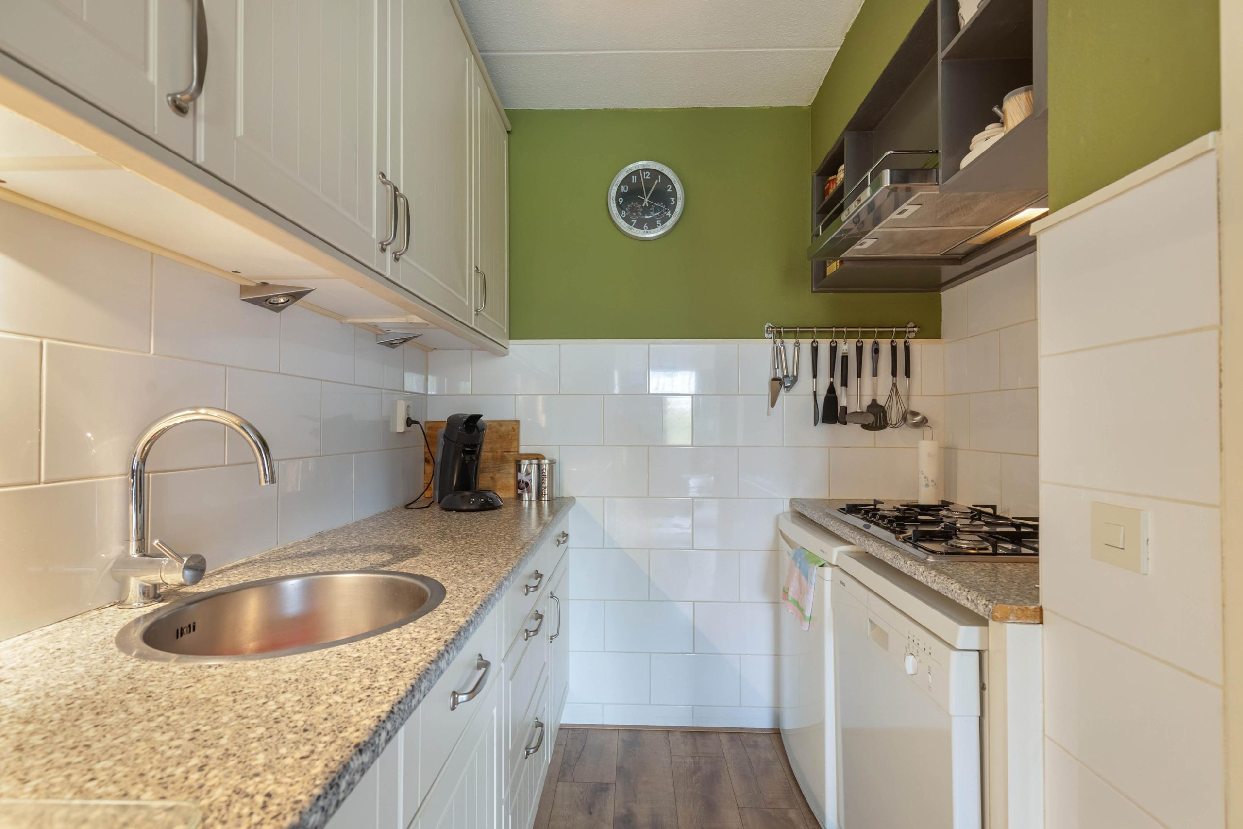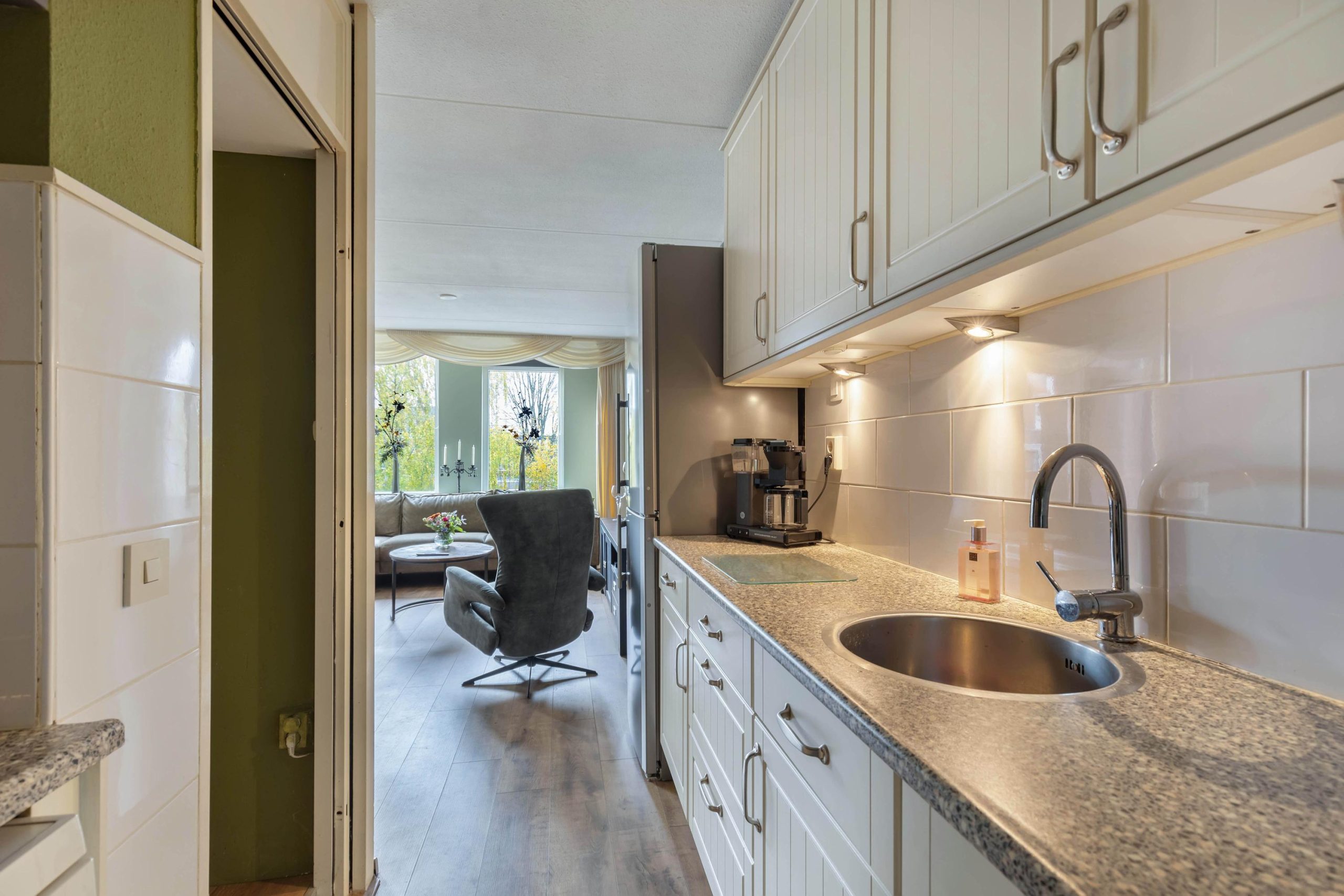 Een opvallend ruime en lichte woonkamer met vrij uitzicht en toegang naar het balkon op heerlijke zonnestand. In de kamer is ruimte voor je eettafel en een TV/zithoek en je loopt over een moderne laminaatvloer van 2022. De open keuken heeft een nette keukenopstelling met een kunststof werkblad op prettige werkhoogte, bovenkastjes en lades, een 5-pits gaskookplaat met afzuigkap en een nis voor een koel-vriescombi.