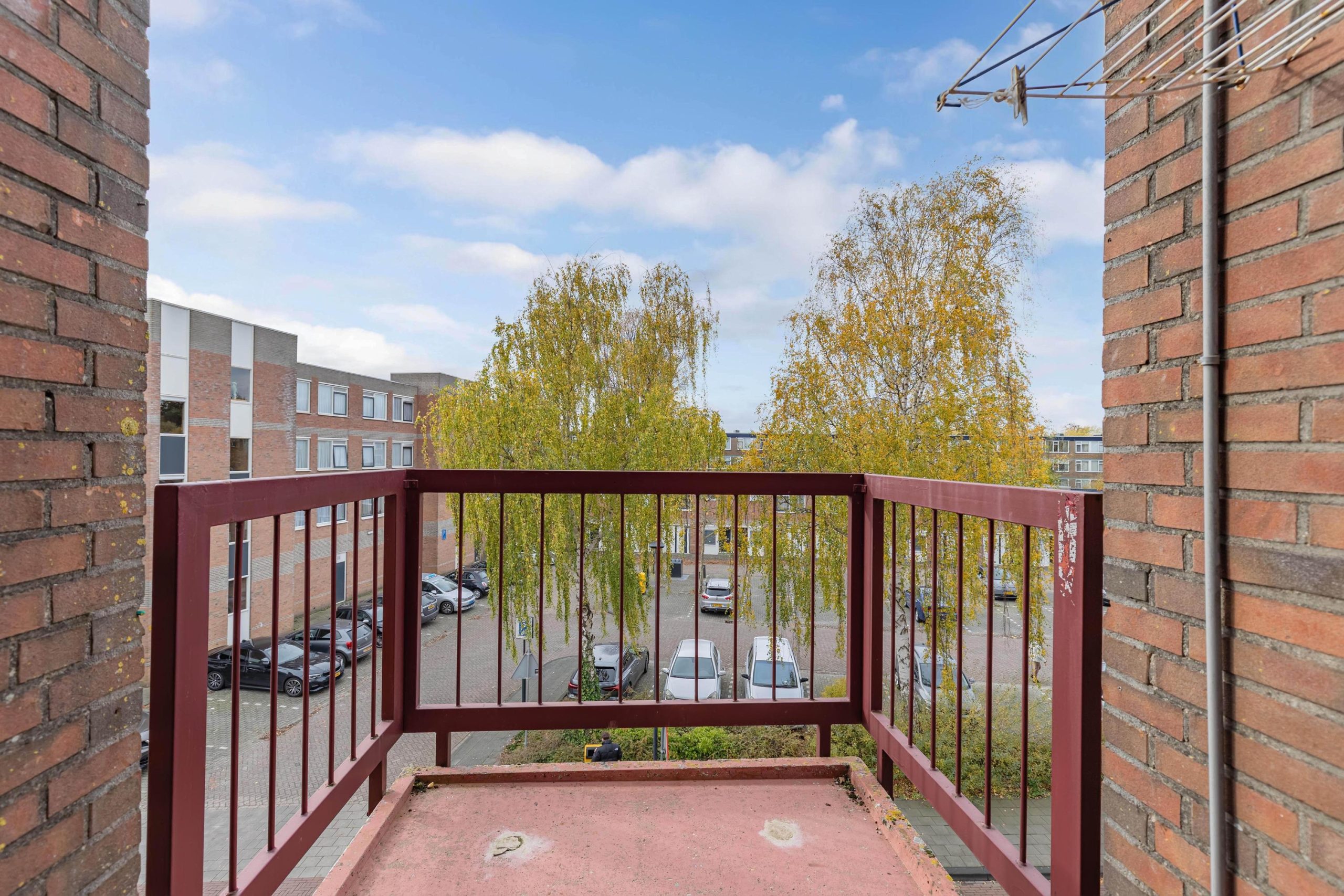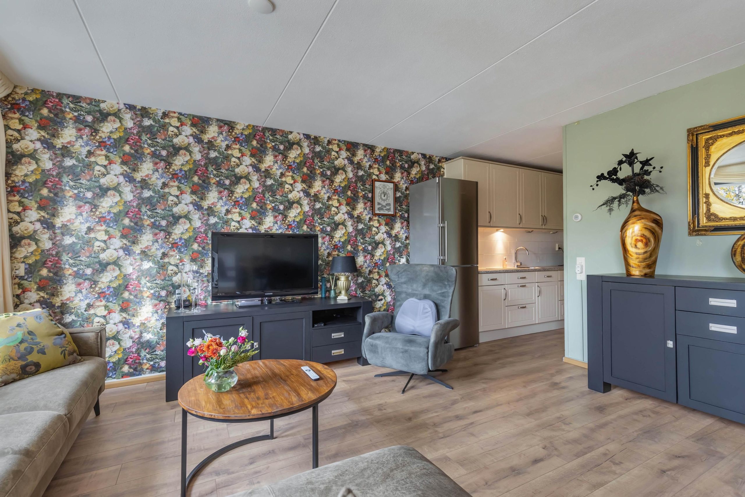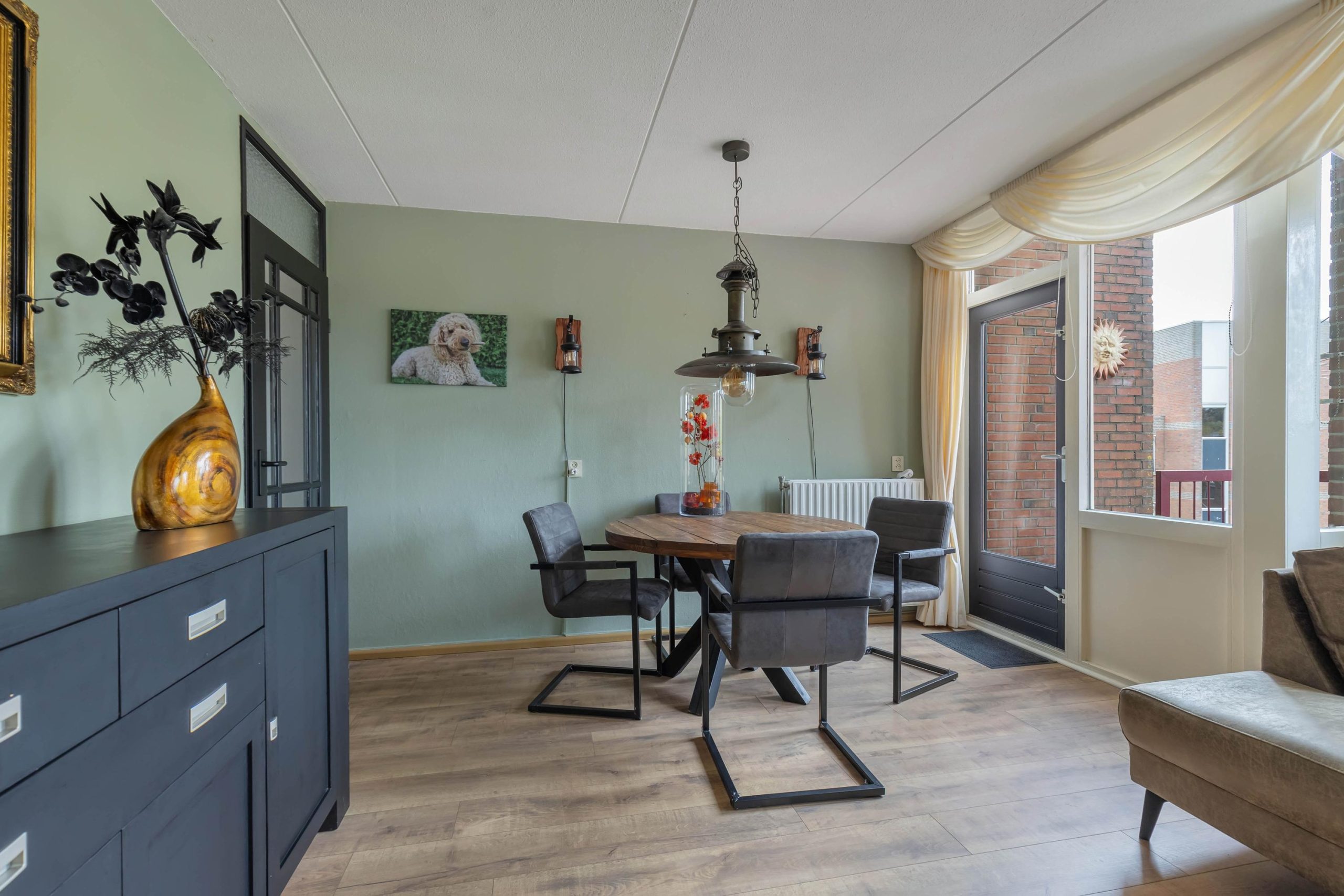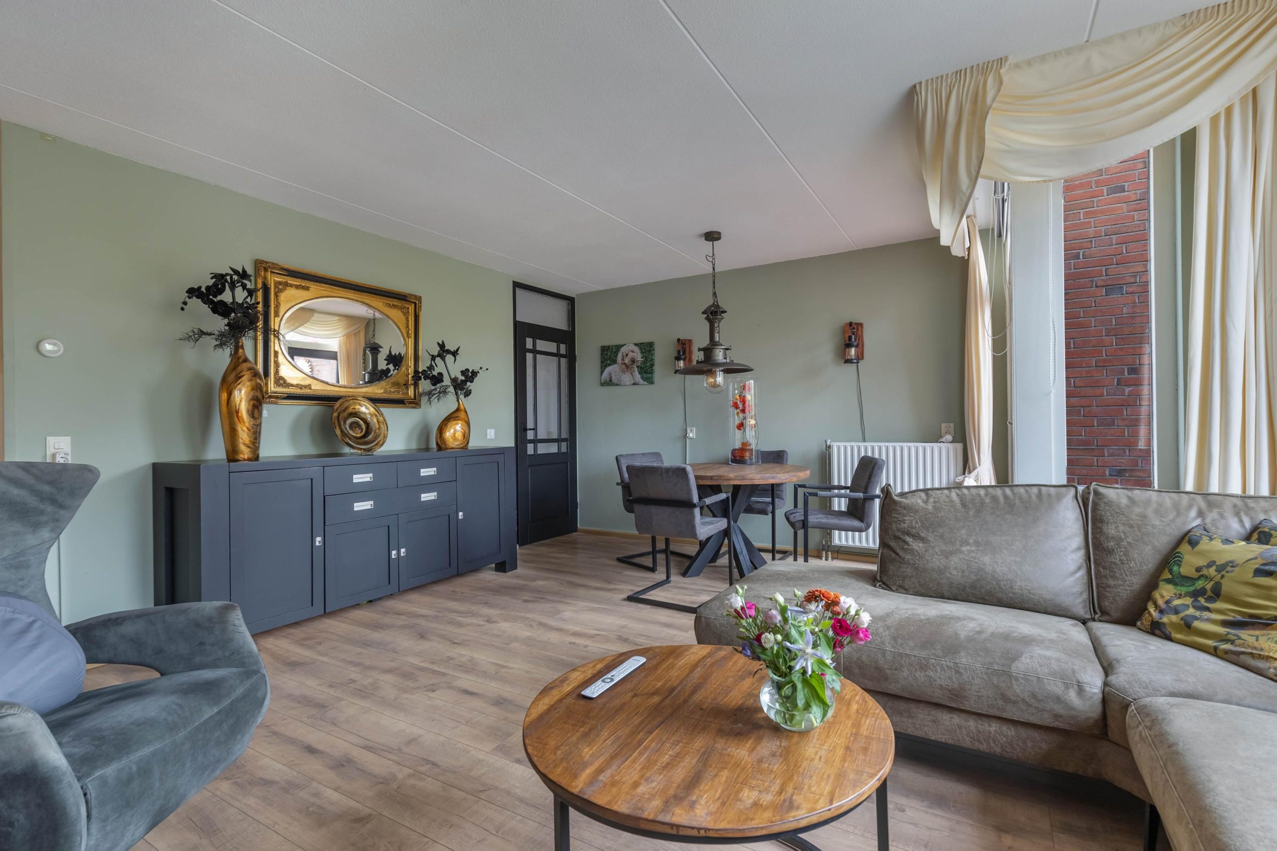 Een opvallend ruime en lichte woonkamer met vrij uitzicht en toegang naar het balkon op heerlijke zonnestand. In de kamer is ruimte voor je eettafel en een TV/zithoek en je loopt over een moderne laminaatvloer van 2022. De open keuken heeft een nette keukenopstelling met een kunststof werkblad op prettige werkhoogte, bovenkastjes en lades, een 5-pits gaskookplaat met afzuigkap en een nis voor een koel-vriescombi.