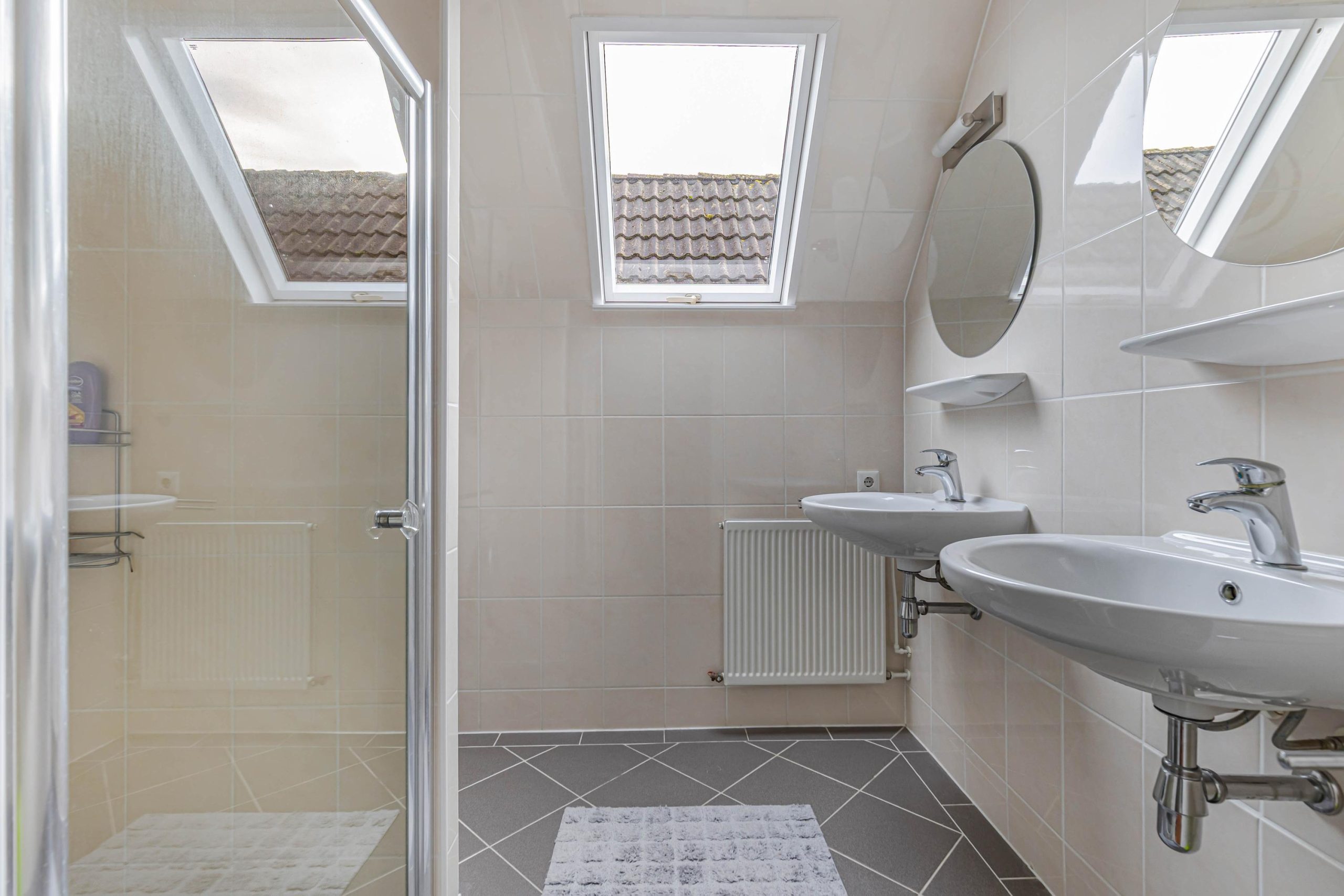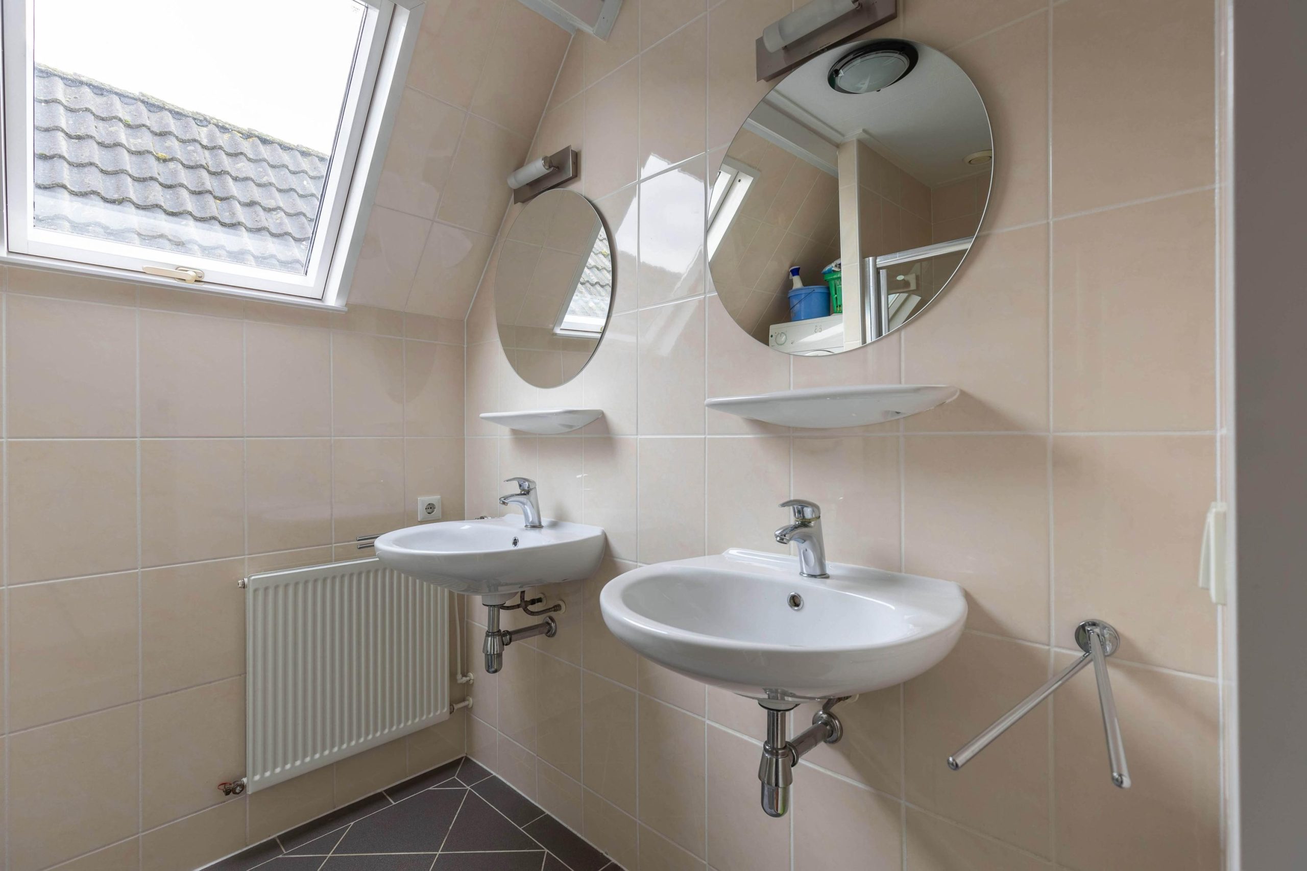 - badkamer met een inloopdouche en twee wastafels. Tevens is er de opstelling voor de wasmachine en/of droger. Met een groot kantelraam voorzien van HR++ glas.