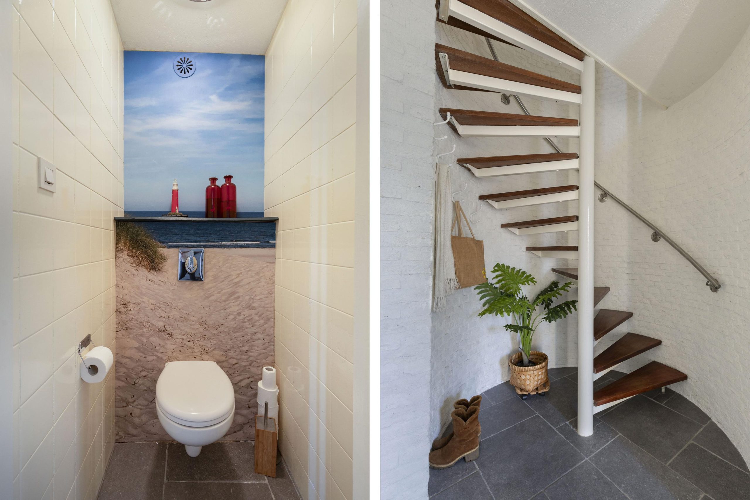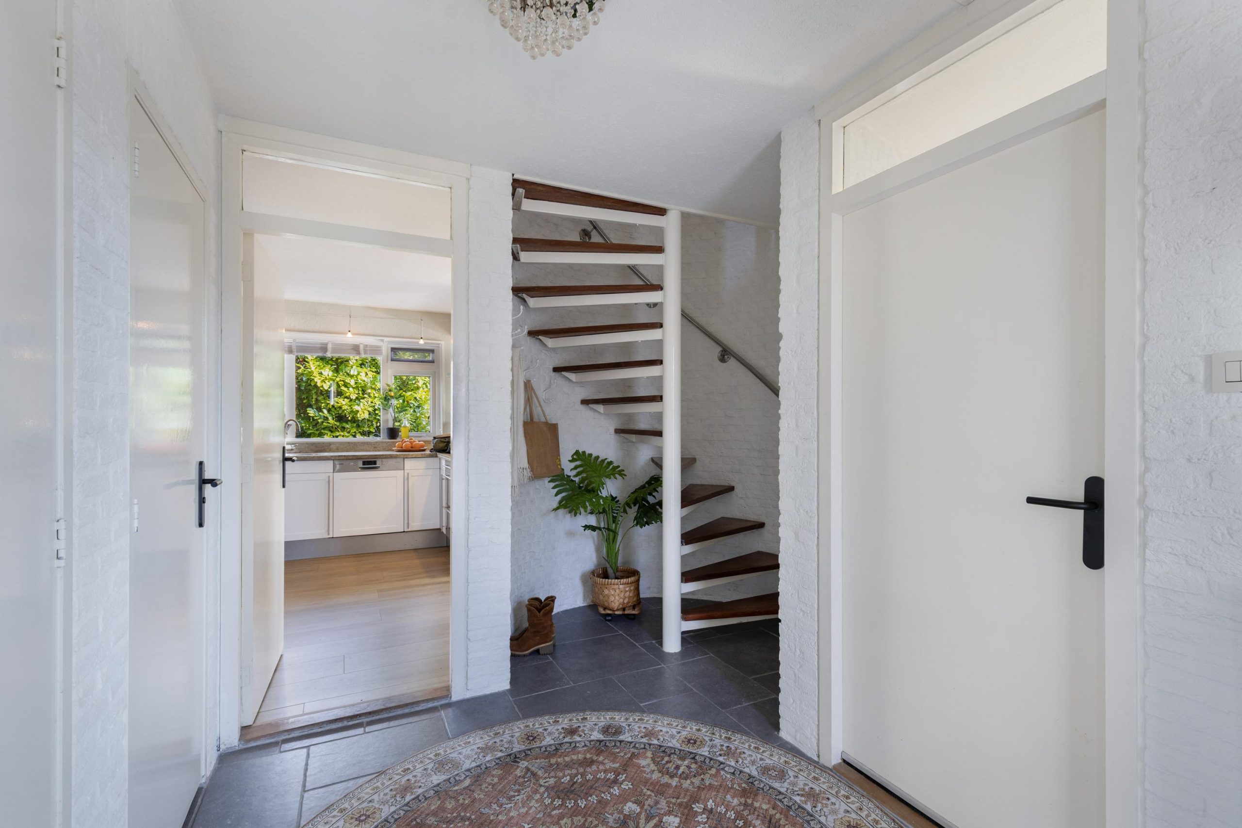 - fraaie ronde trapopgang met spiltrap en rvs-leuning