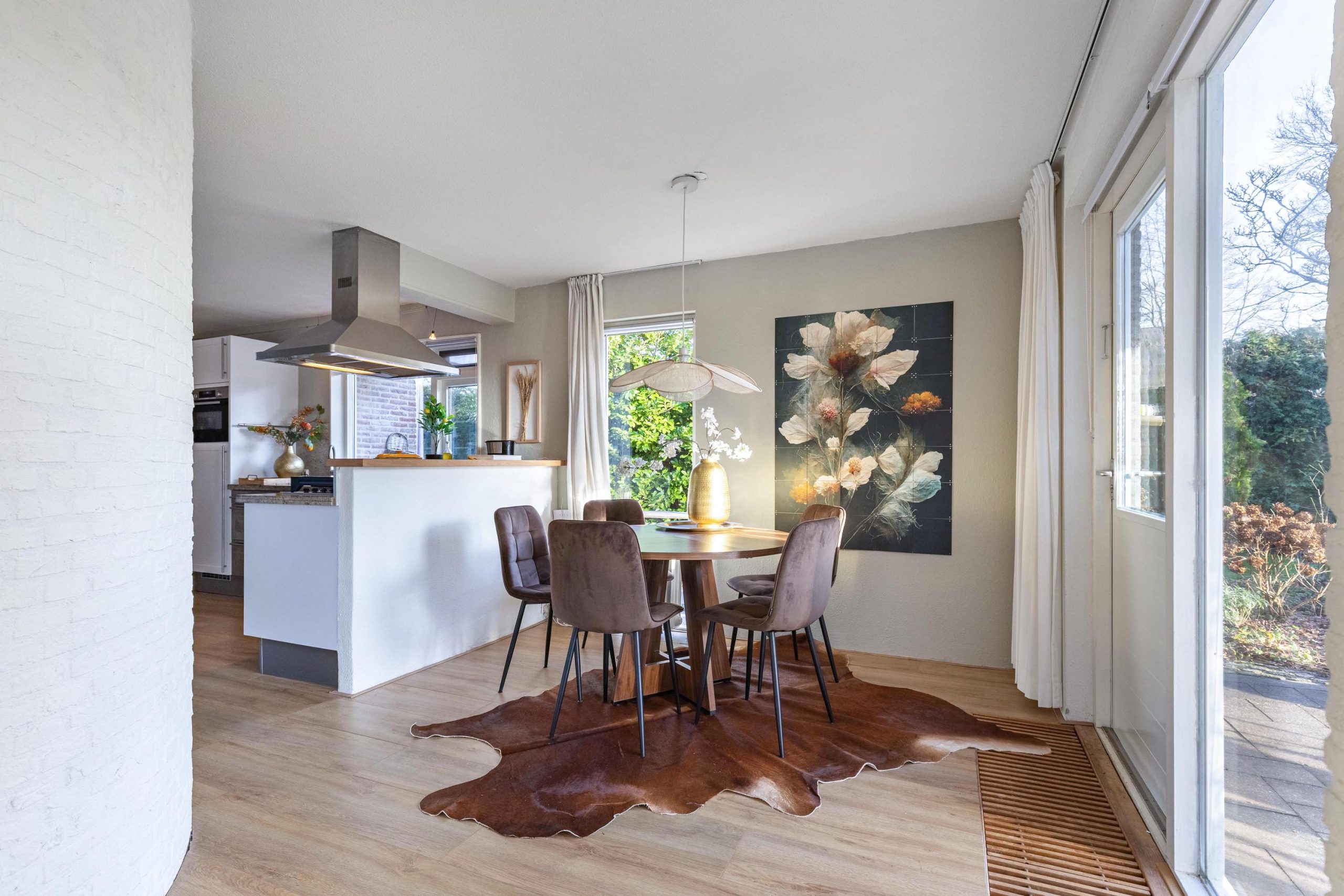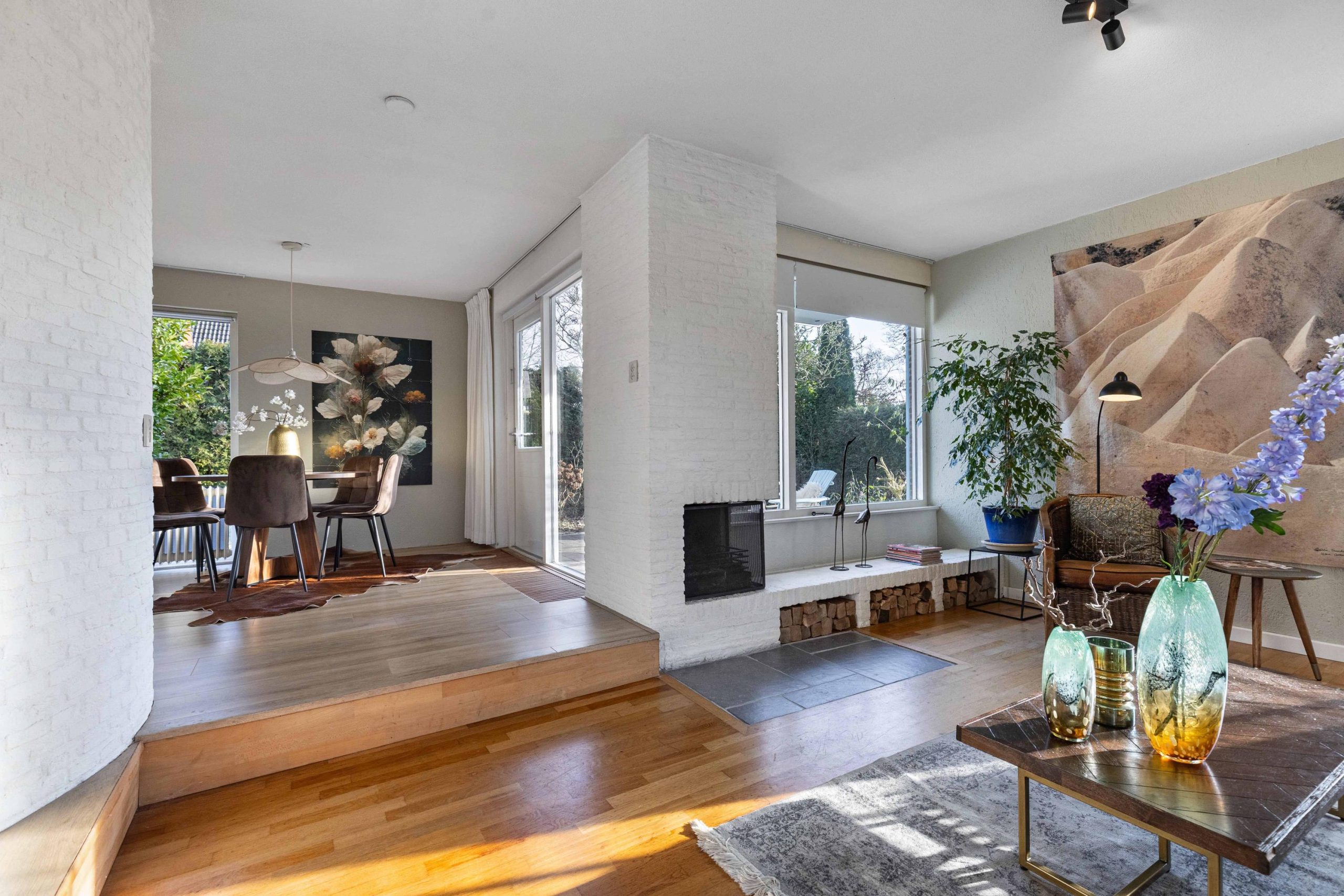 Midden in de leefruimte is plek voor een grote gezinstafel. Dit wordt je favoriete plek in huis. Je staat in verbinding met de open keuken én je hebt zicht op de brede en diepe achtertuin. De tuindeur verbindt de kamer met het terras en de verzorgde tuin op zomerse dagen. Wanneer je doorloopt kom je in de TV/zithoek. Deze is verlaagd, wat een speels en knus karakter geeft. De open haard geeft hier sfeervolle warmte. Heerlijk relaxen. Vanuit de zithoek is ook een deur naar de hal.