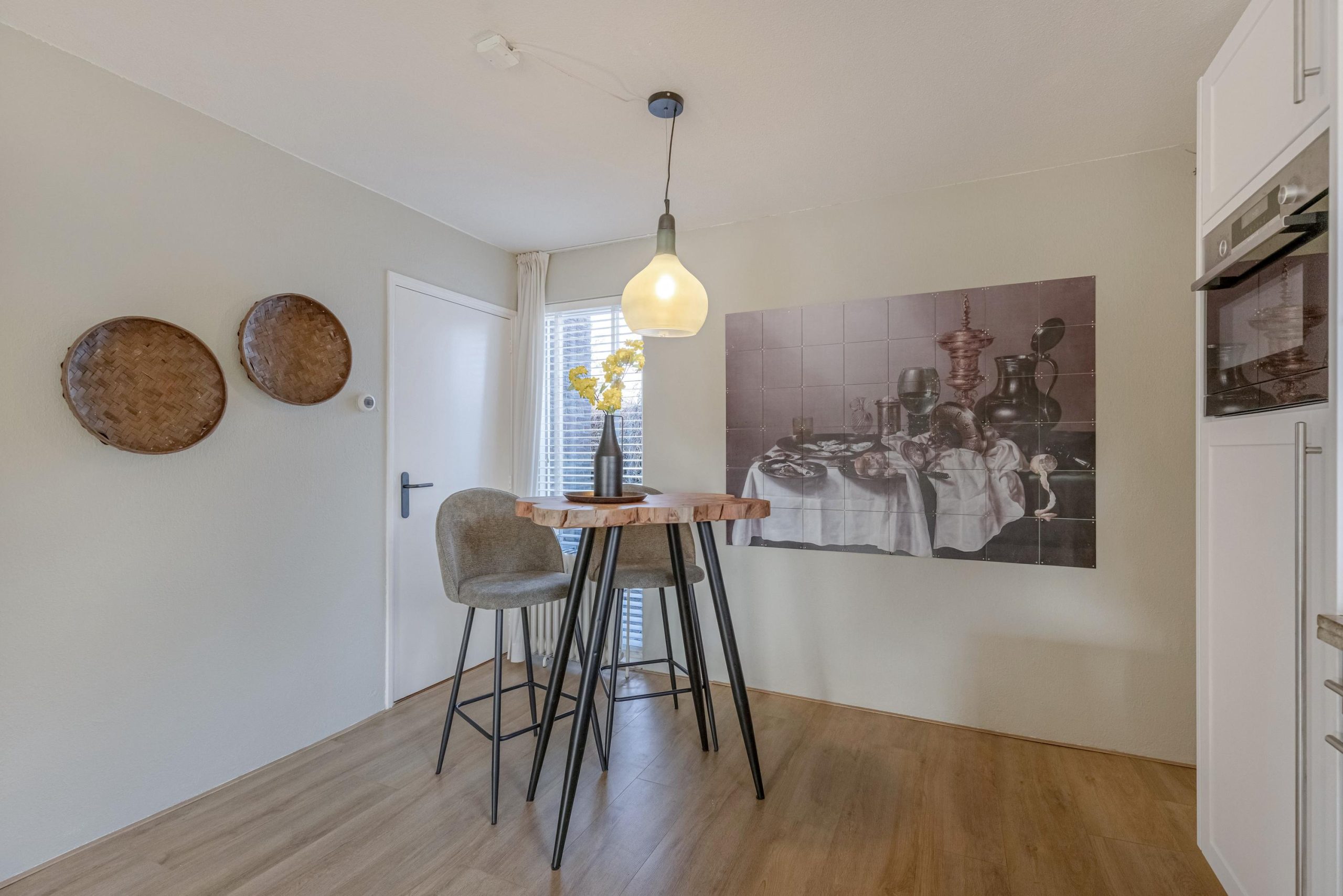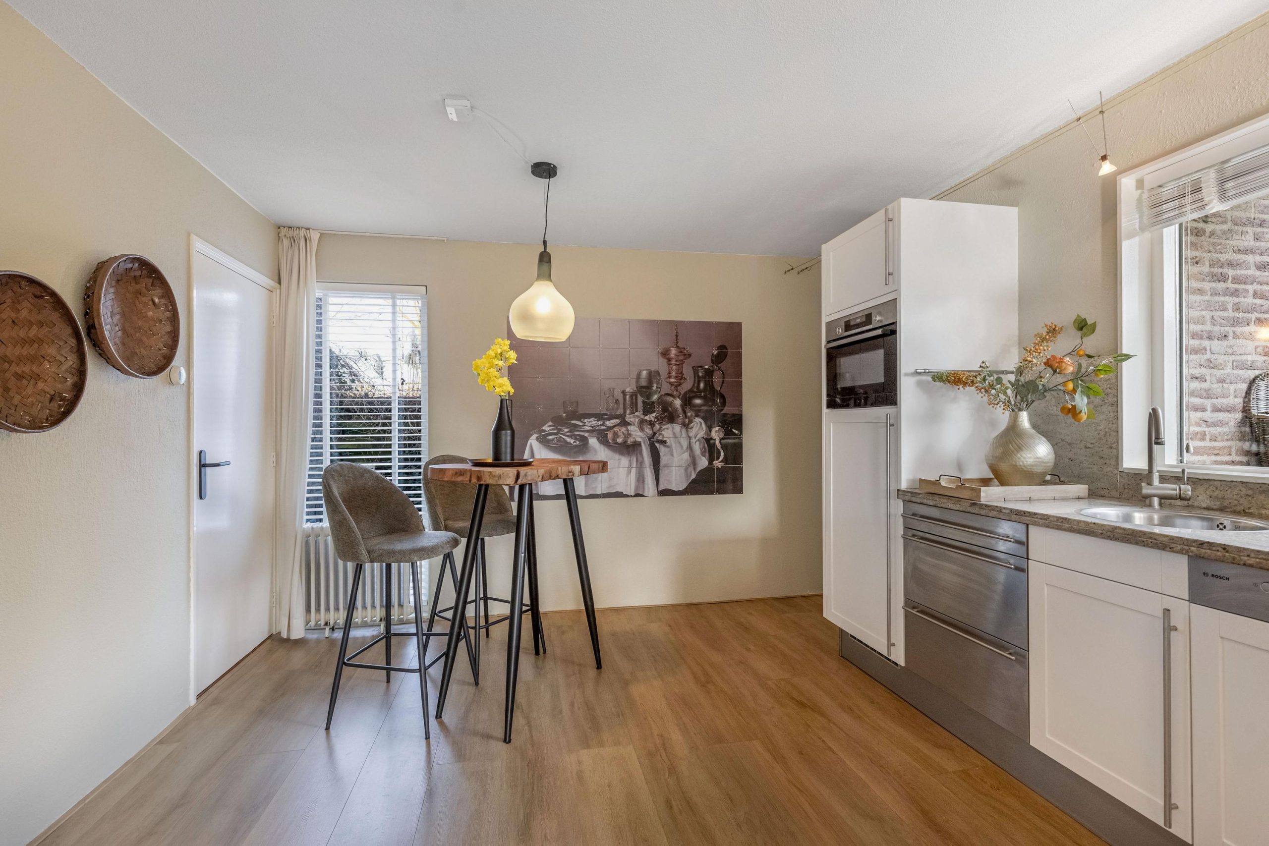 Je voelt je meteen thuis wanneer je de leefruimte binnenloopt. Ruimte en licht. Je loopt de leefruimte binnen over een parketvloer vanuit de hal naar de woonkeuken. De vele raamvensters zorgen ervoor dat het licht volop de ruimte krijgt om naar binnen te stralen. De keukenopstelling is voorzien van een werkblad op prettige werkhoogte, een vaatwasser (2020), een inductie-kookplaat met schouw, een combi-oven/magnetron met stoomfunctie (2023), een koelkast, lades en kastruimte. Bij de keukenopstelling is ruimte voor een praktische ontbijthoek of kleine eettafel. Hier is ook een opbergkast.