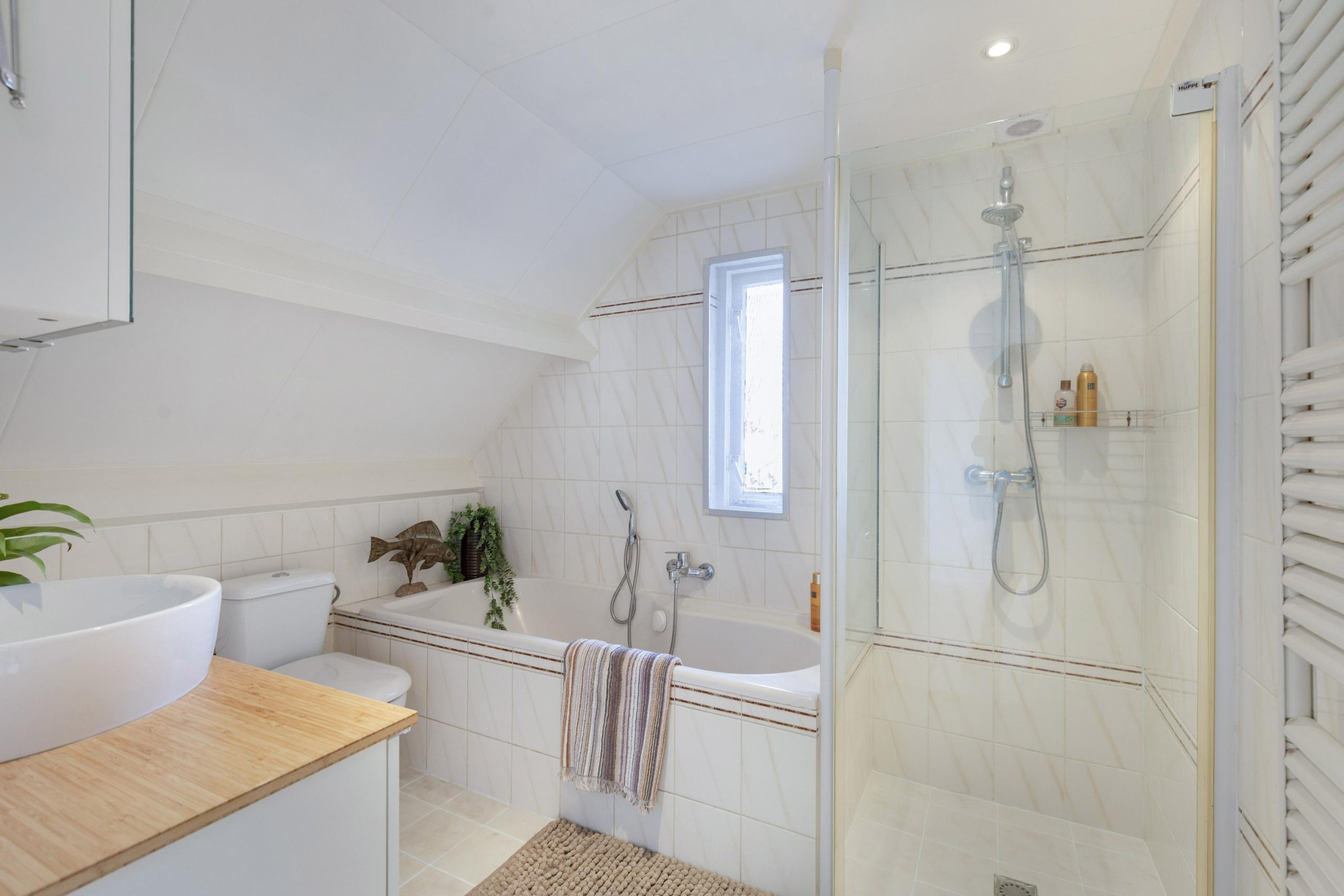 Een complete en moderne badkamer met inloopdouche, ligbad, wastafelmeubel, tweede toilet en handdoekradiator.